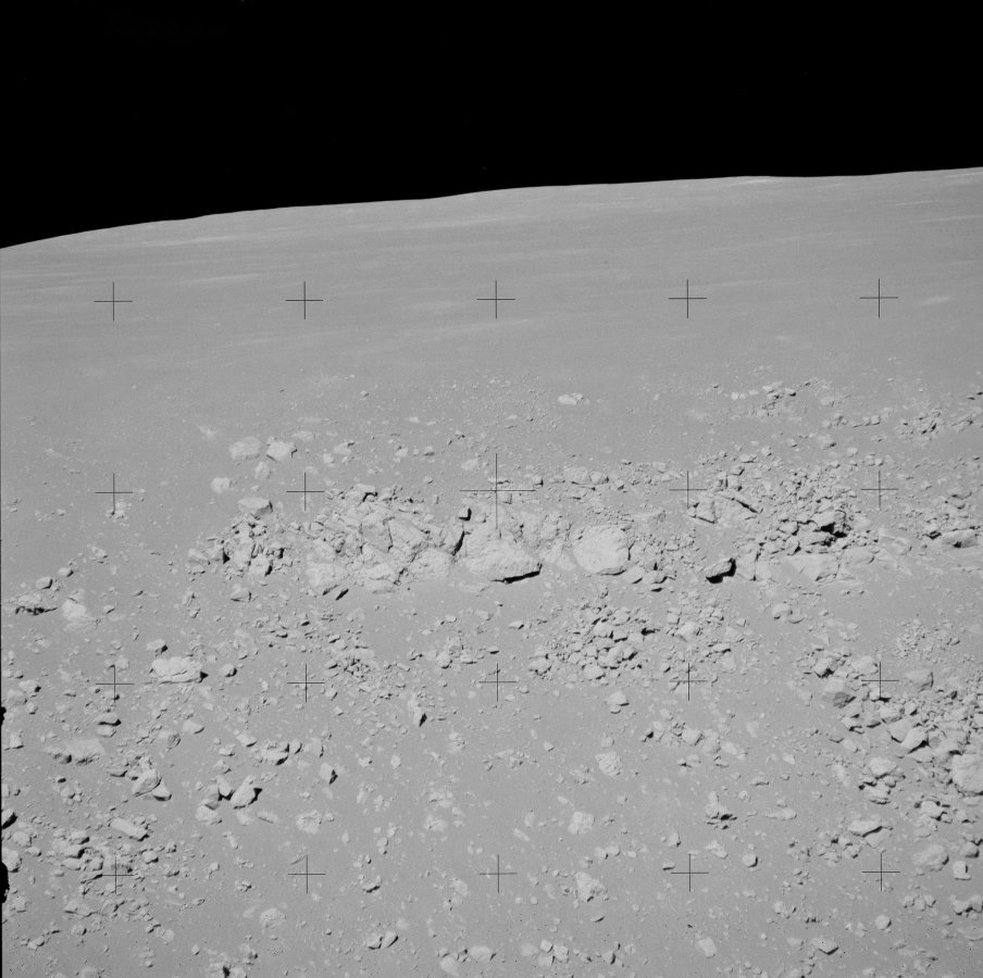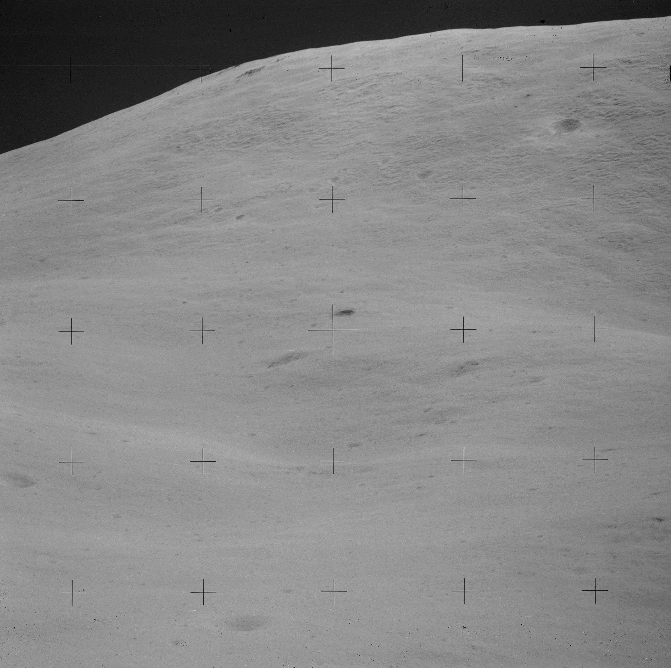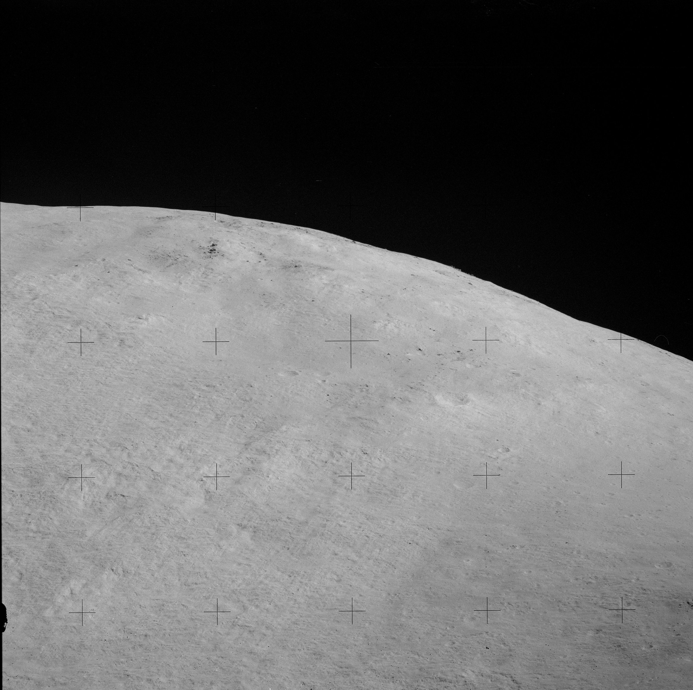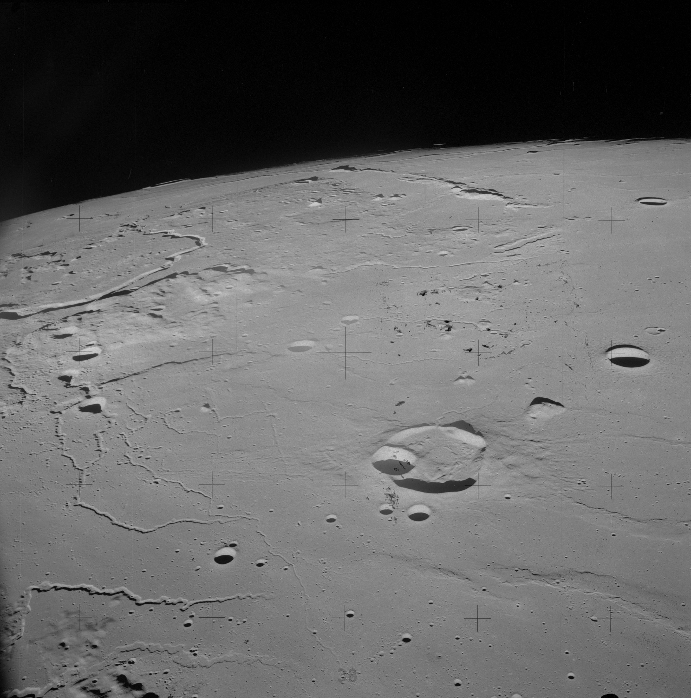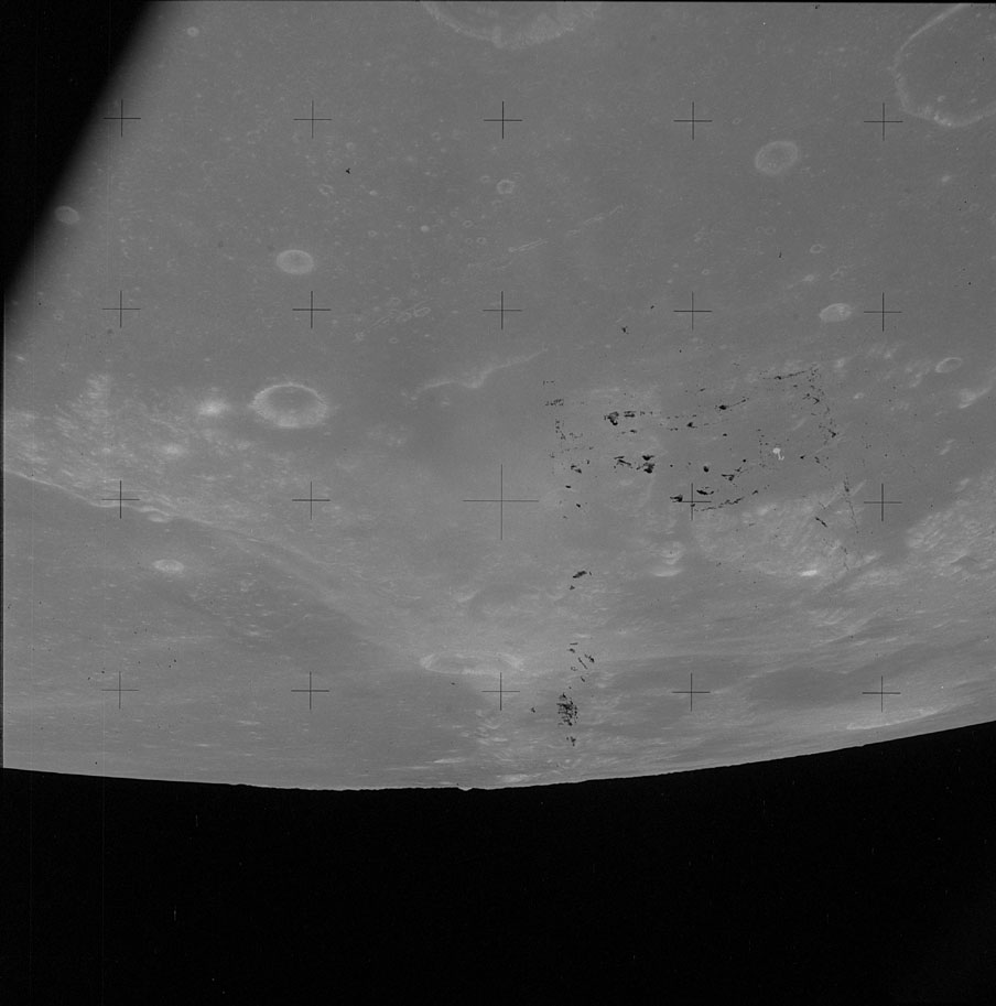 This picture was taken from the LM during CSM Rev 13 on the last pass over the landing site prior to the descent. A labeled version shows some of the prominent landmarks.Rev 16 Mapping (Metric) Camera Frame 0414 ( 13 Mb )
