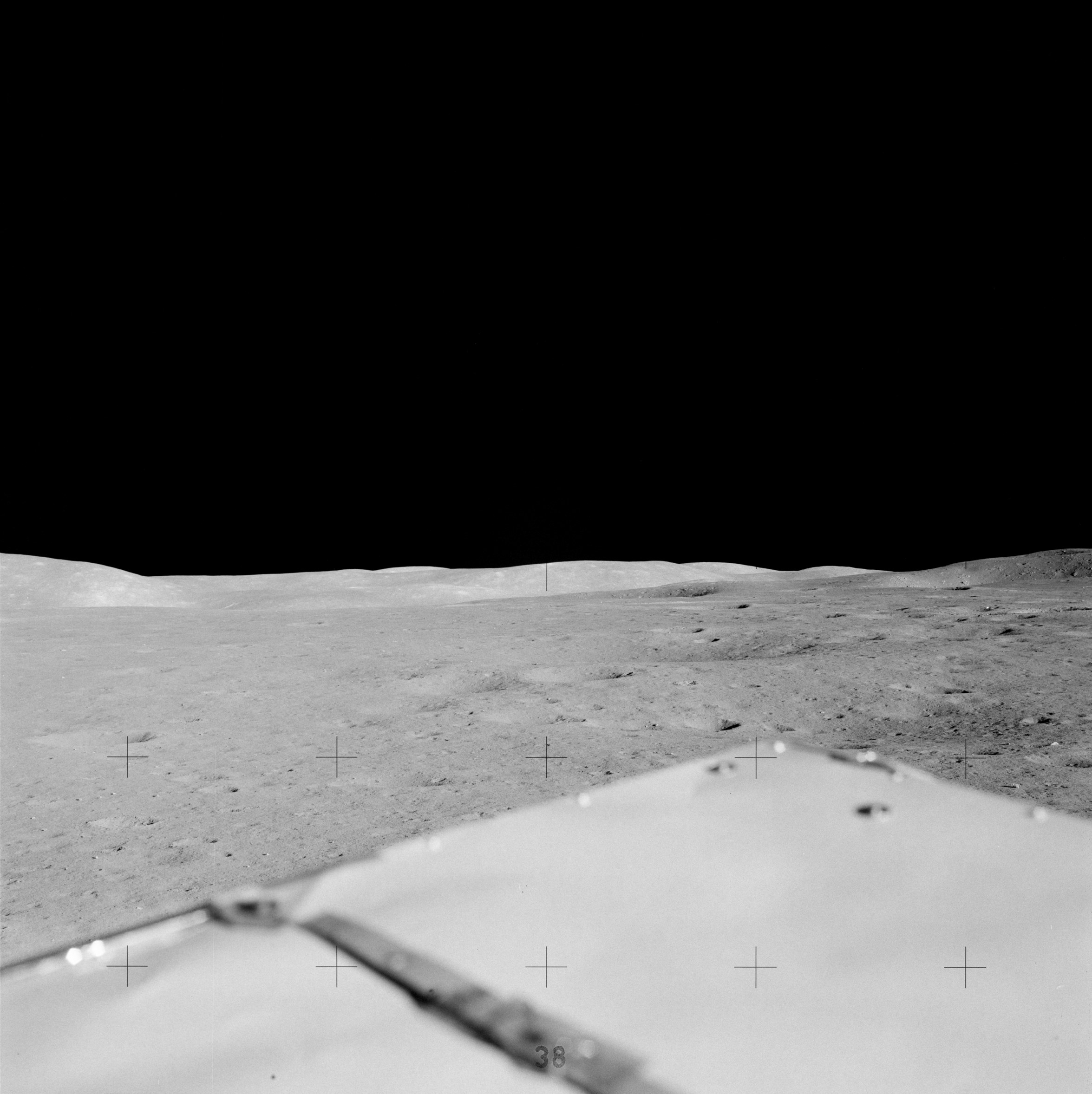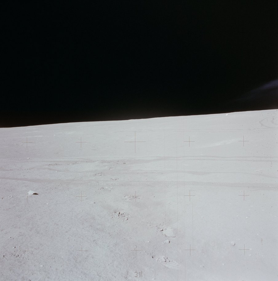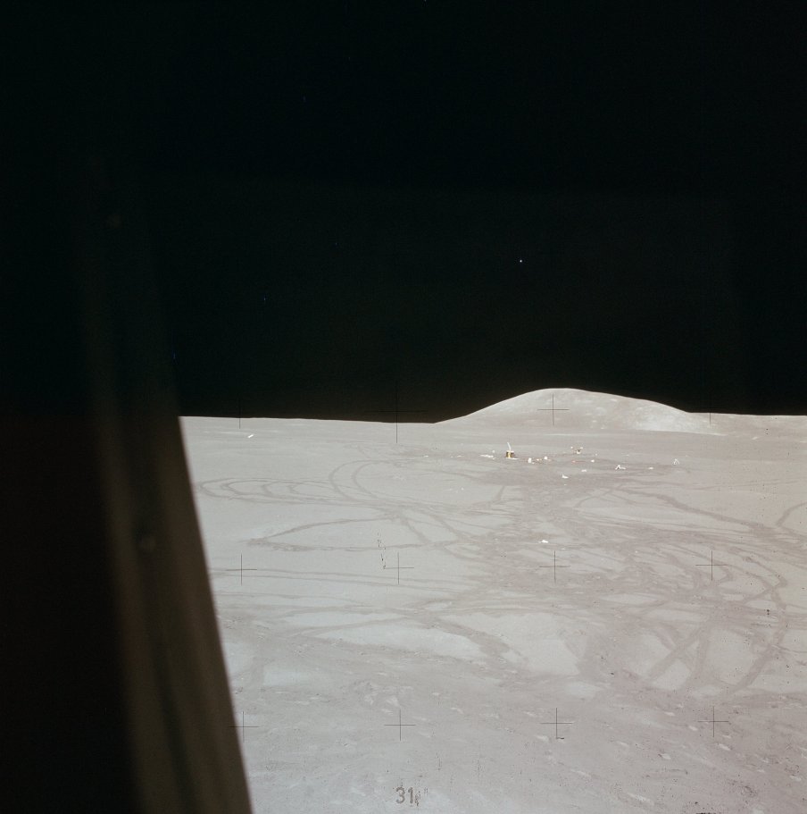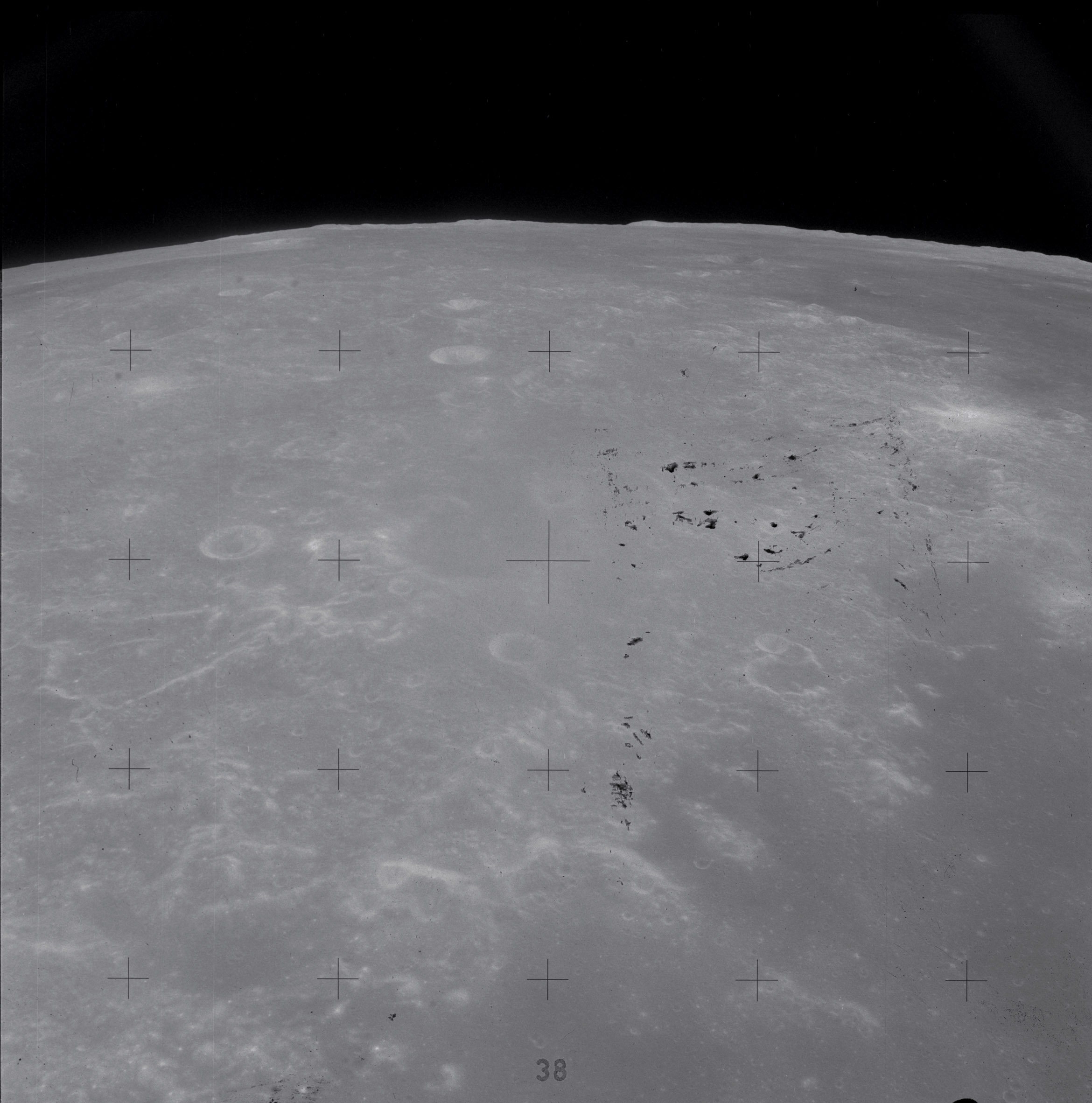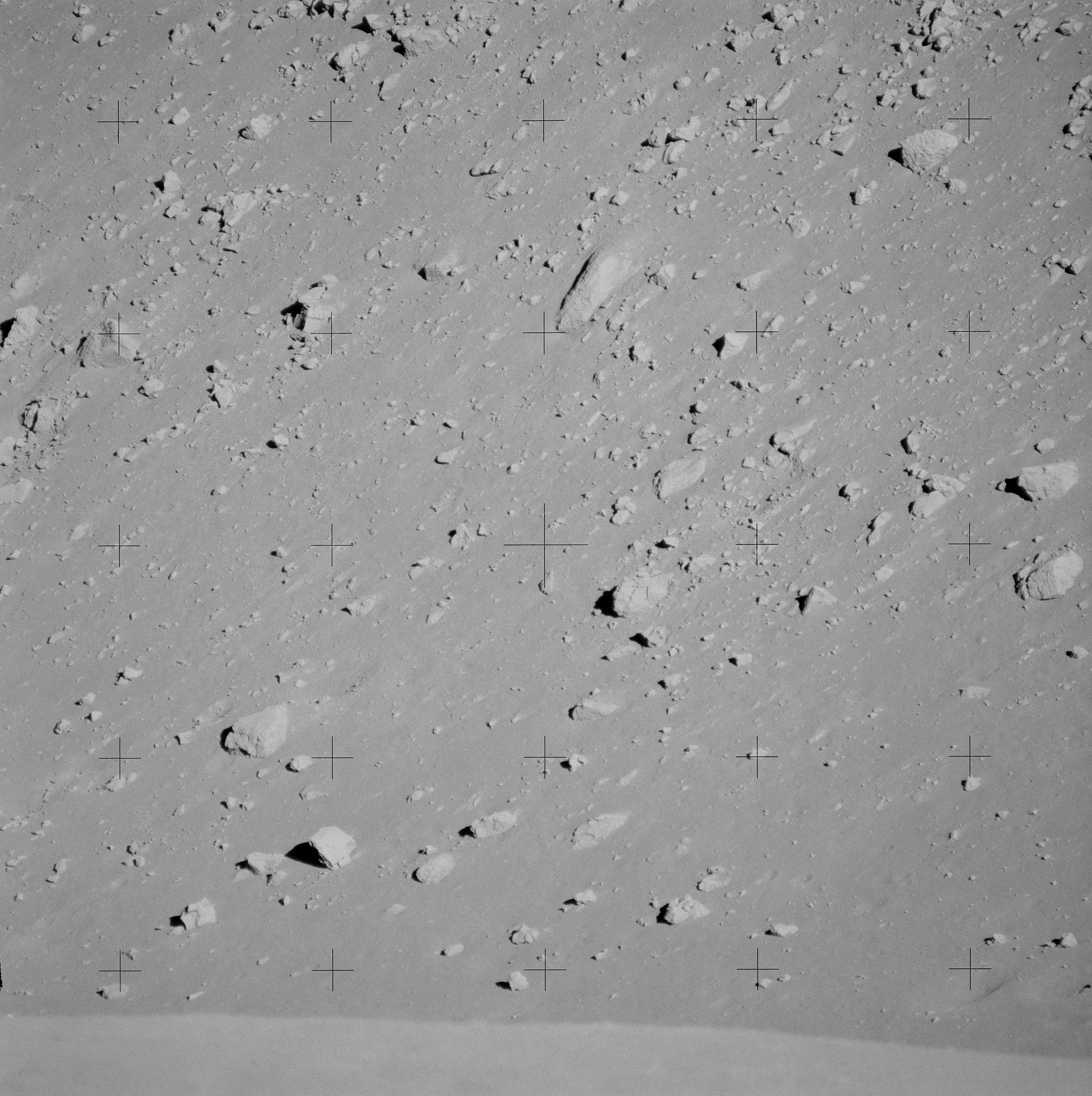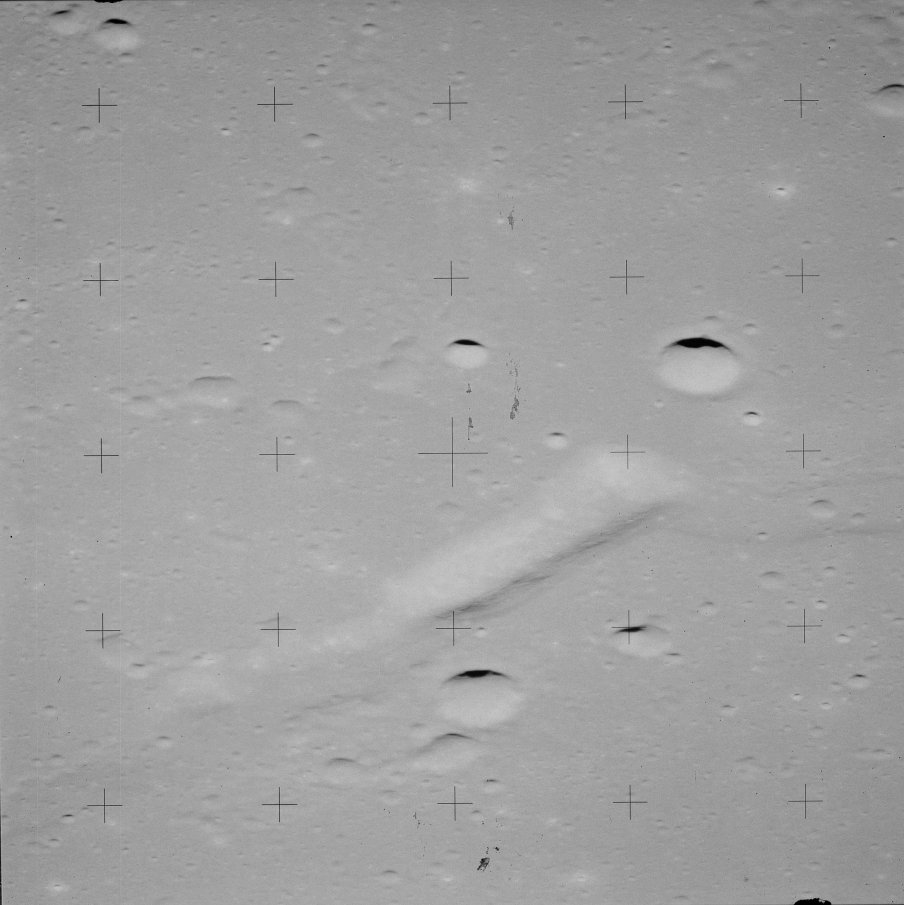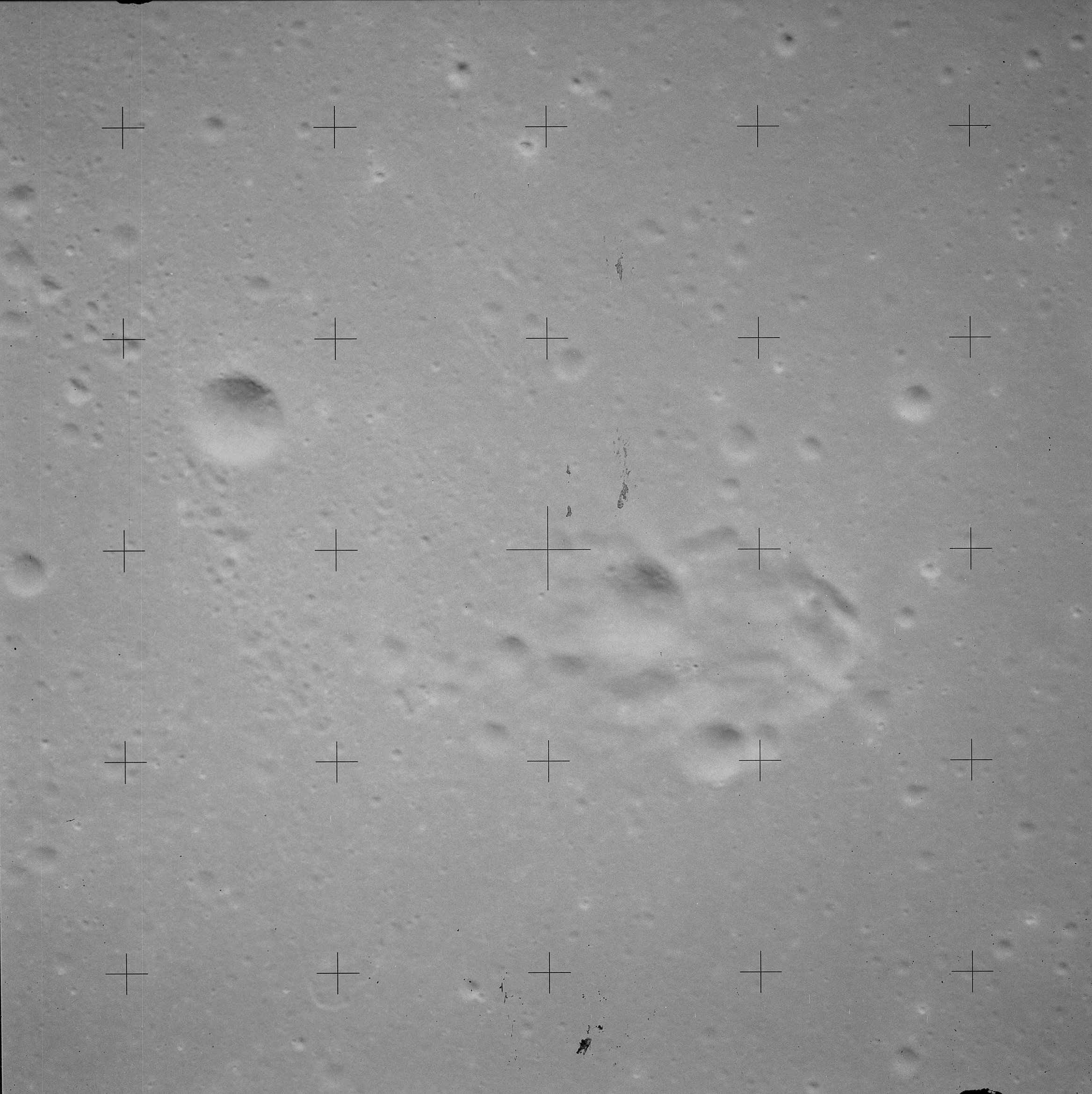 This picture was taken from the LM during CSM Rev 13 on the last pass over the landing site prior to the descent. A labeled version shows some of the prominent landmarks.Rev 16 Mapping (Metric) Camera Frame 0414 ( 13 Mb )