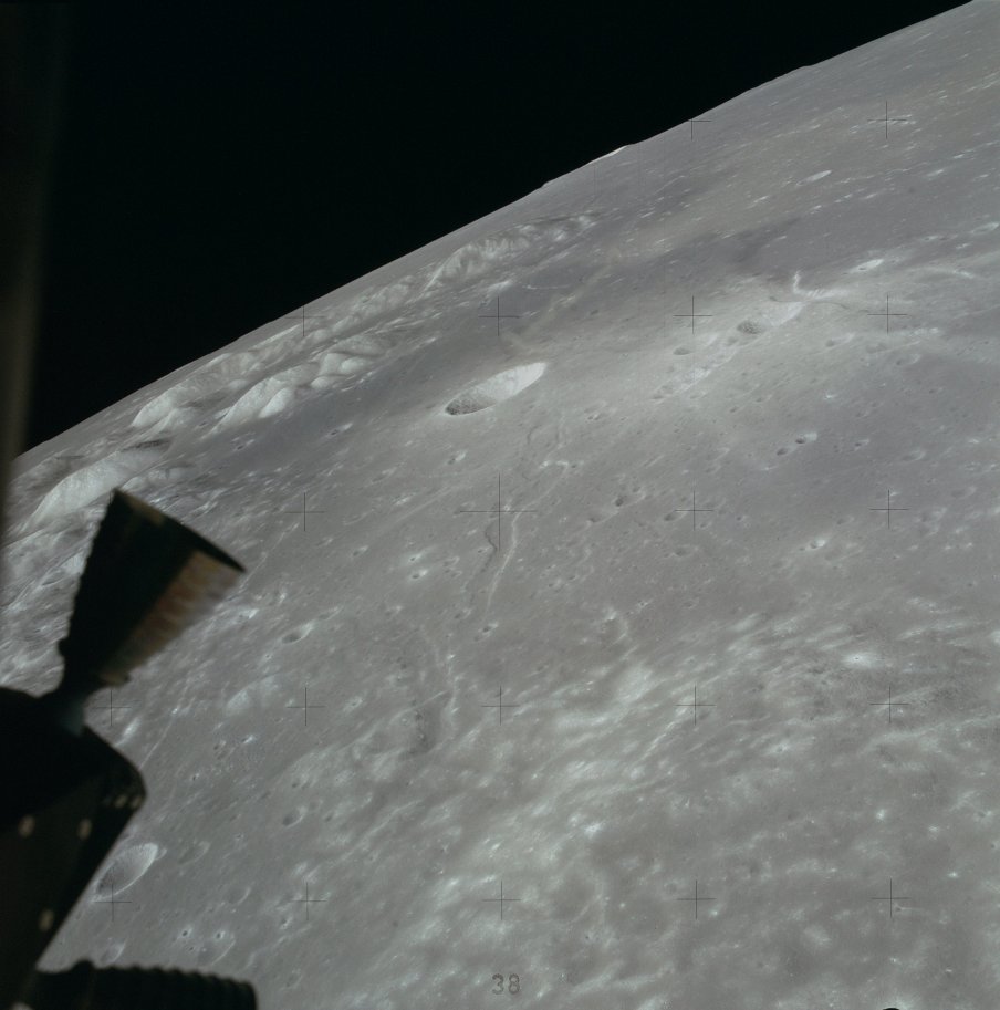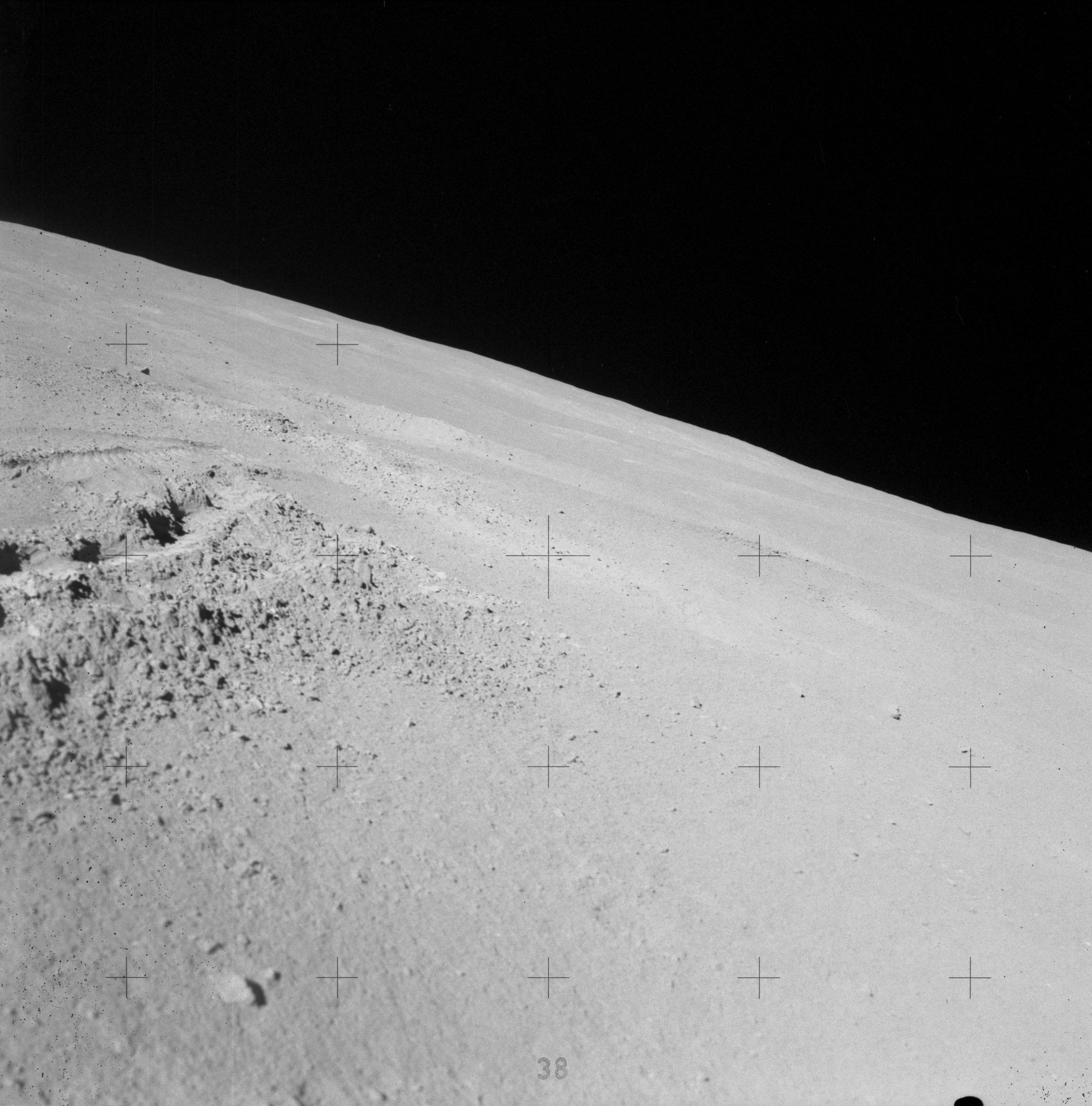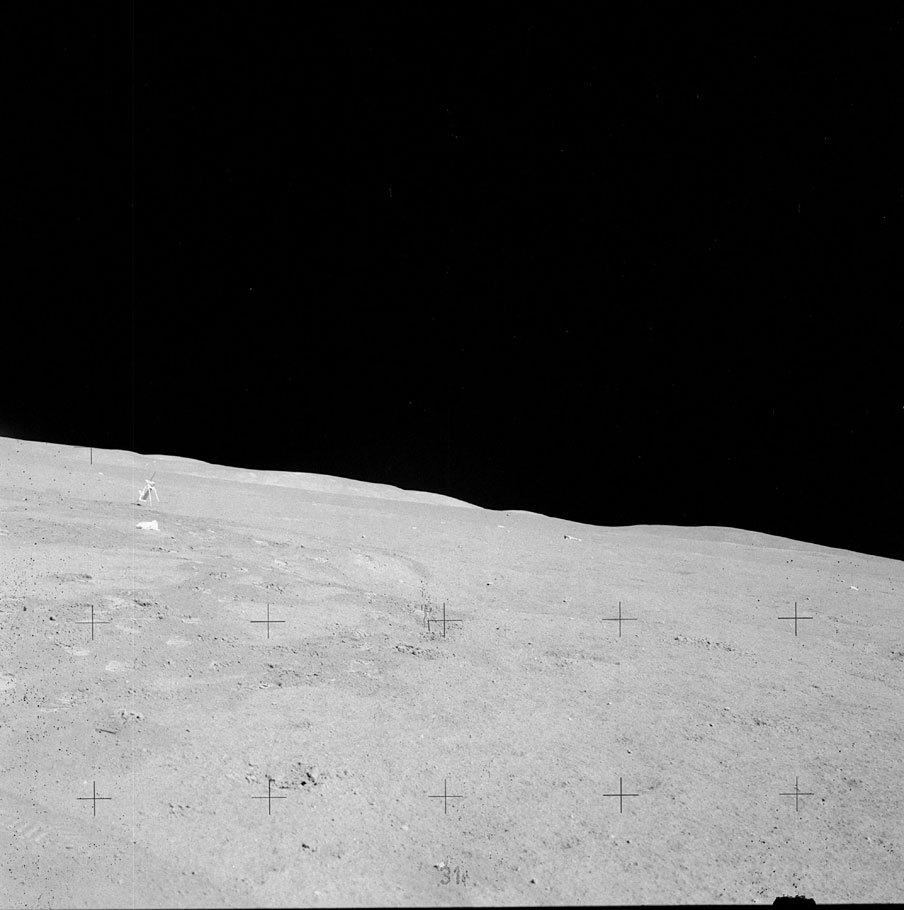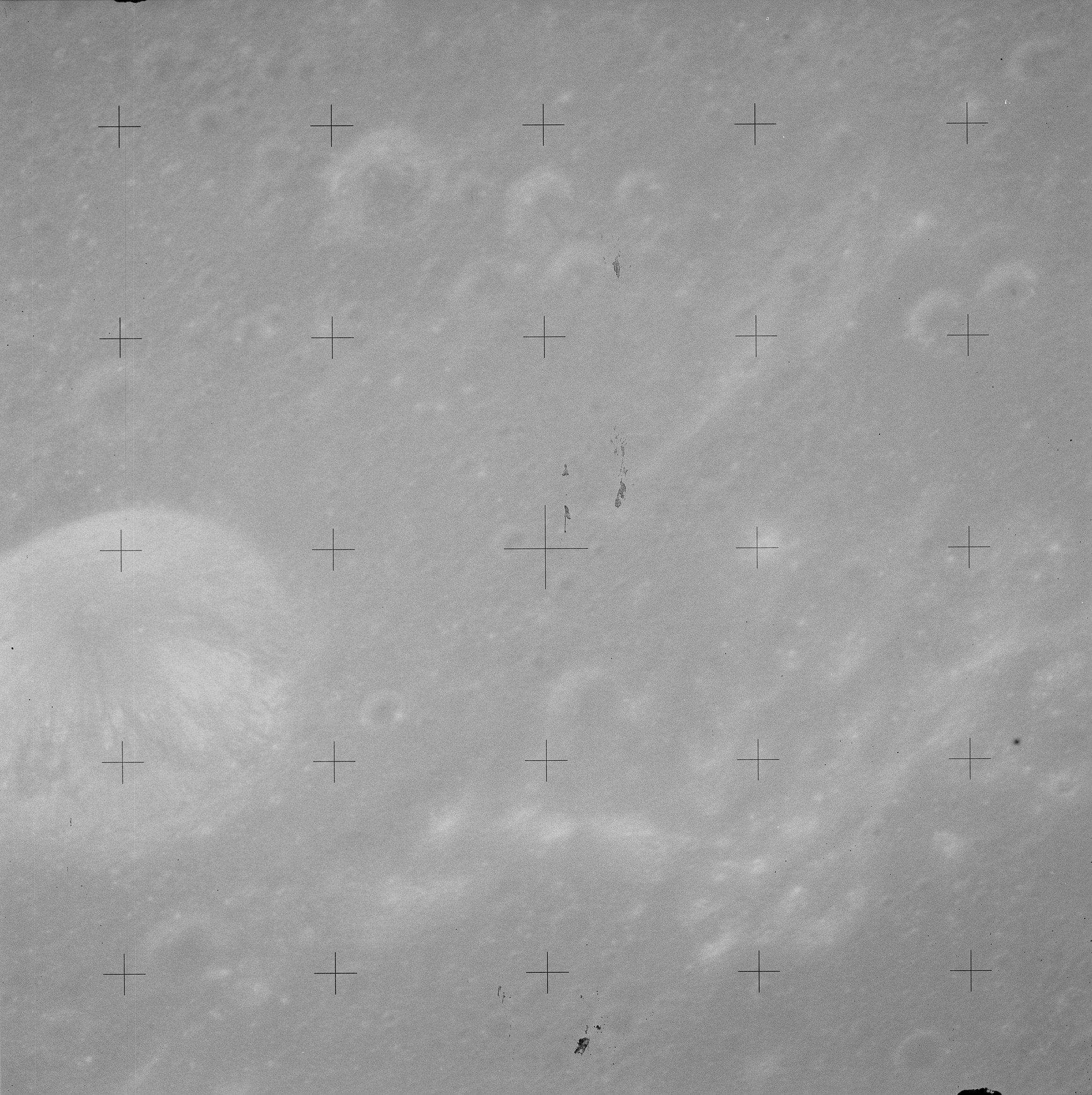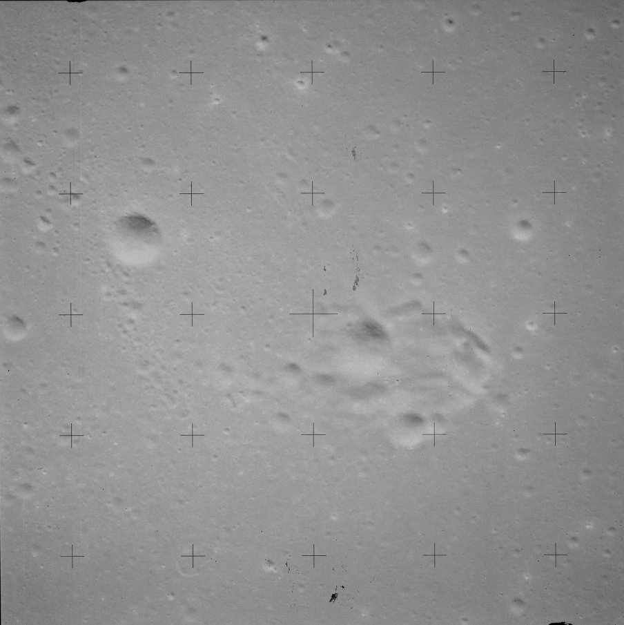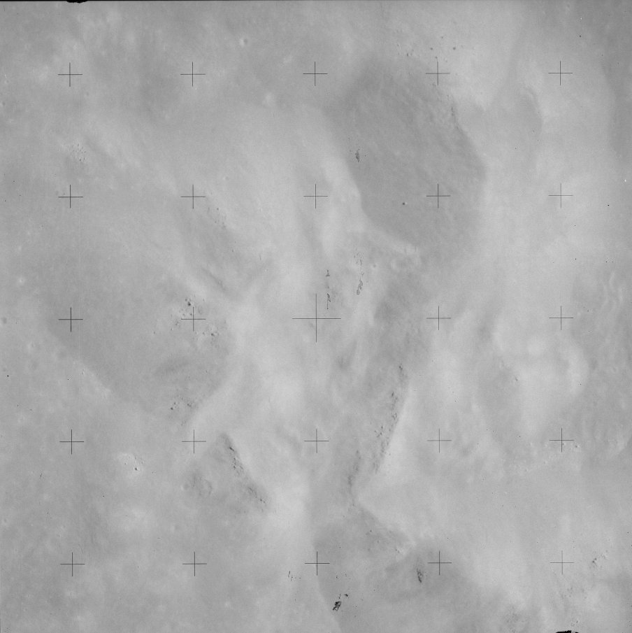 This picture was taken from the LM during CSM Rev 13 on the last pass over the landing site prior to the descent. A labeled version shows some of the prominent landmarks.Rev 16 Mapping (Metric) Camera Frame 0414 ( 13 Mb )