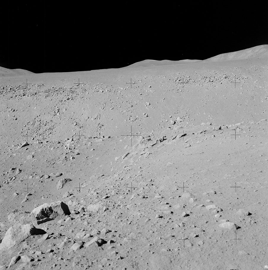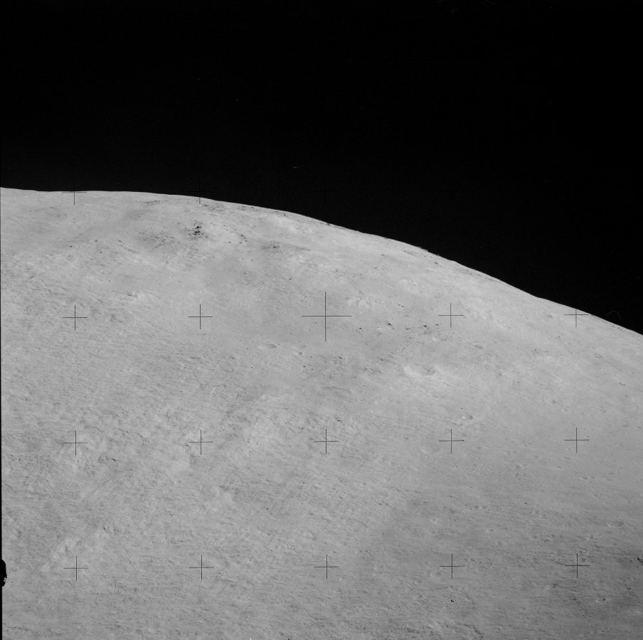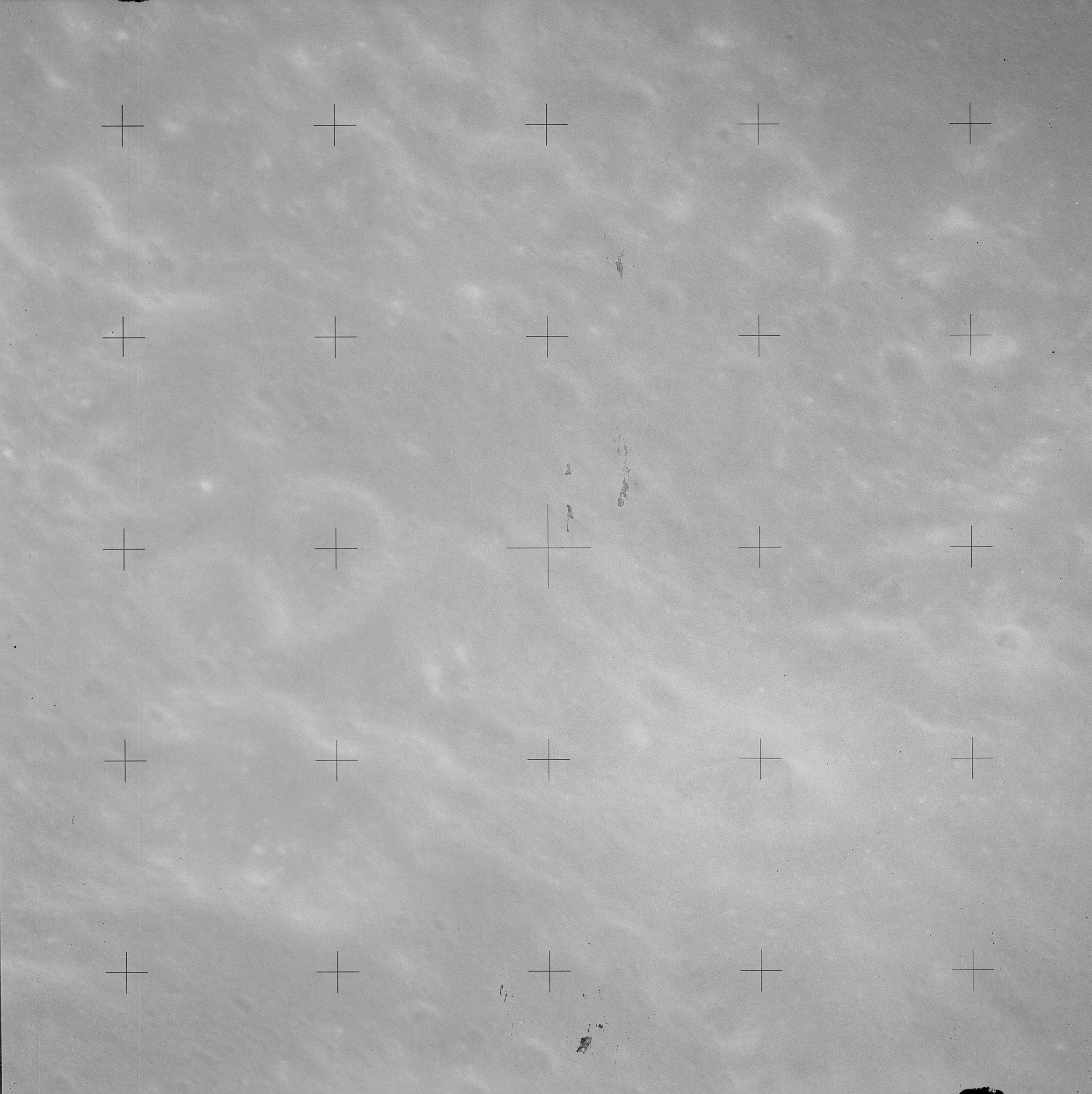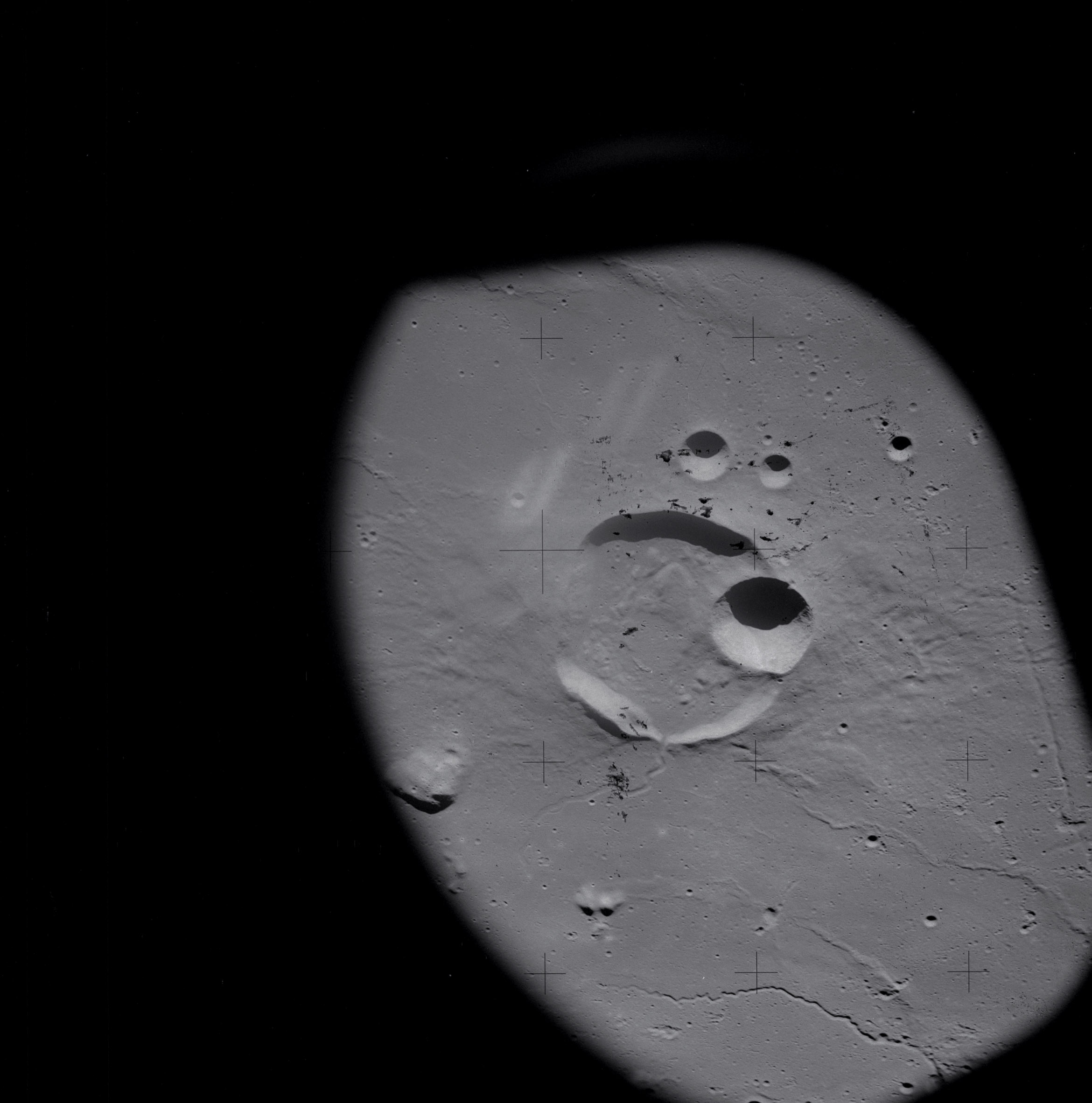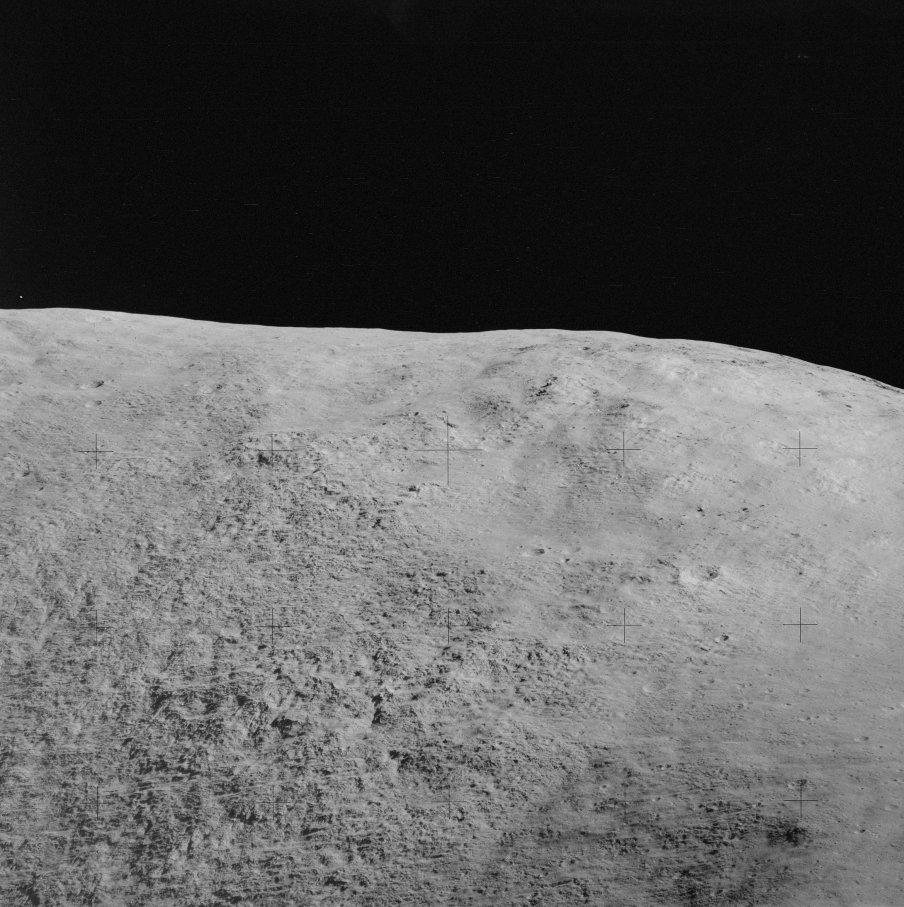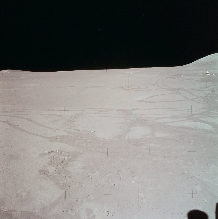 This picture was taken from the LM during CSM Rev 13 on the last pass over the landing site prior to the descent. A labeled version shows some of the prominent landmarks.Rev 16 Mapping (Metric) Camera Frame 0414 ( 13 Mb )