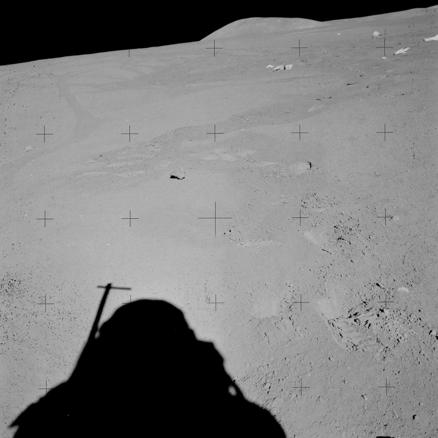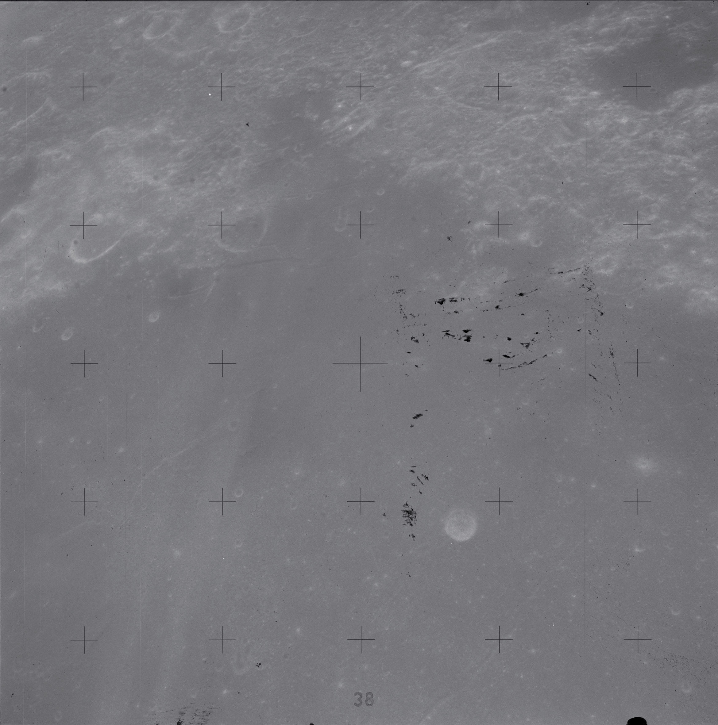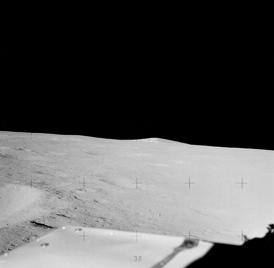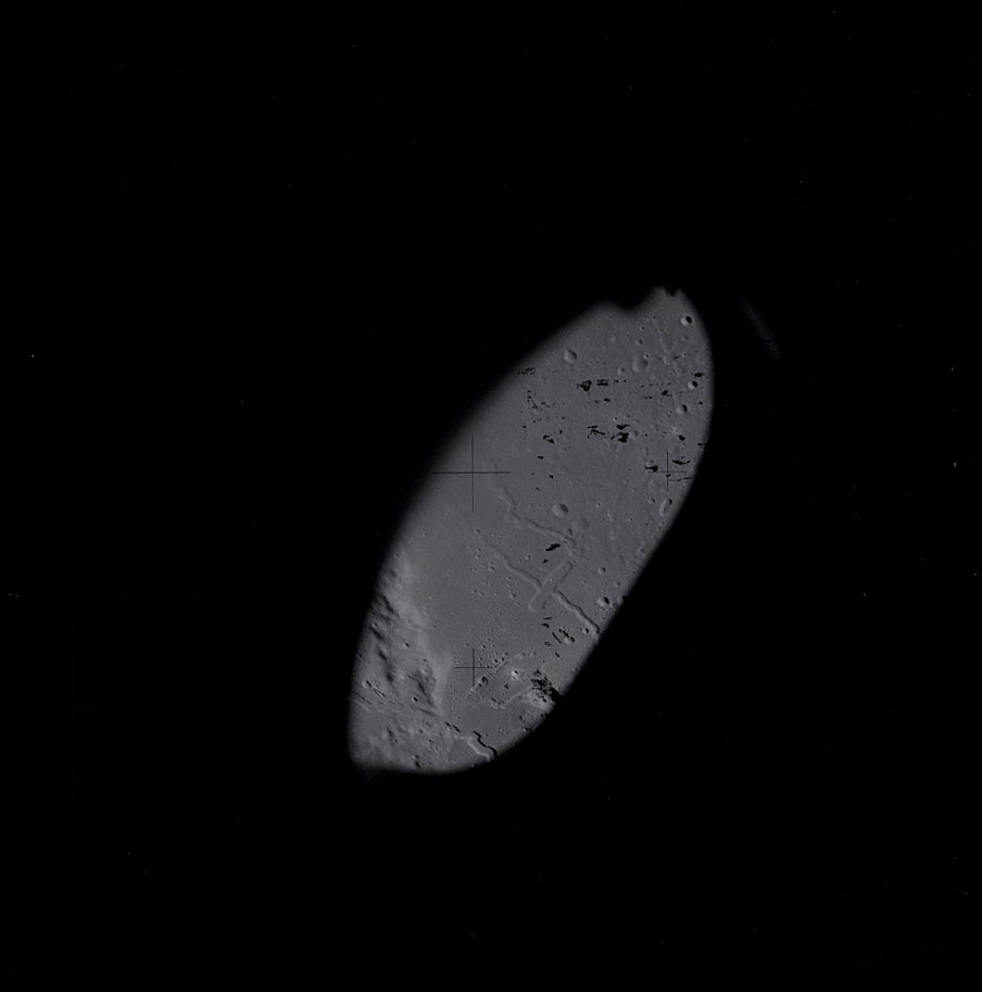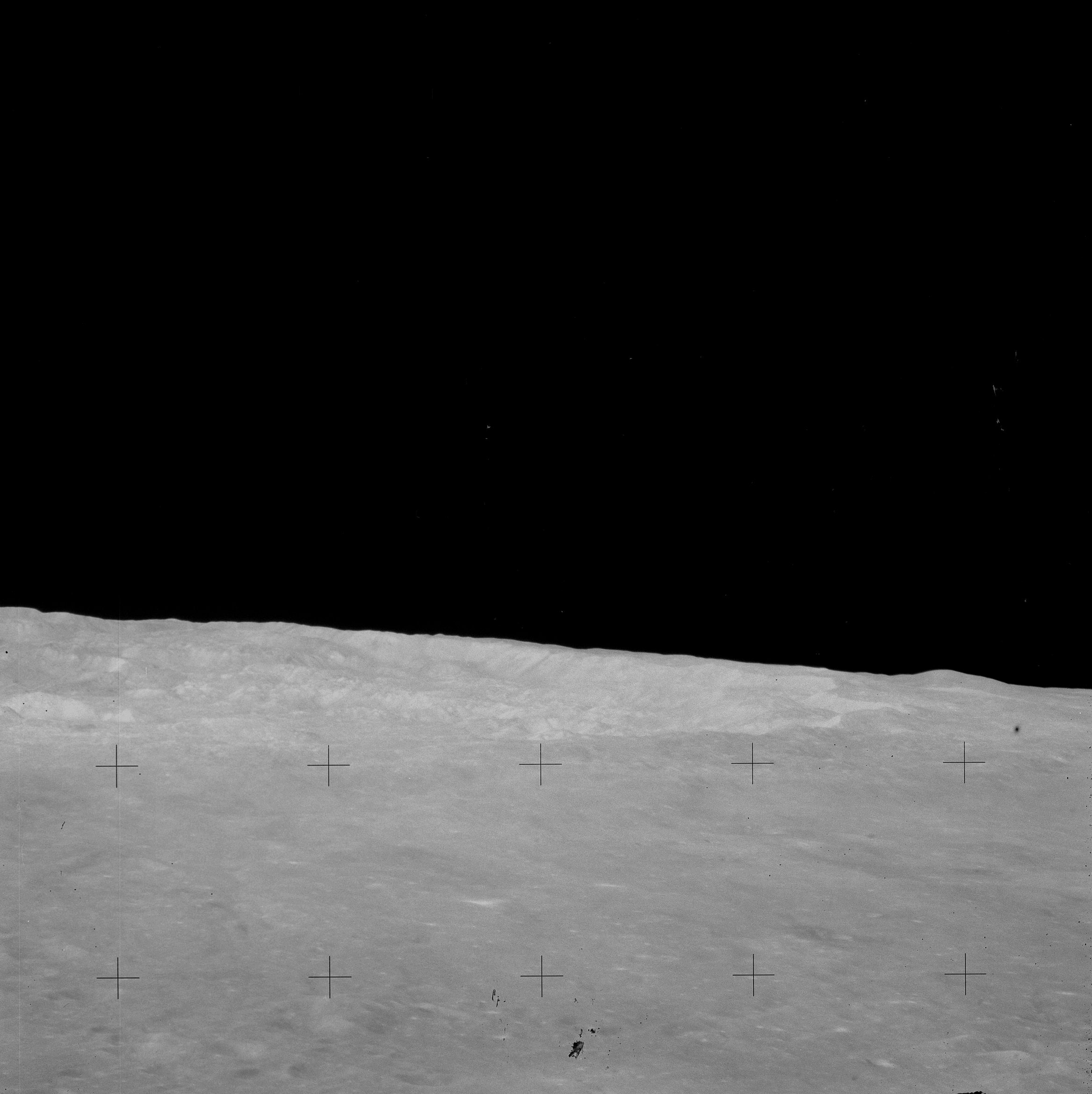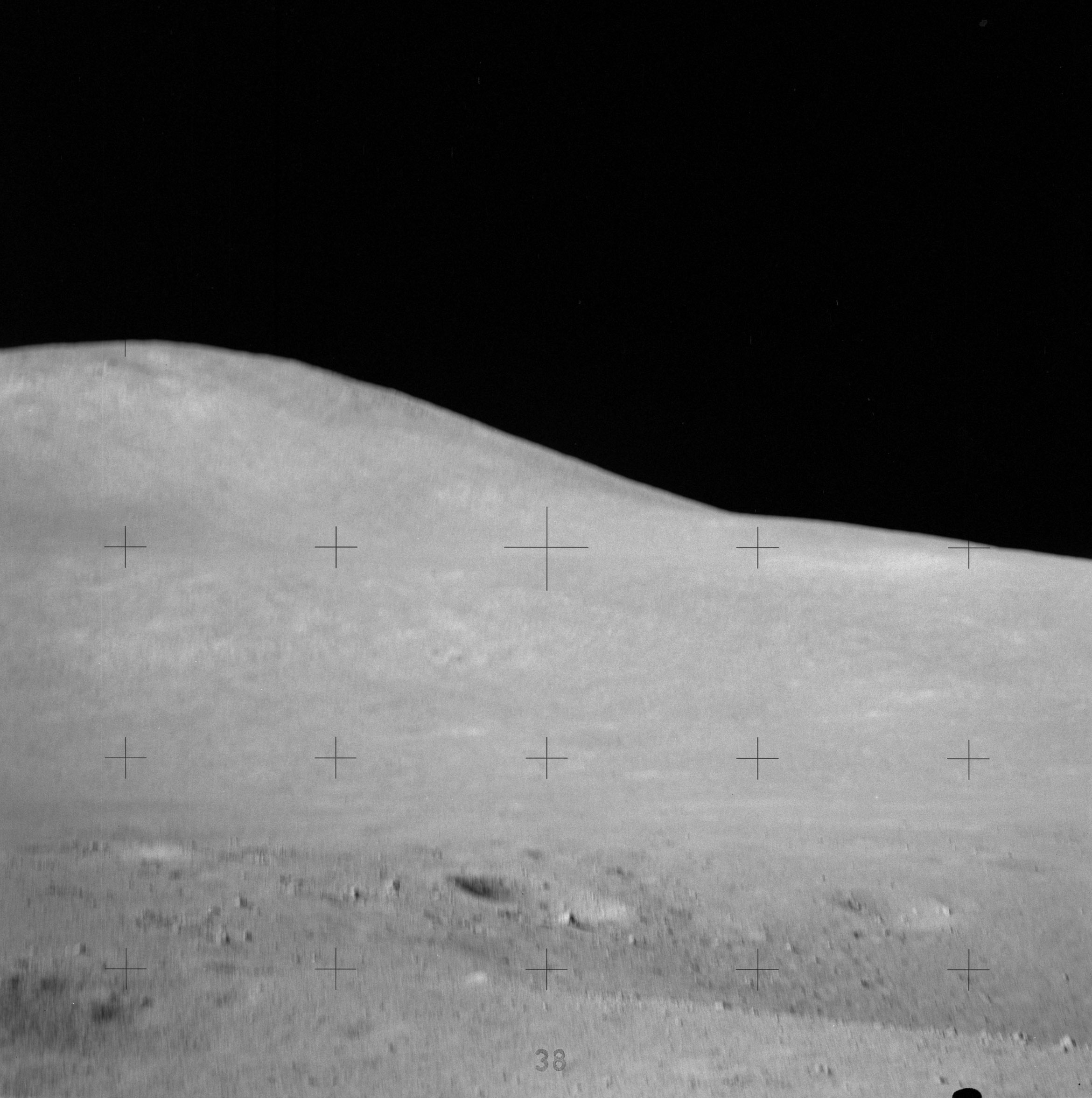 This picture was taken from the LM during CSM Rev 13 on the last pass over the landing site prior to the descent. A labeled version shows some of the prominent landmarks.Rev 16 Mapping (Metric) Camera Frame 0414 ( 13 Mb )