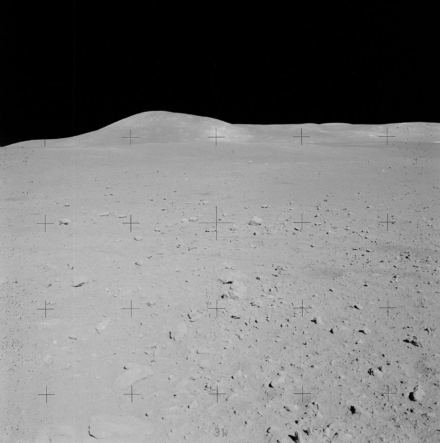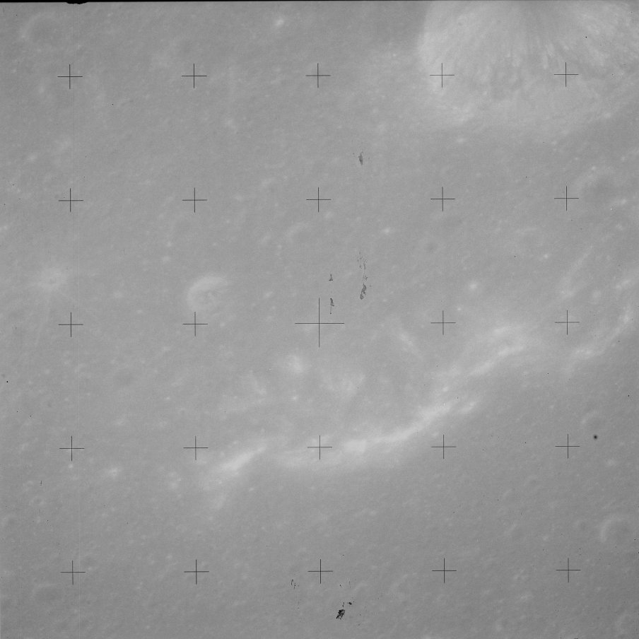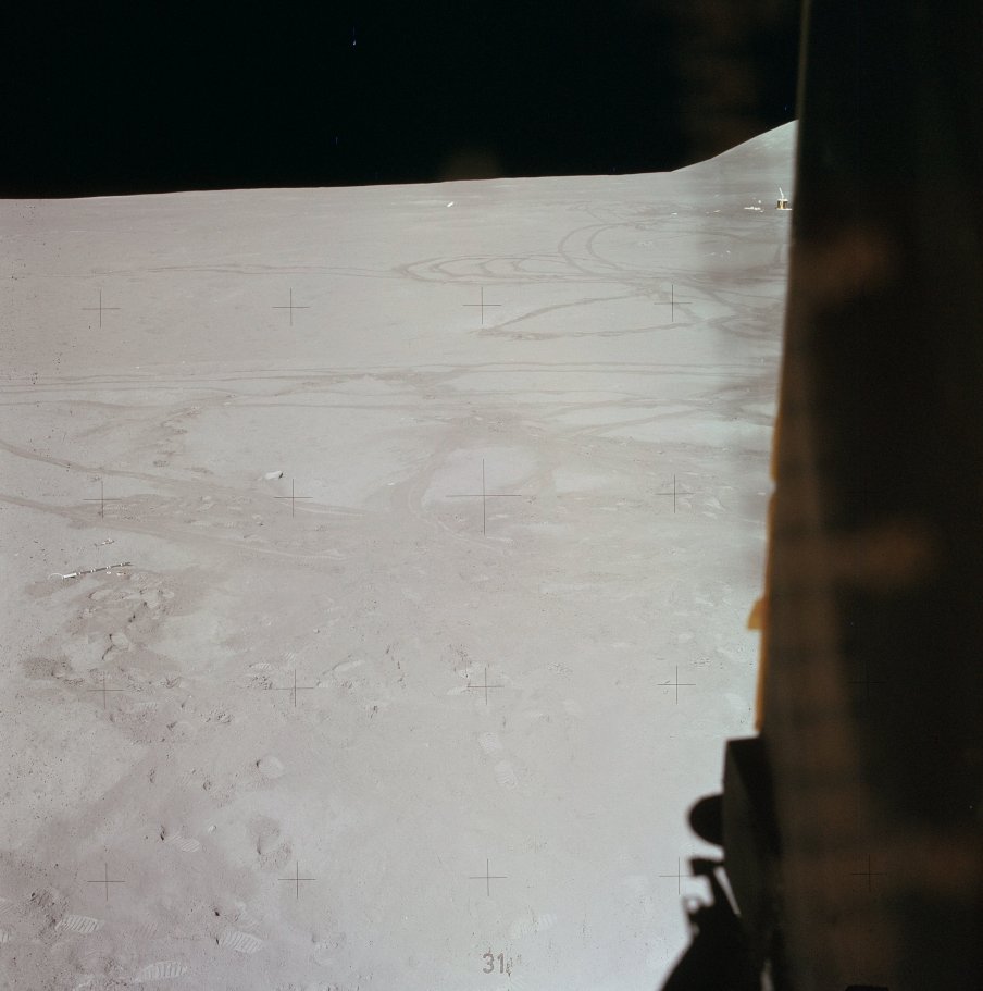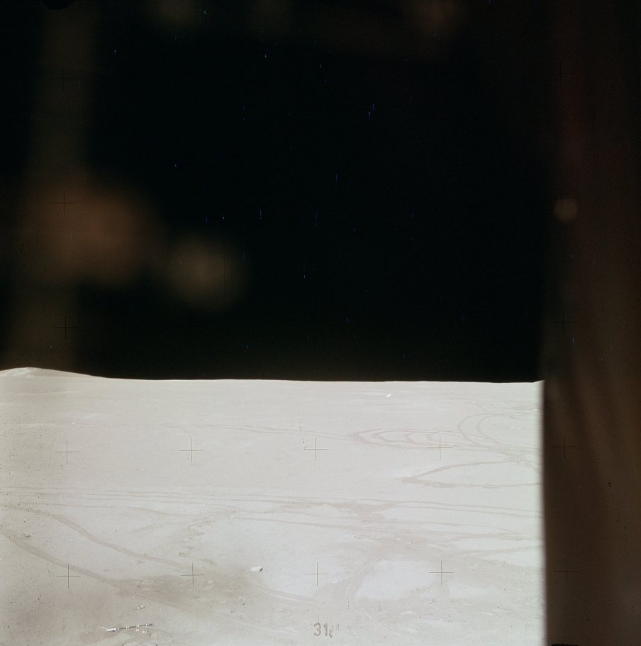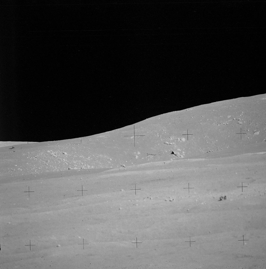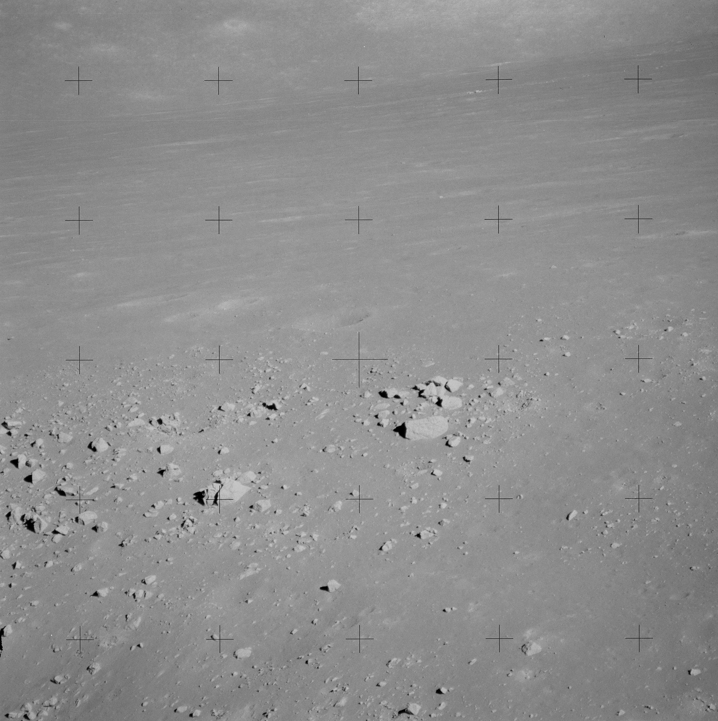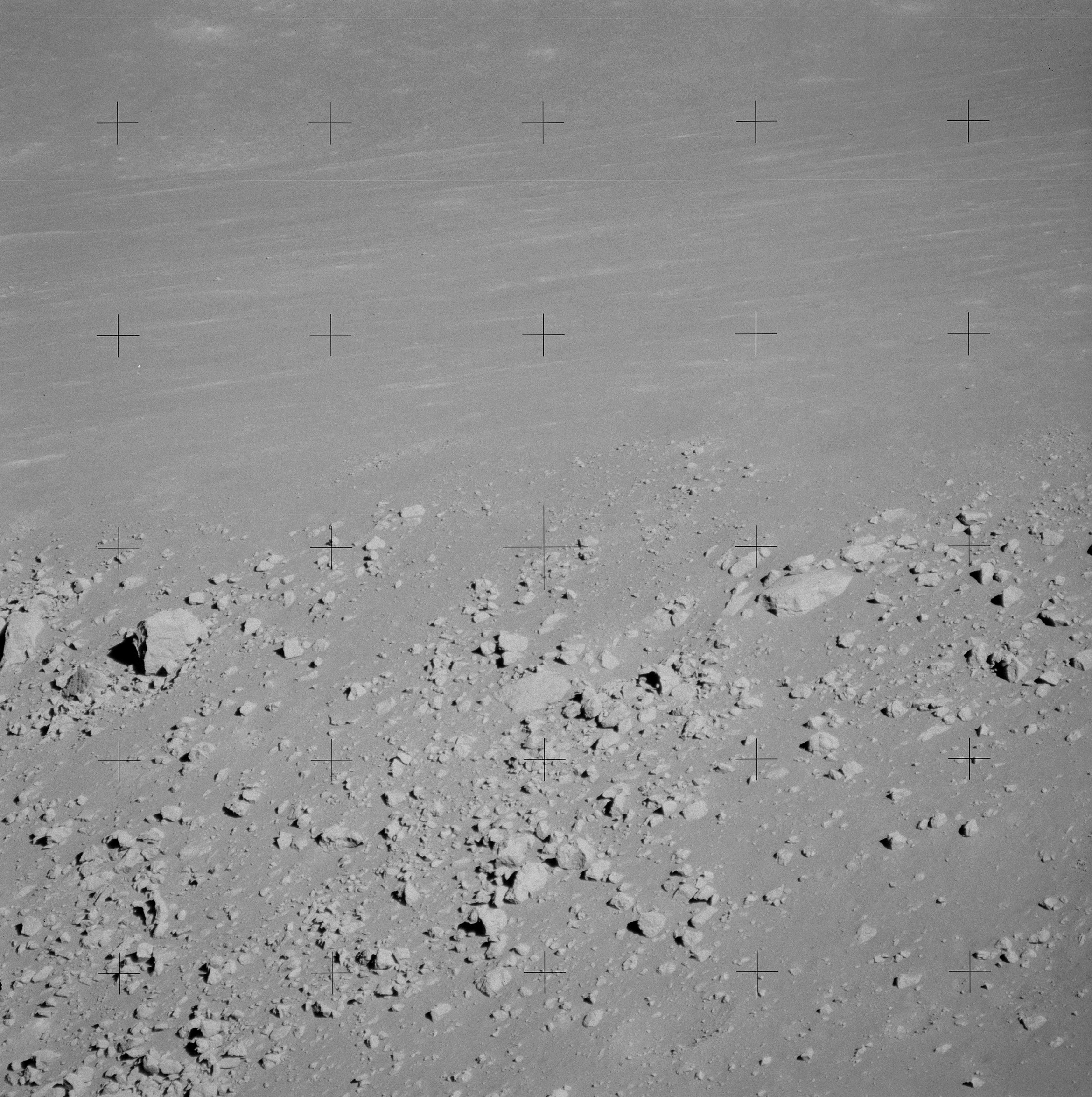 This picture was taken from the LM during CSM Rev 13 on the last pass over the landing site prior to the descent. A labeled version shows some of the prominent landmarks.Rev 16 Mapping (Metric) Camera Frame 0414 ( 13 Mb )