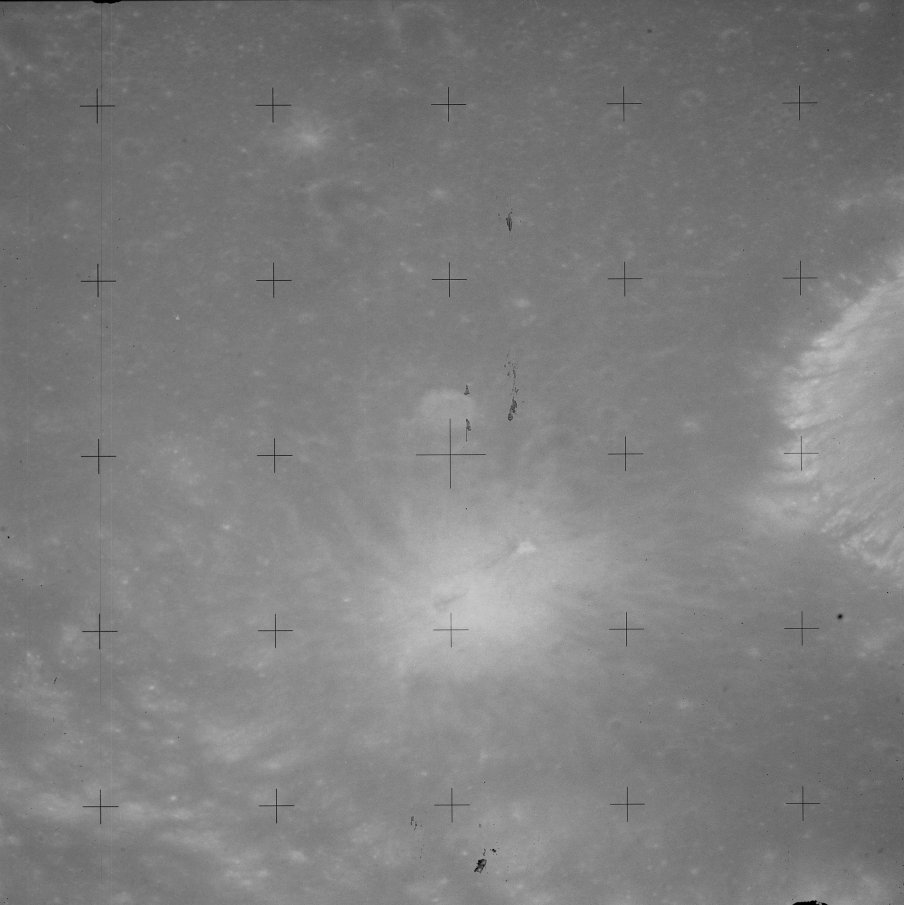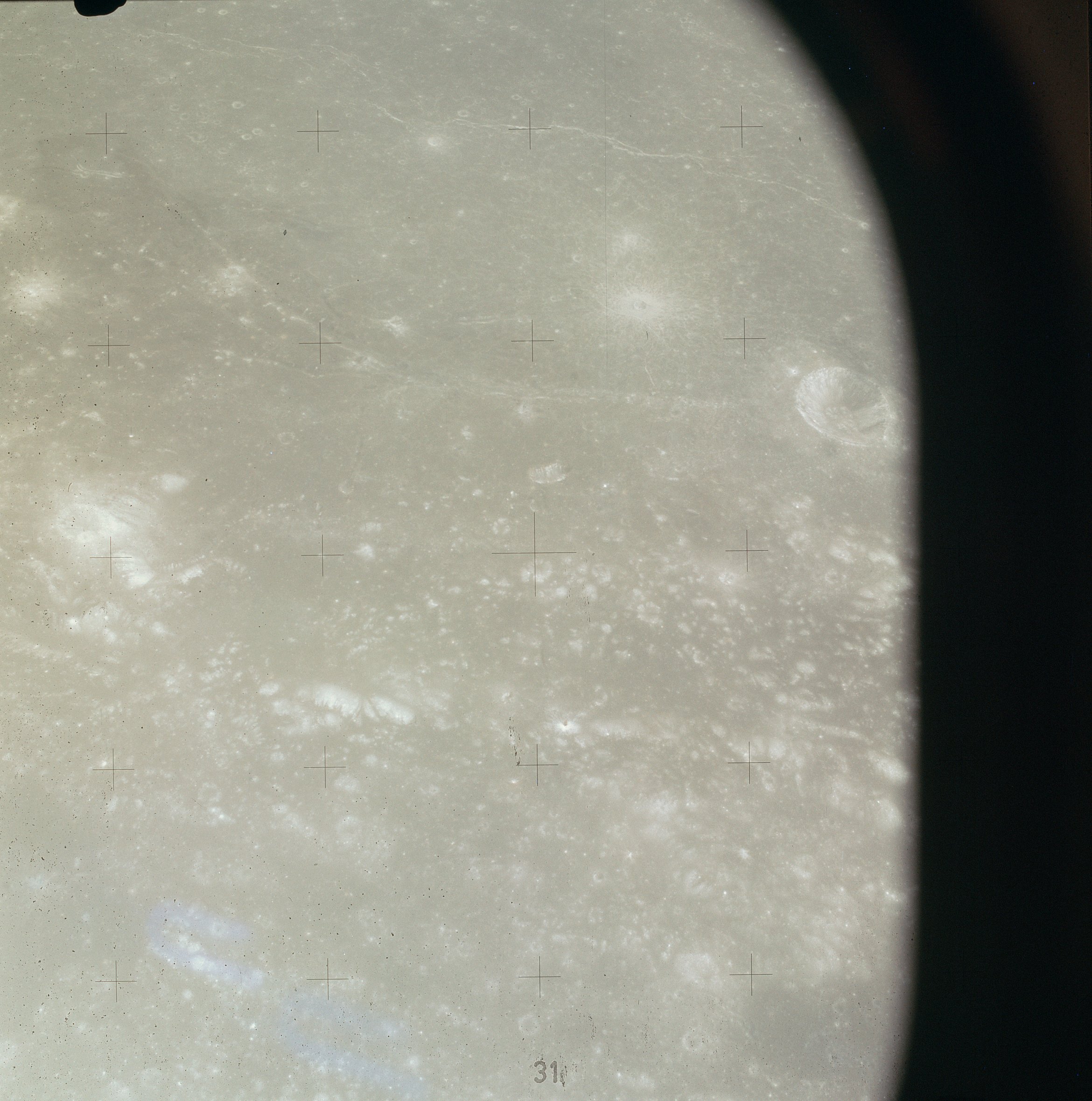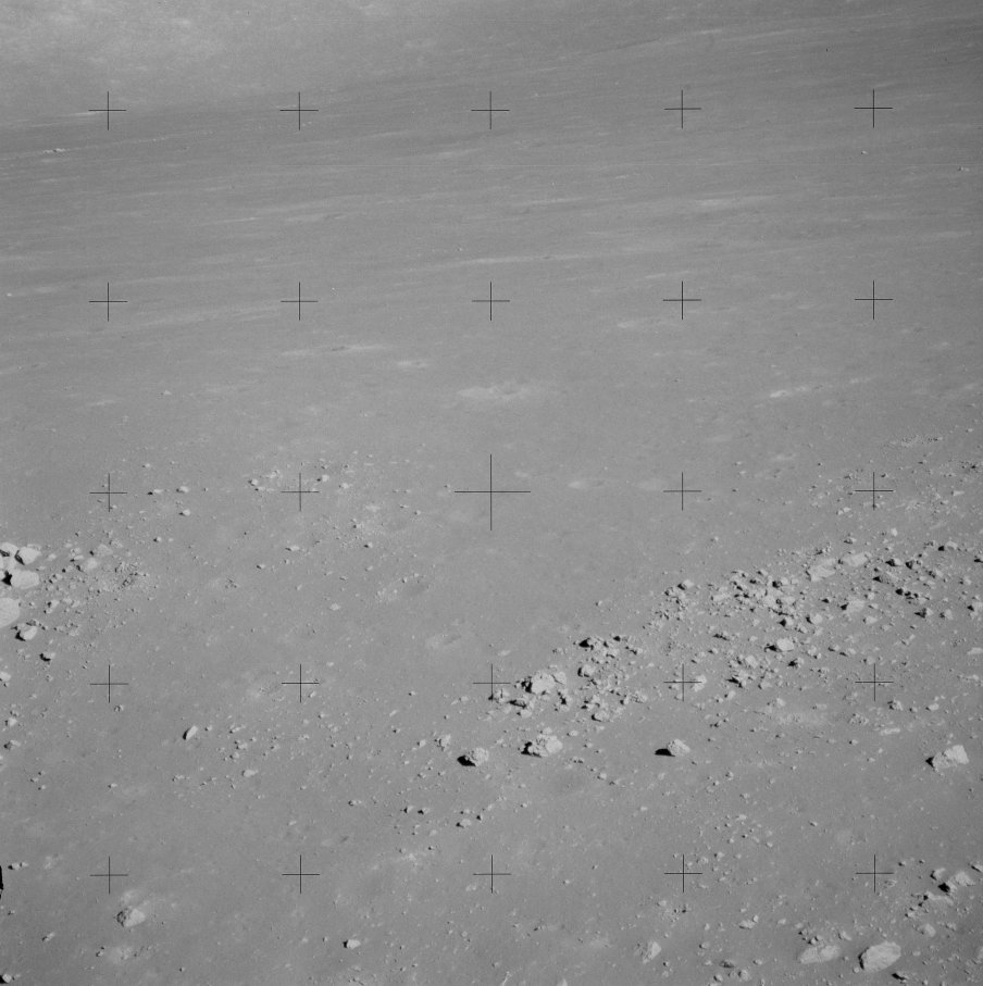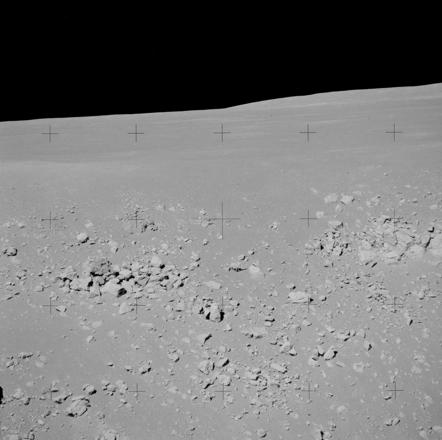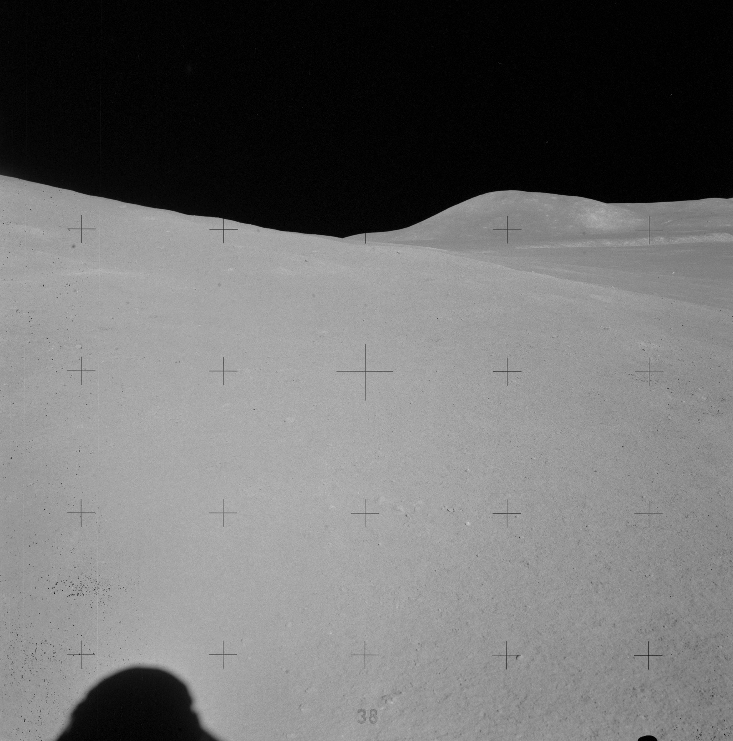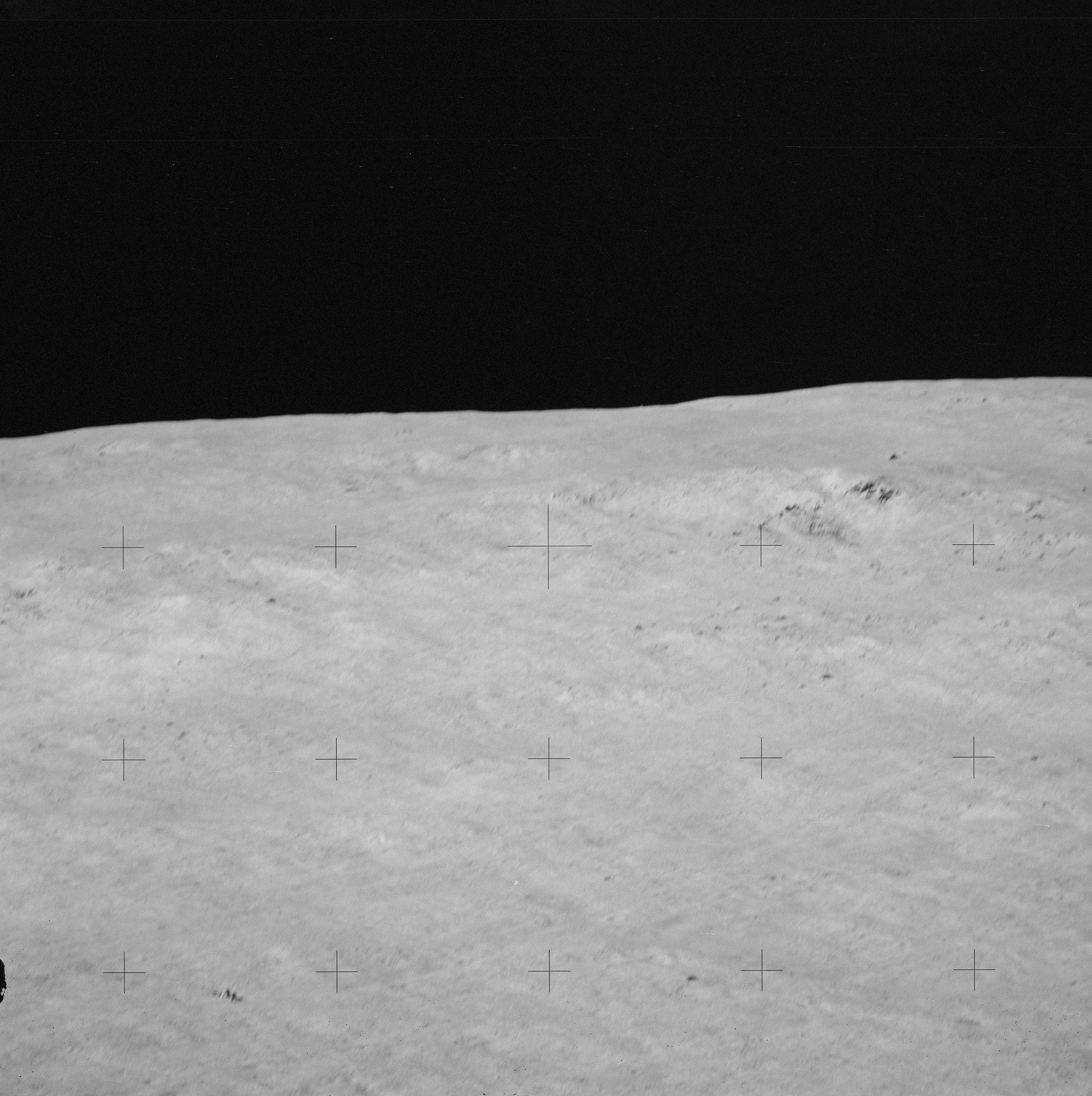 This picture was taken from the LM during CSM Rev 13 on the last pass over the landing site prior to the descent. A labeled version shows some of the prominent landmarks.Rev 16 Mapping (Metric) Camera Frame 0414 ( 13 Mb )