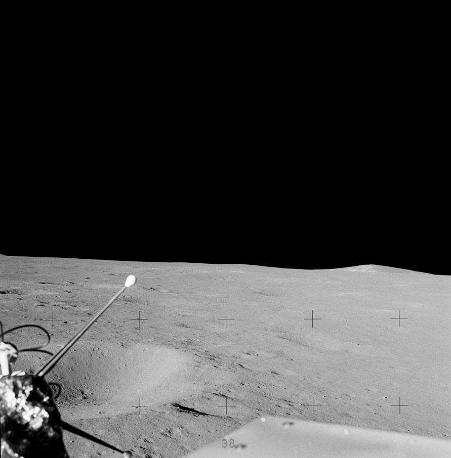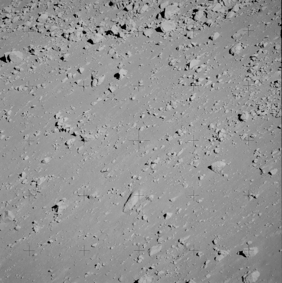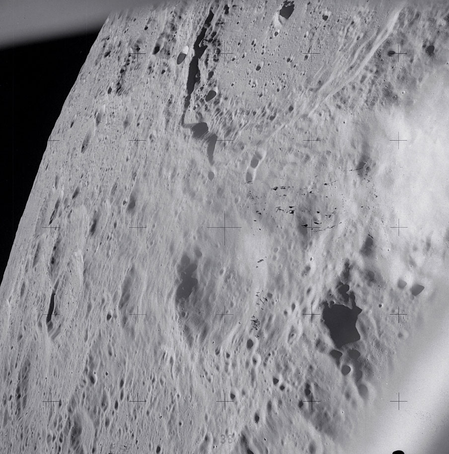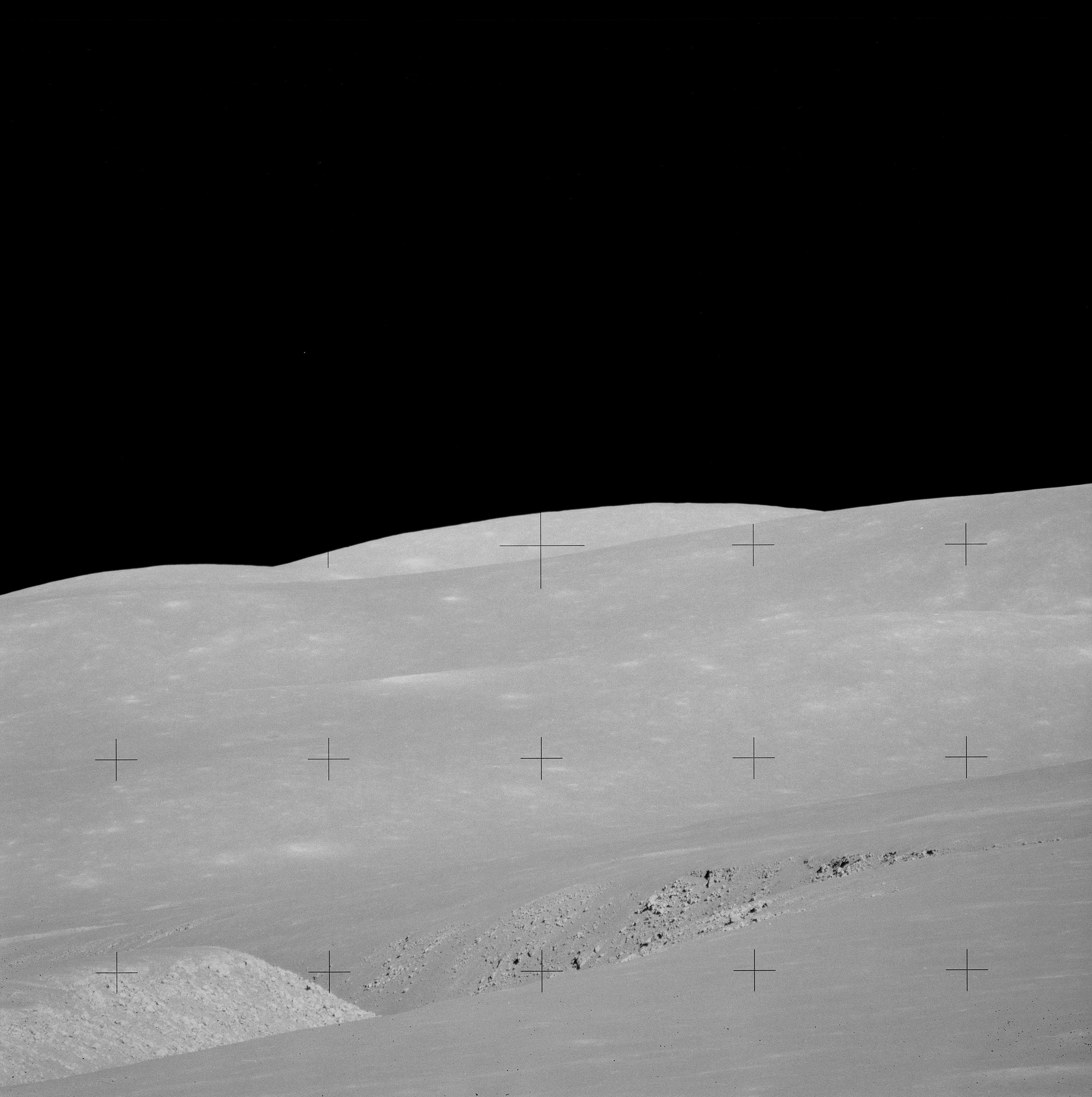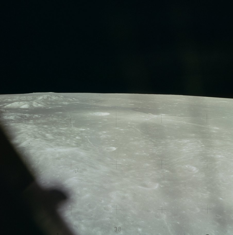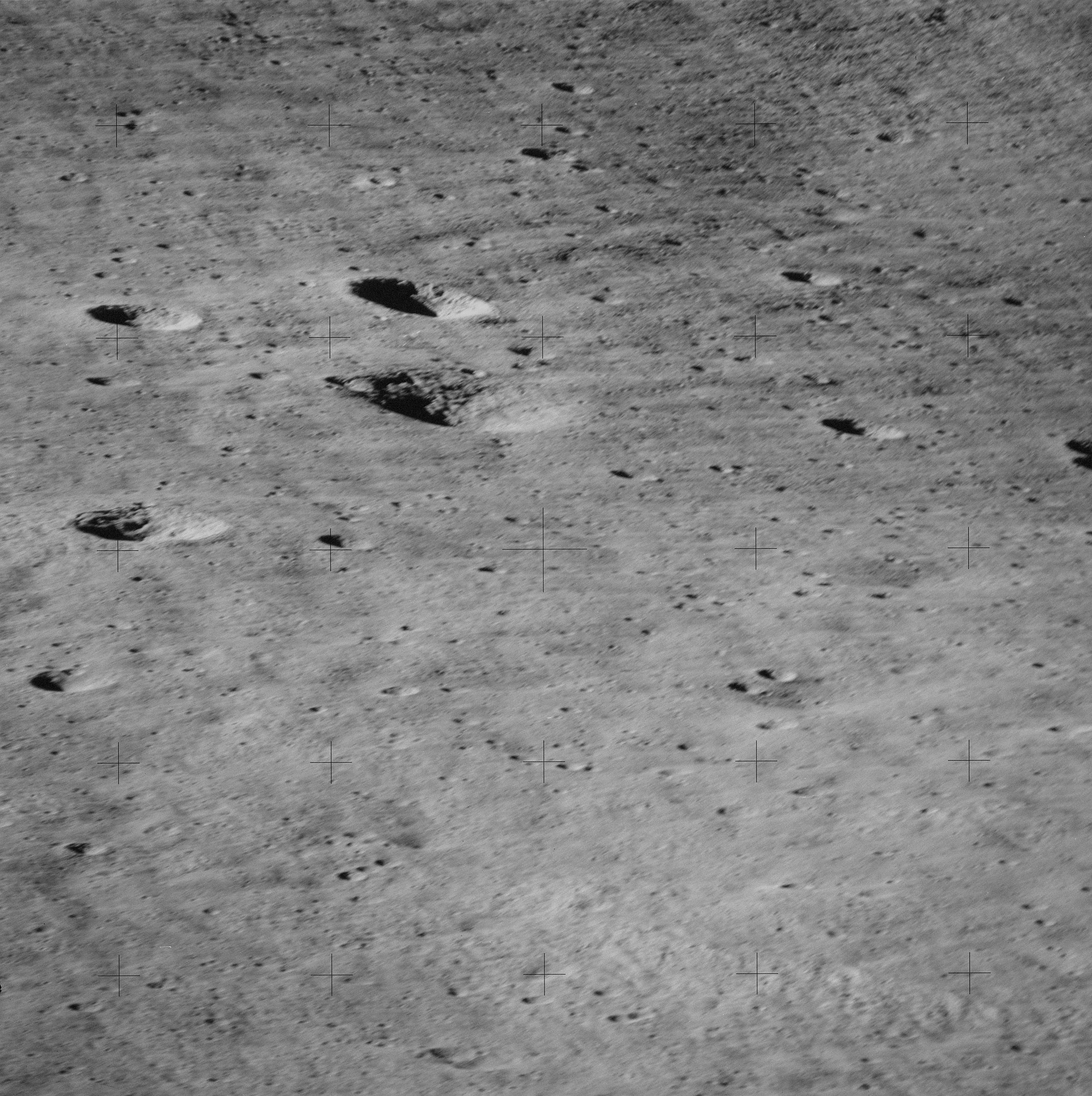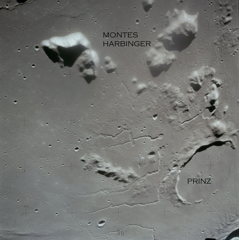 This picture was taken from the LM during CSM Rev 13 on the last pass over the landing site prior to the descent. A labeled version shows some of the prominent landmarks.Rev 16 Mapping (Metric) Camera Frame 0414 ( 13 Mb )