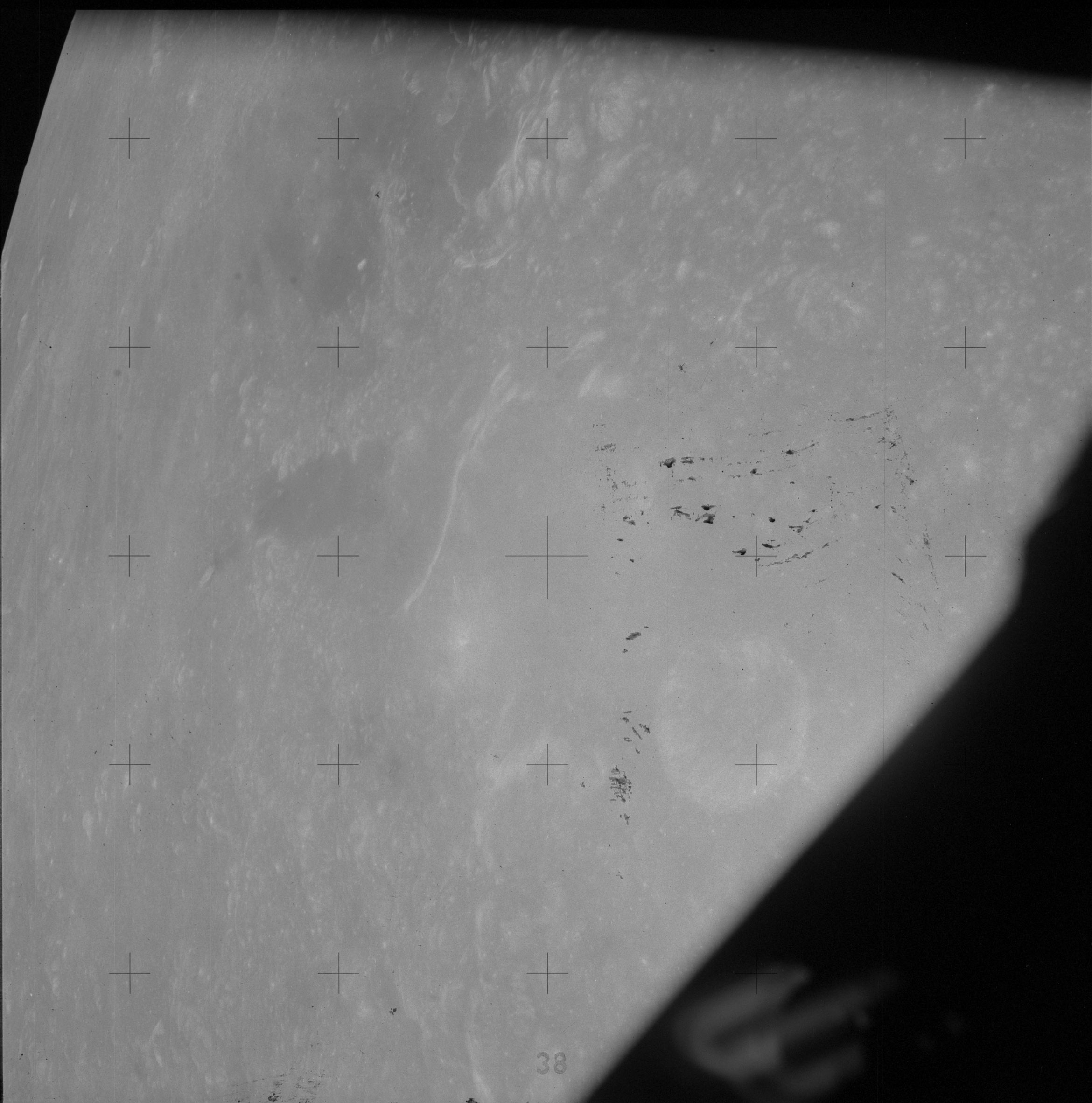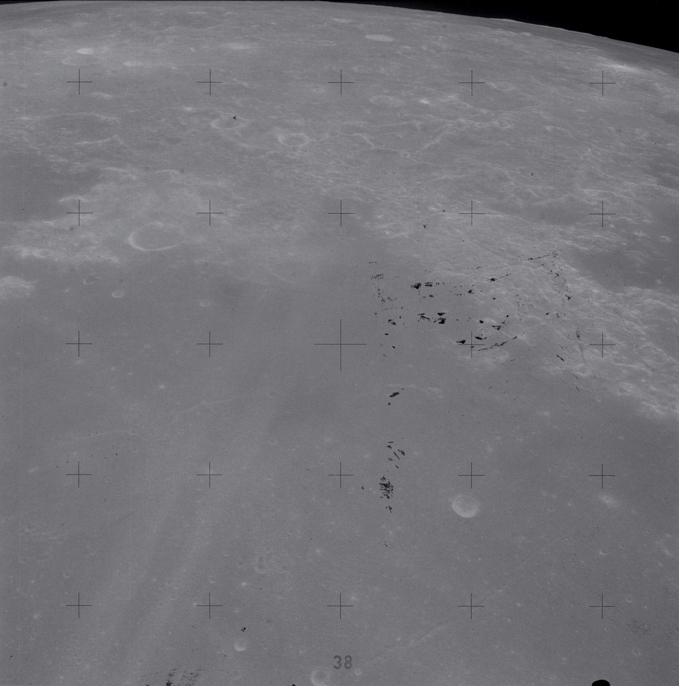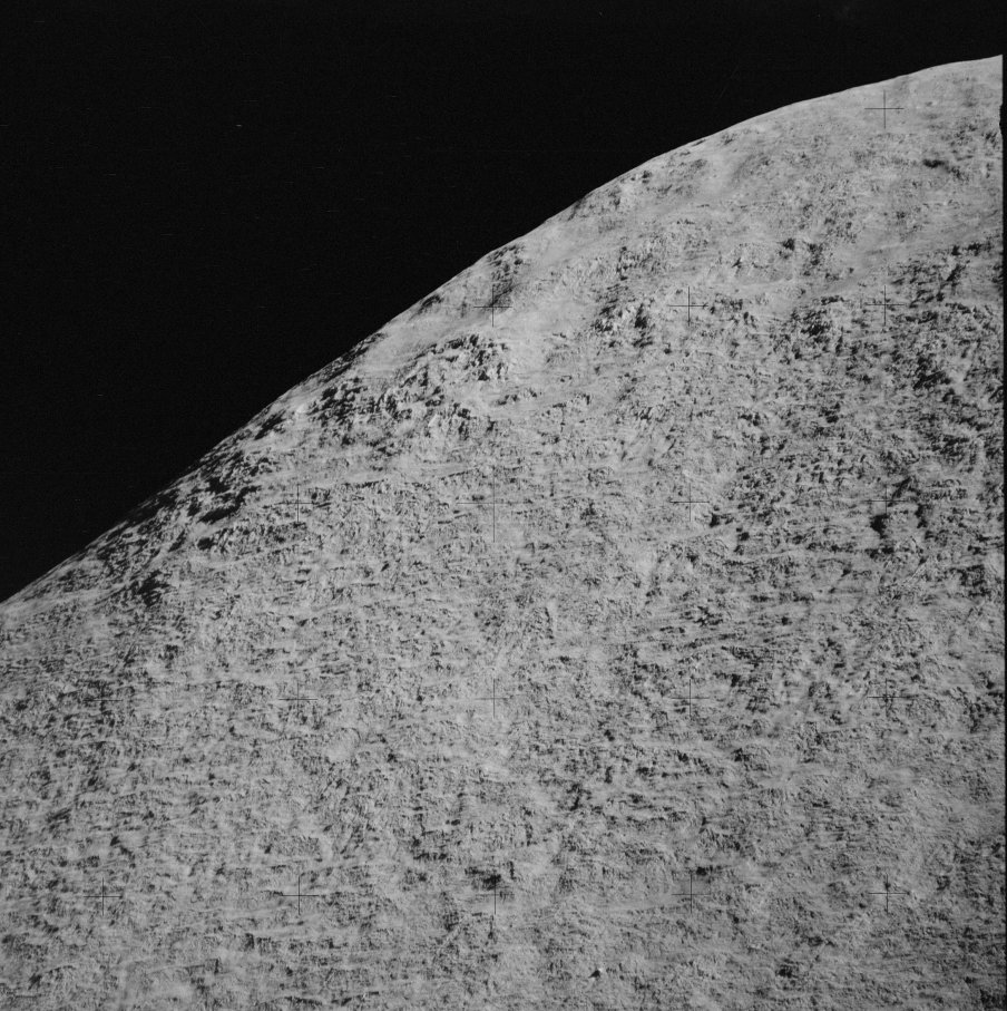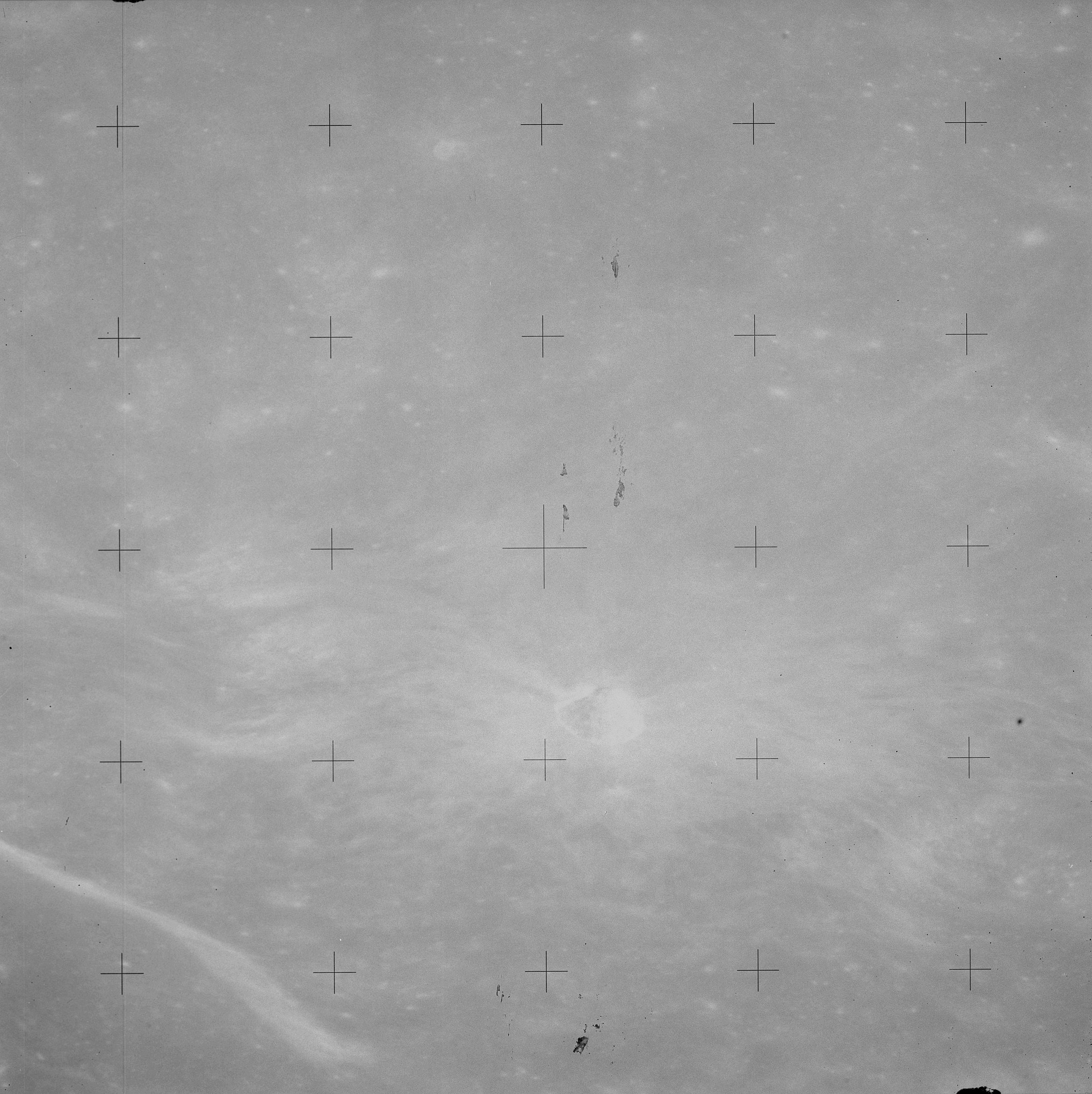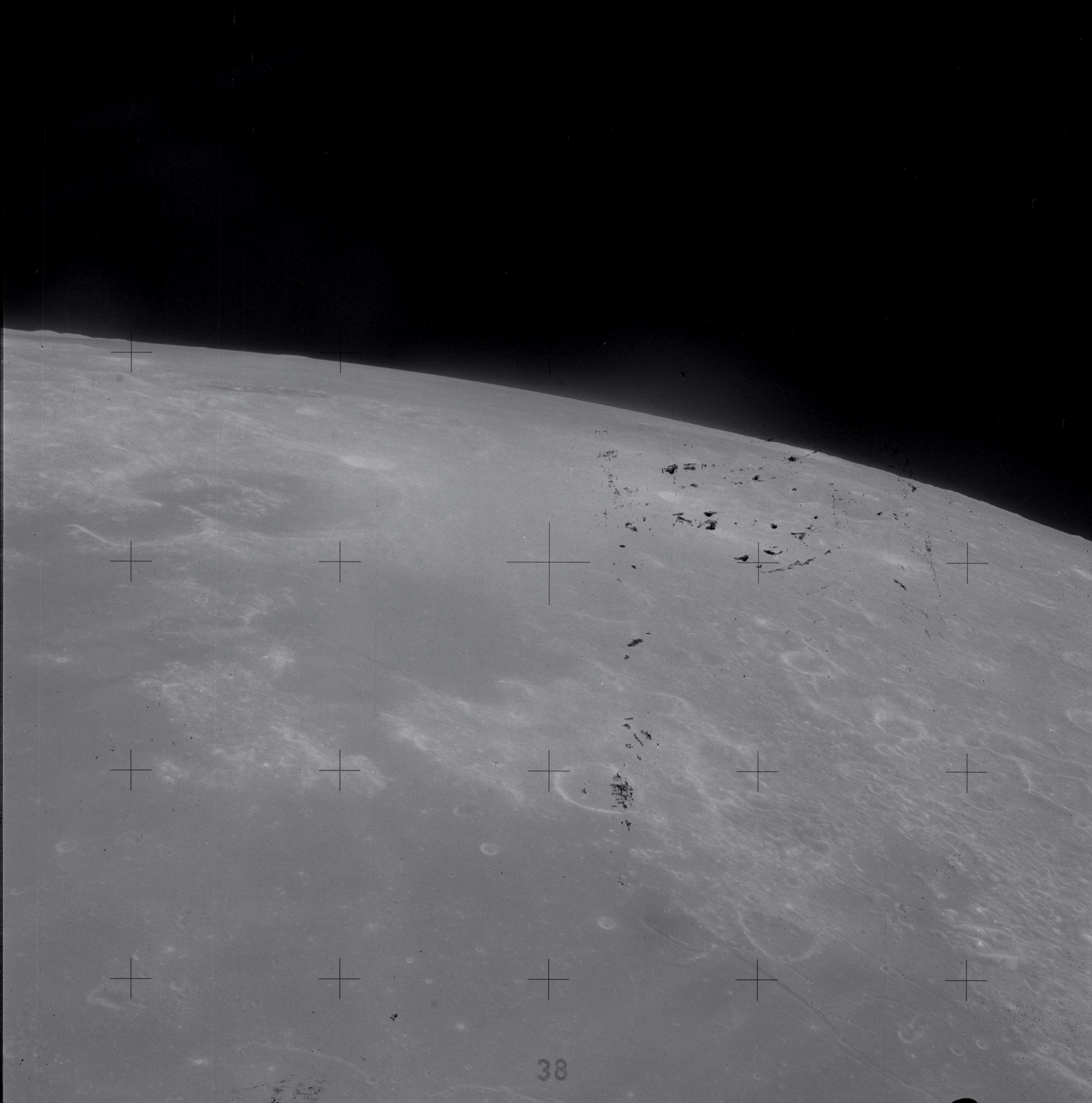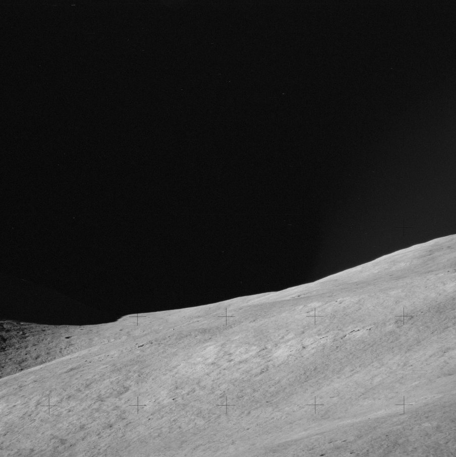 This picture was taken from the LM during CSM Rev 13 on the last pass over the landing site prior to the descent. A labeled version shows some of the prominent landmarks.Rev 16 Mapping (Metric) Camera Frame 0414 ( 13 Mb )