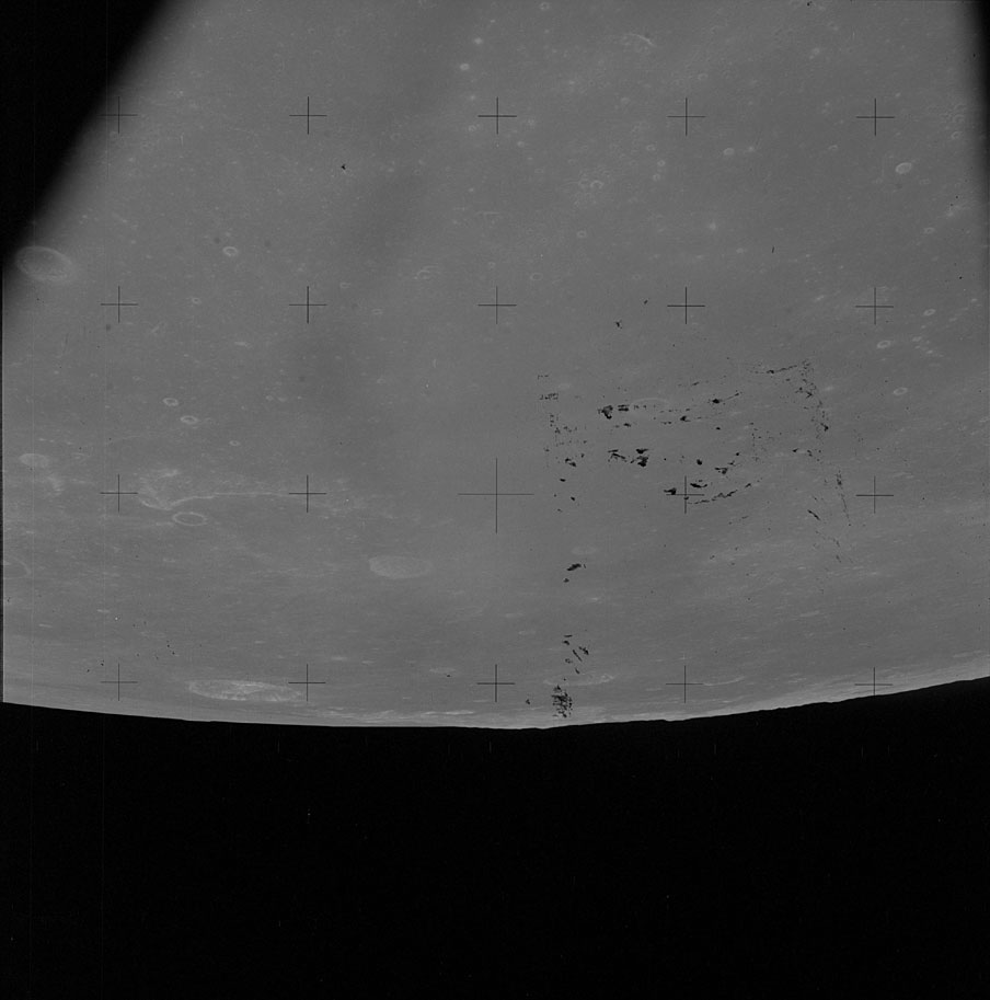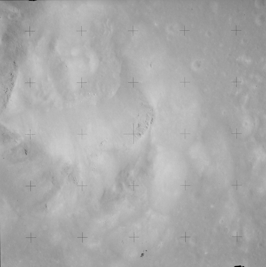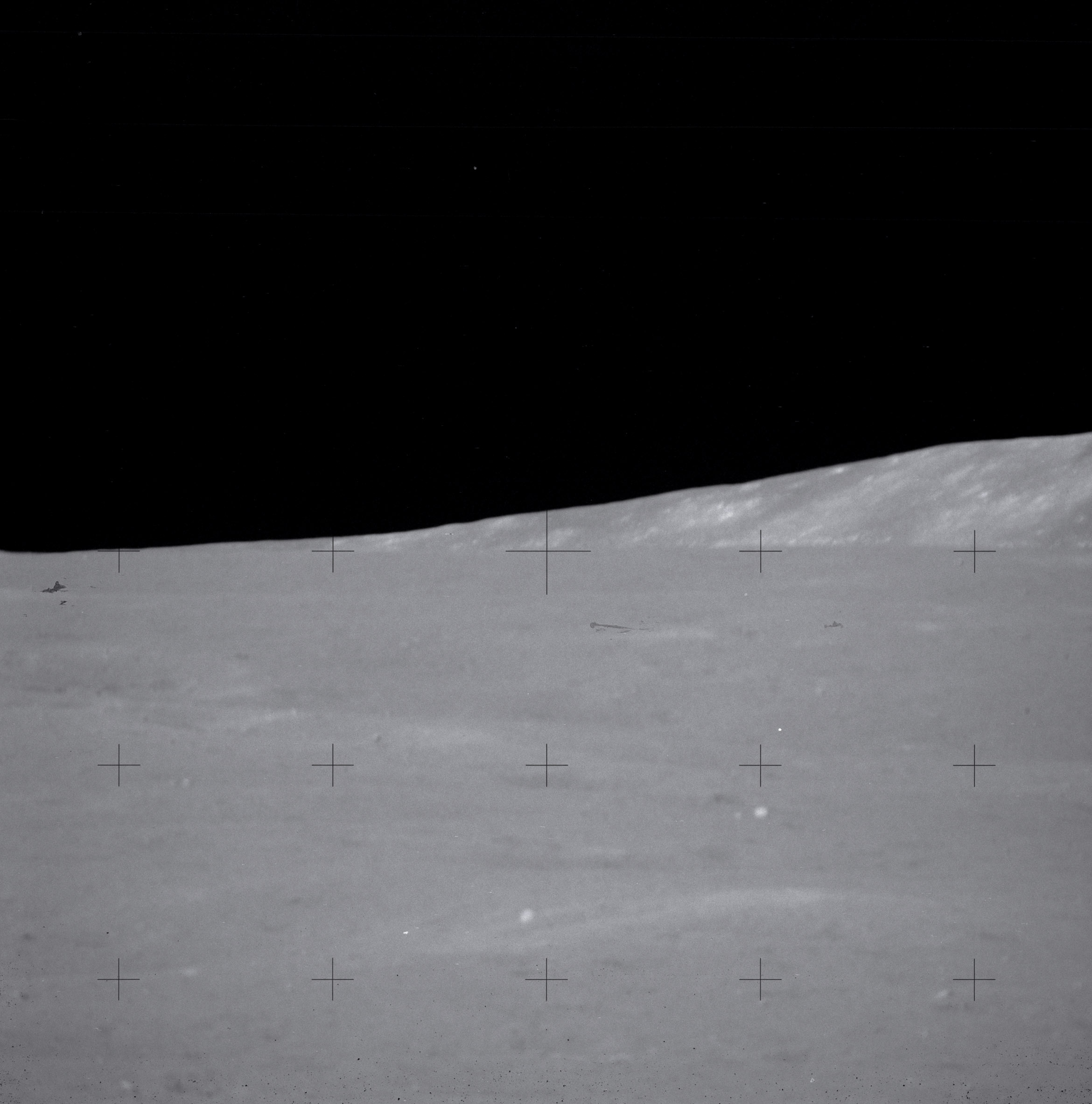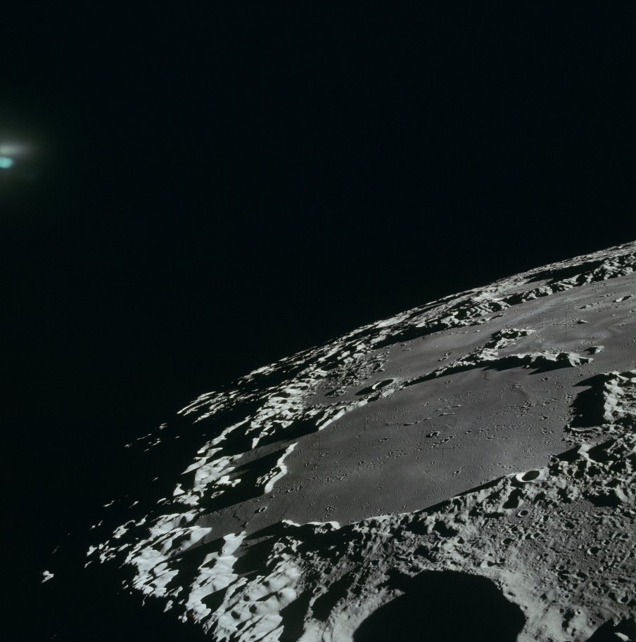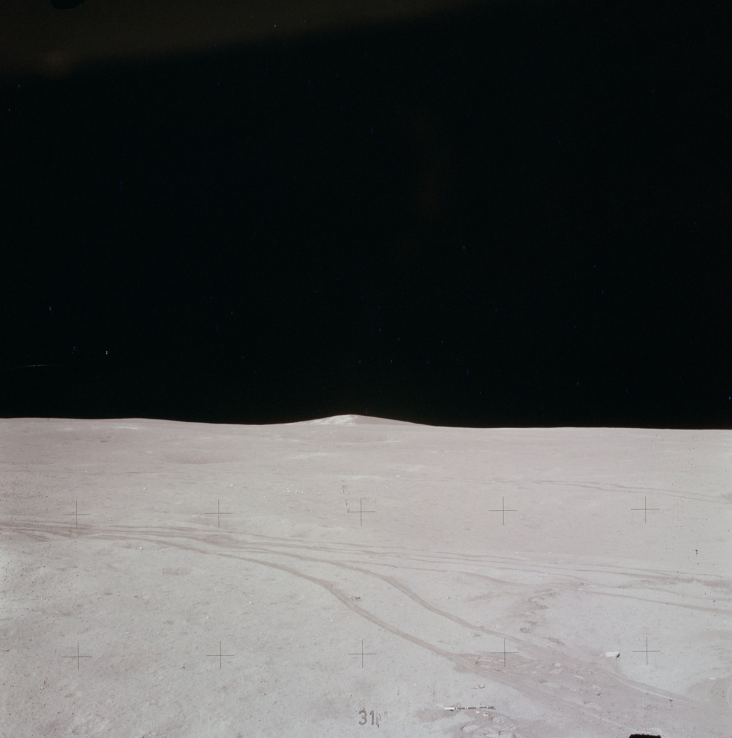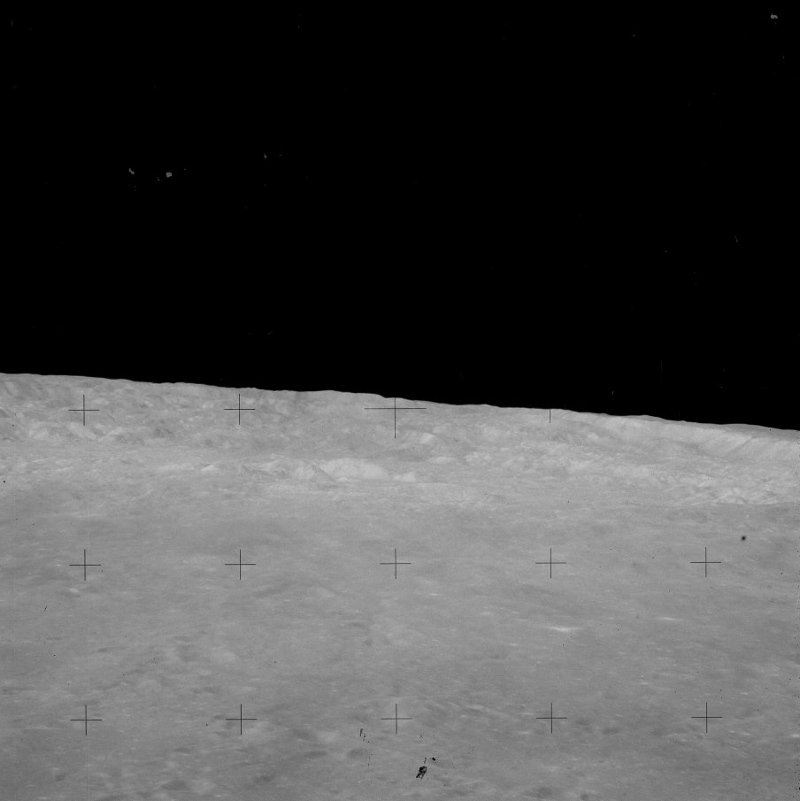 This picture was taken from the LM during CSM Rev 13 on the last pass over the landing site prior to the descent. A labeled version shows some of the prominent landmarks.Rev 16 Mapping (Metric) Camera Frame 0414 ( 13 Mb )