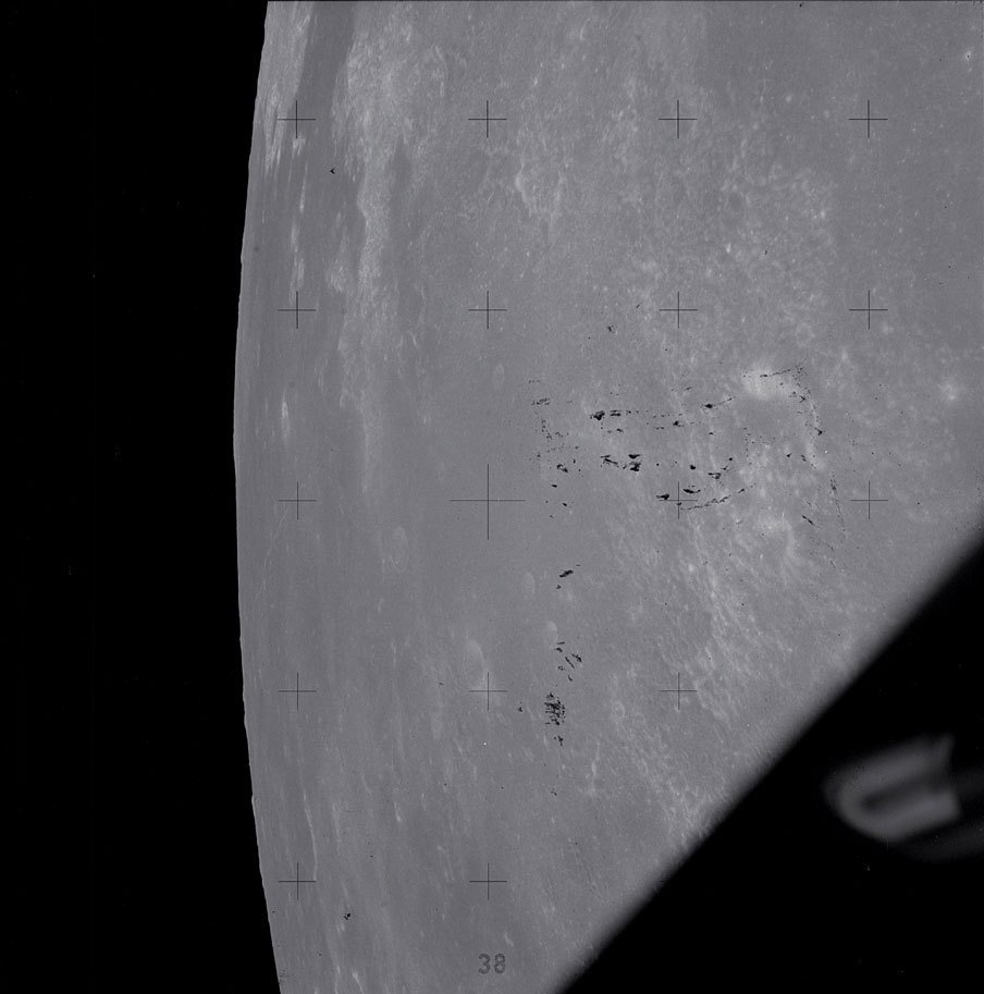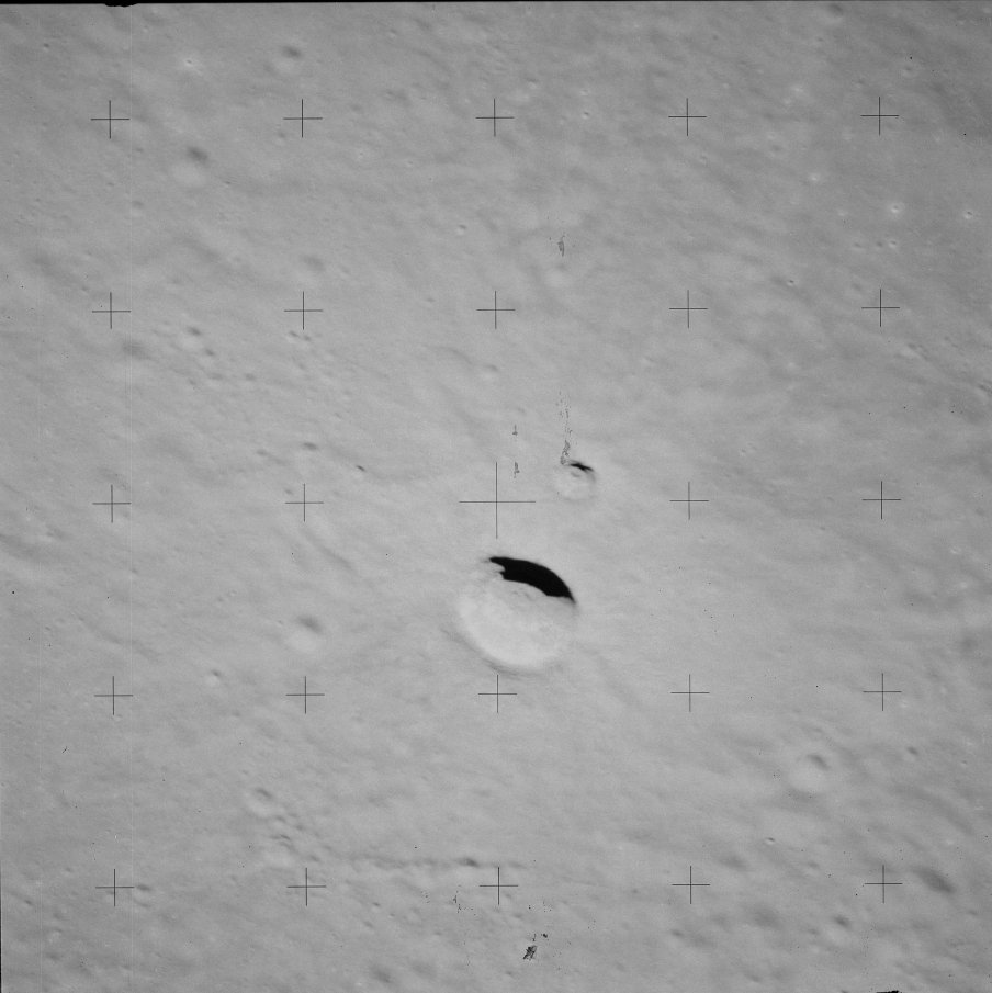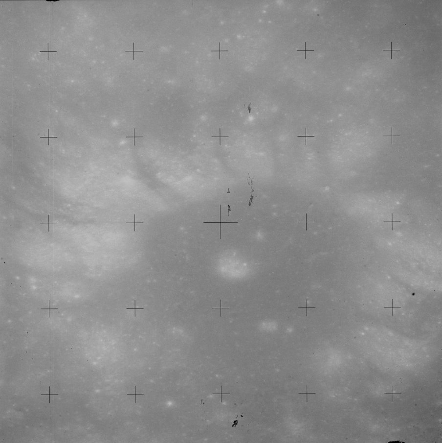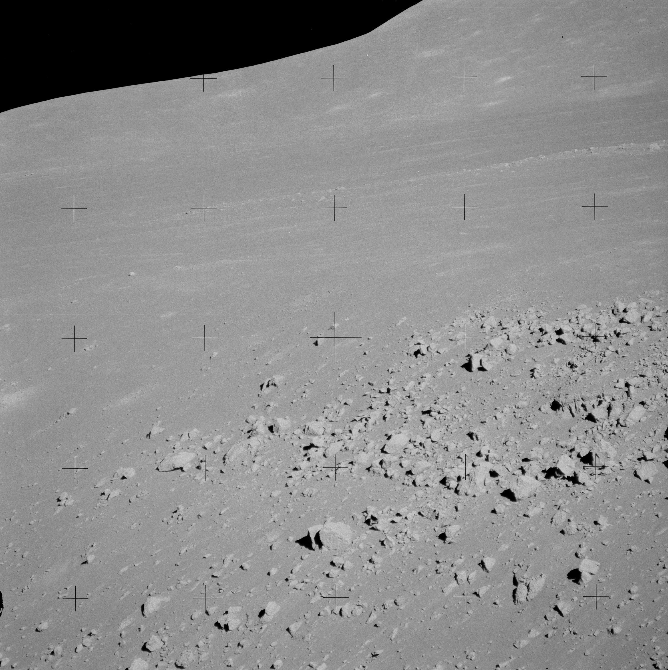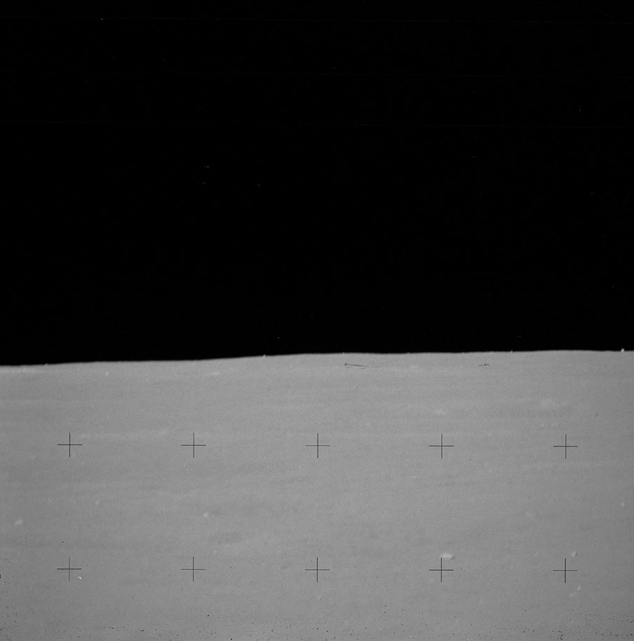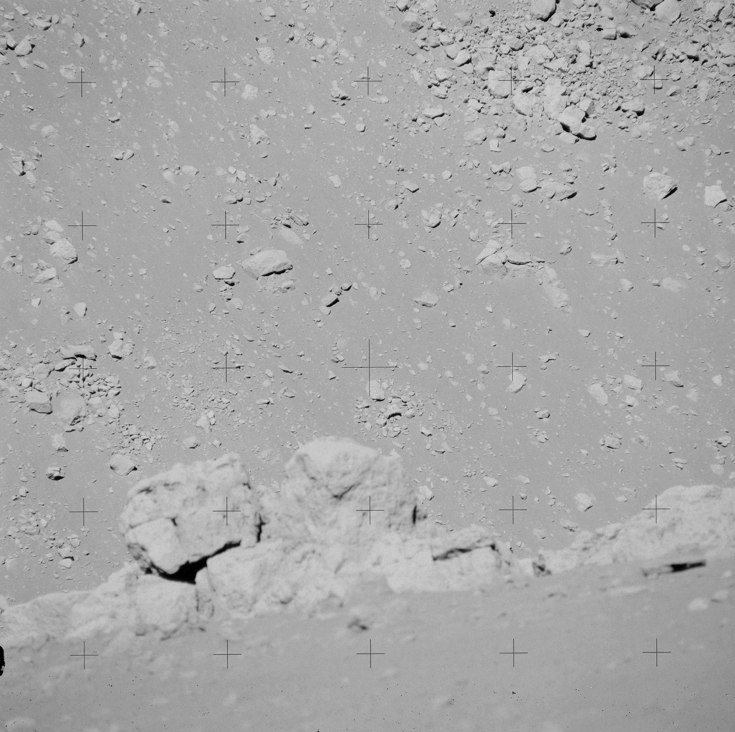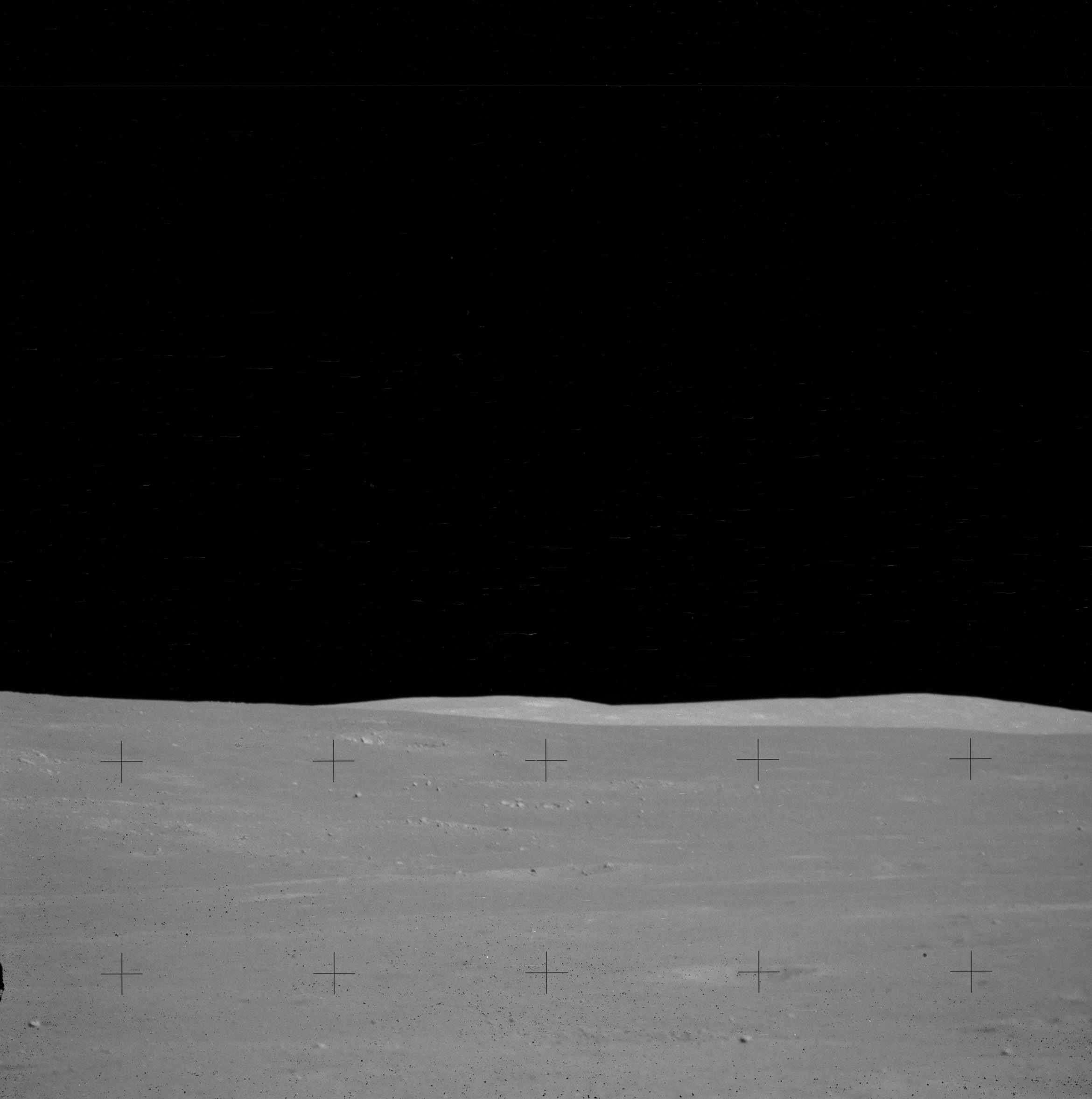 This picture was taken from the LM during CSM Rev 13 on the last pass over the landing site prior to the descent. A labeled version shows some of the prominent landmarks.Rev 16 Mapping (Metric) Camera Frame 0414 ( 13 Mb )