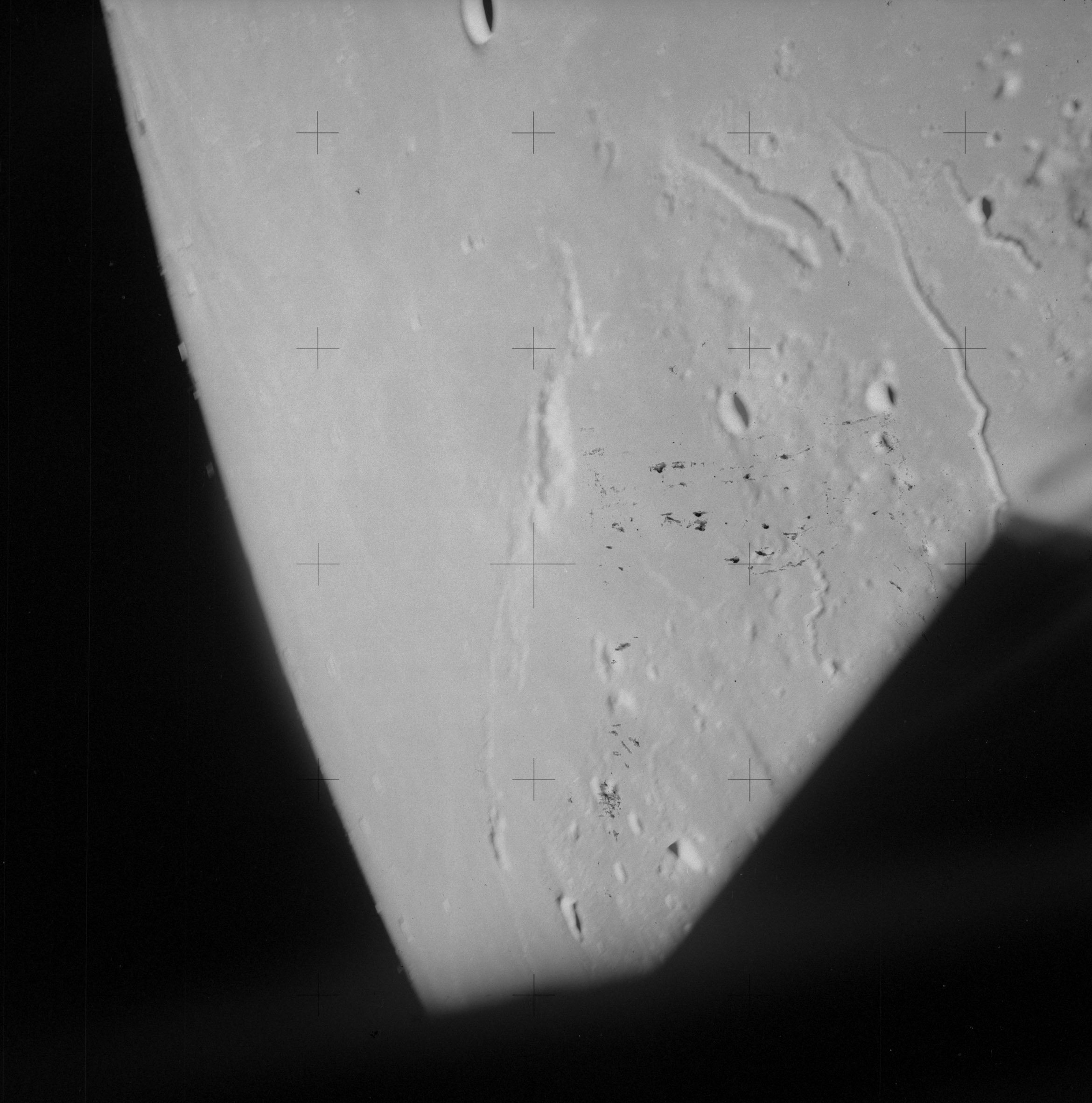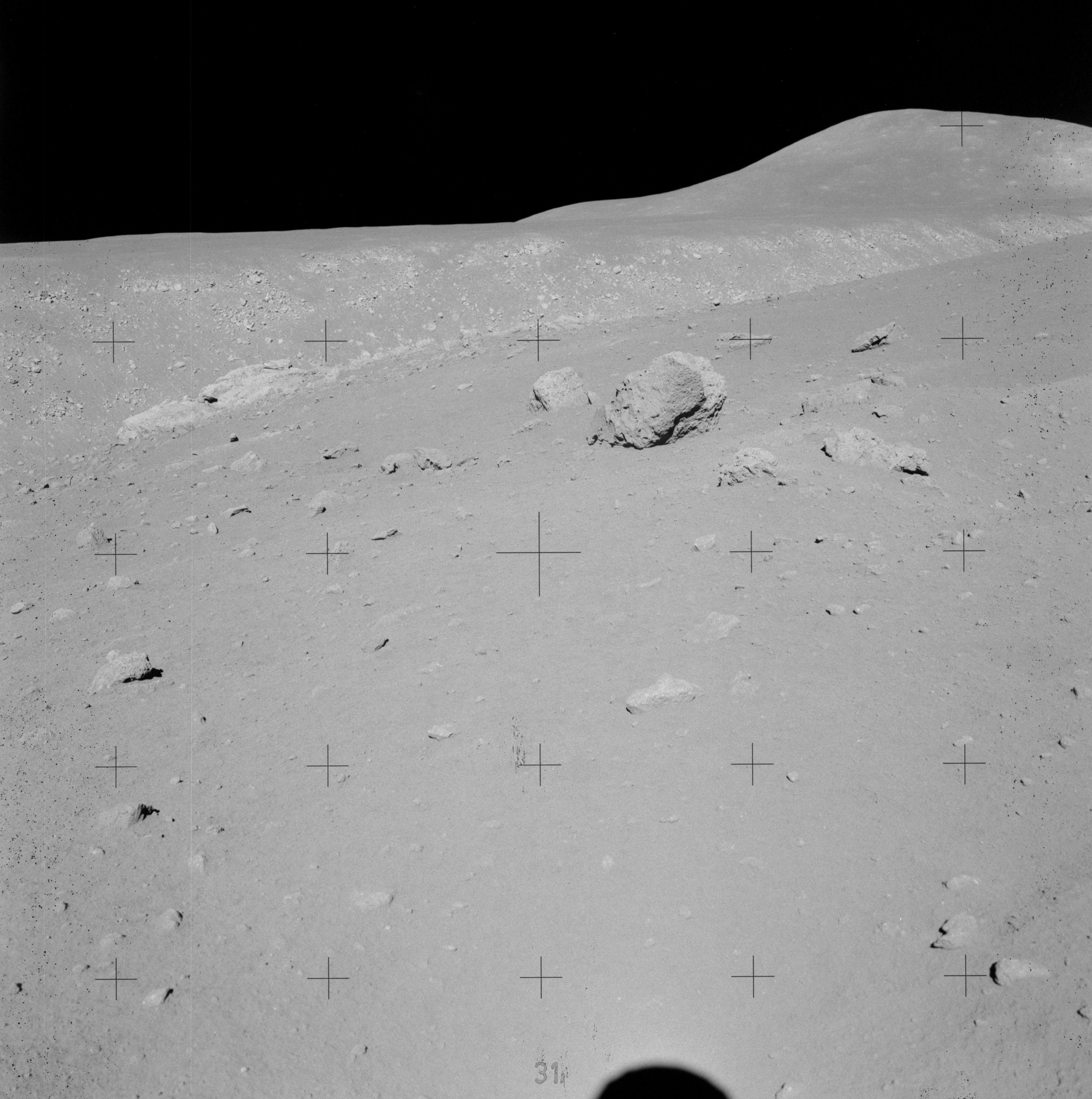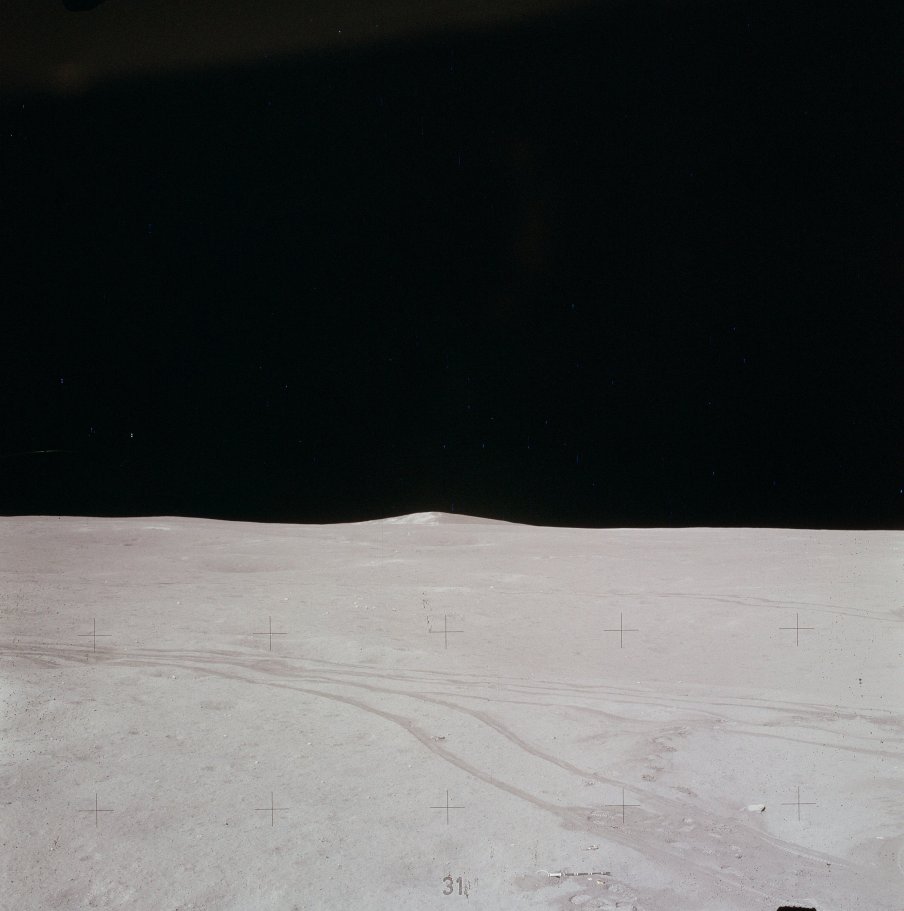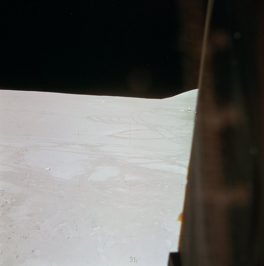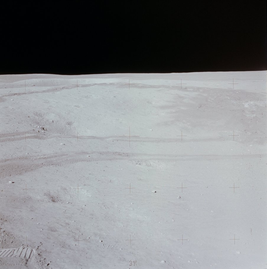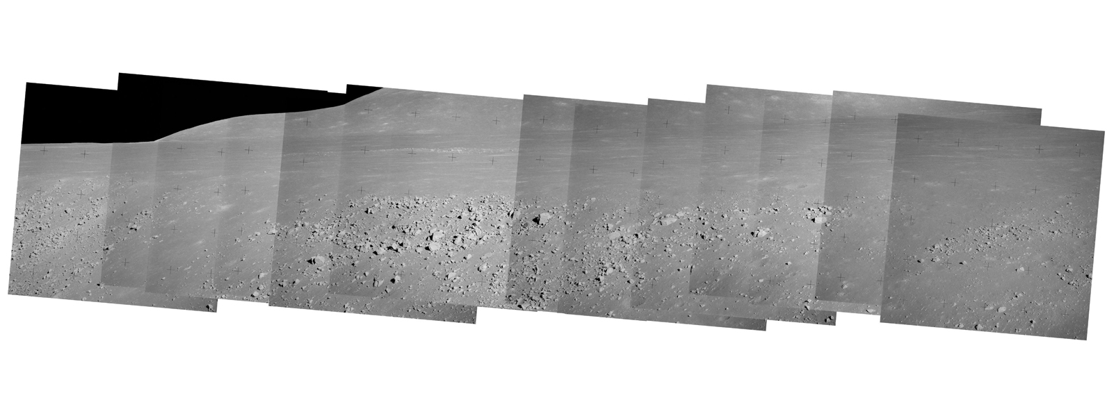 This picture was taken from the LM during CSM Rev 13 on the last pass over the landing site prior to the descent. A labeled version shows some of the prominent landmarks.Rev 16 Mapping (Metric) Camera Frame 0414 ( 13 Mb )