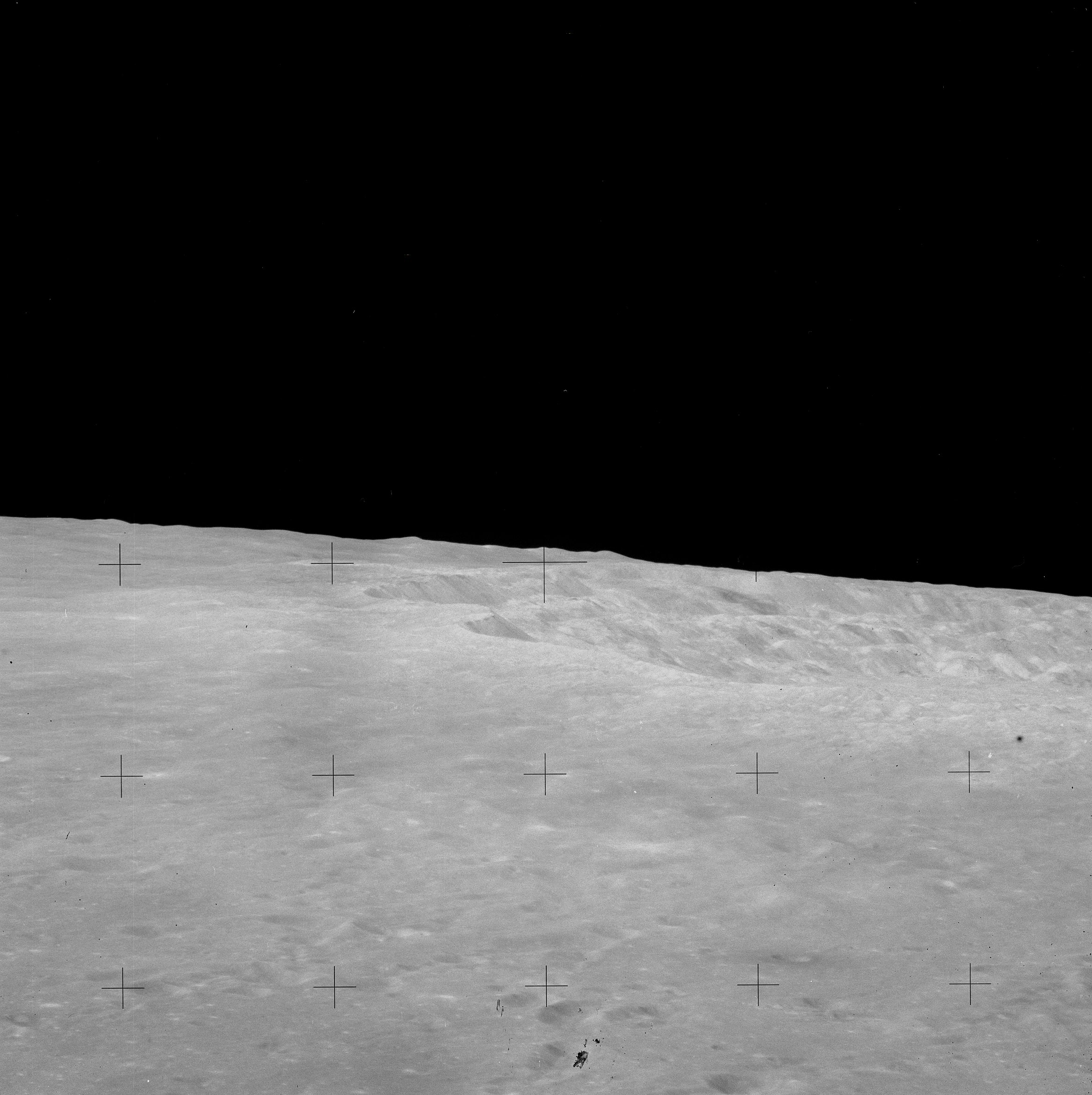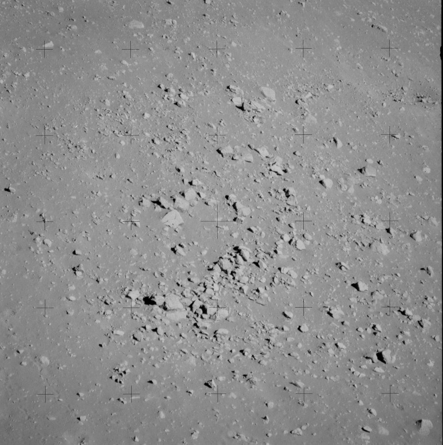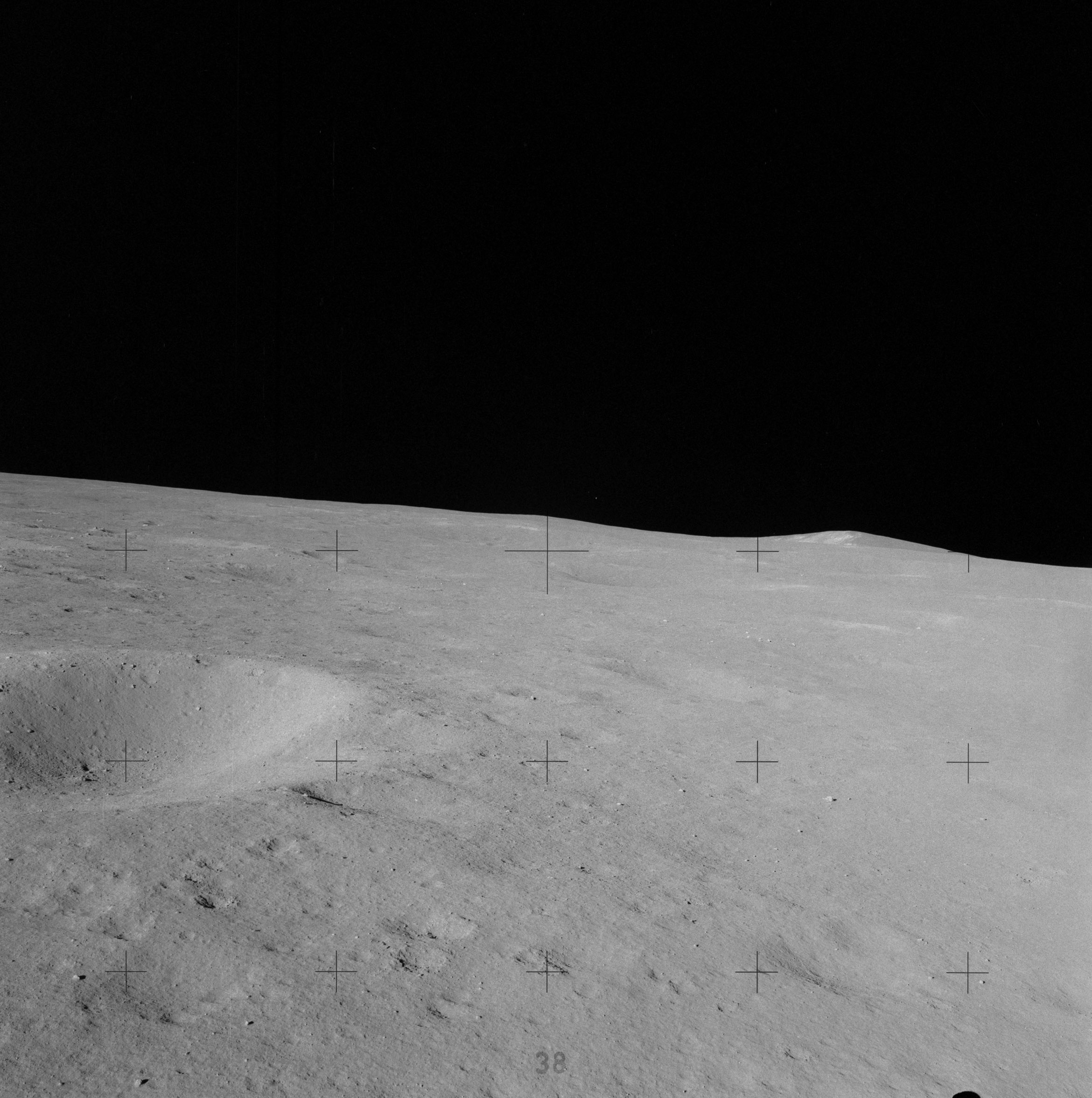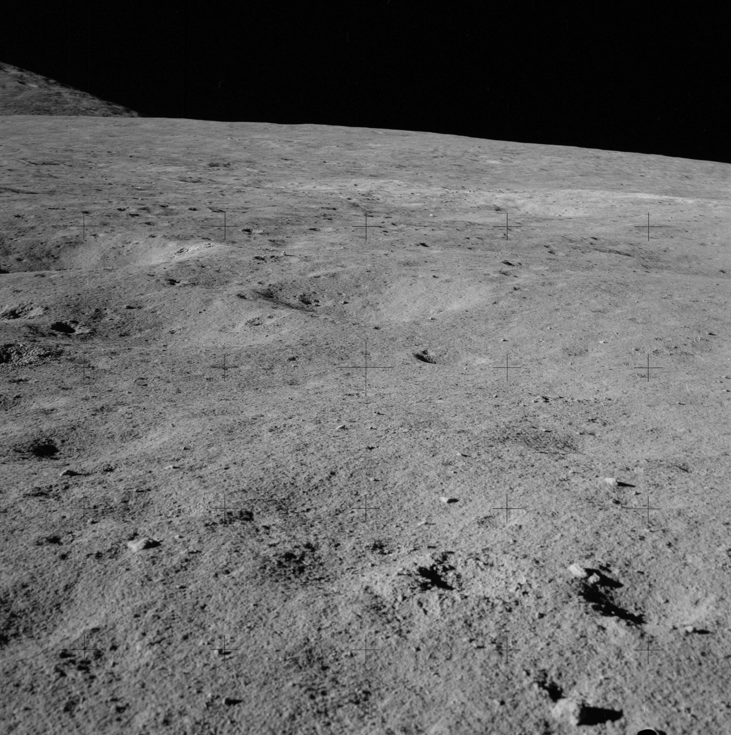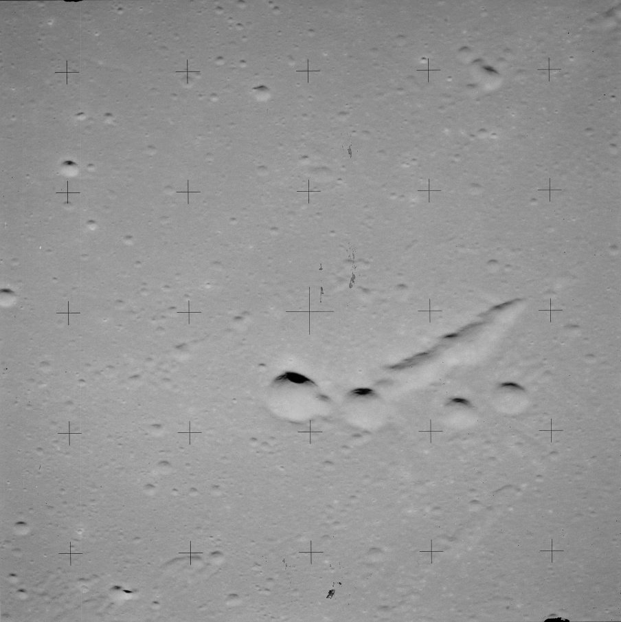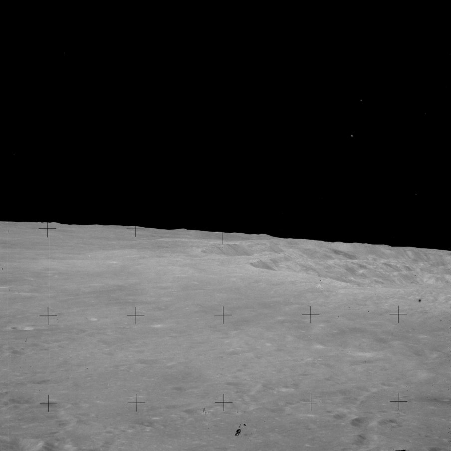 This picture was taken from the LM during CSM Rev 13 on the last pass over the landing site prior to the descent. A labeled version shows some of the prominent landmarks.Rev 16 Mapping (Metric) Camera Frame 0414 ( 13 Mb )
