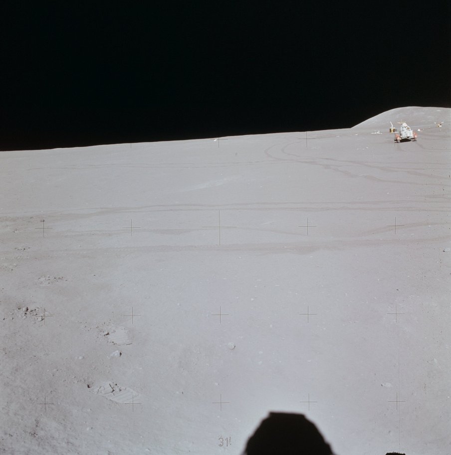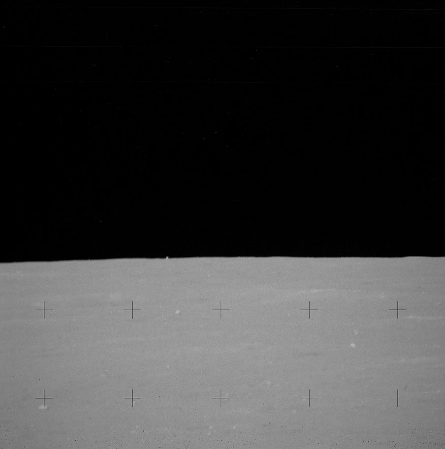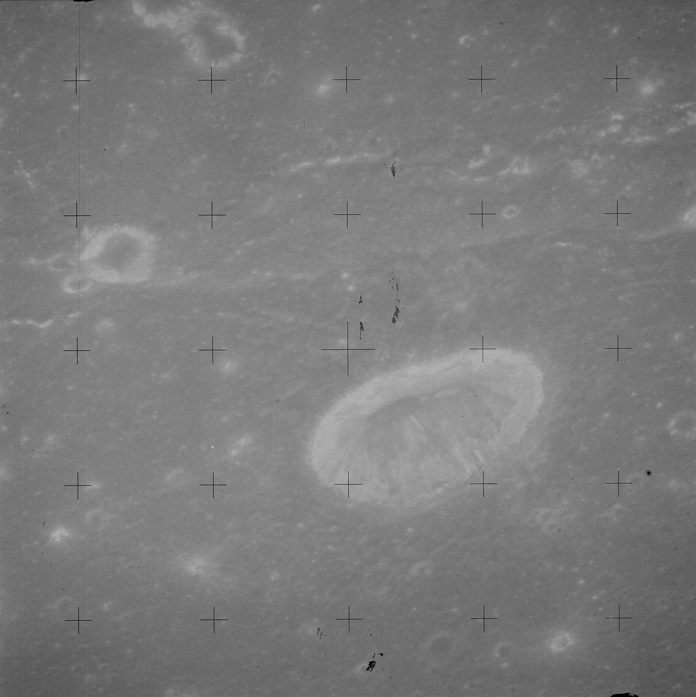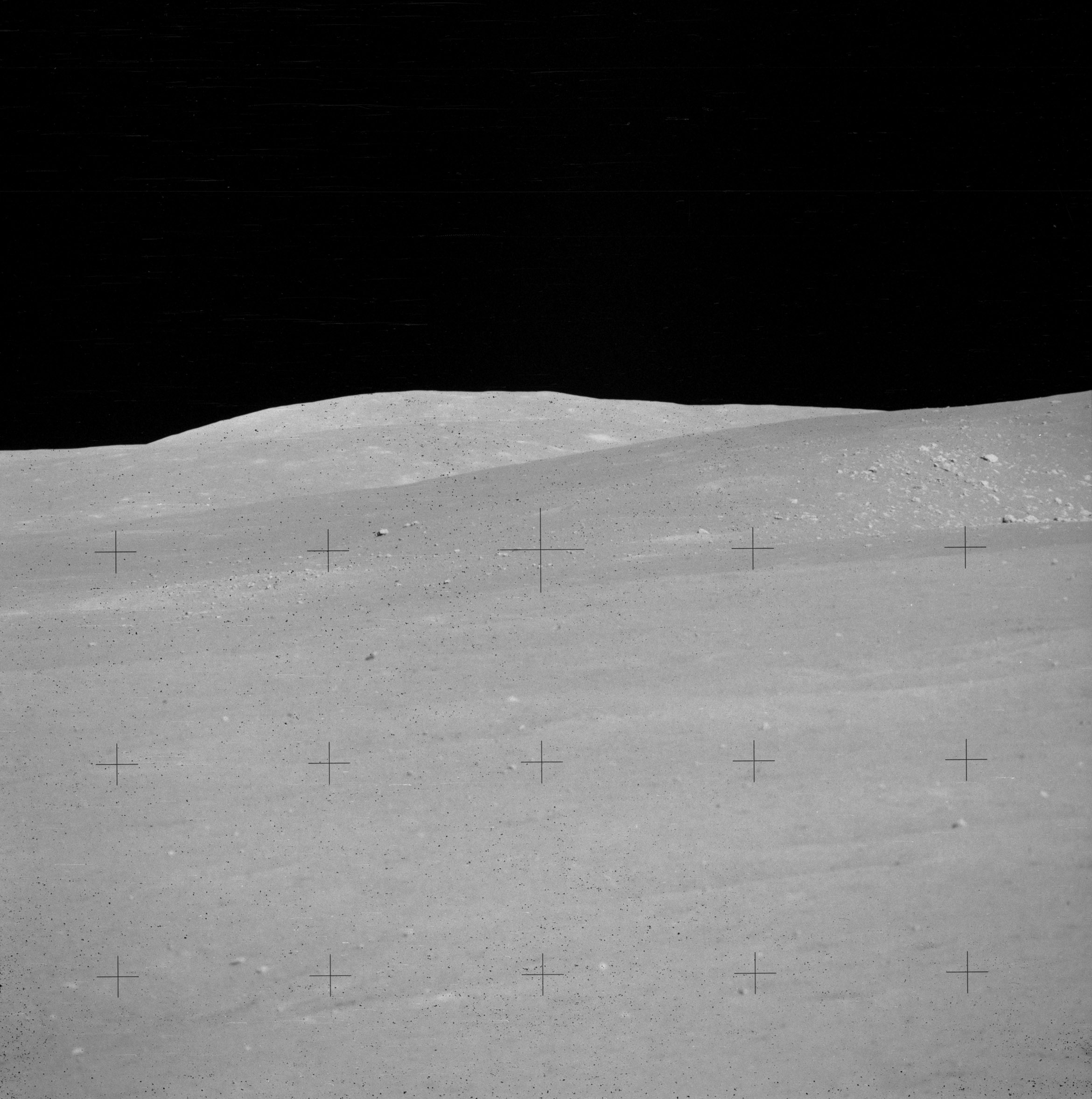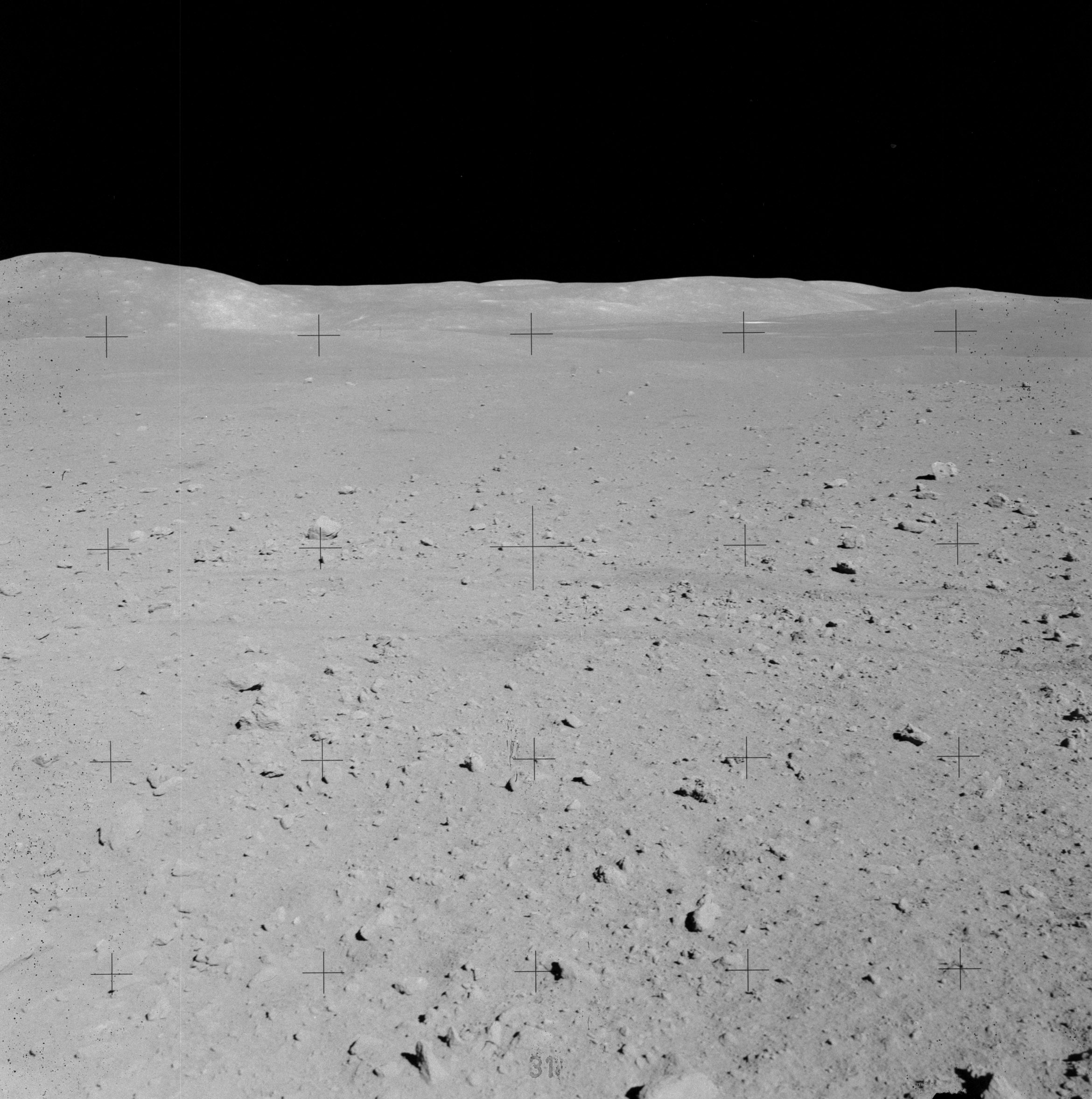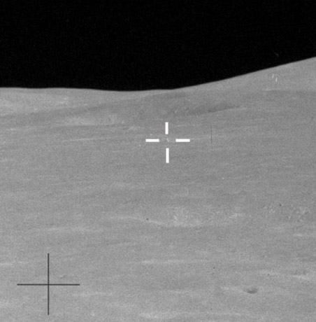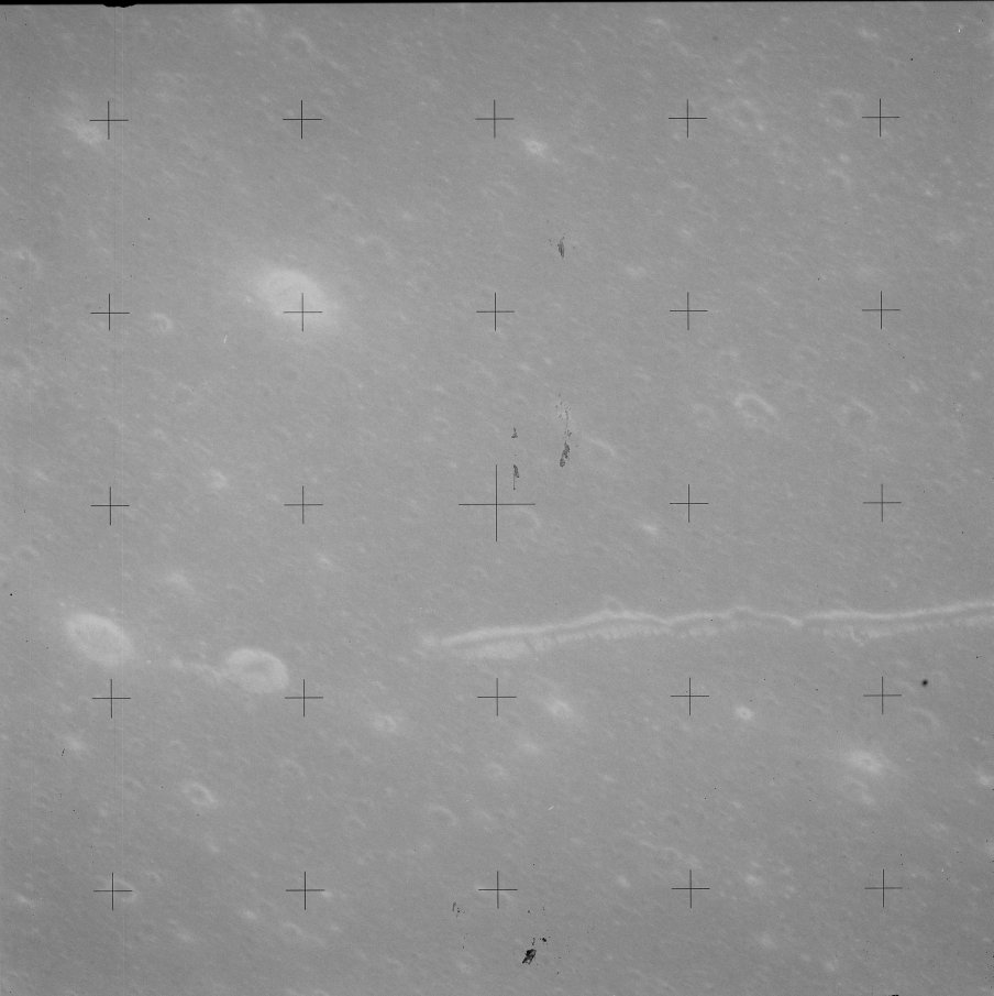 This picture was taken from the LM during CSM Rev 13 on the last pass over the landing site prior to the descent. A labeled version shows some of the prominent landmarks.Rev 16 Mapping (Metric) Camera Frame 0414 ( 13 Mb )