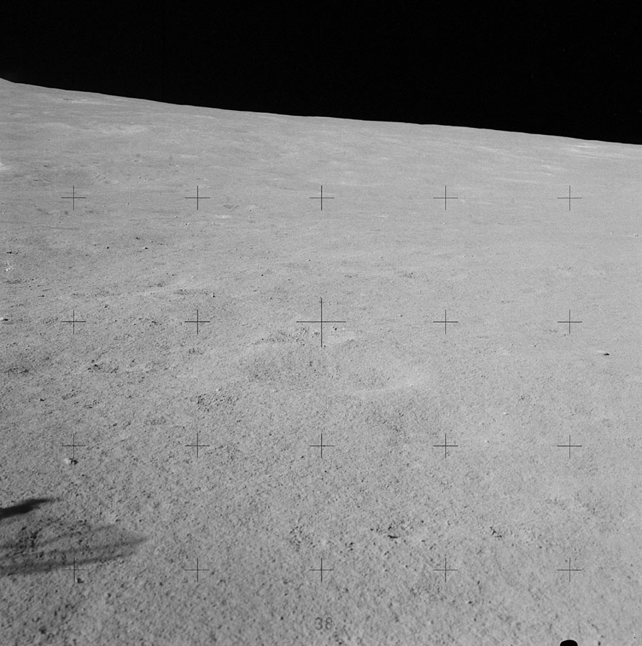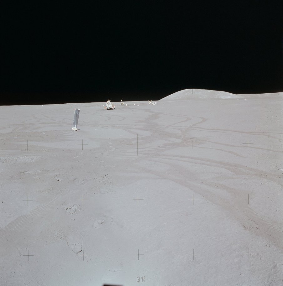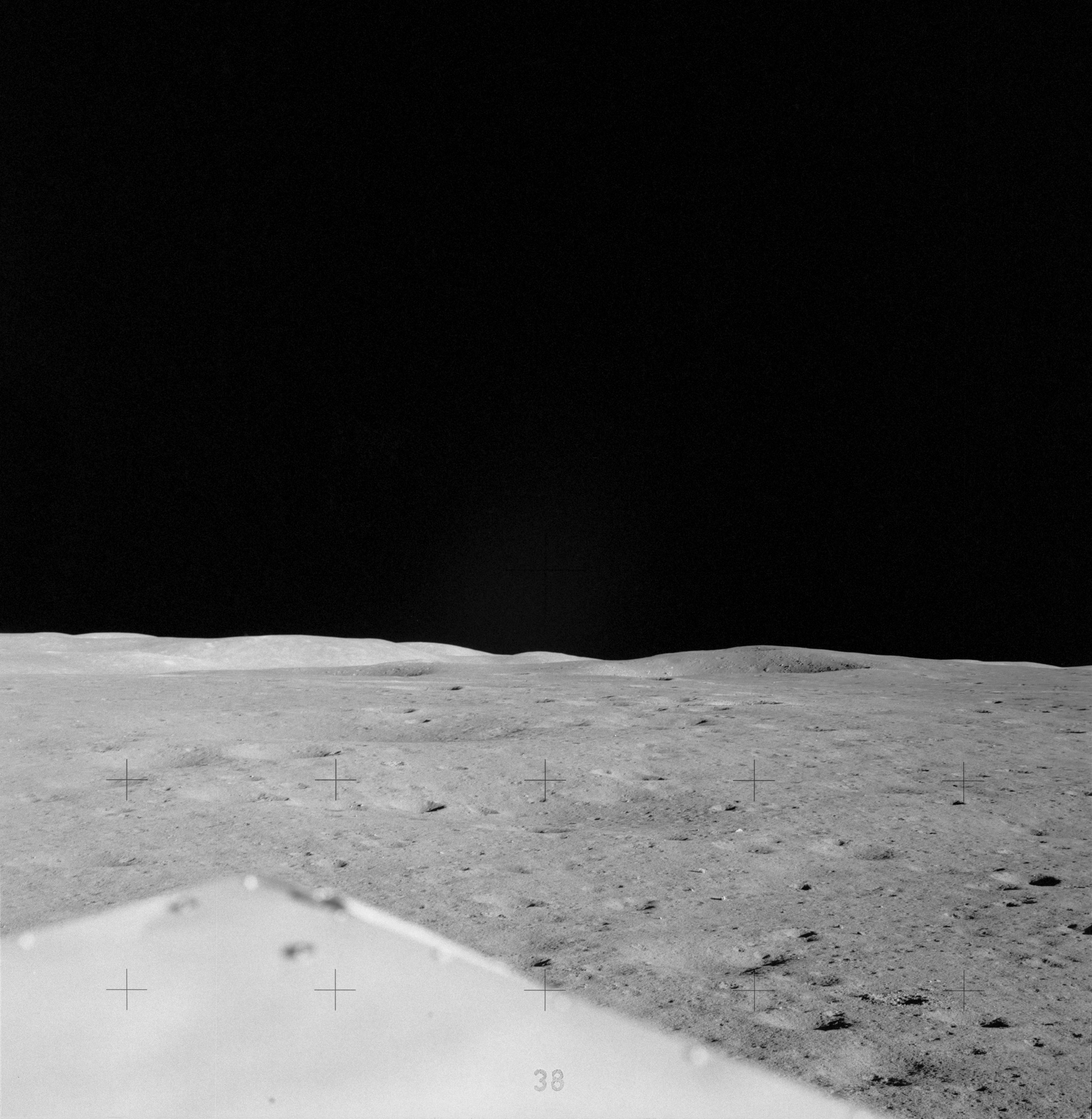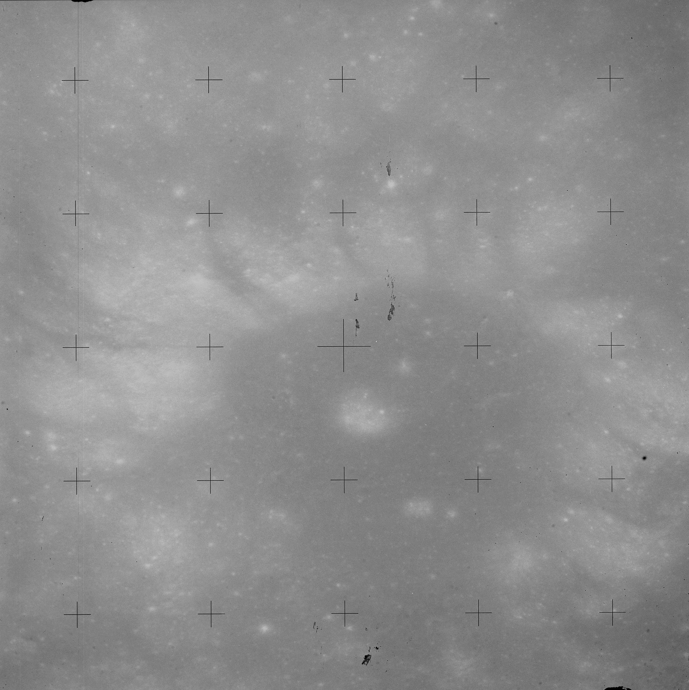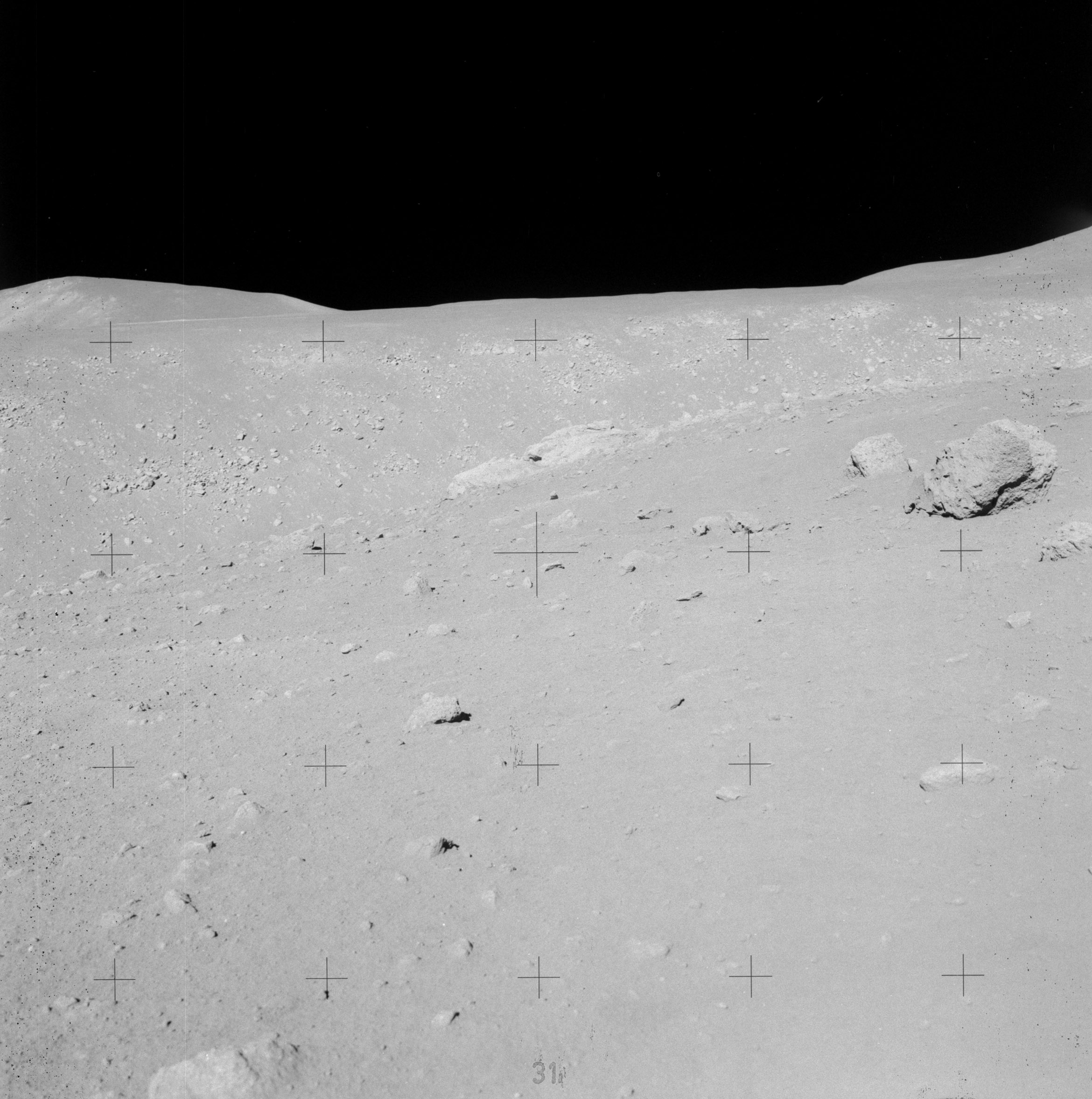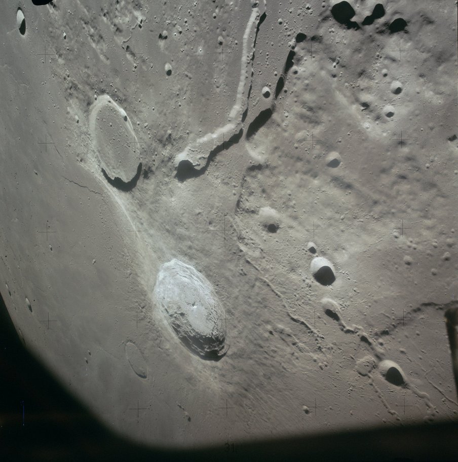 This picture was taken from the LM during CSM Rev 13 on the last pass over the landing site prior to the descent. A labeled version shows some of the prominent landmarks.Rev 16 Mapping (Metric) Camera Frame 0414 ( 13 Mb )
