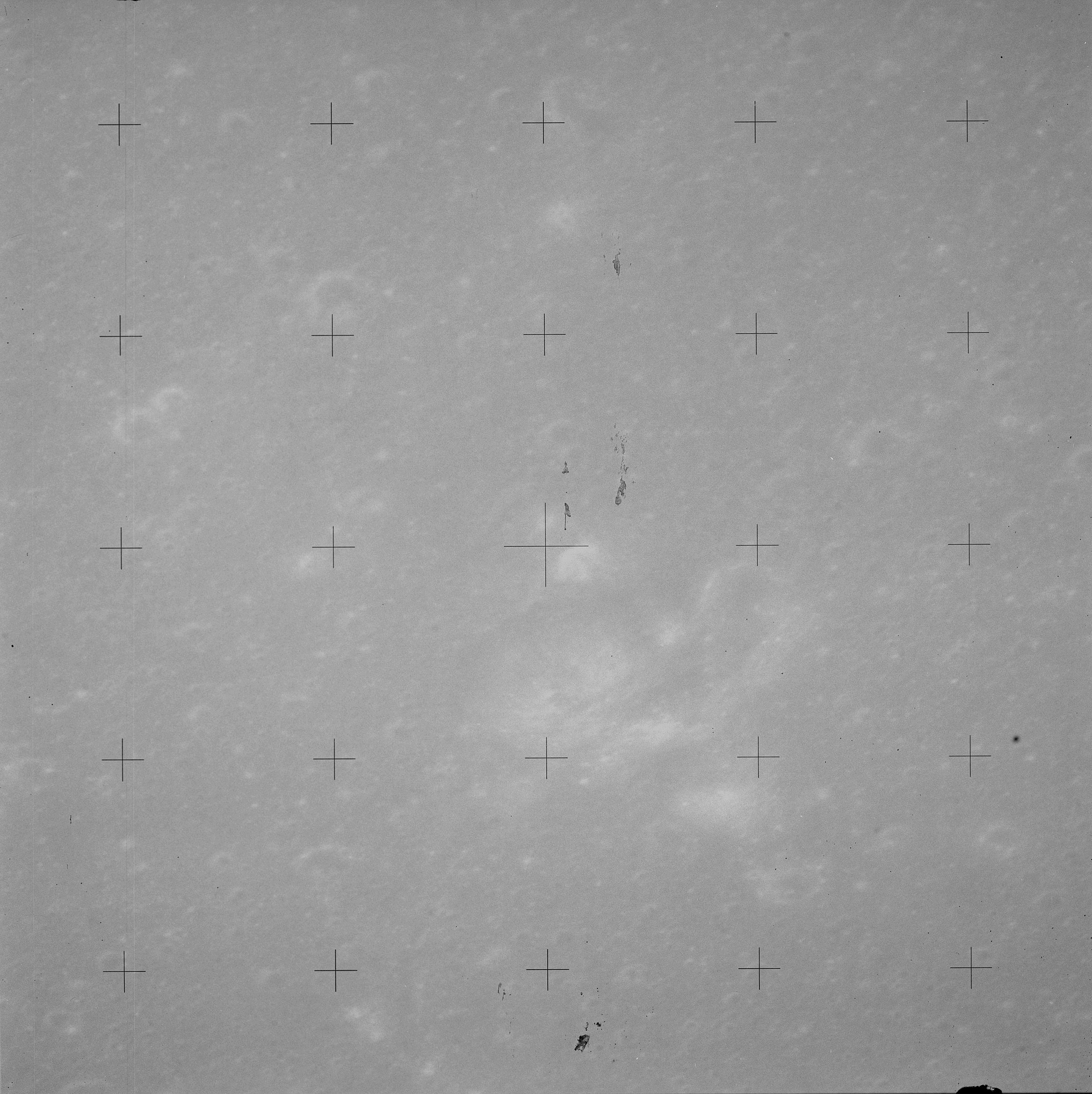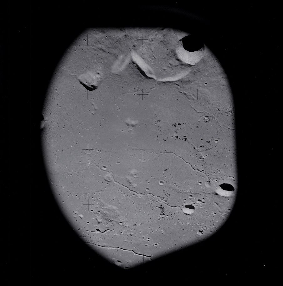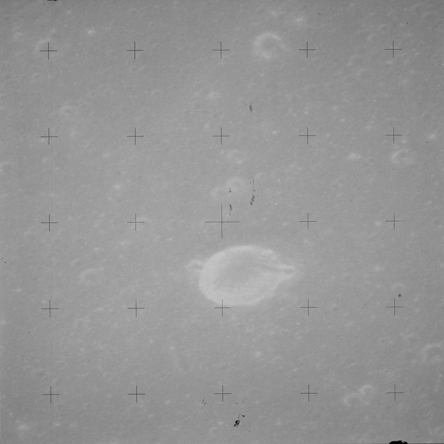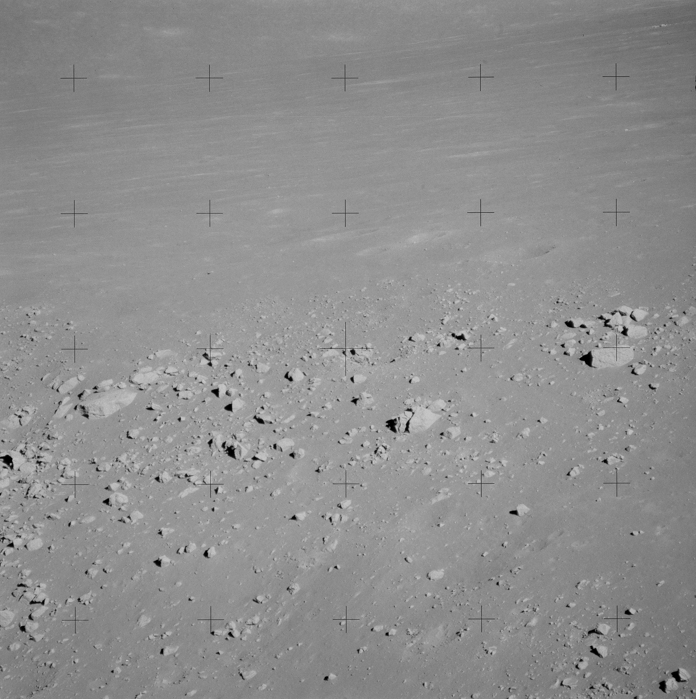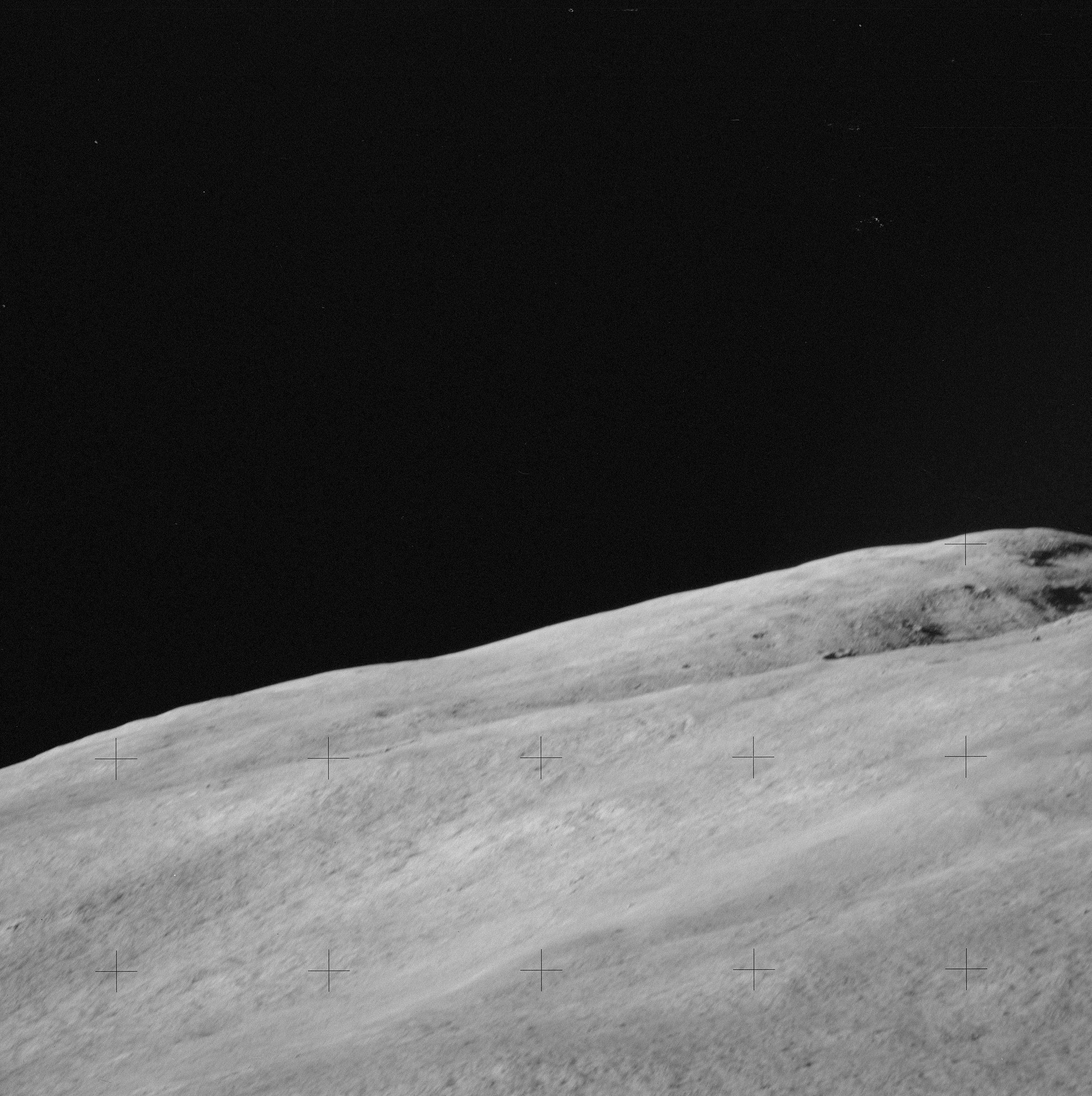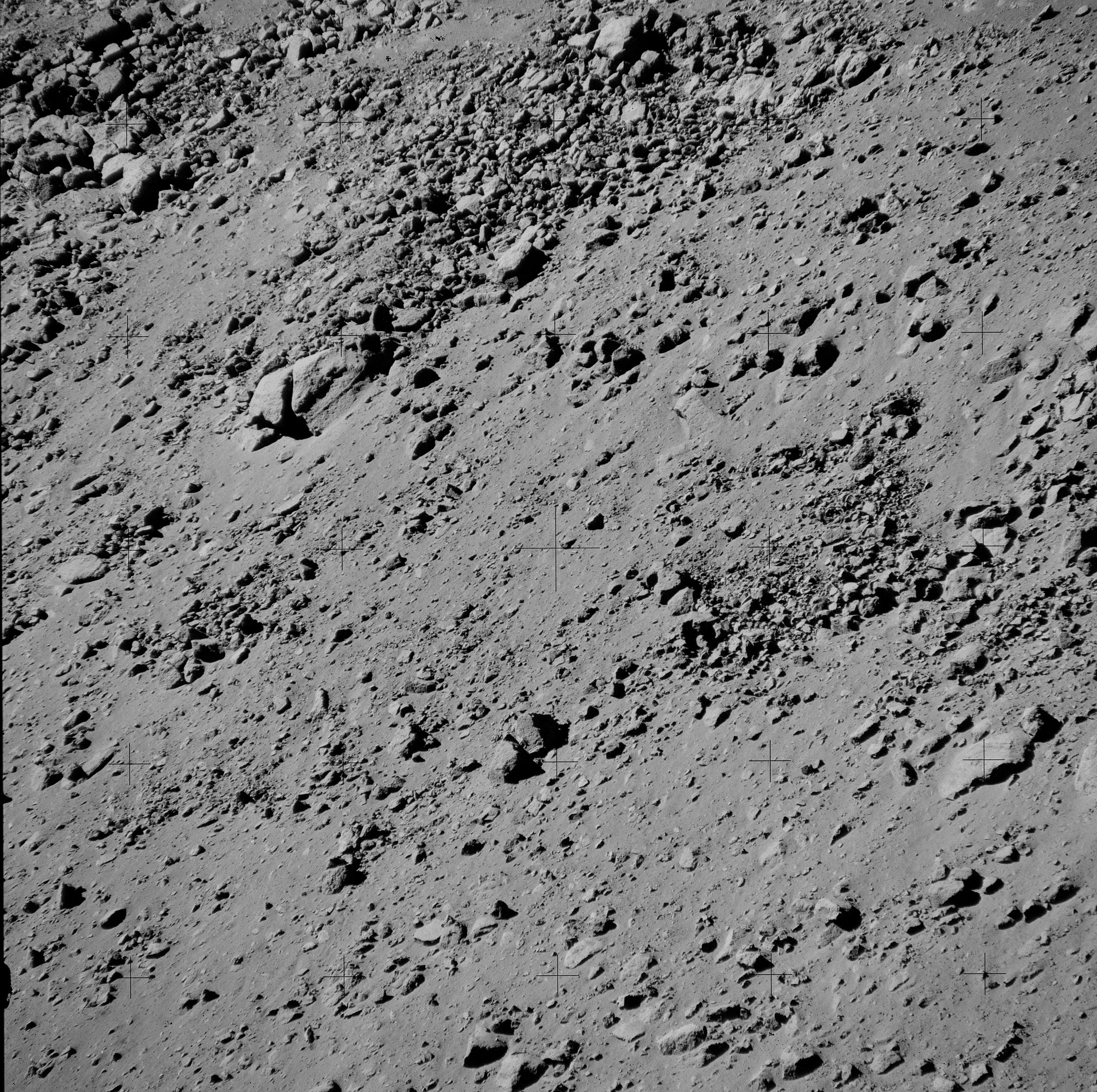 This picture was taken from the LM during CSM Rev 13 on the last pass over the landing site prior to the descent. A labeled version shows some of the prominent landmarks.Rev 16 Mapping (Metric) Camera Frame 0414 ( 13 Mb )