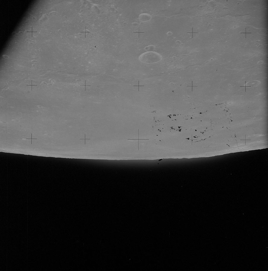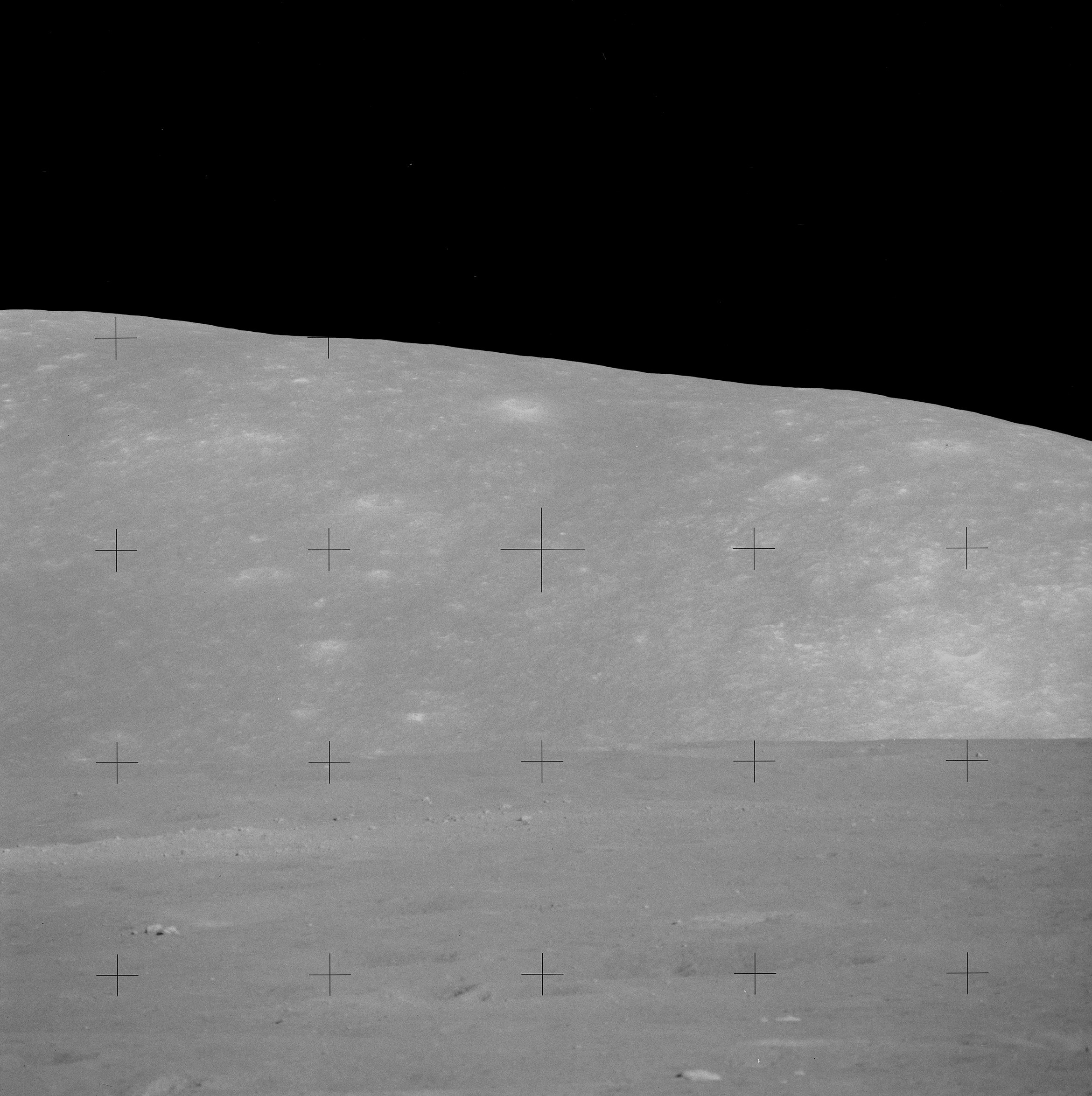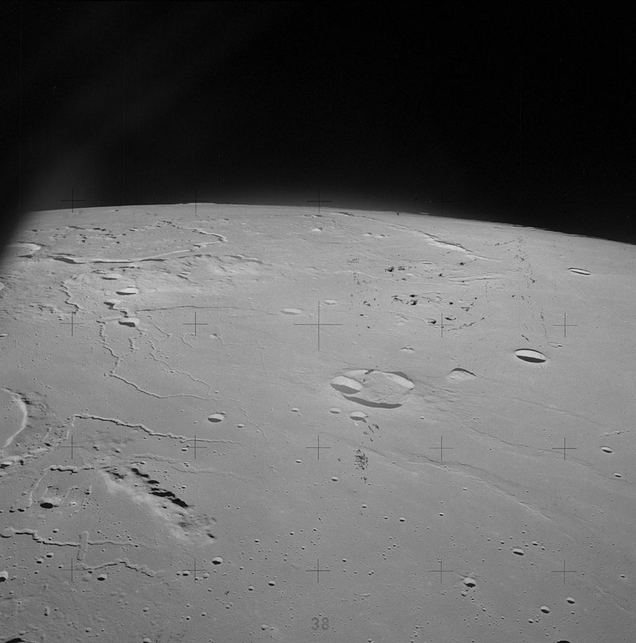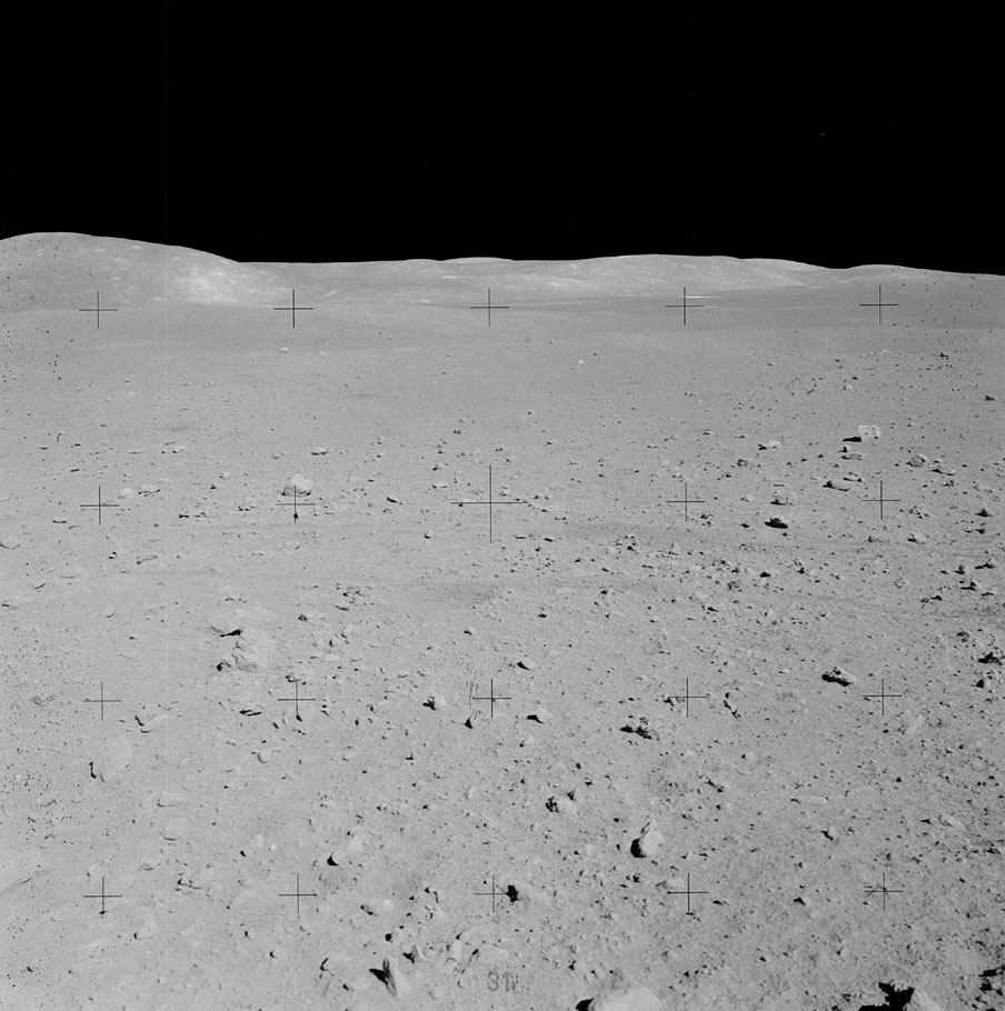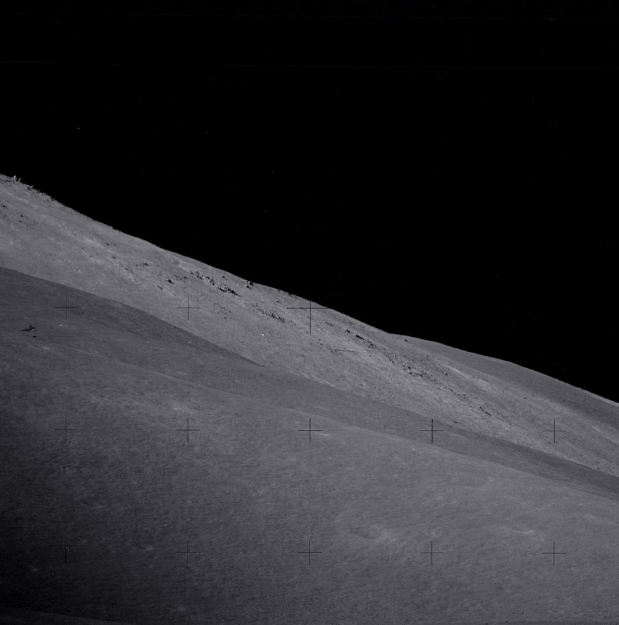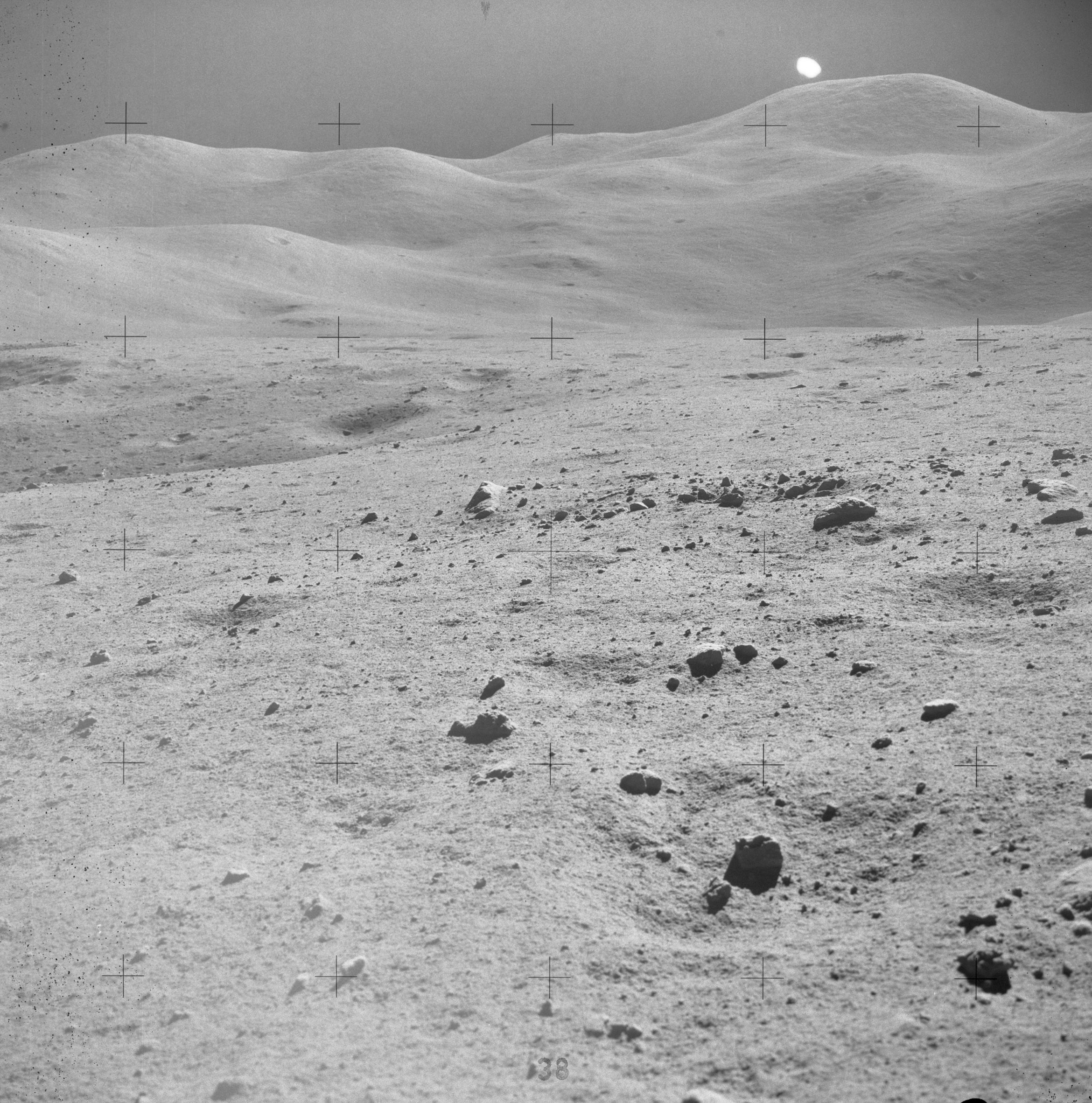 This picture was taken from the LM during CSM Rev 13 on the last pass over the landing site prior to the descent. A labeled version shows some of the prominent landmarks.Rev 16 Mapping (Metric) Camera Frame 0414 ( 13 Mb )