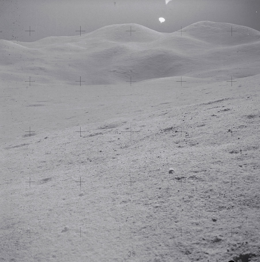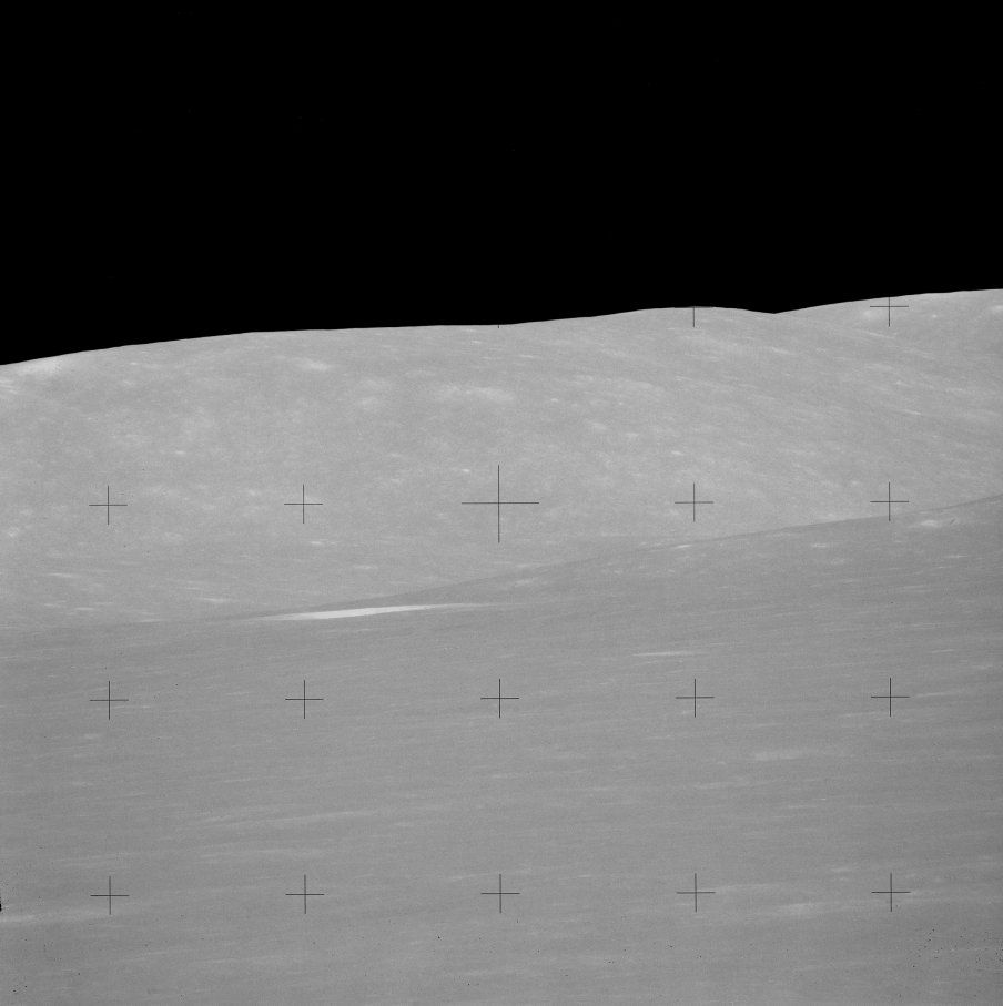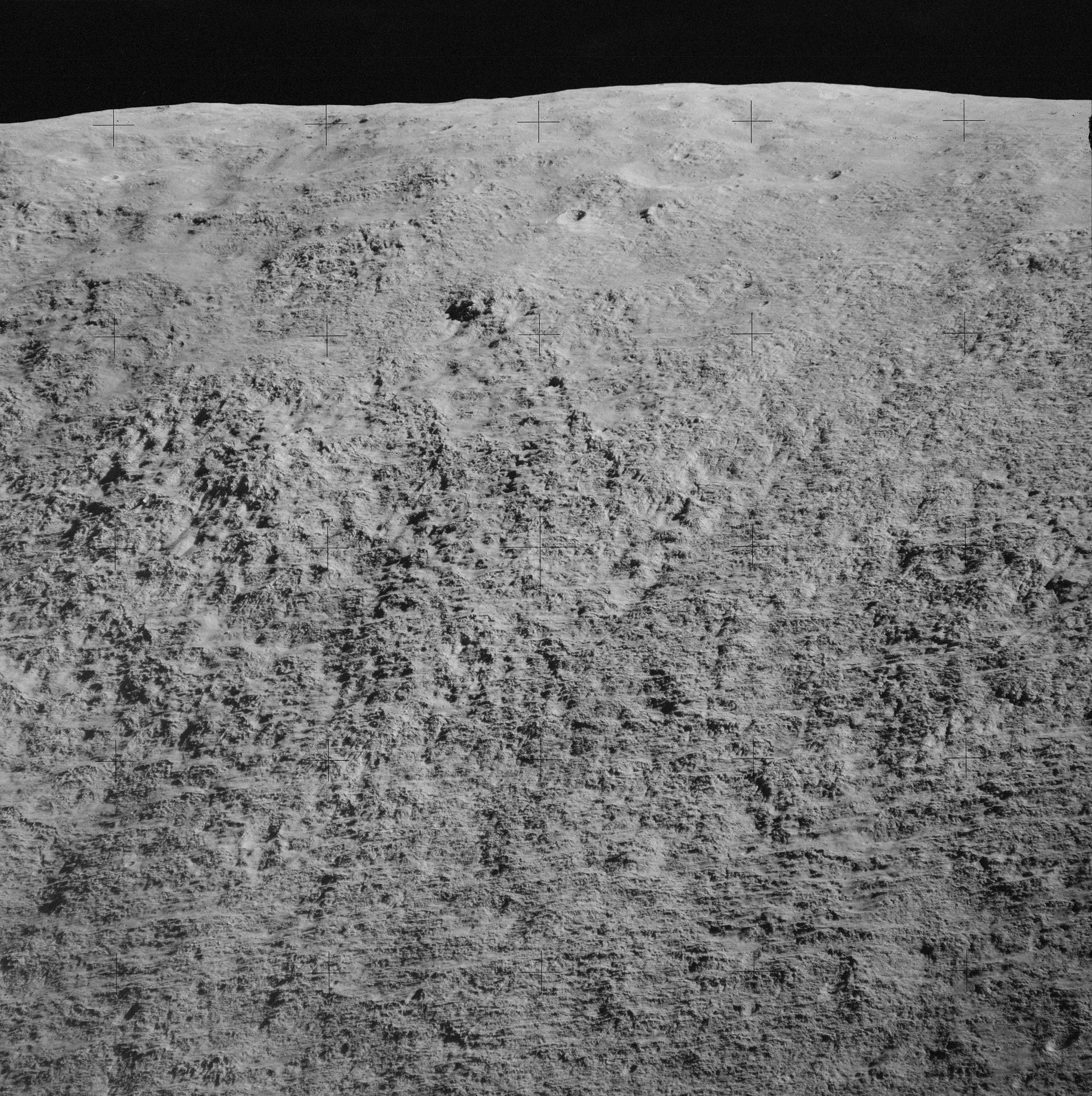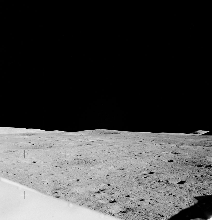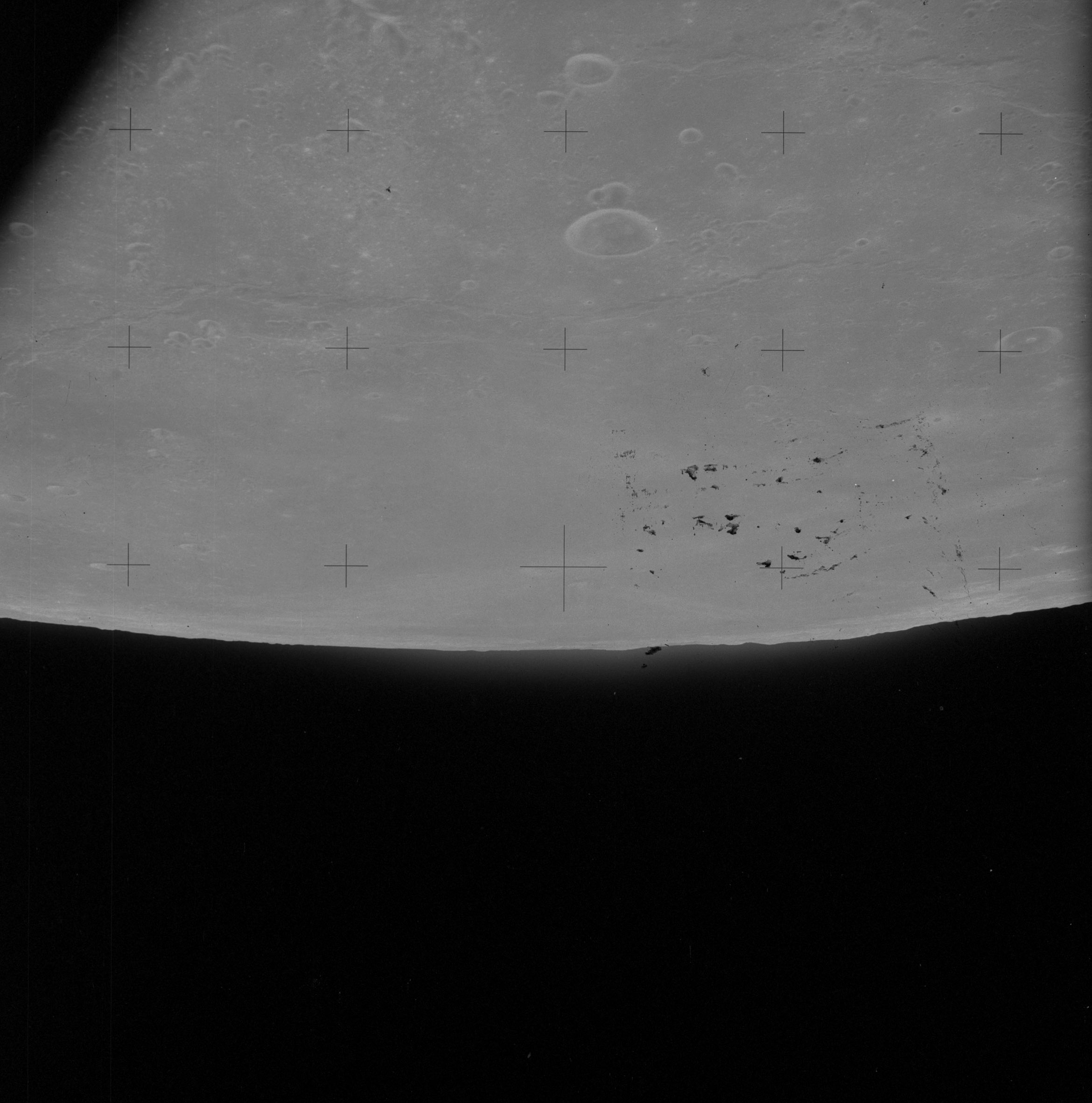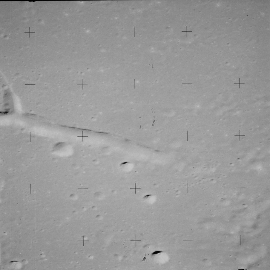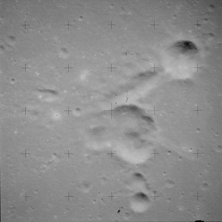 This picture was taken from the LM during CSM Rev 13 on the last pass over the landing site prior to the descent. A labeled version shows some of the prominent landmarks.Rev 16 Mapping (Metric) Camera Frame 0414 ( 13 Mb )