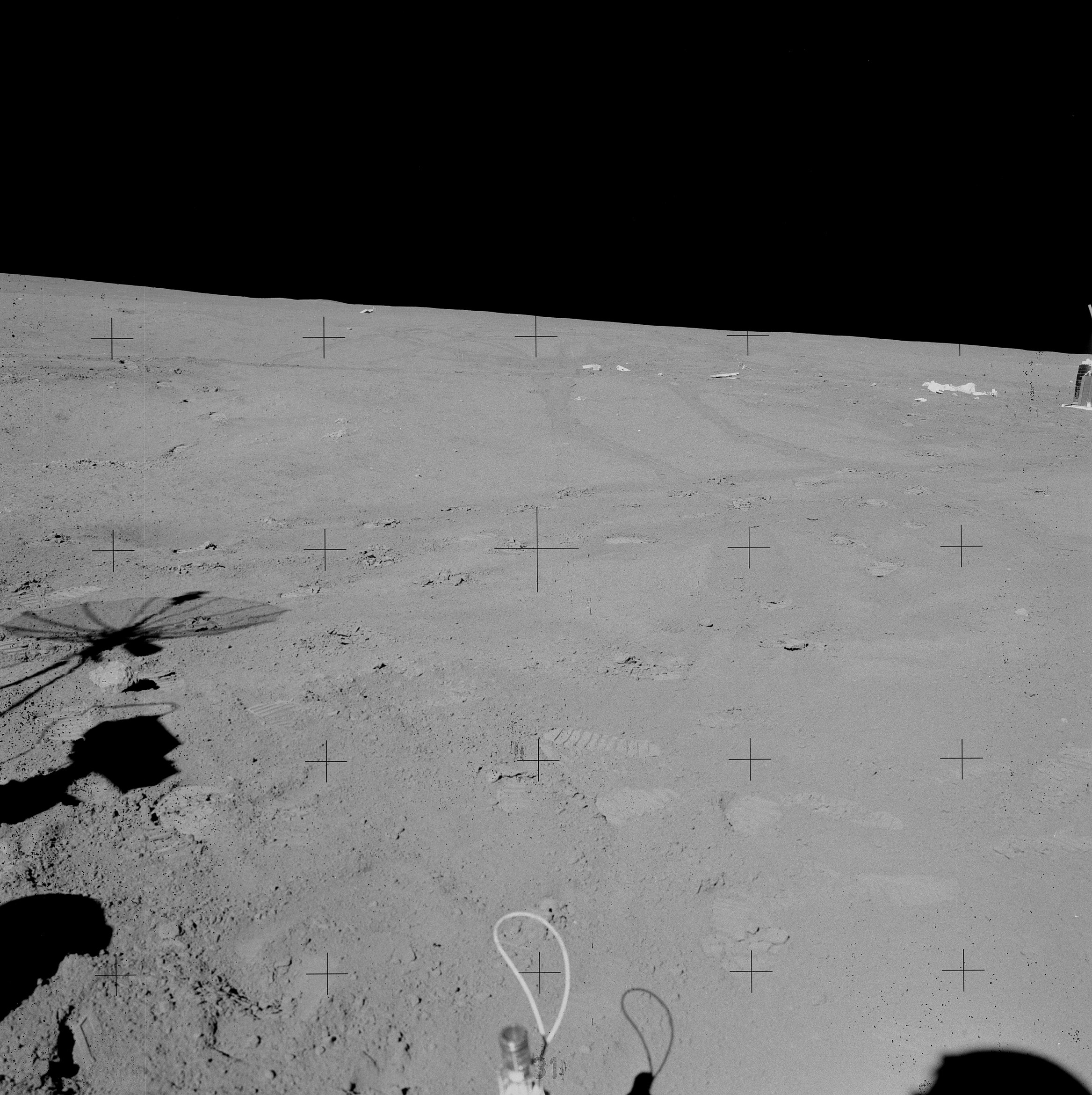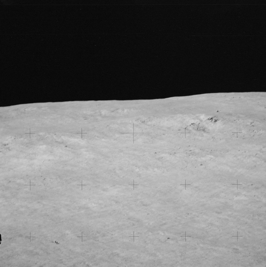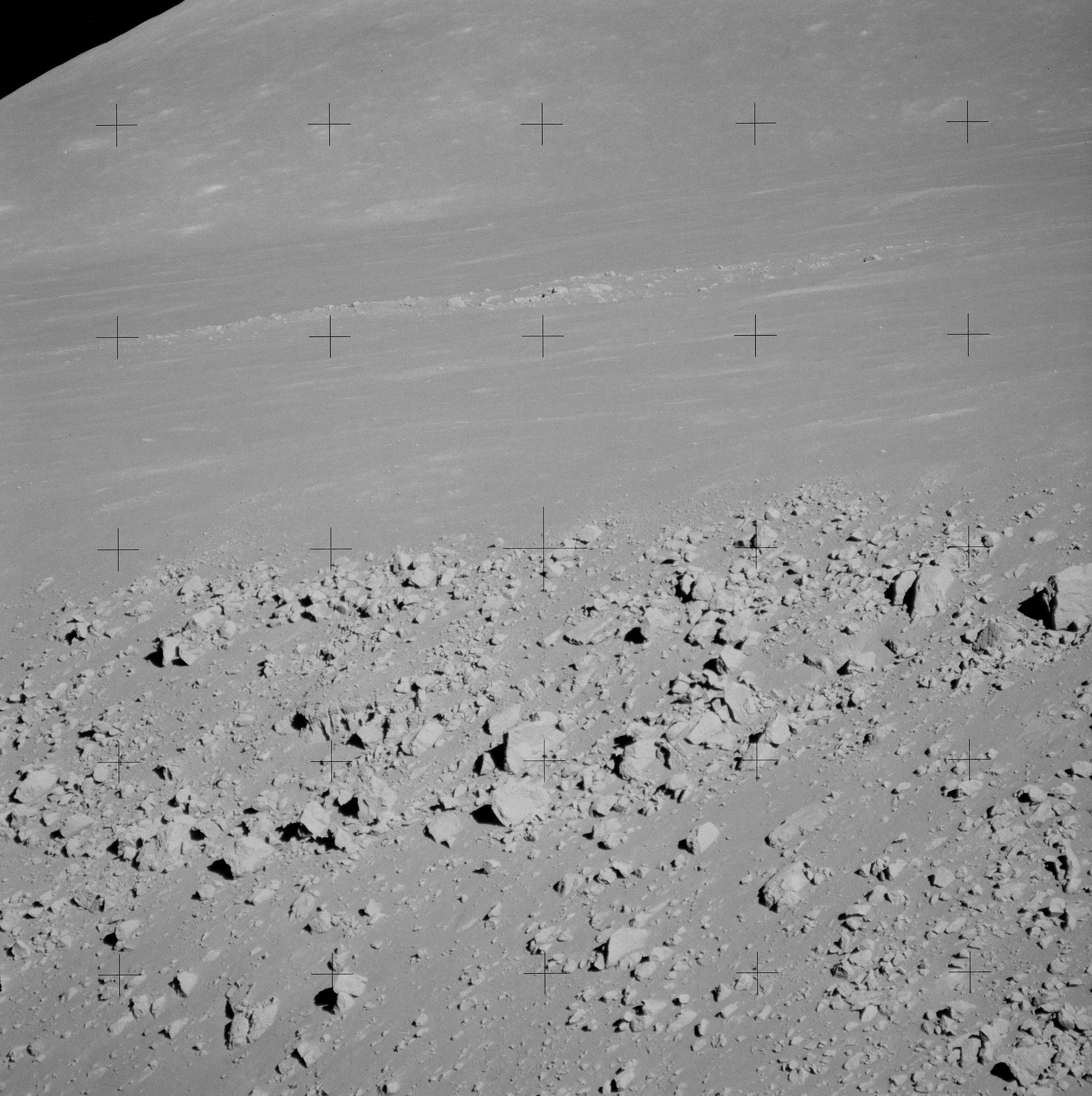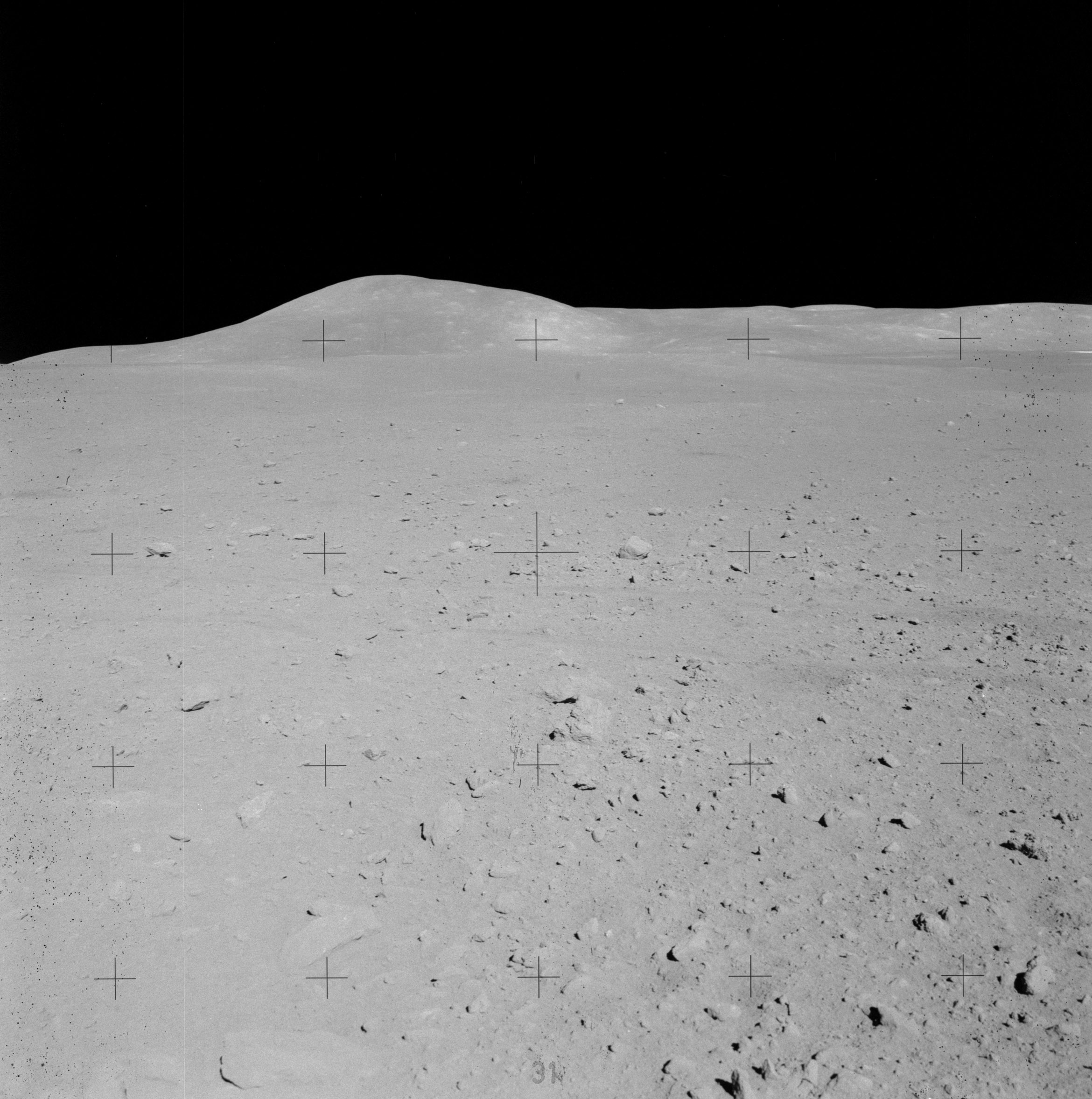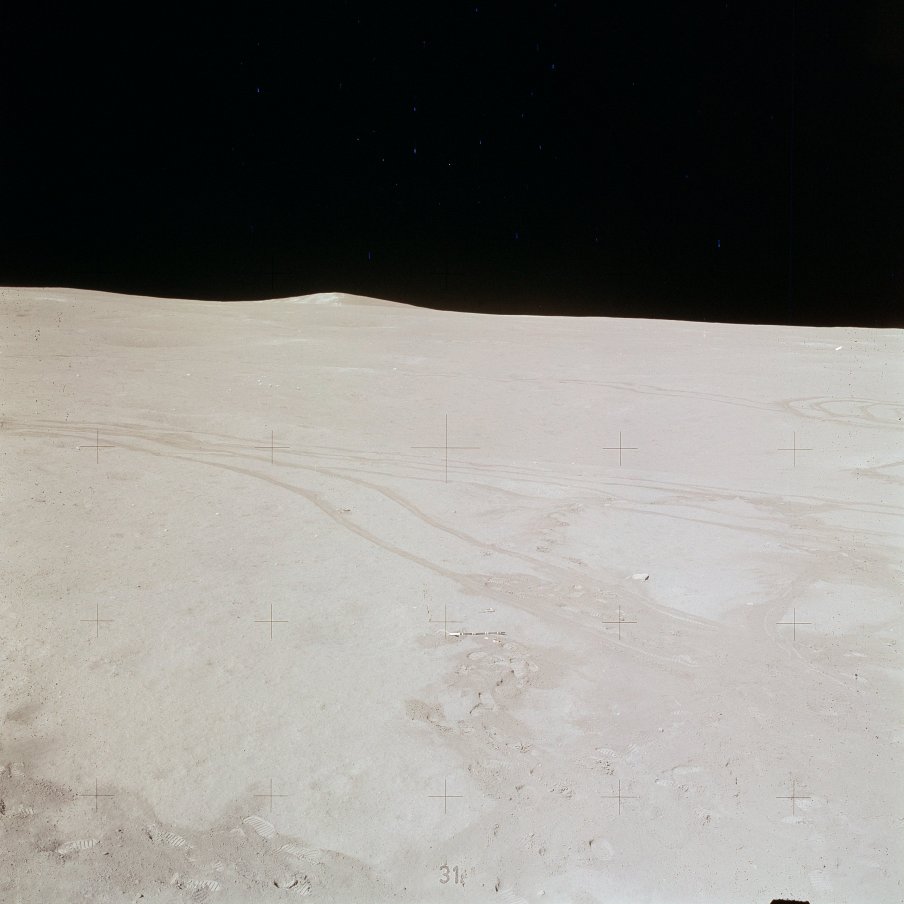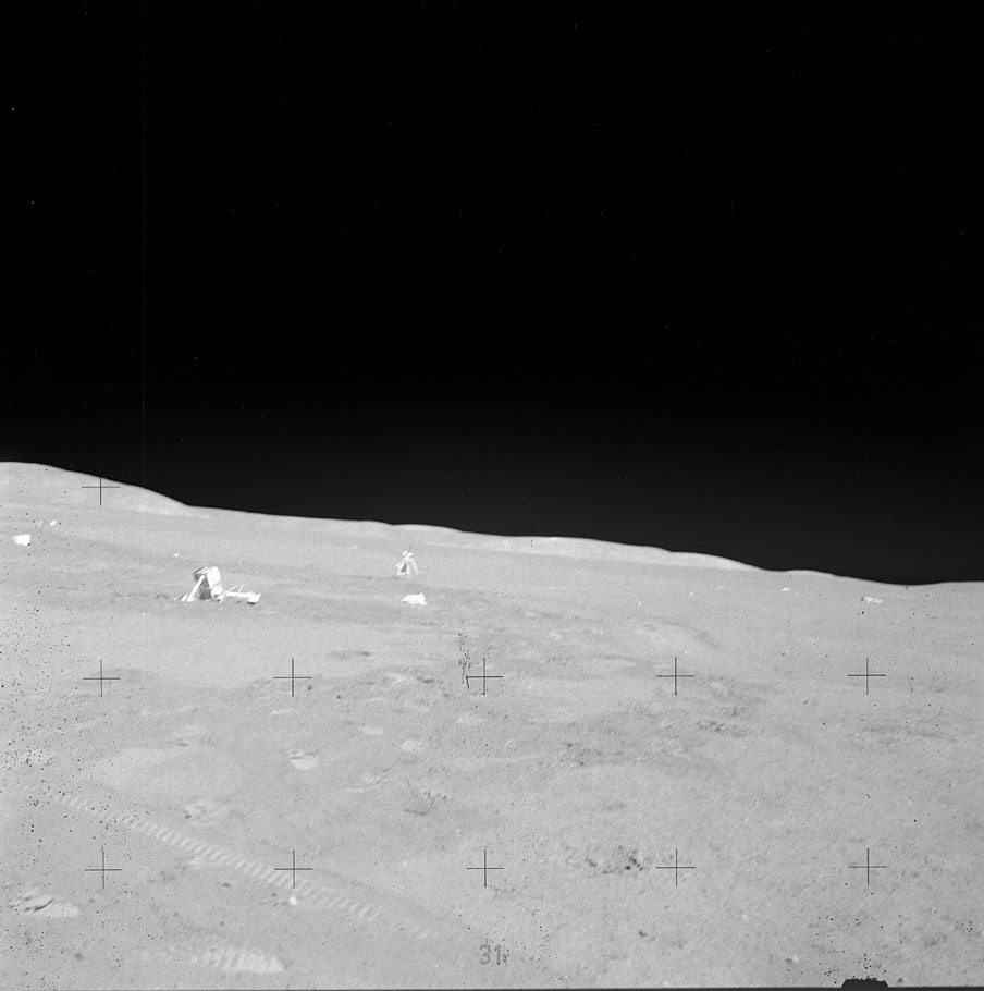 This picture was taken from the LM during CSM Rev 13 on the last pass over the landing site prior to the descent. A labeled version shows some of the prominent landmarks.Rev 16 Mapping (Metric) Camera Frame 0414 ( 13 Mb )