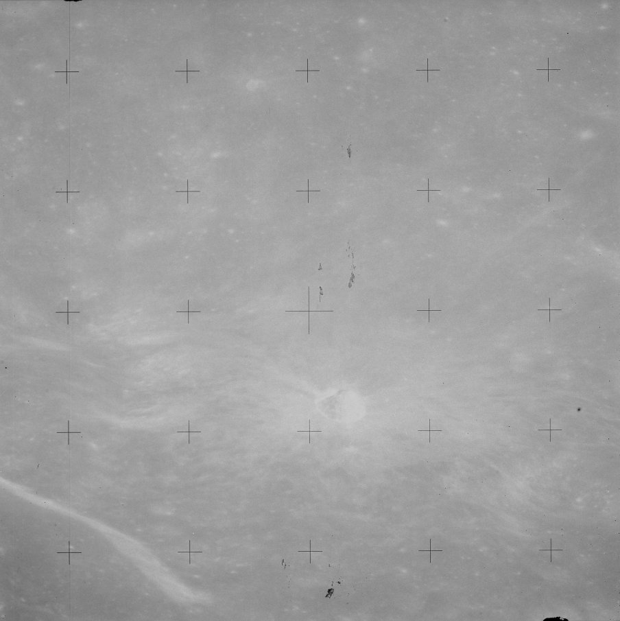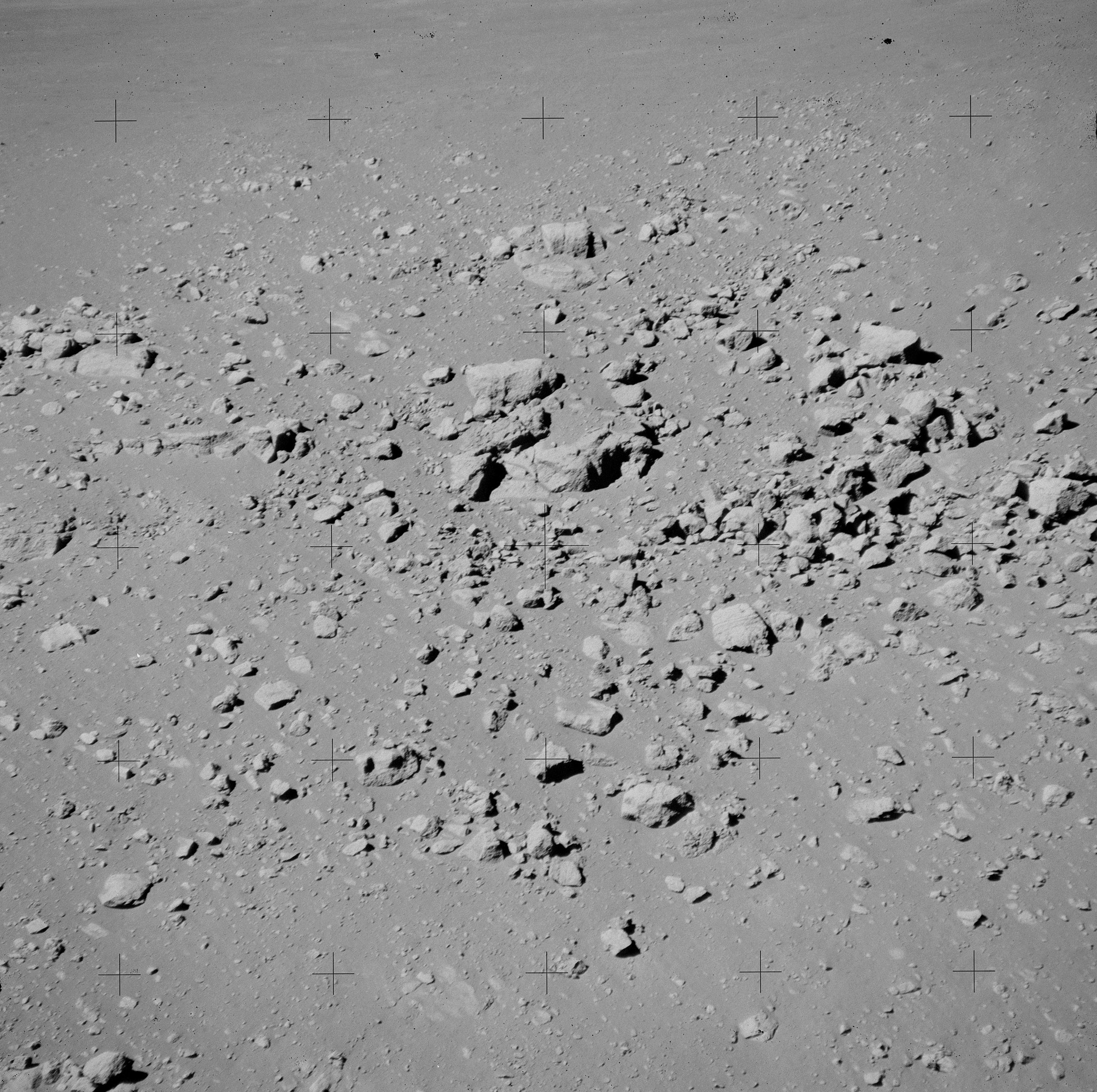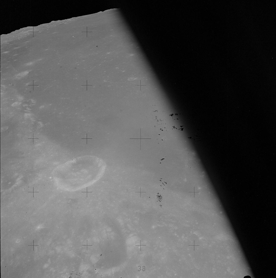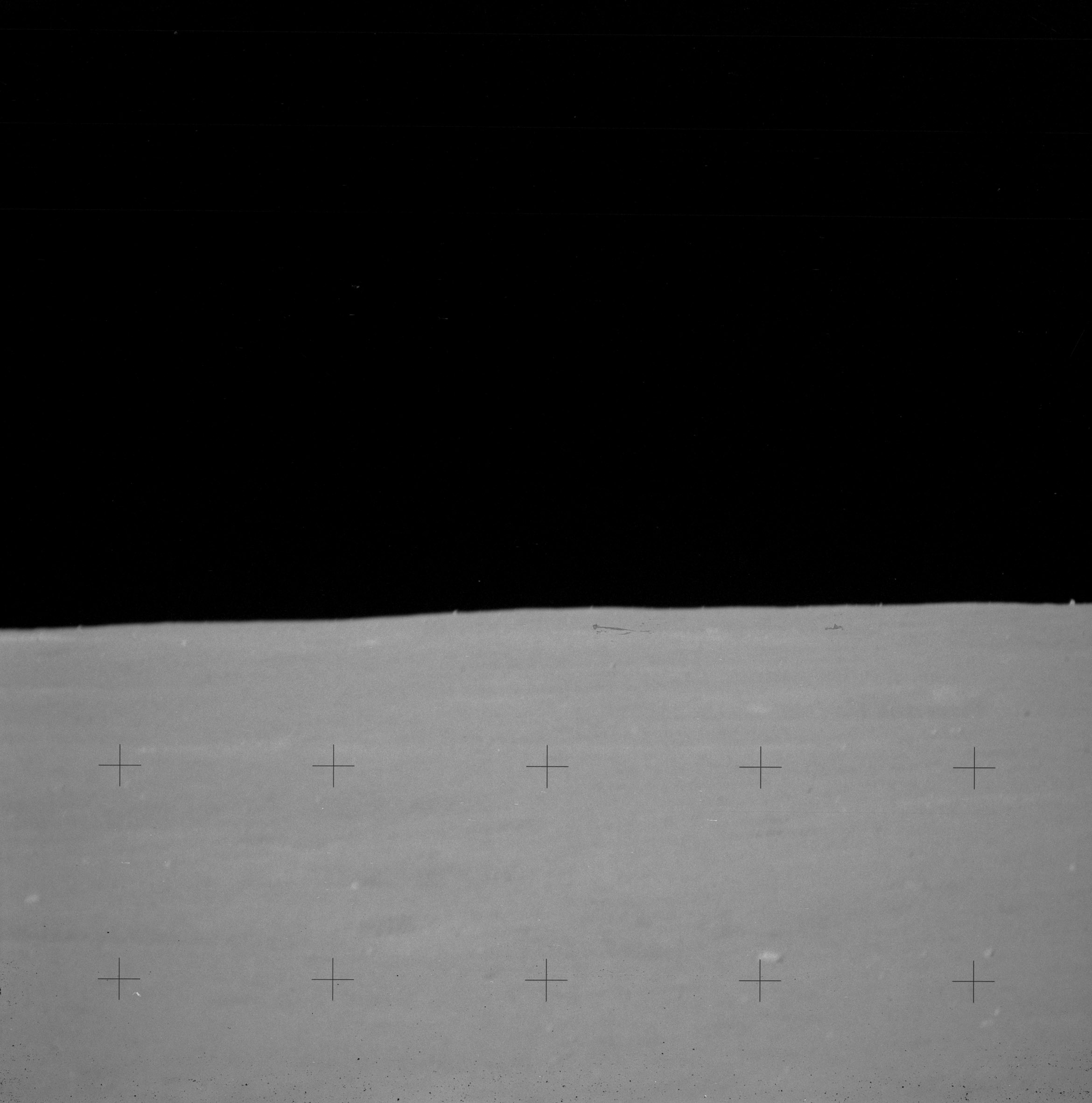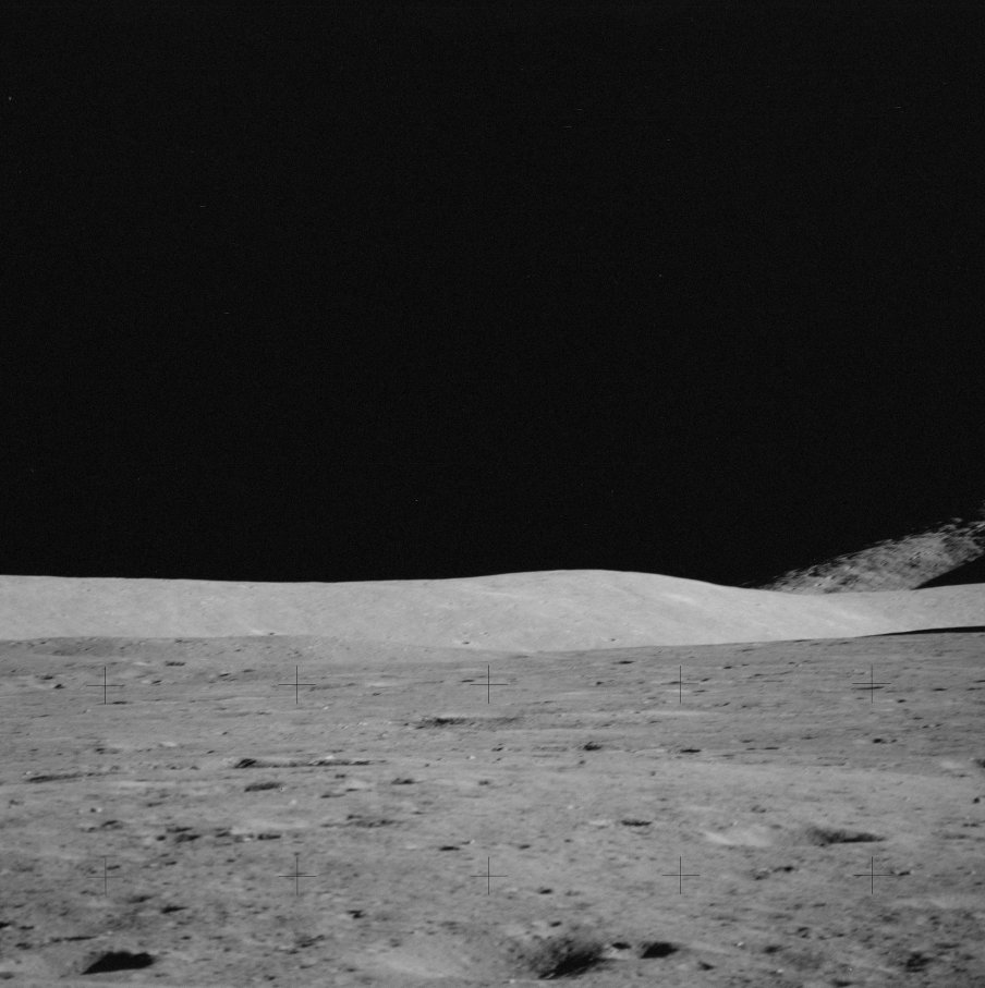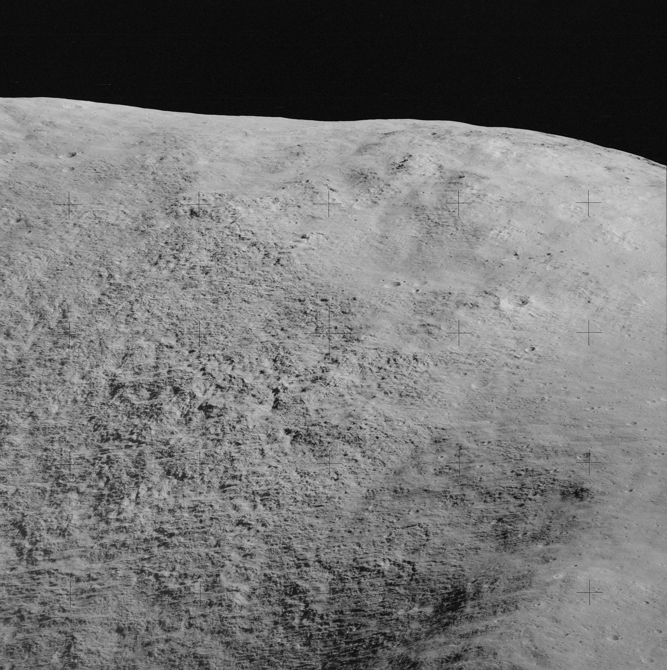 This picture was taken from the LM during CSM Rev 13 on the last pass over the landing site prior to the descent. A labeled version shows some of the prominent landmarks.Rev 16 Mapping (Metric) Camera Frame 0414 ( 13 Mb )