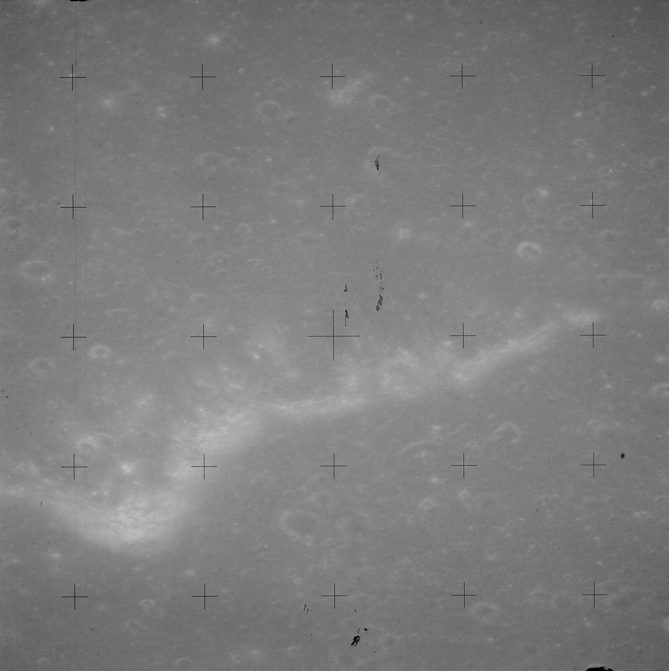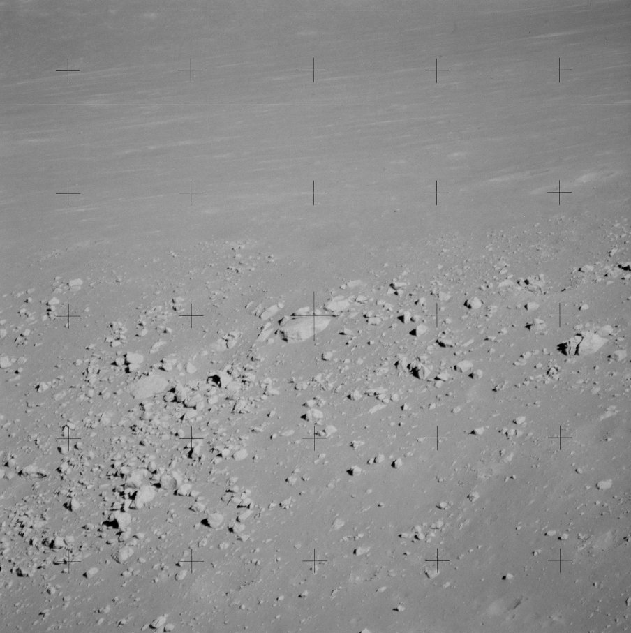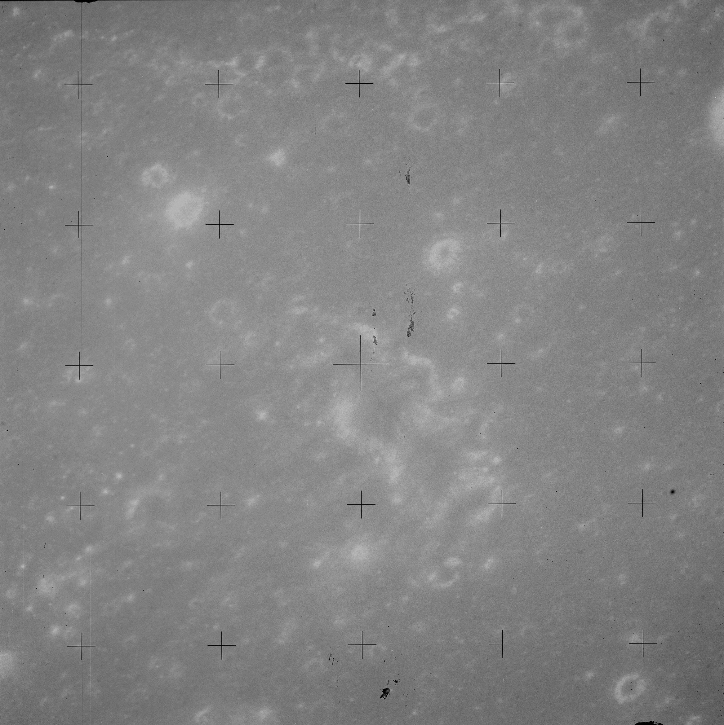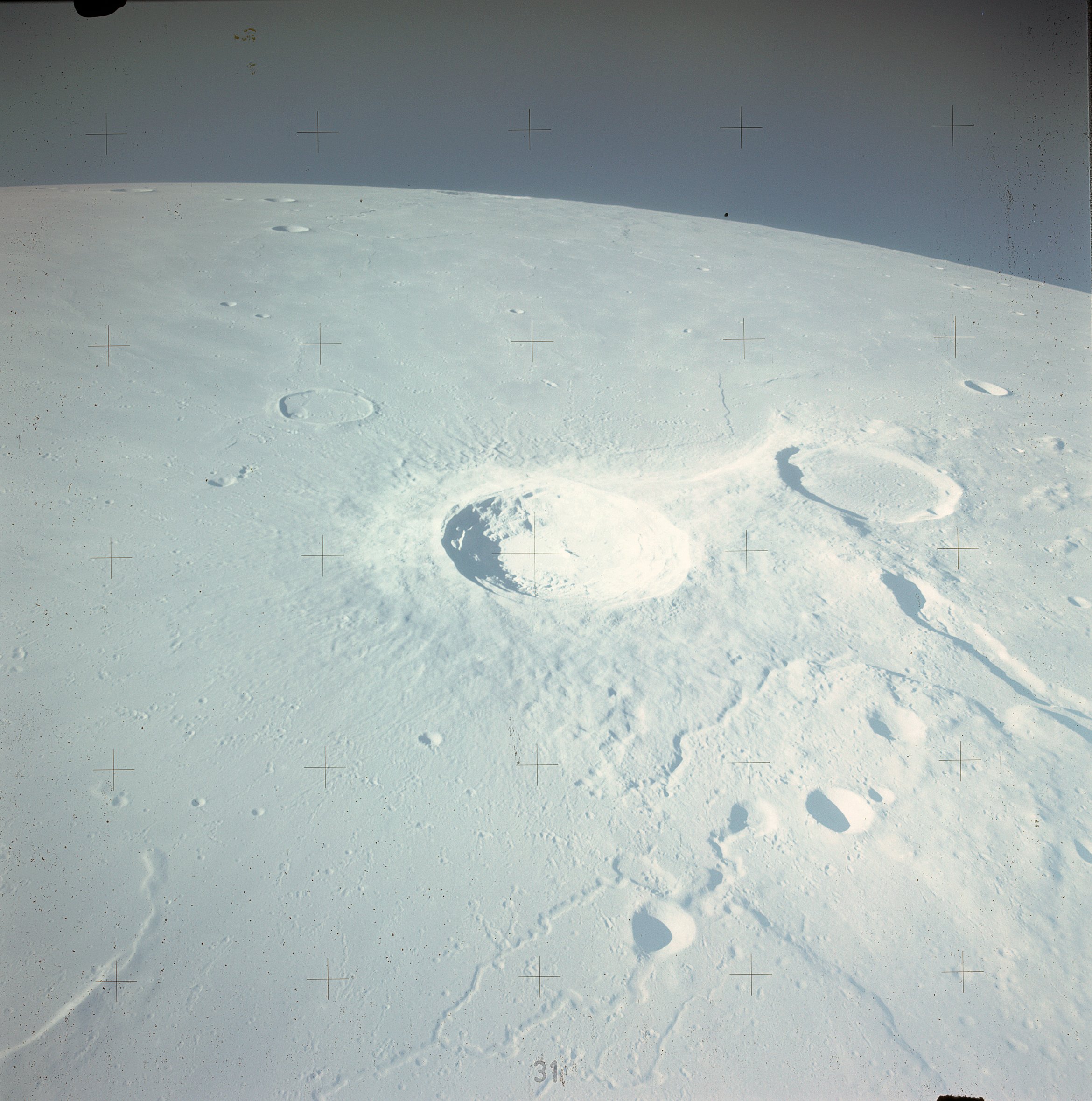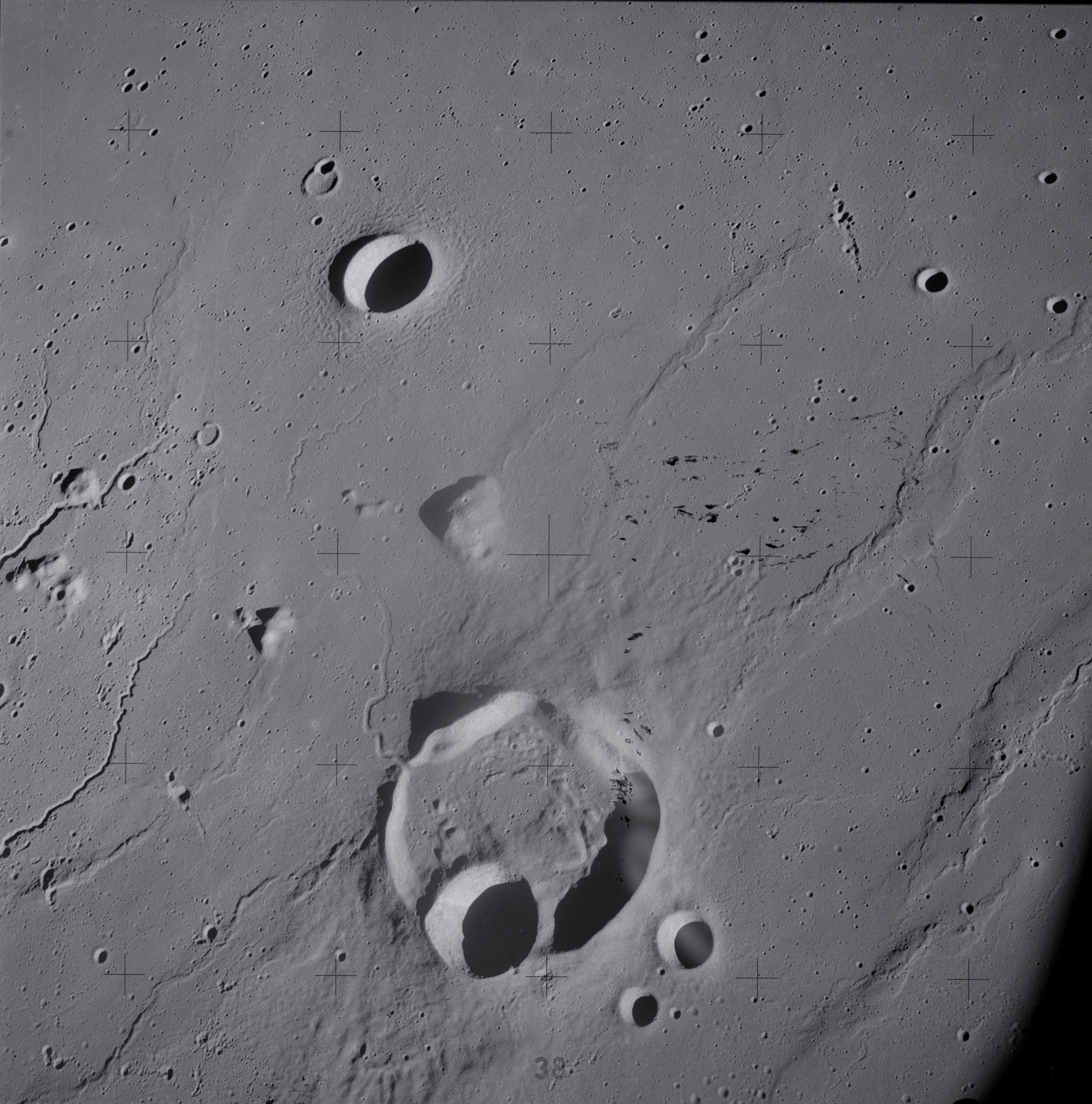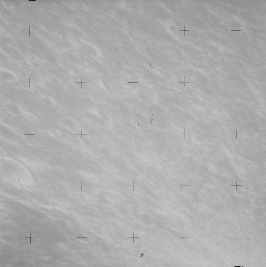This picture was taken from the LM during CSM Rev 13 on the last pass over the landing site prior to the descent. A labeled version shows some of the prominent landmarks.Rev 16 Mapping (Metric) Camera Frame 0414 ( 13 Mb )