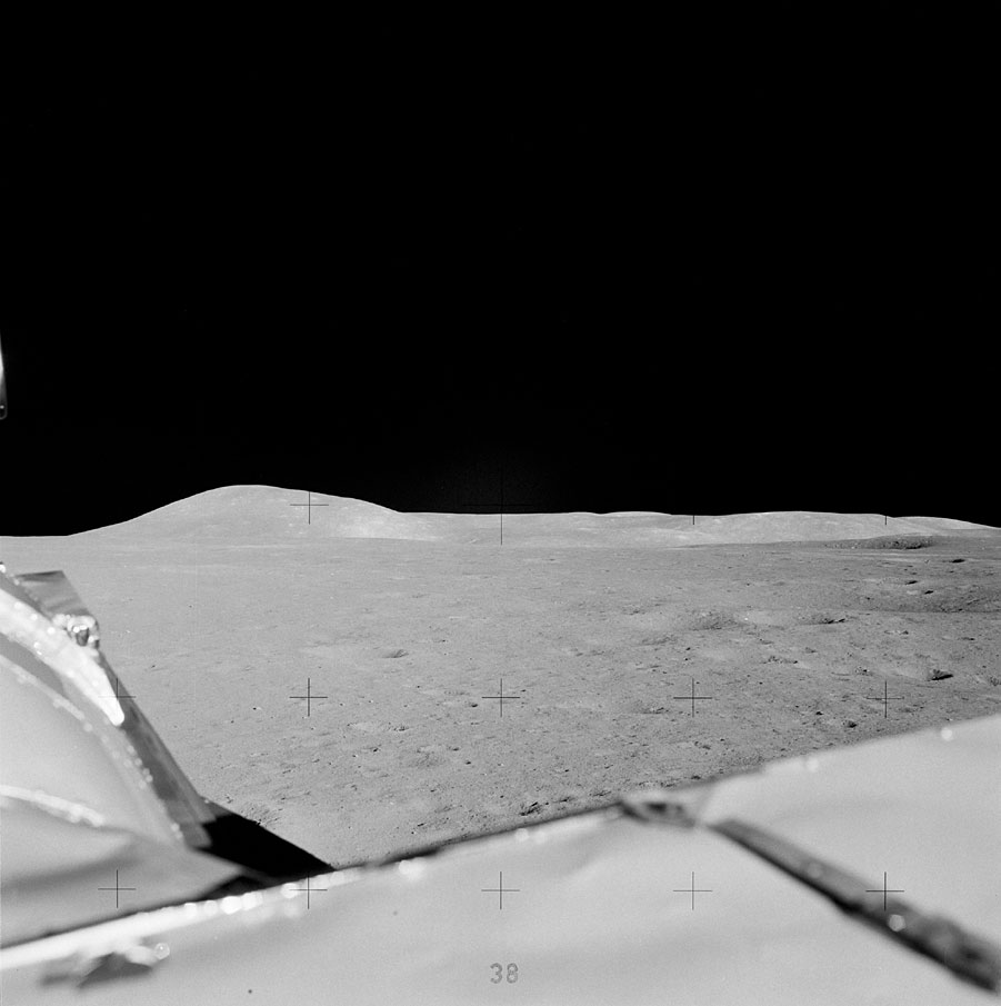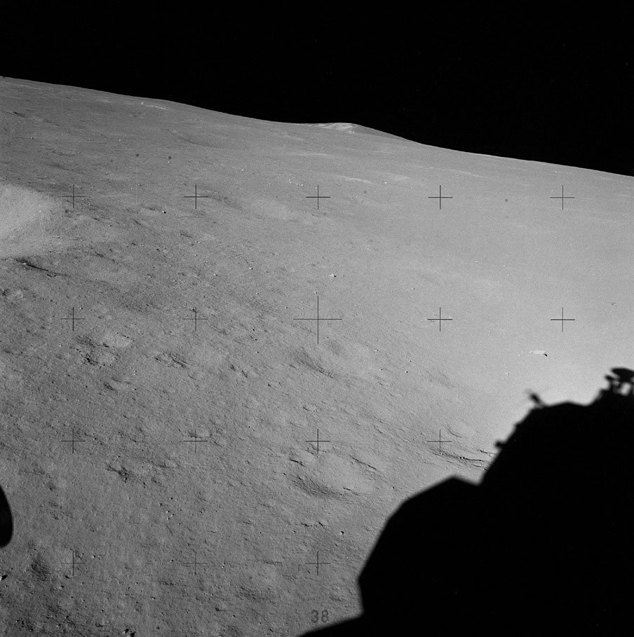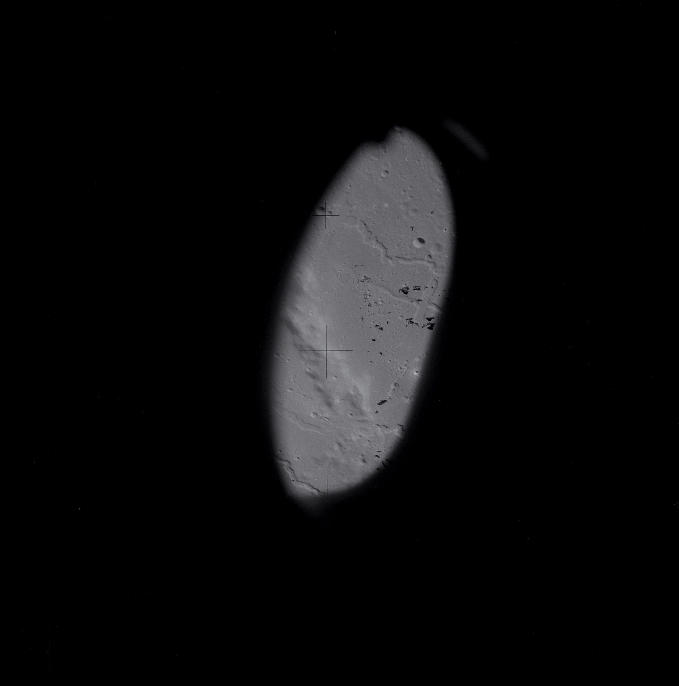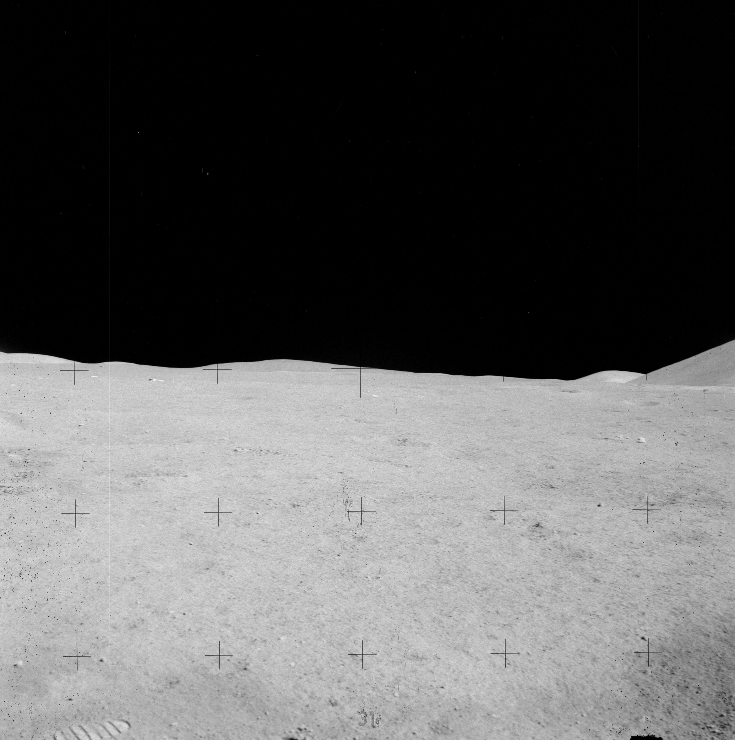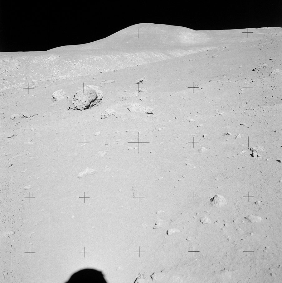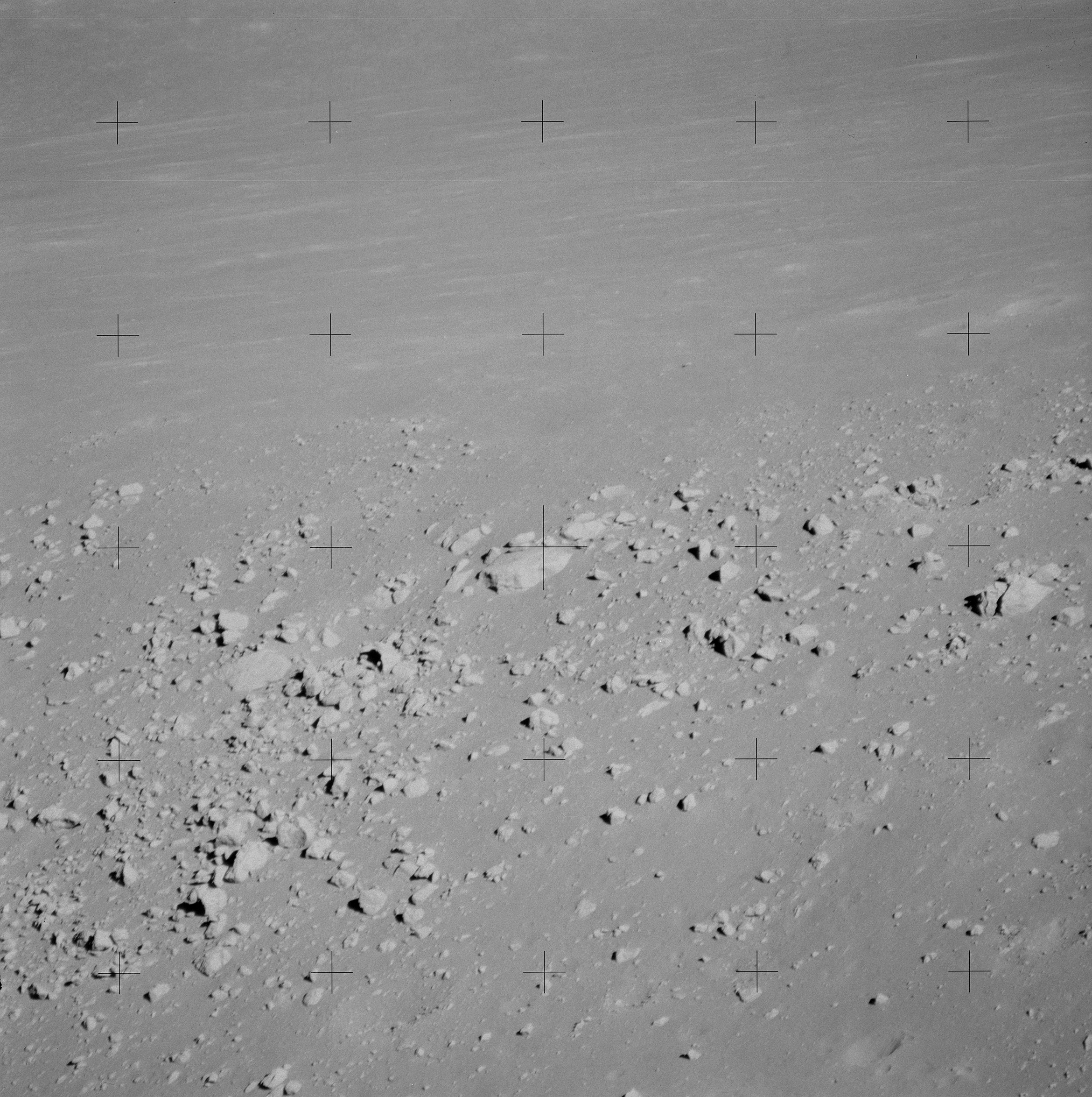 This picture was taken from the LM during CSM Rev 13 on the last pass over the landing site prior to the descent. A labeled version shows some of the prominent landmarks.Rev 16 Mapping (Metric) Camera Frame 0414 ( 13 Mb )