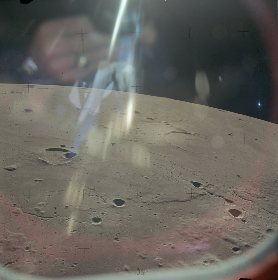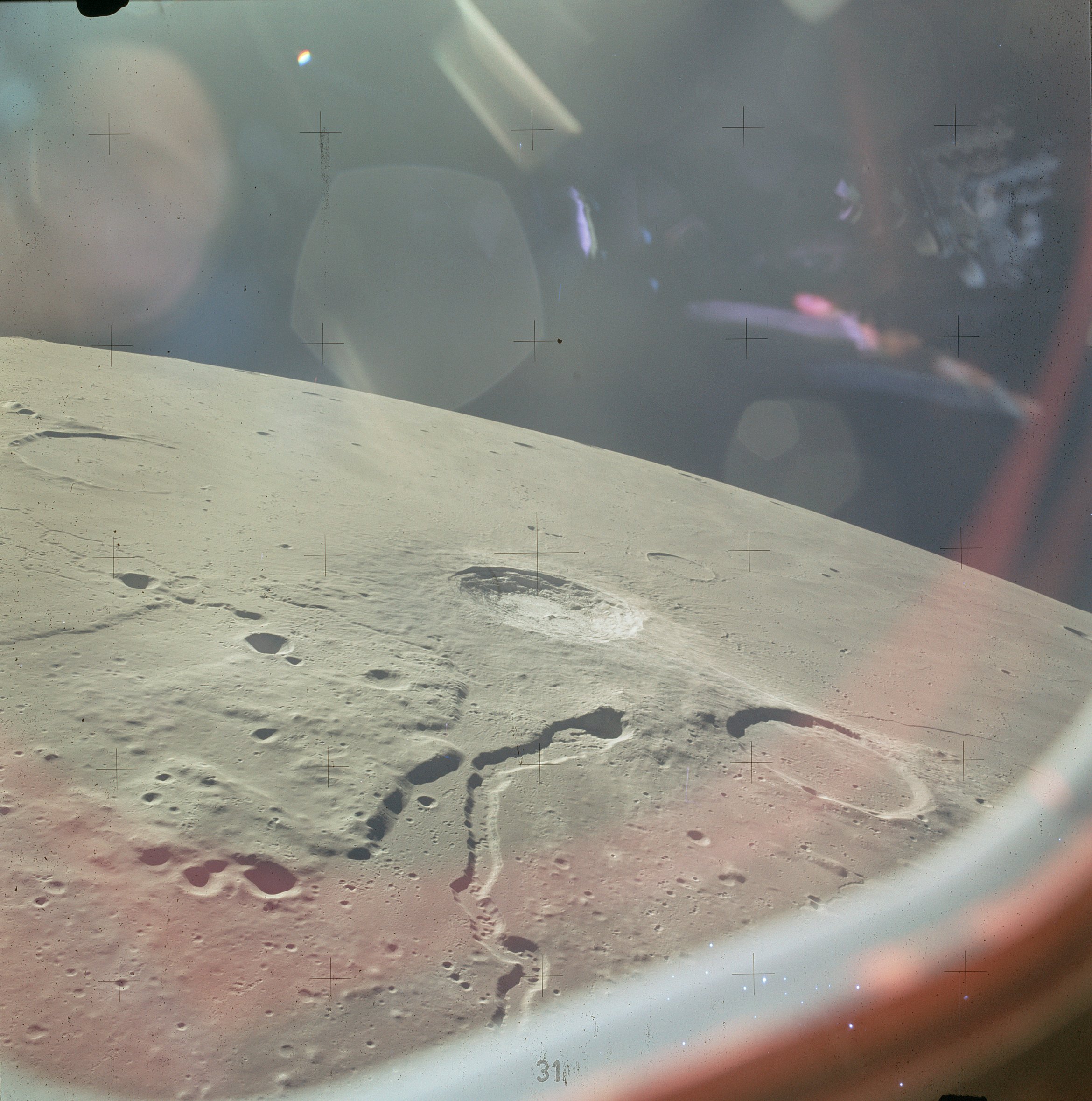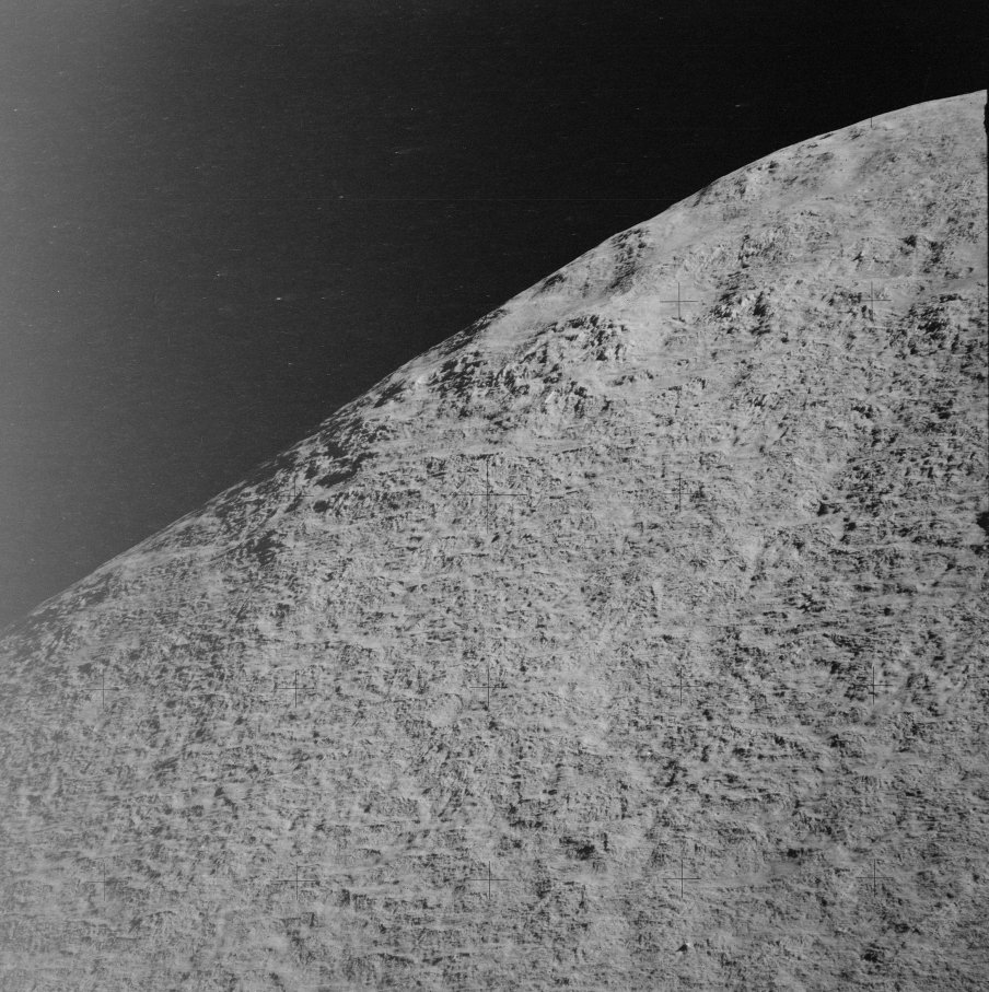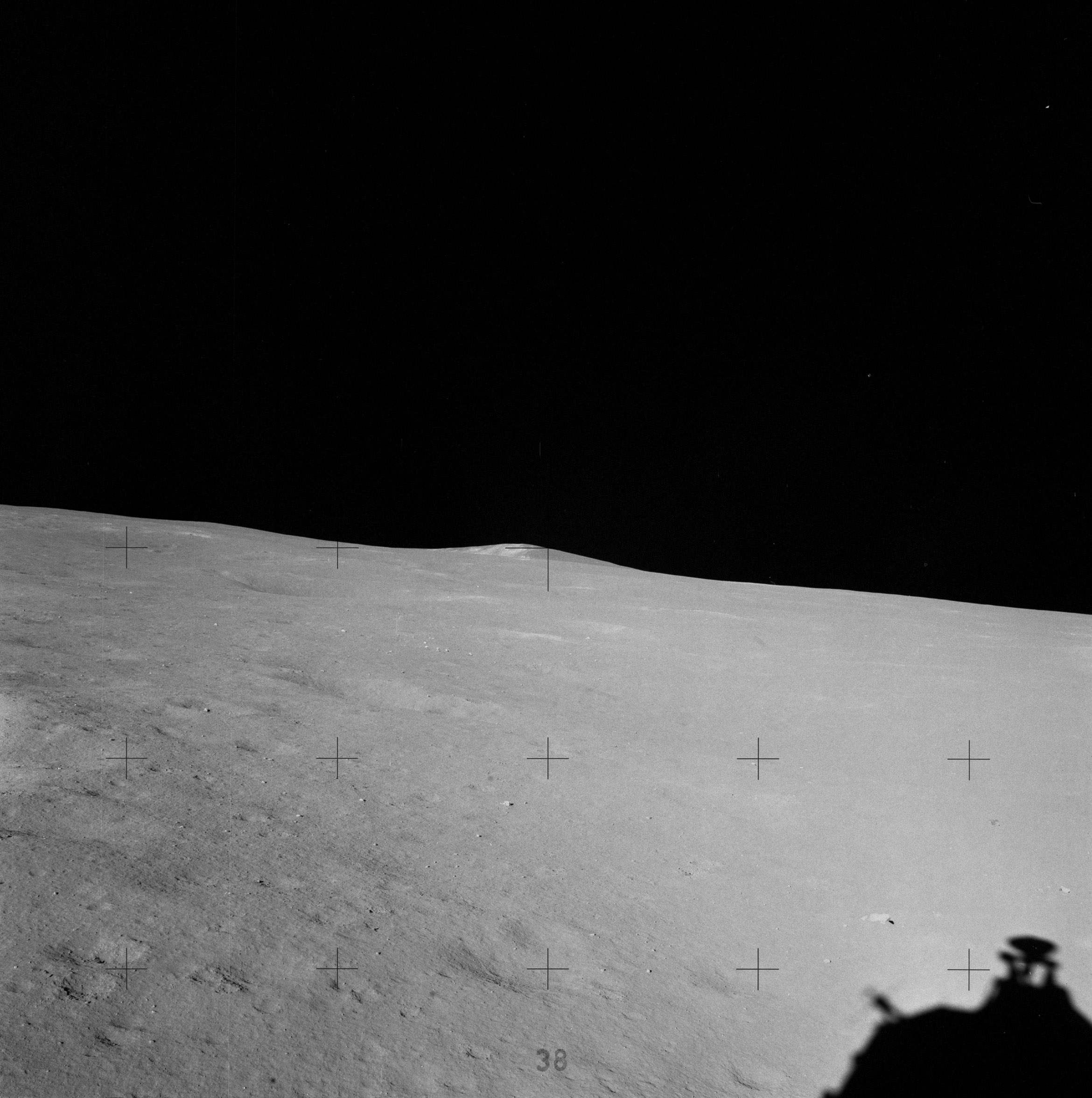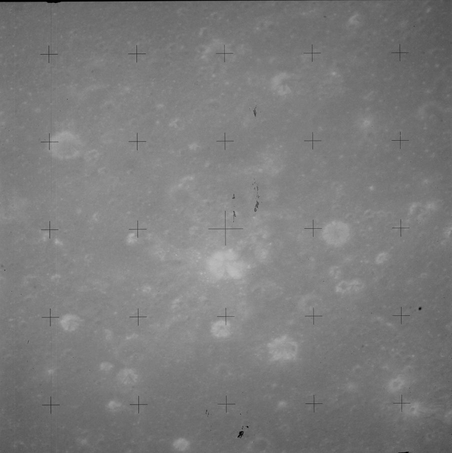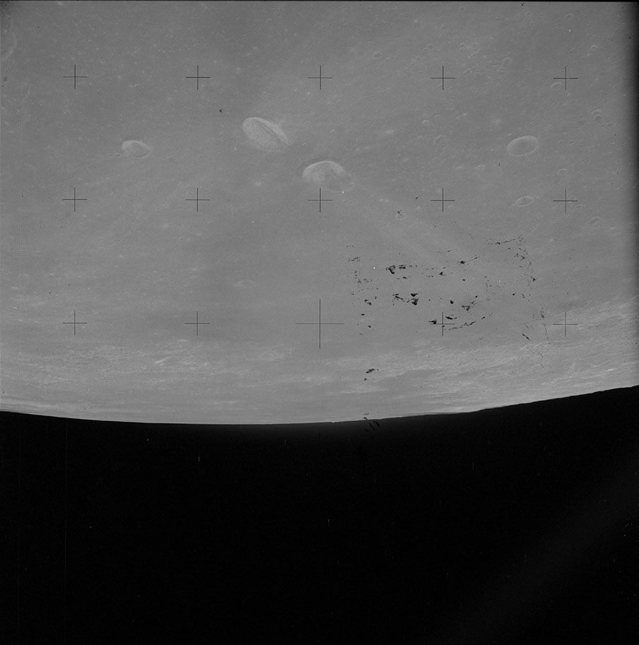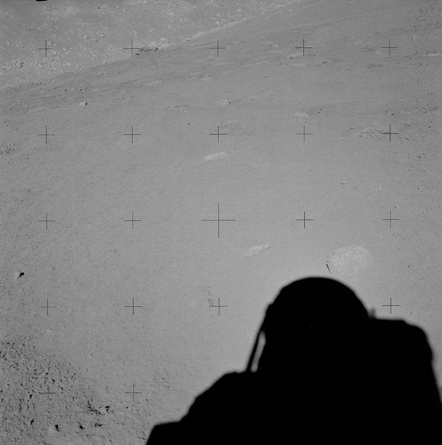 This picture was taken from the LM during CSM Rev 13 on the last pass over the landing site prior to the descent. A labeled version shows some of the prominent landmarks.Rev 16 Mapping (Metric) Camera Frame 0414 ( 13 Mb )