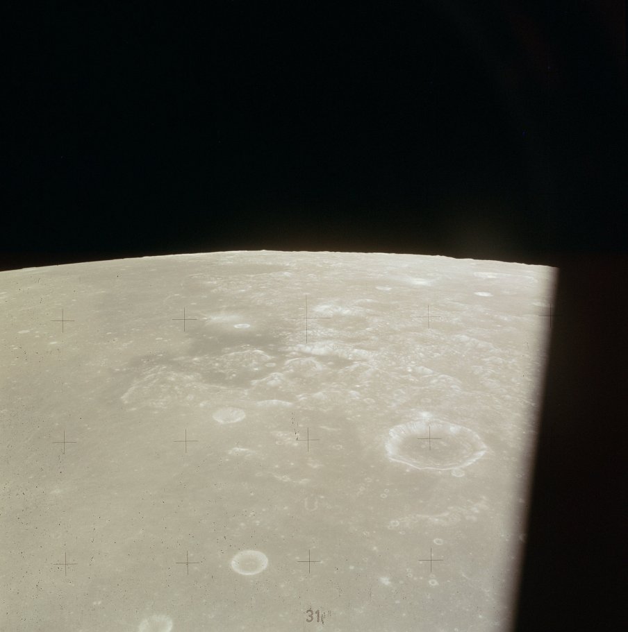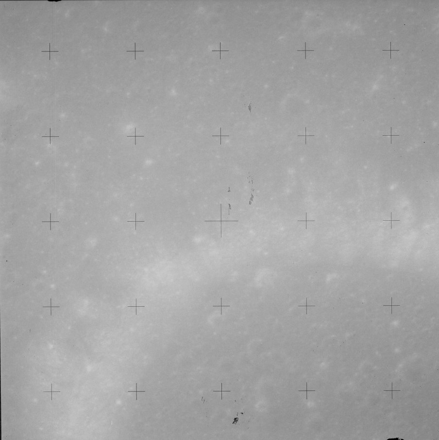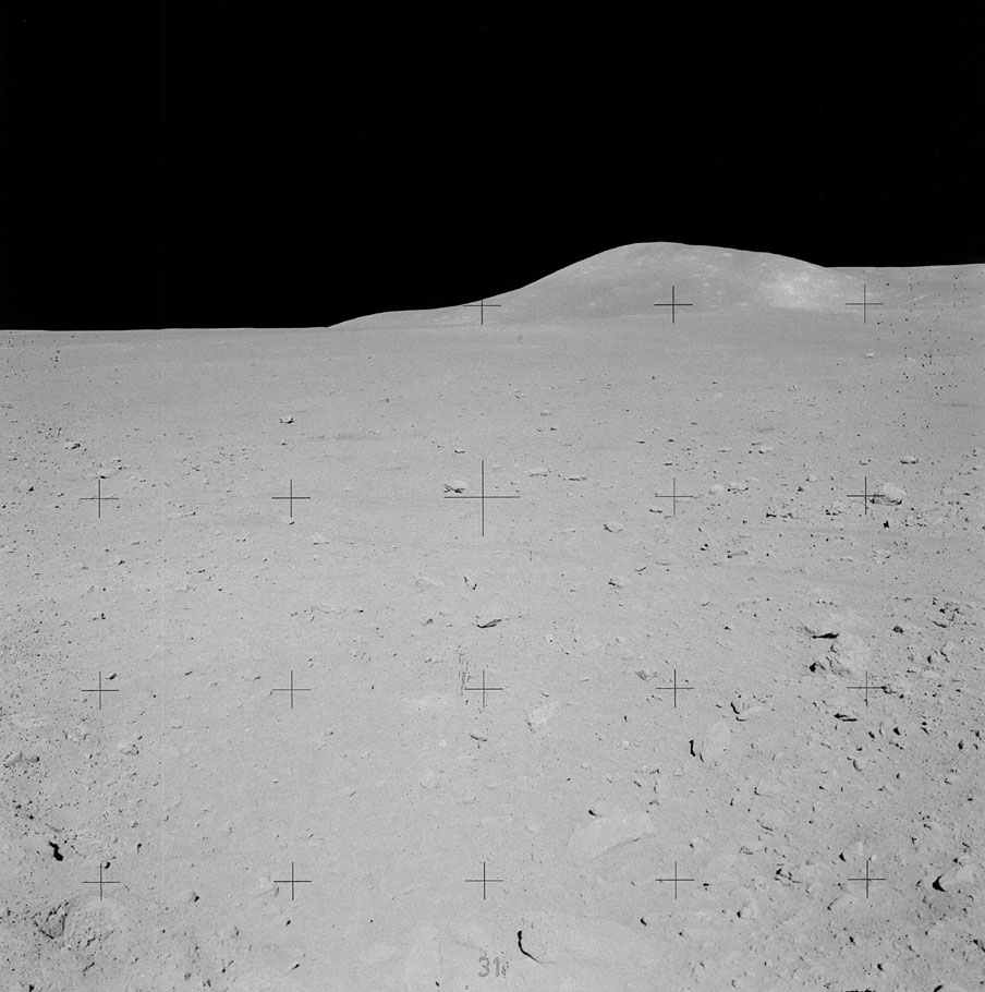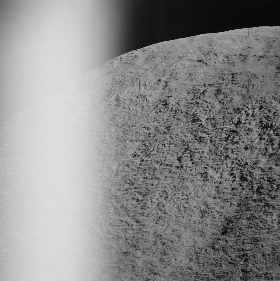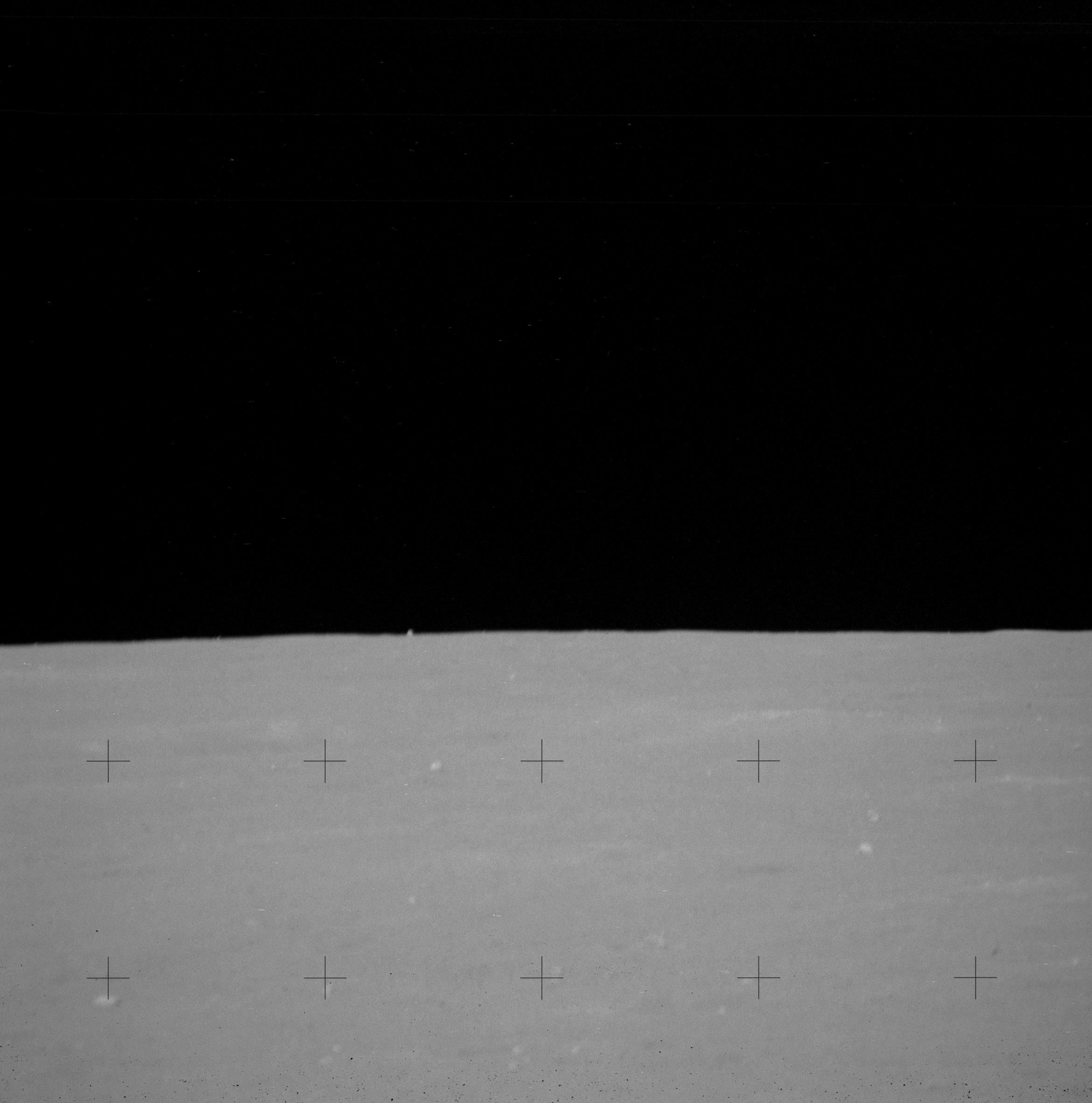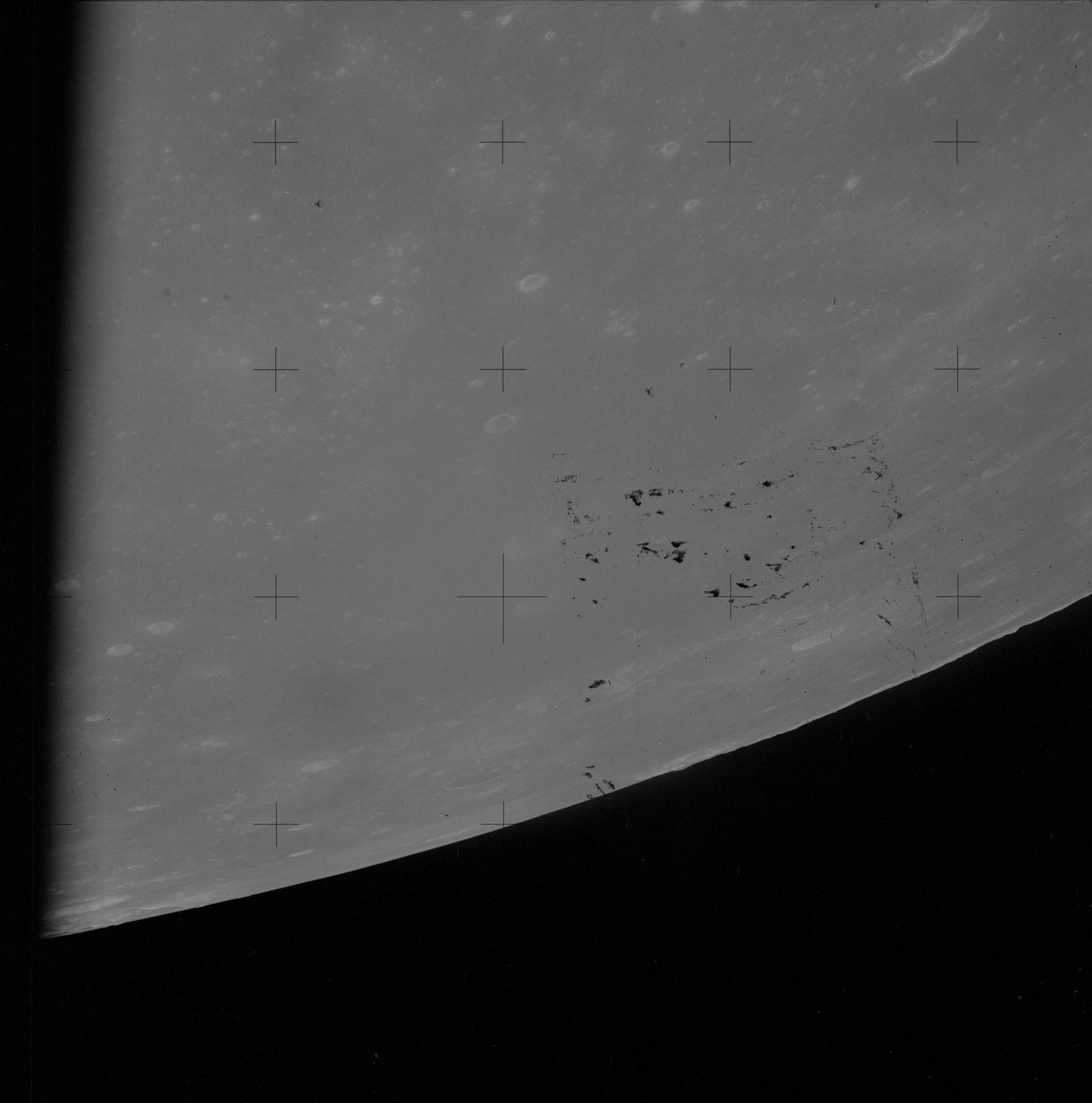 This picture was taken from the LM during CSM Rev 13 on the last pass over the landing site prior to the descent. A labeled version shows some of the prominent landmarks.Rev 16 Mapping (Metric) Camera Frame 0414 ( 13 Mb )