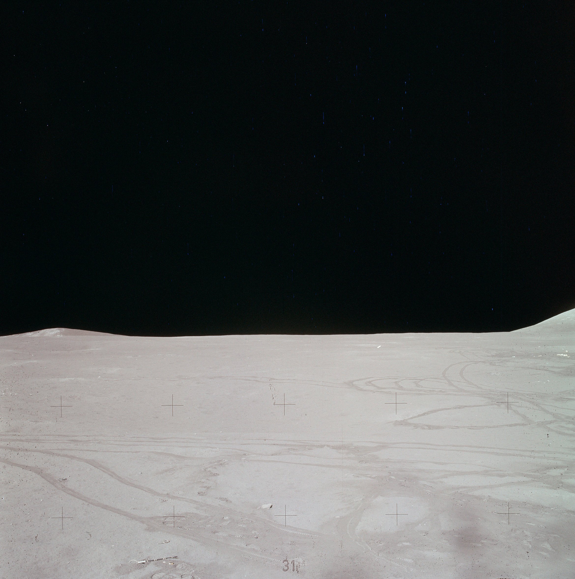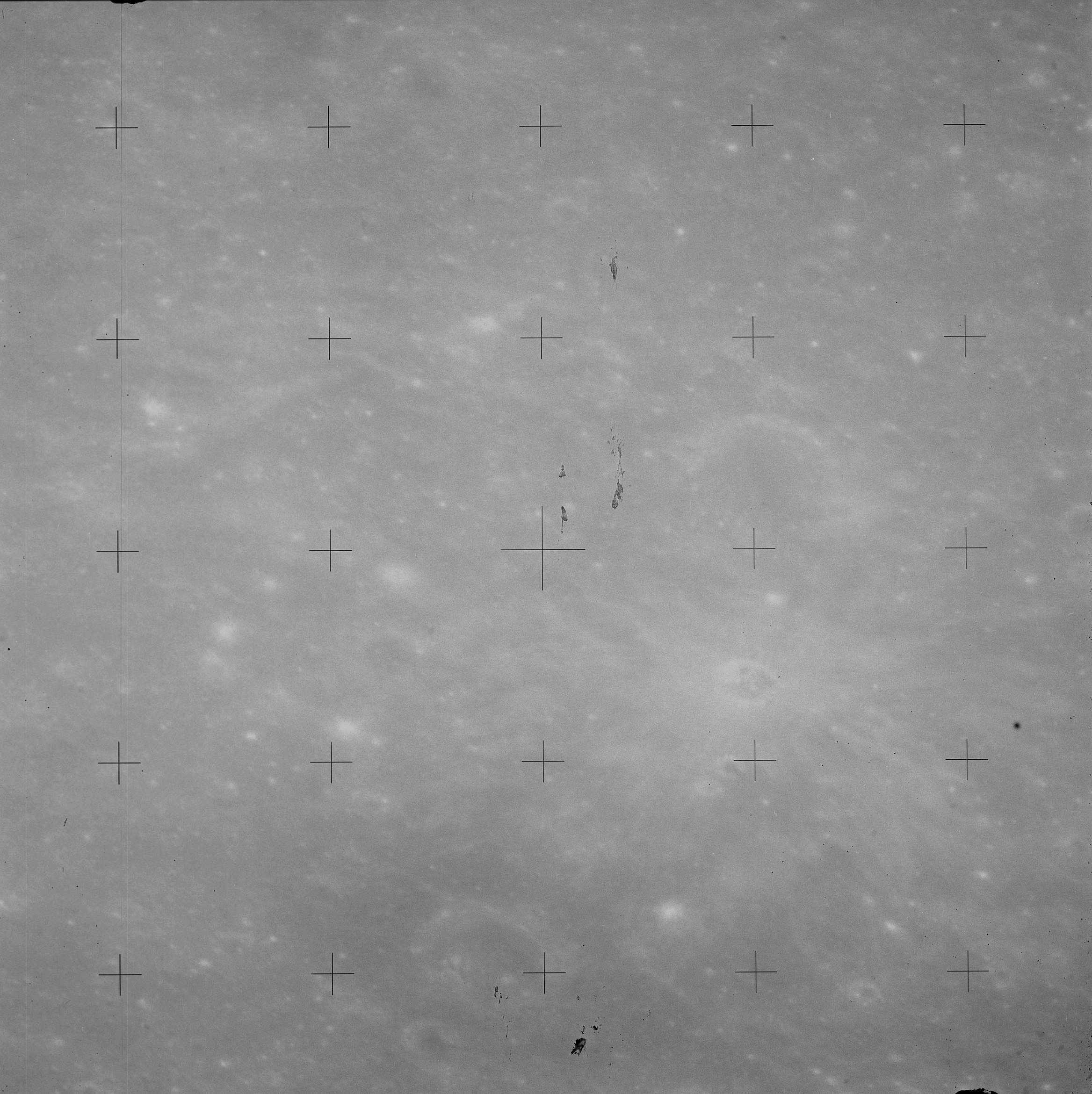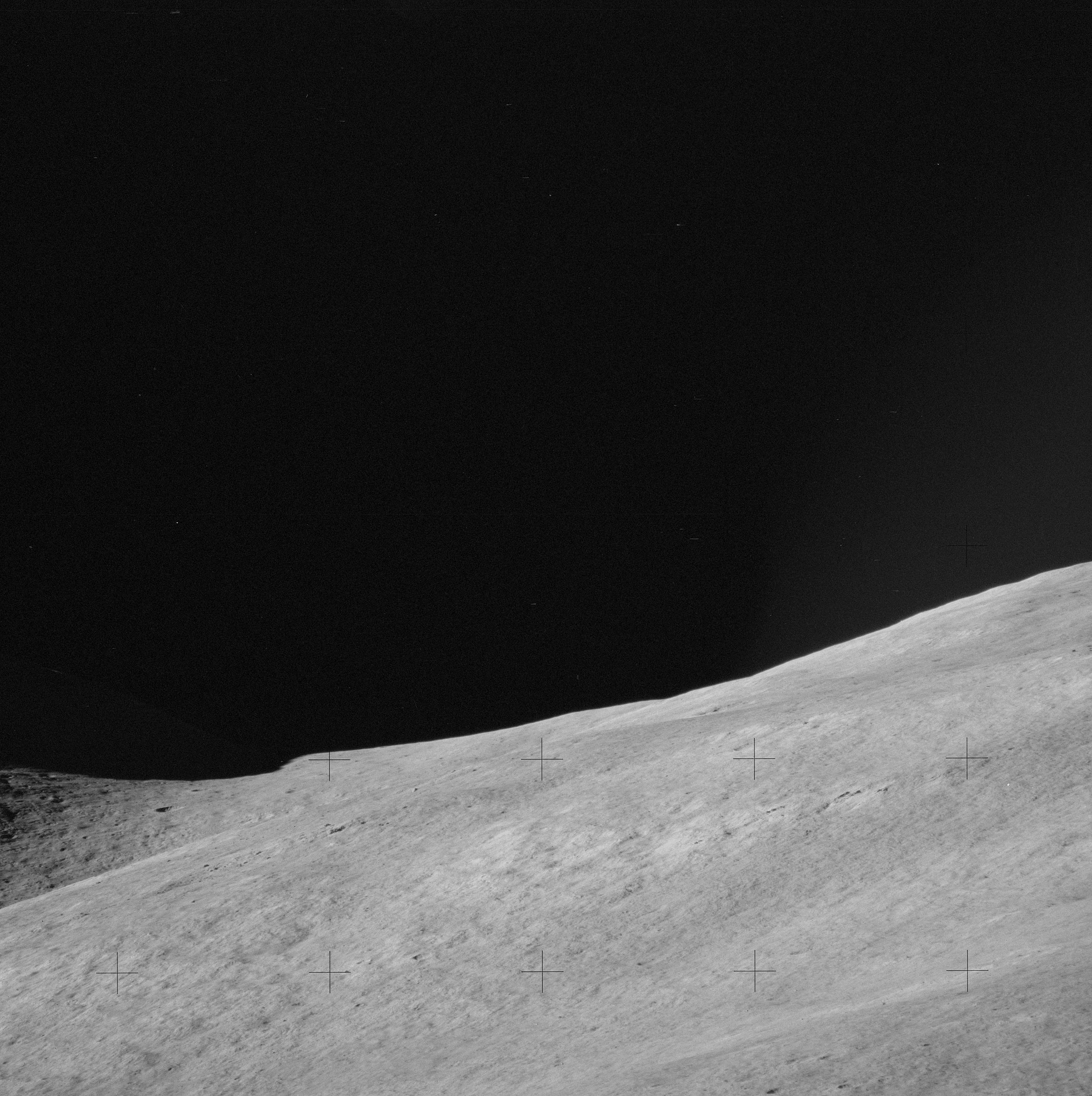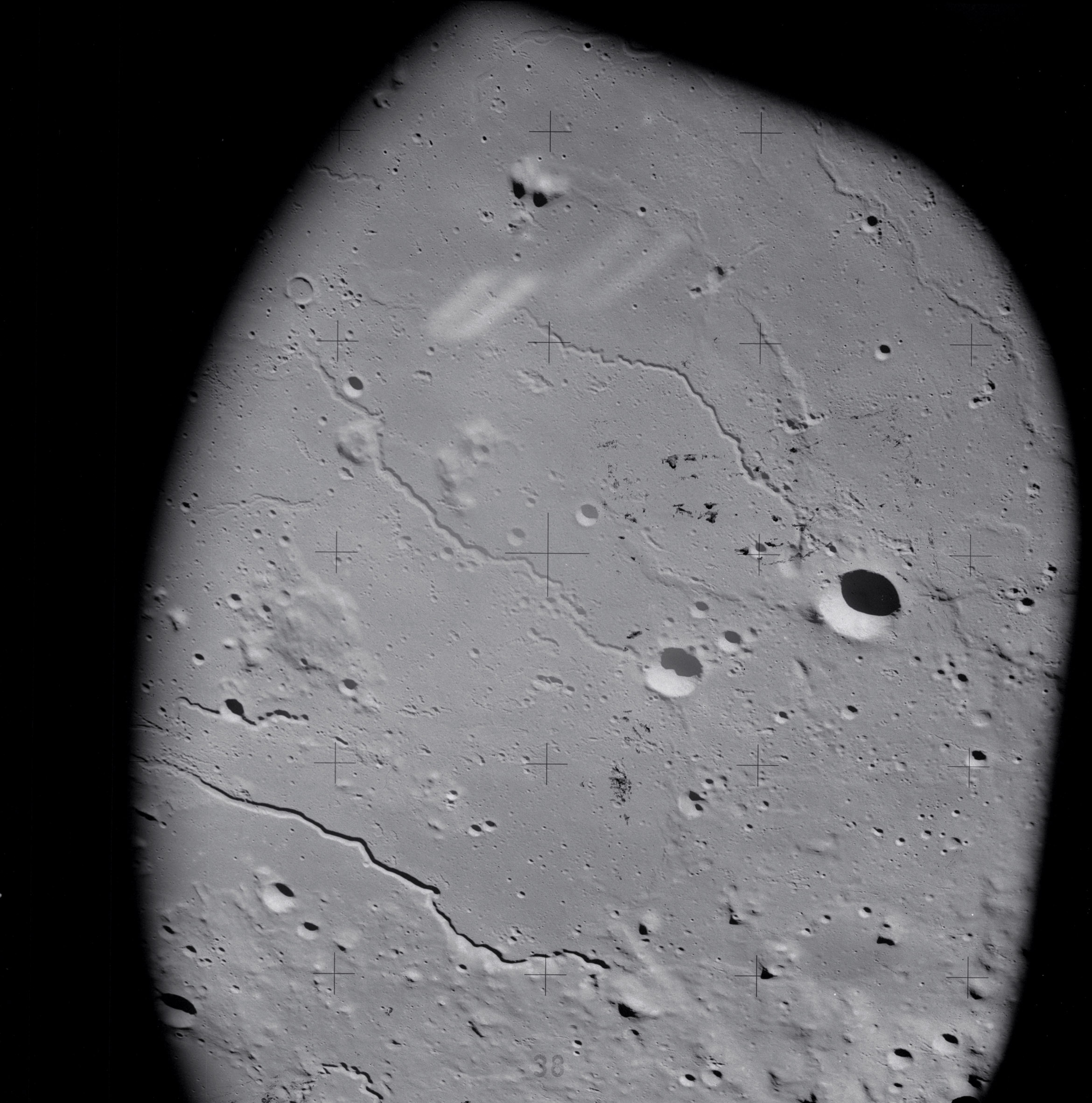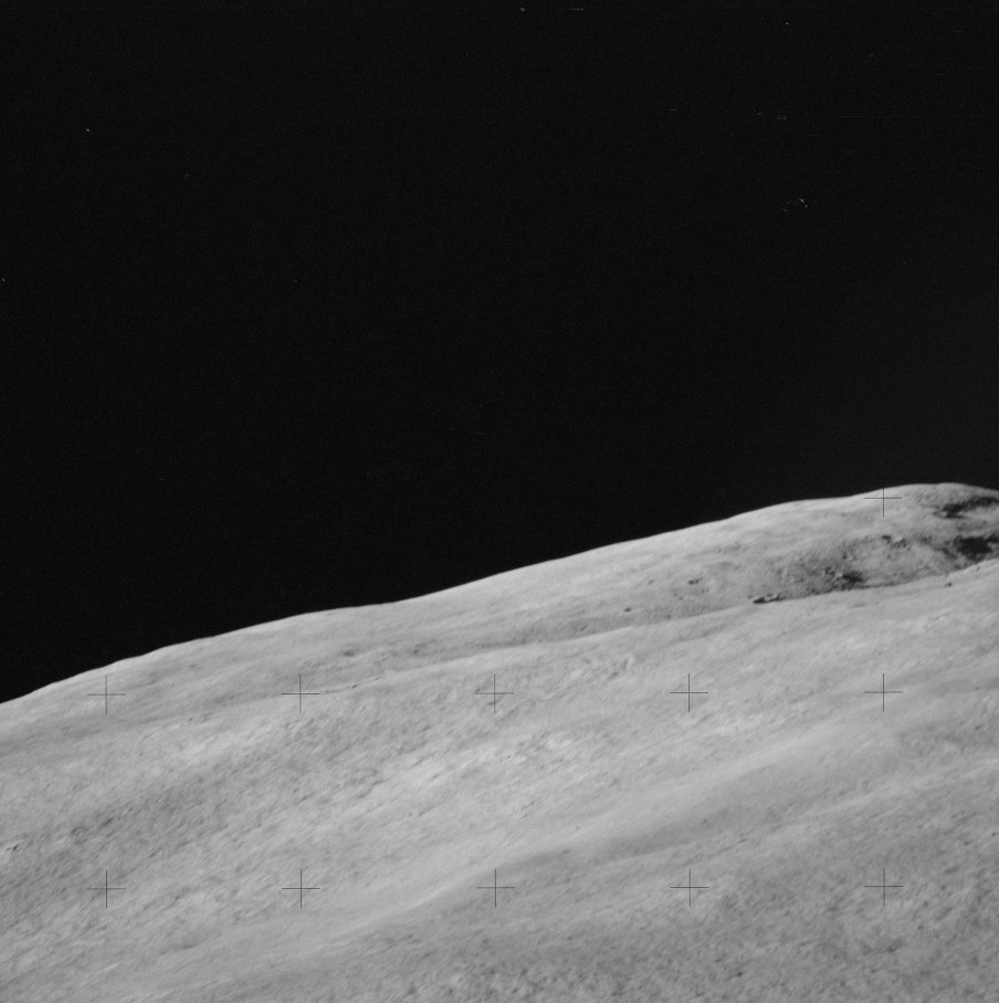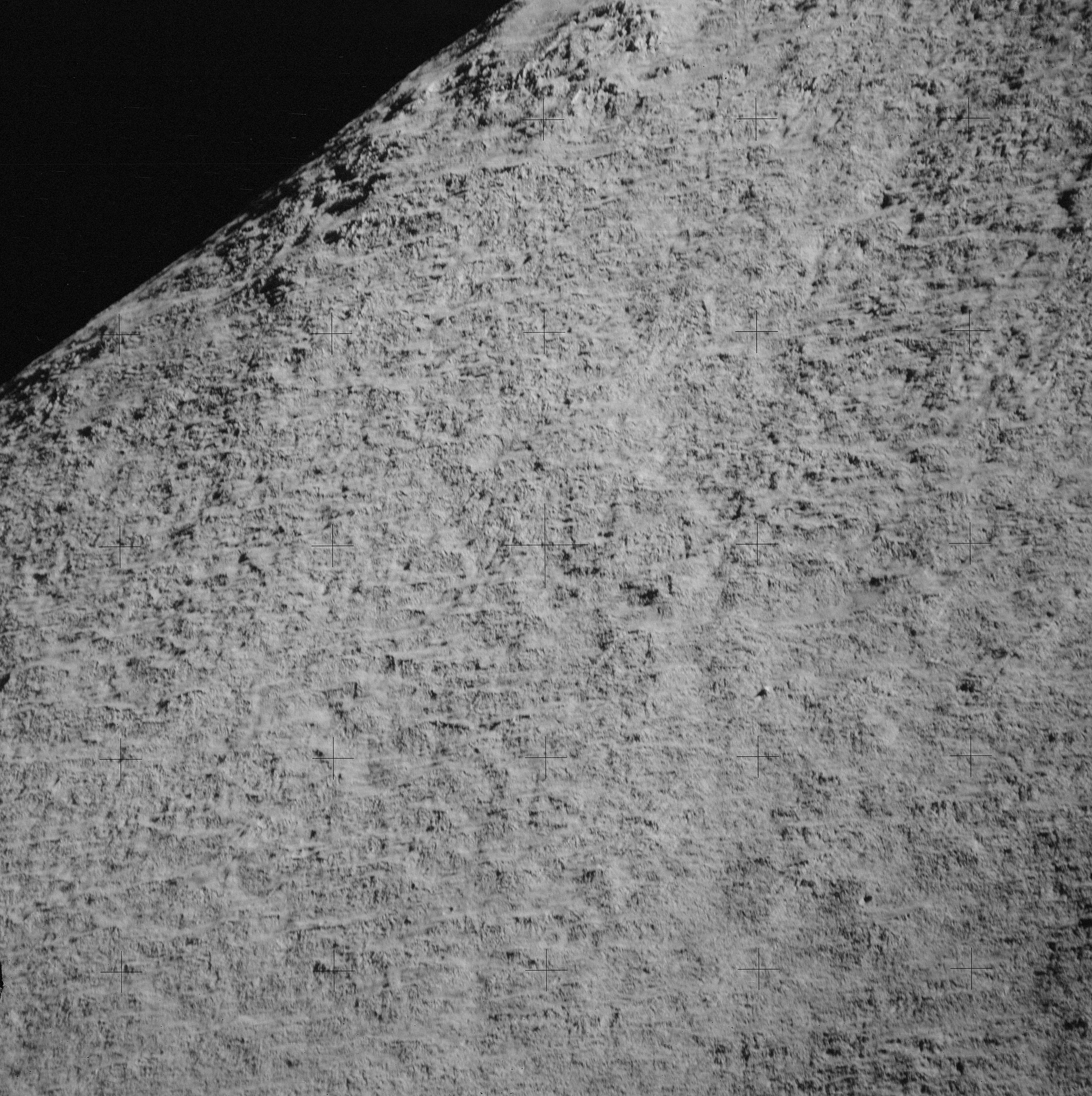 This picture was taken from the LM during CSM Rev 13 on the last pass over the landing site prior to the descent. A labeled version shows some of the prominent landmarks.Rev 16 Mapping (Metric) Camera Frame 0414 ( 13 Mb )