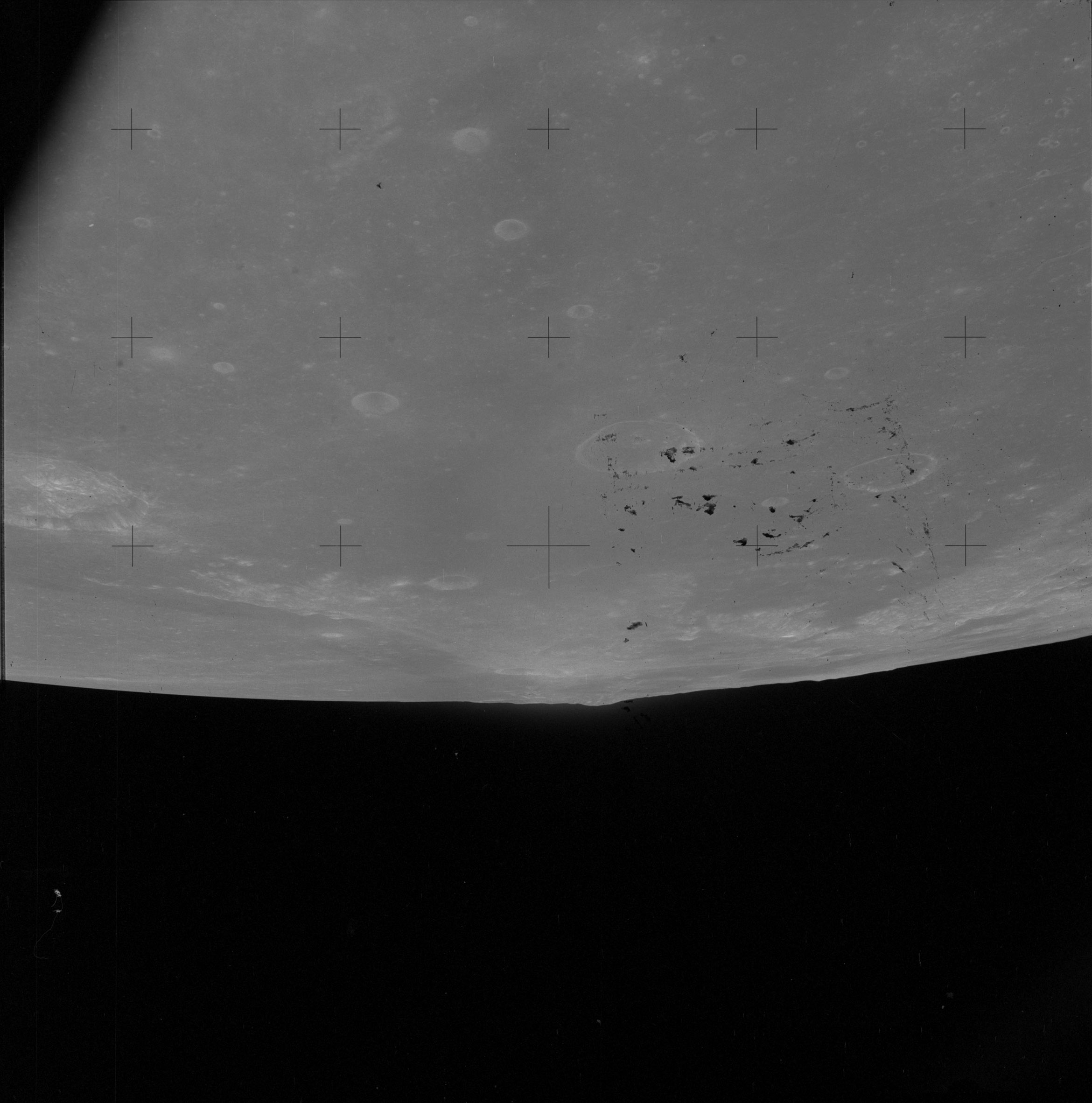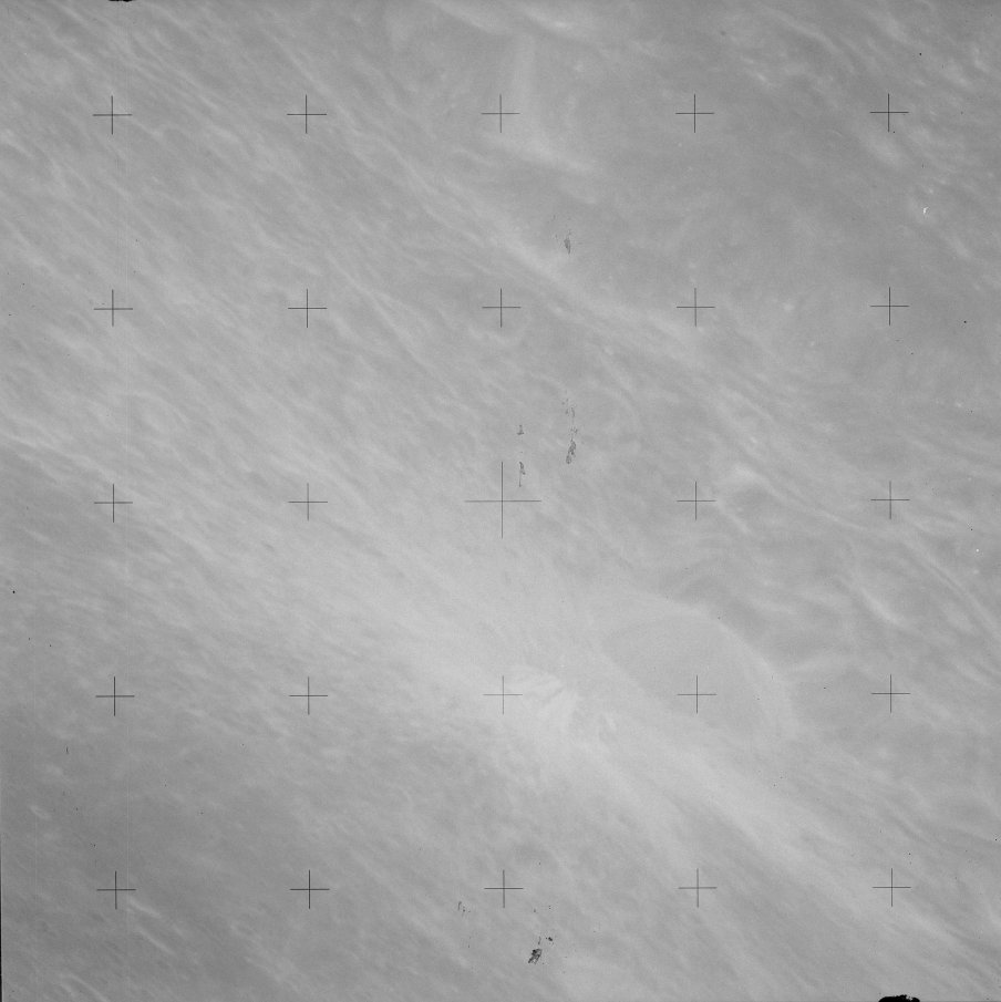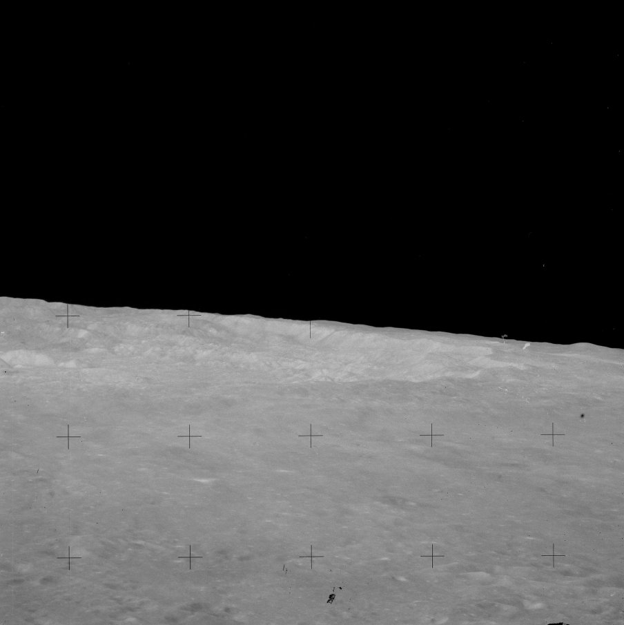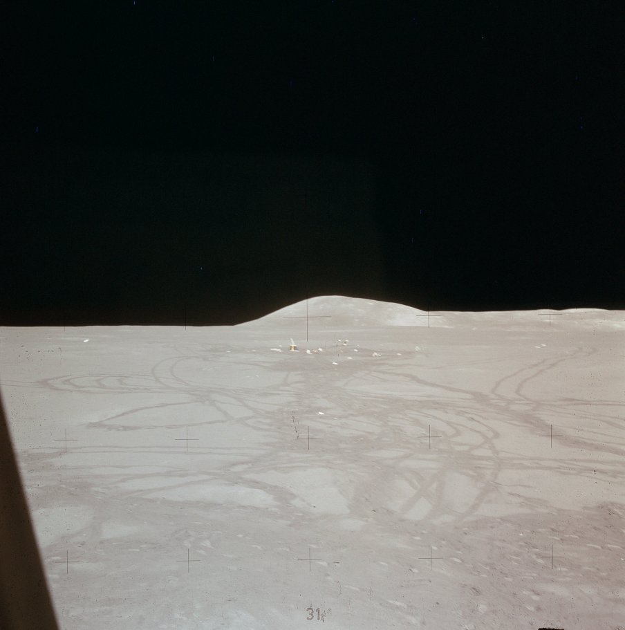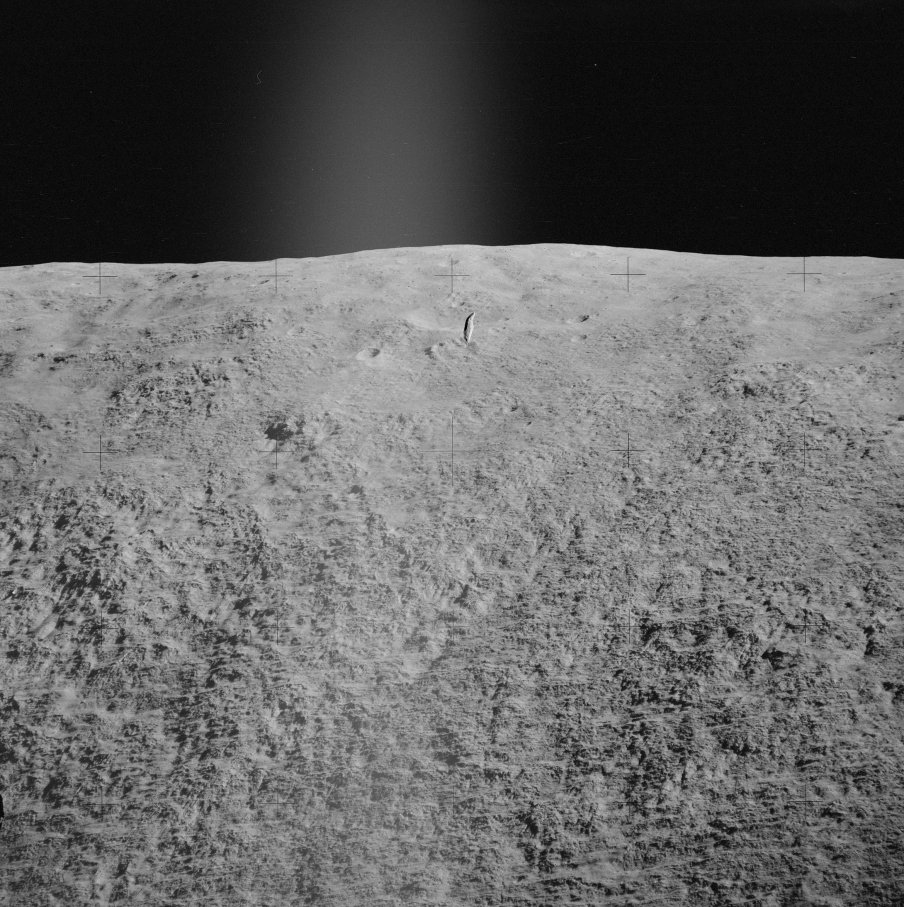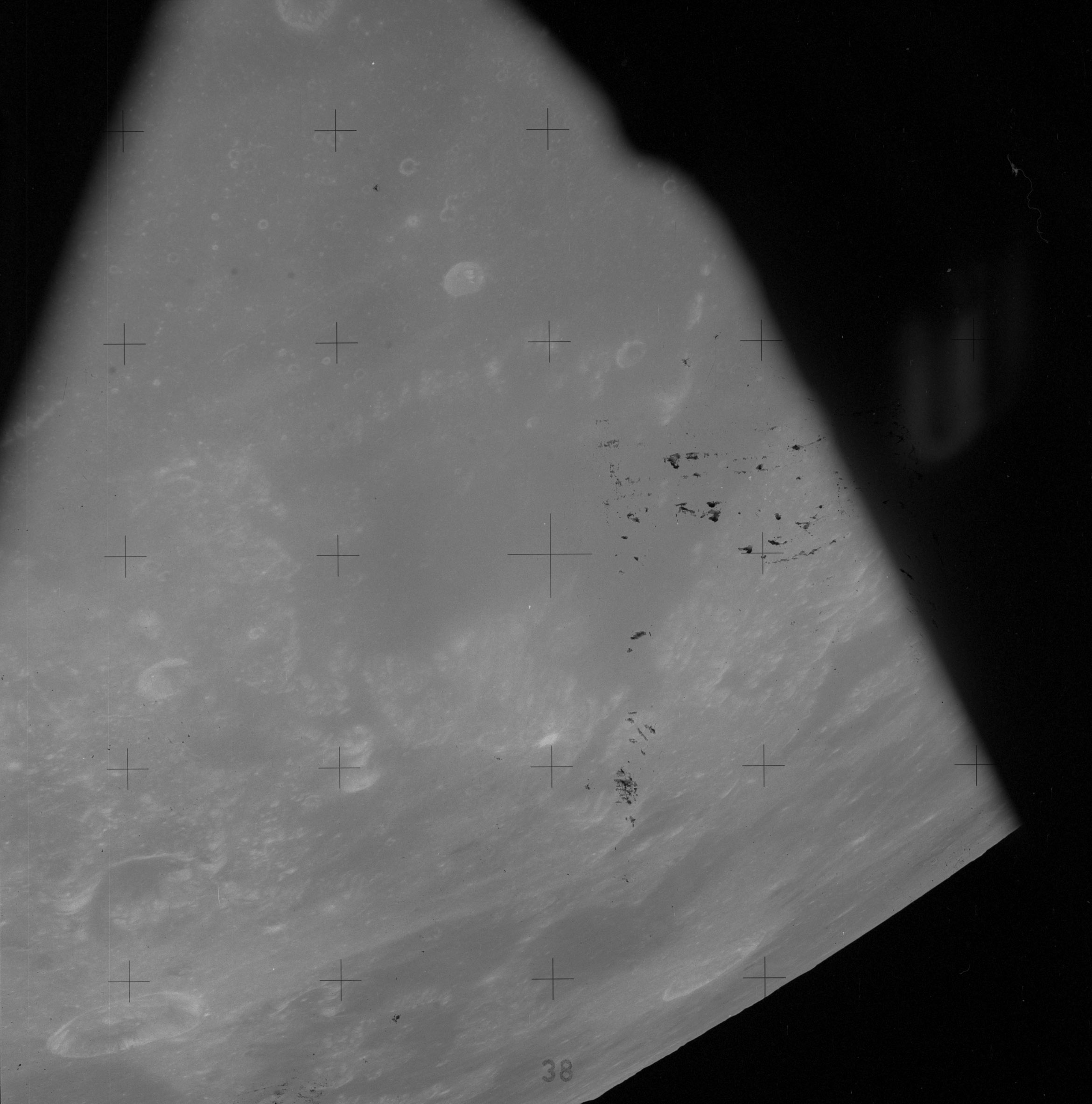 This picture was taken from the LM during CSM Rev 13 on the last pass over the landing site prior to the descent. A labeled version shows some of the prominent landmarks.Rev 16 Mapping (Metric) Camera Frame 0414 ( 13 Mb )