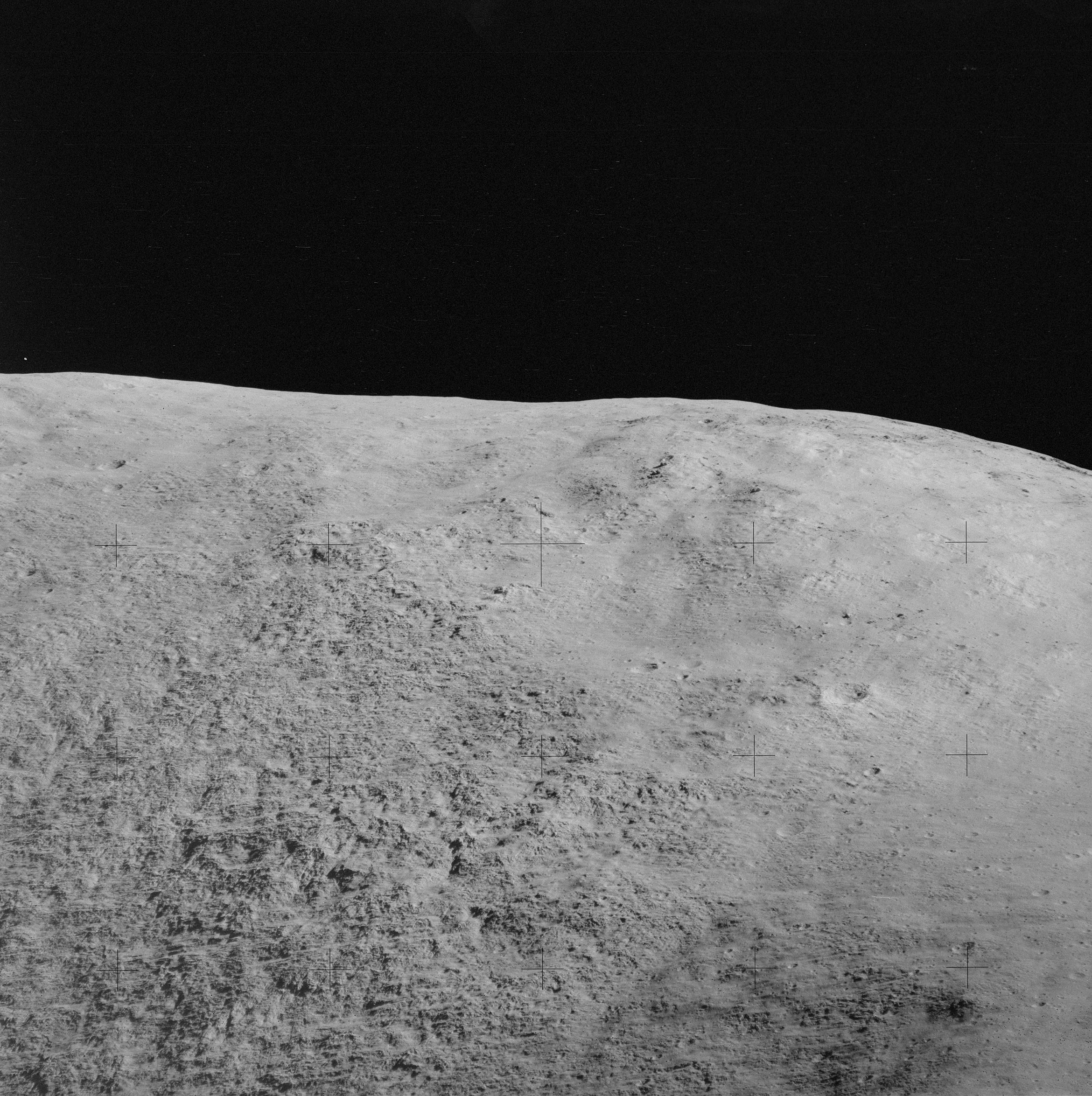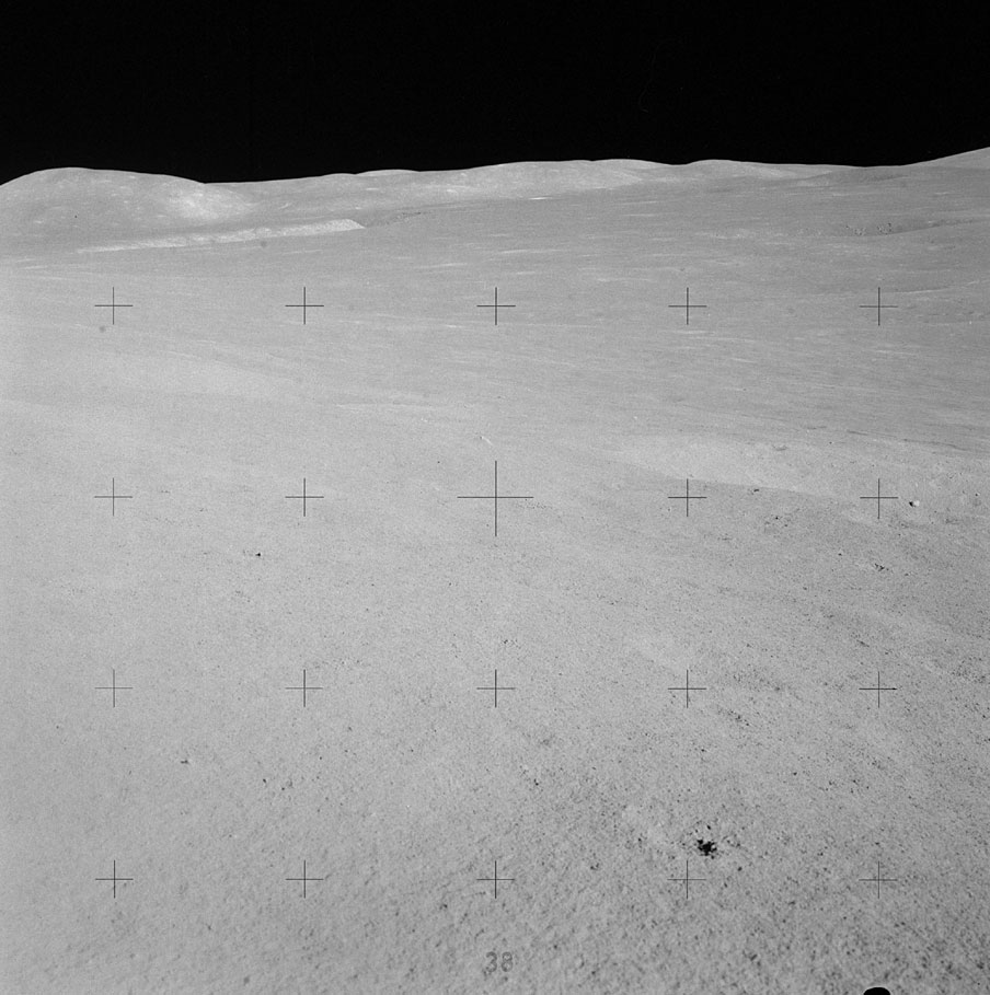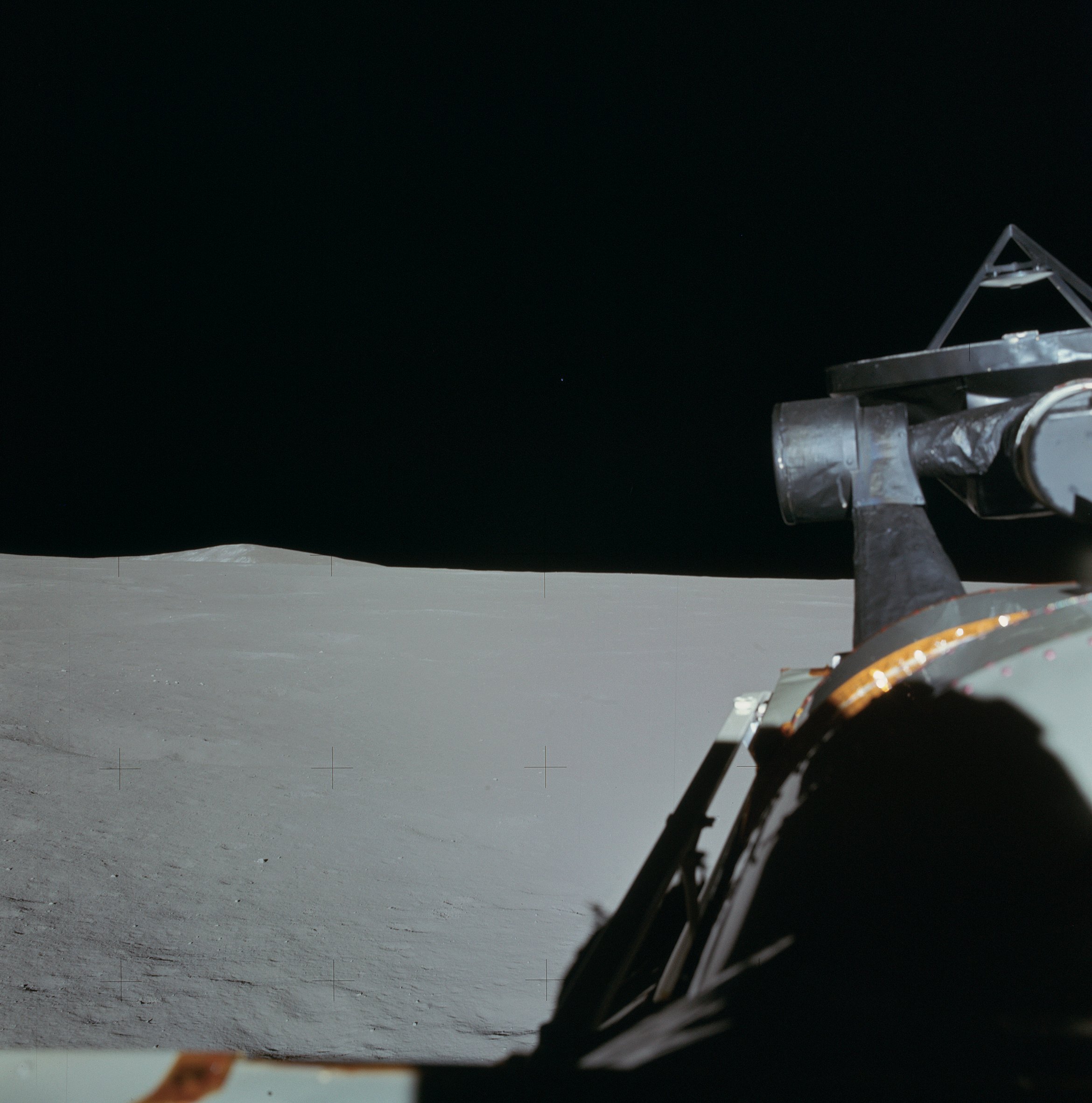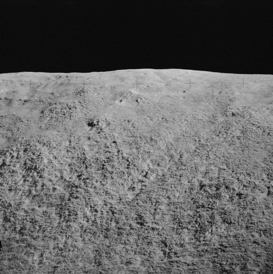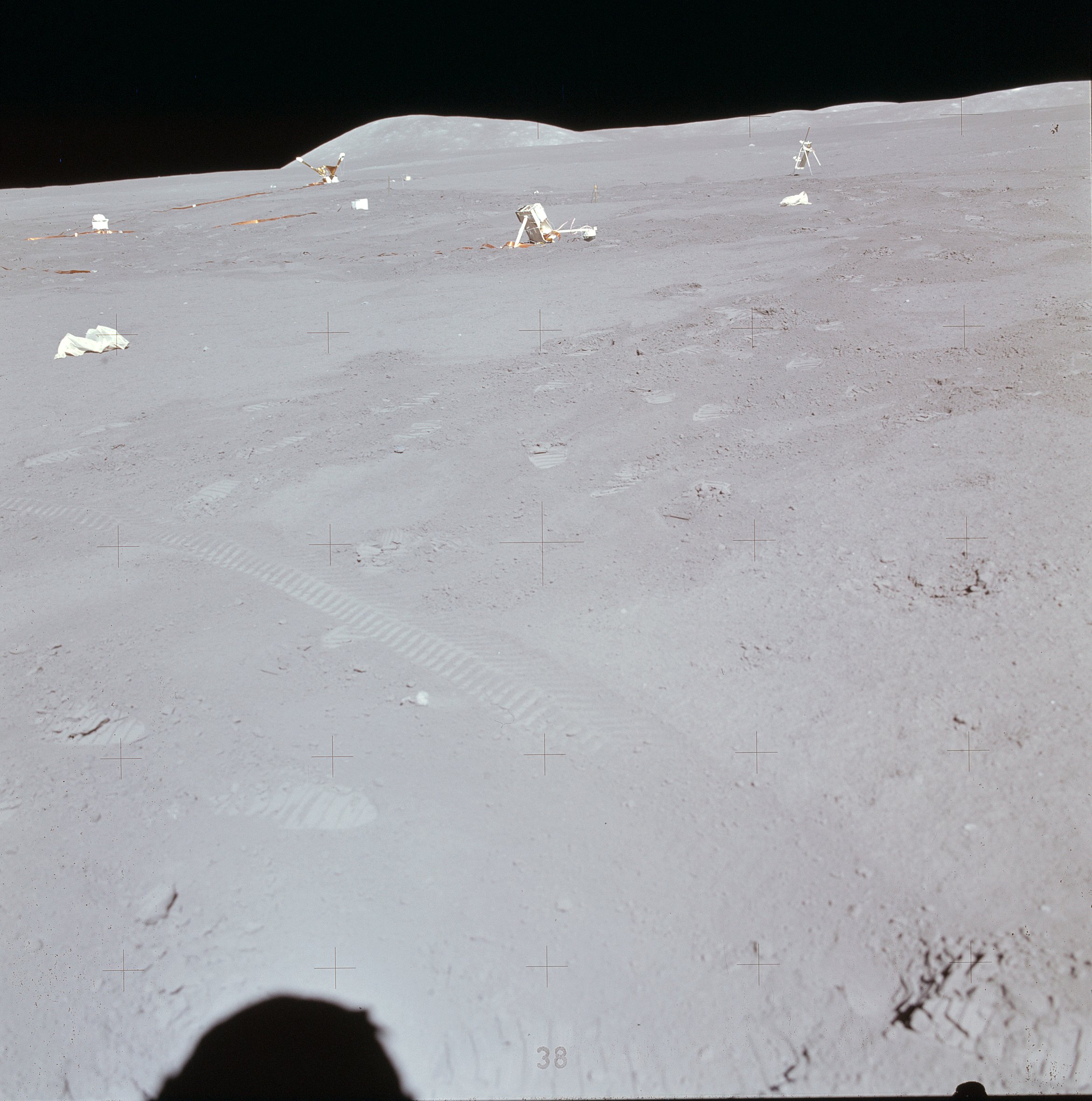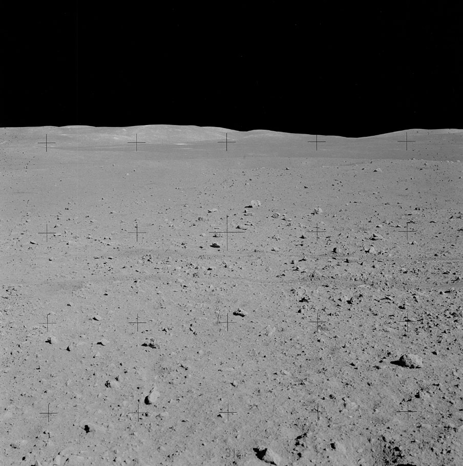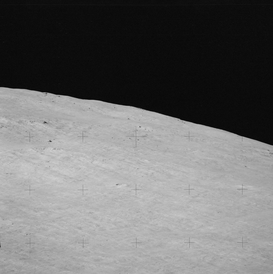 This picture was taken from the LM during CSM Rev 13 on the last pass over the landing site prior to the descent. A labeled version shows some of the prominent landmarks.Rev 16 Mapping (Metric) Camera Frame 0414 ( 13 Mb )