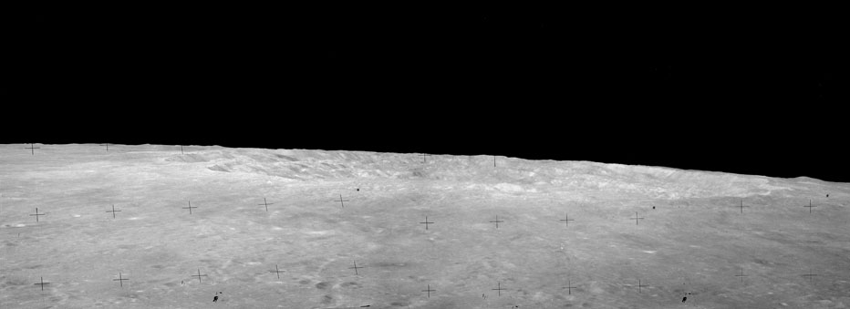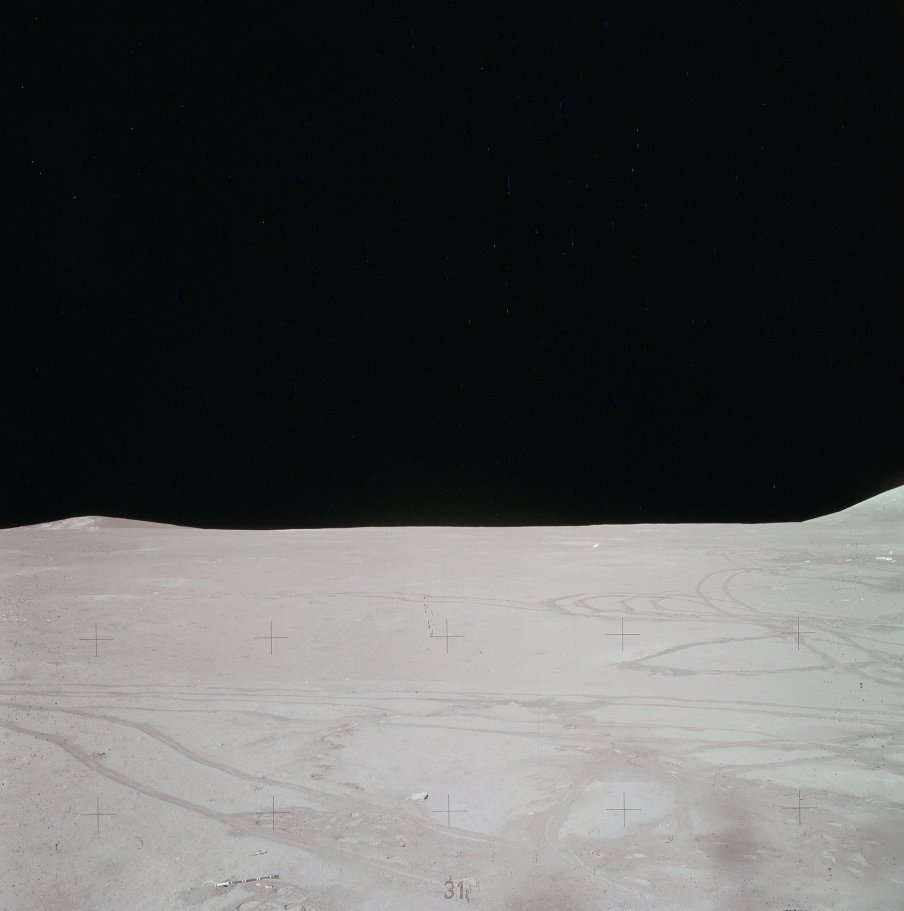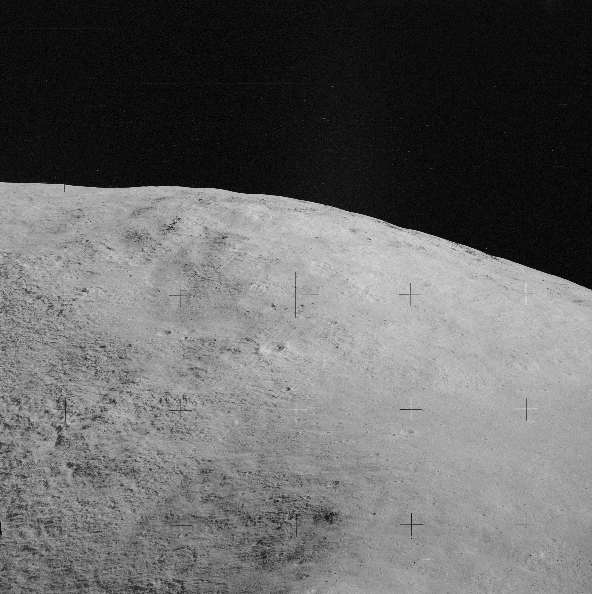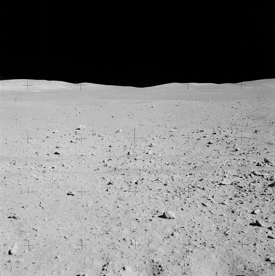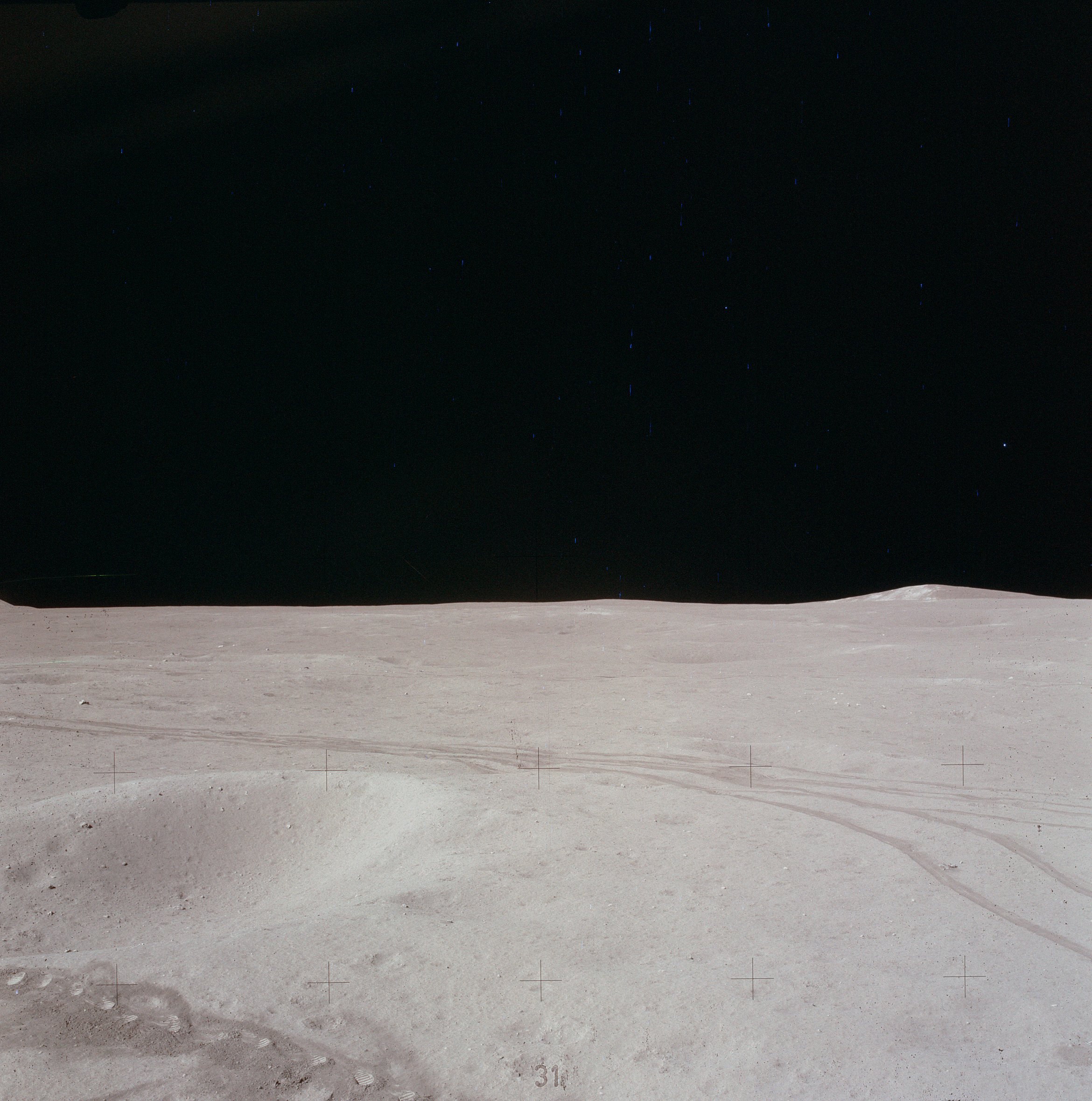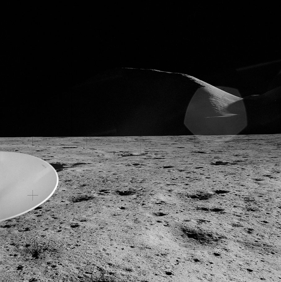 This picture was taken from the LM during CSM Rev 13 on the last pass over the landing site prior to the descent. A labeled version shows some of the prominent landmarks.Rev 16 Mapping (Metric) Camera Frame 0414 ( 13 Mb )