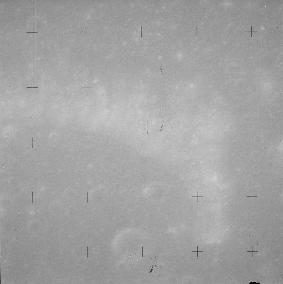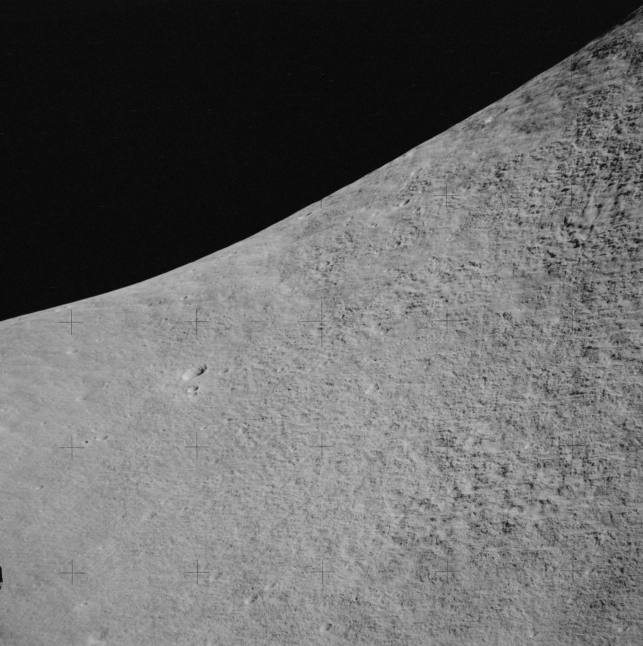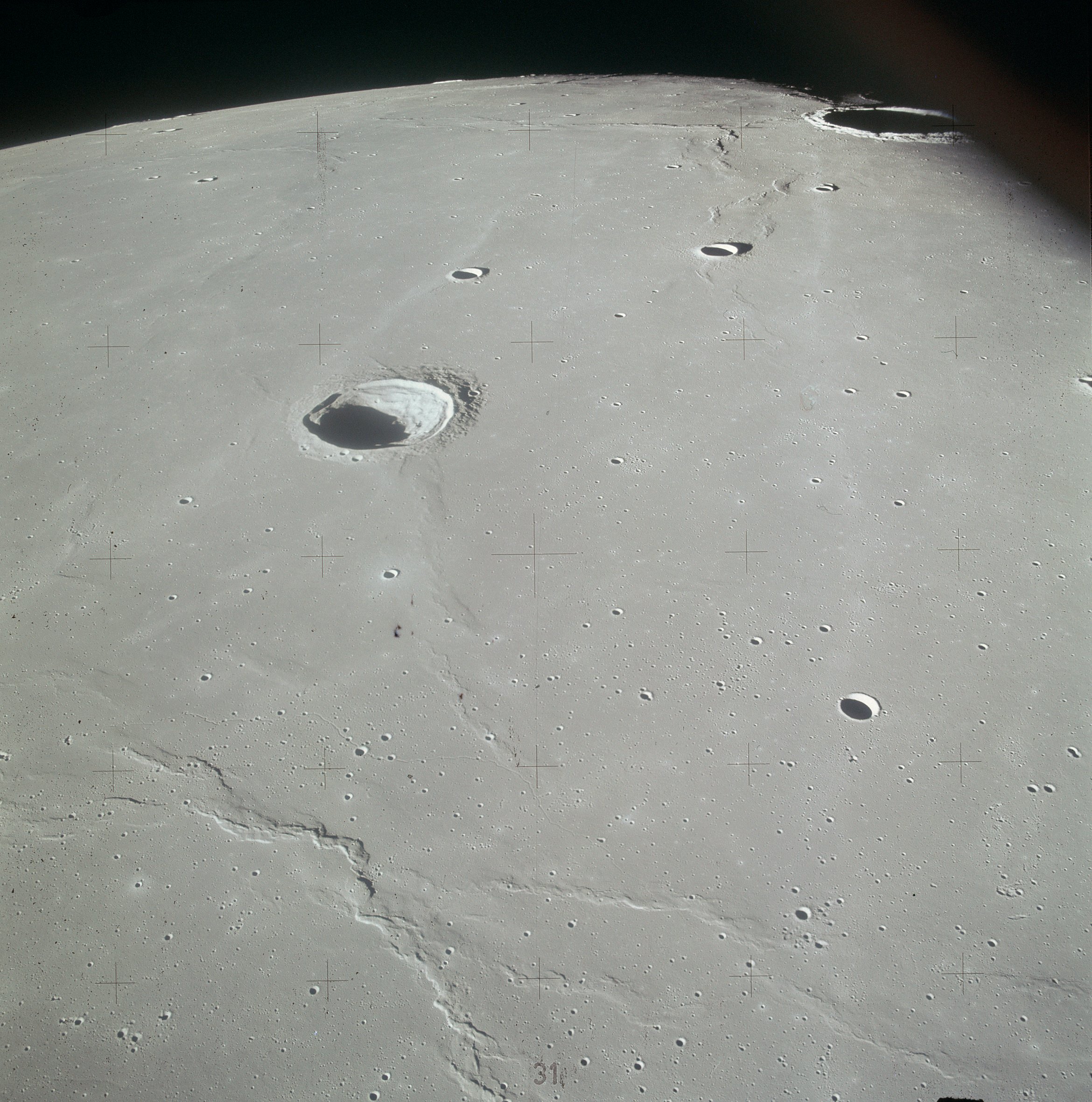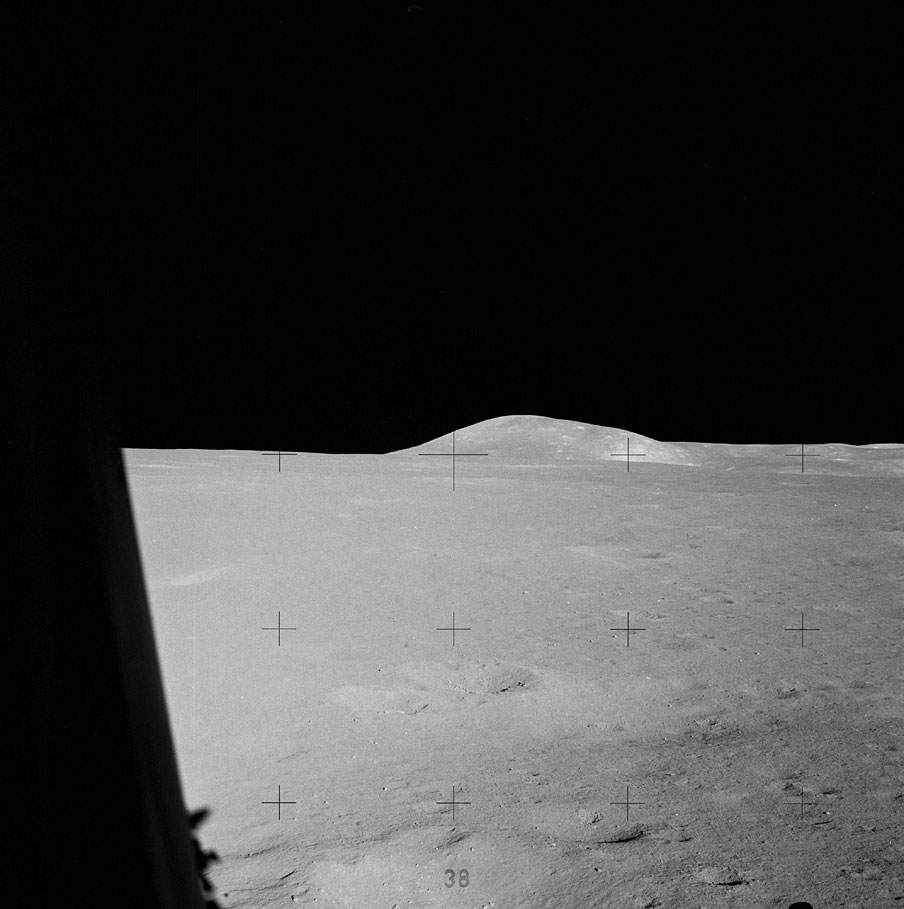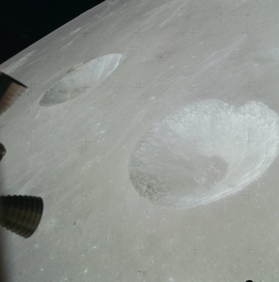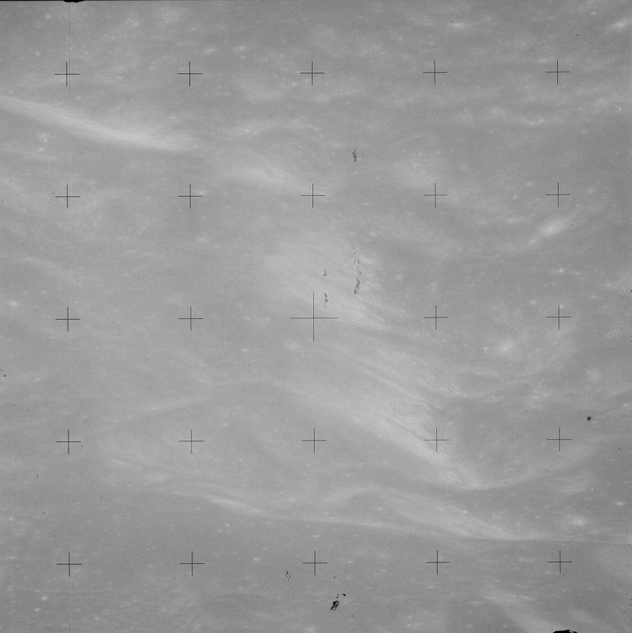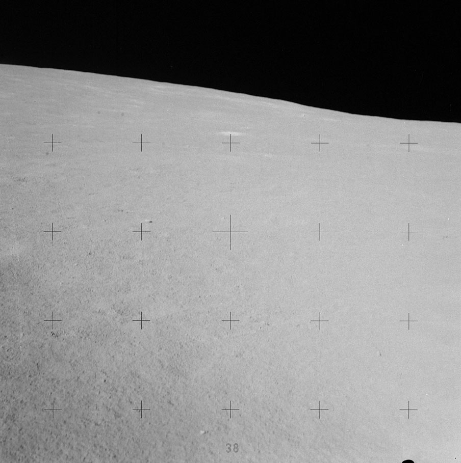 This picture was taken from the LM during CSM Rev 13 on the last pass over the landing site prior to the descent. A labeled version shows some of the prominent landmarks.Rev 16 Mapping (Metric) Camera Frame 0414 ( 13 Mb )