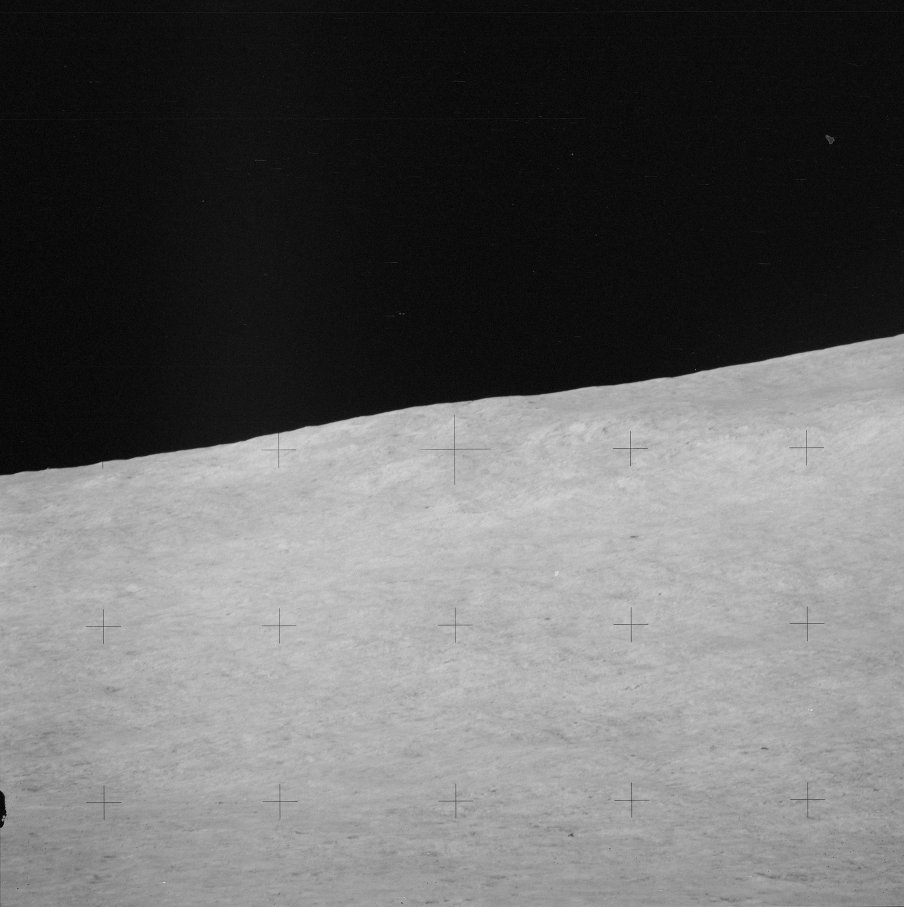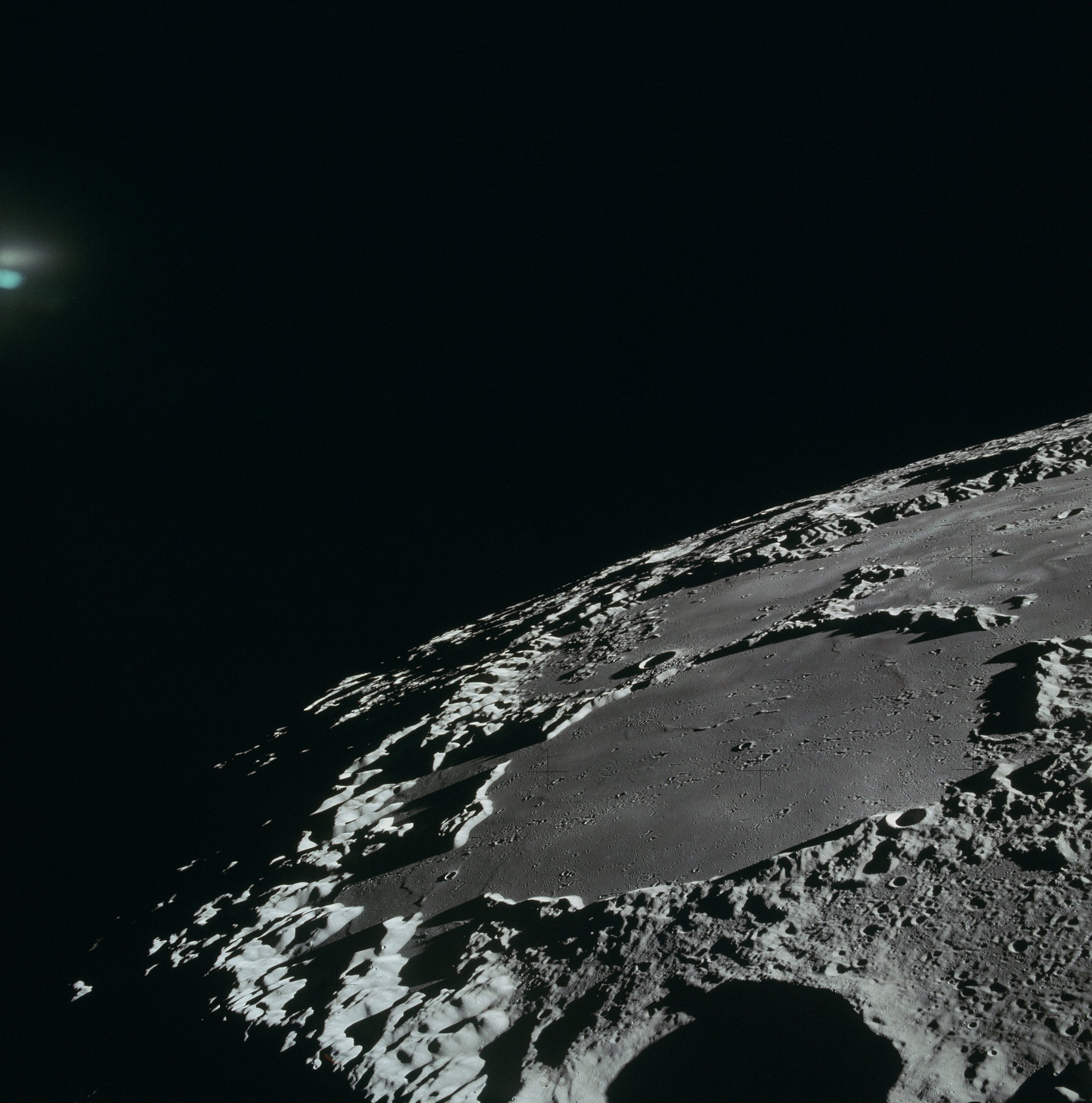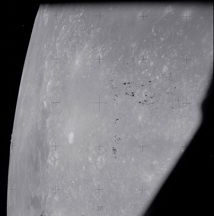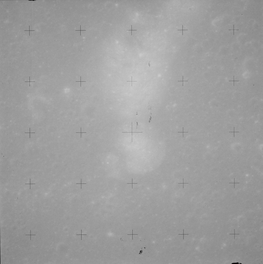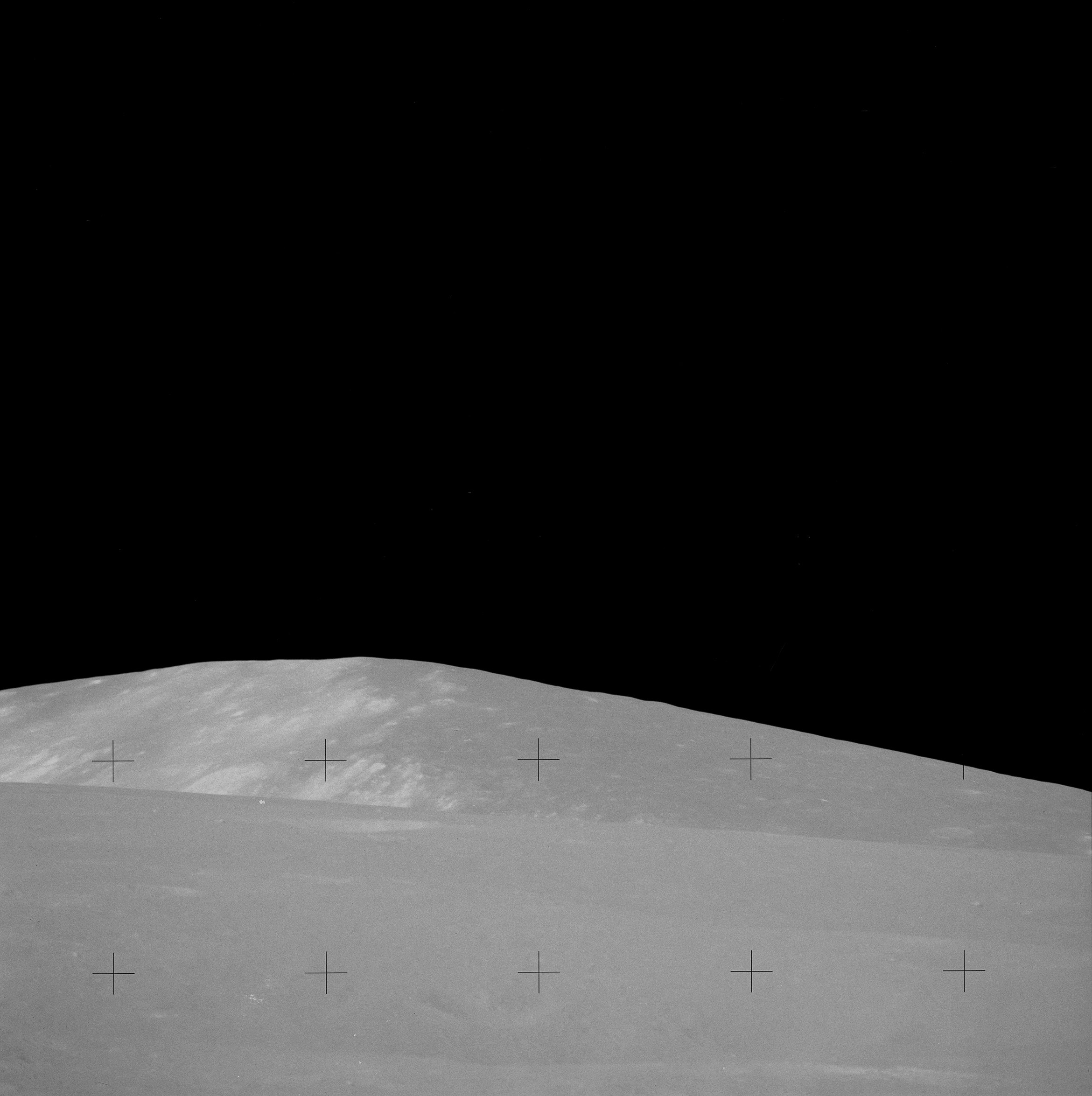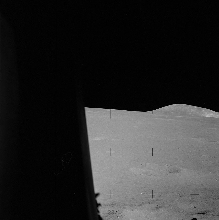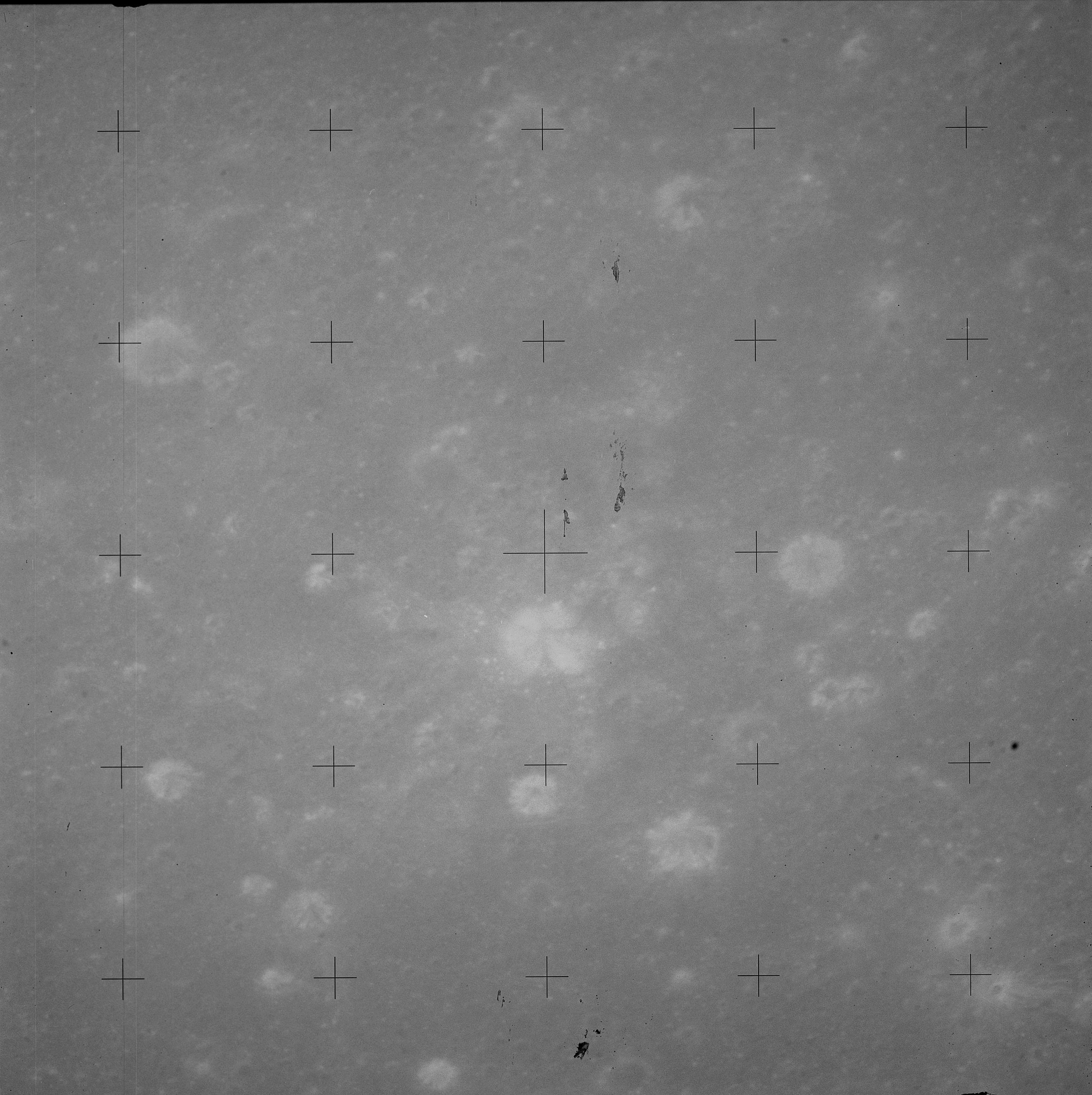 This picture was taken from the LM during CSM Rev 13 on the last pass over the landing site prior to the descent. A labeled version shows some of the prominent landmarks.Rev 16 Mapping (Metric) Camera Frame 0414 ( 13 Mb )