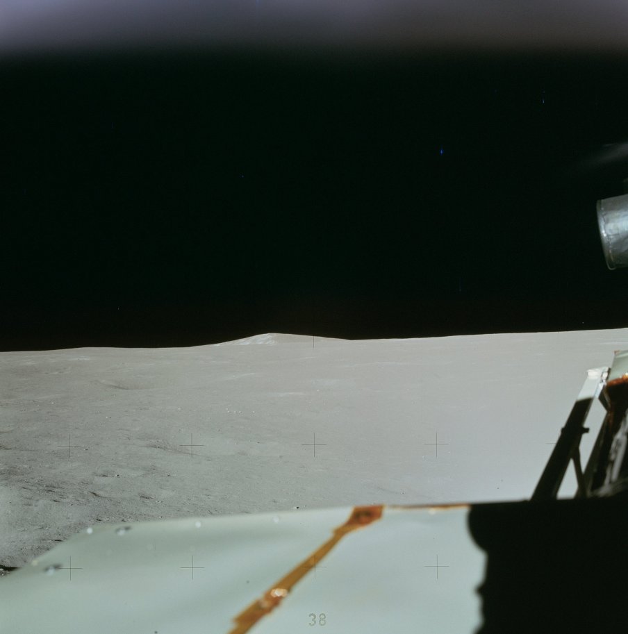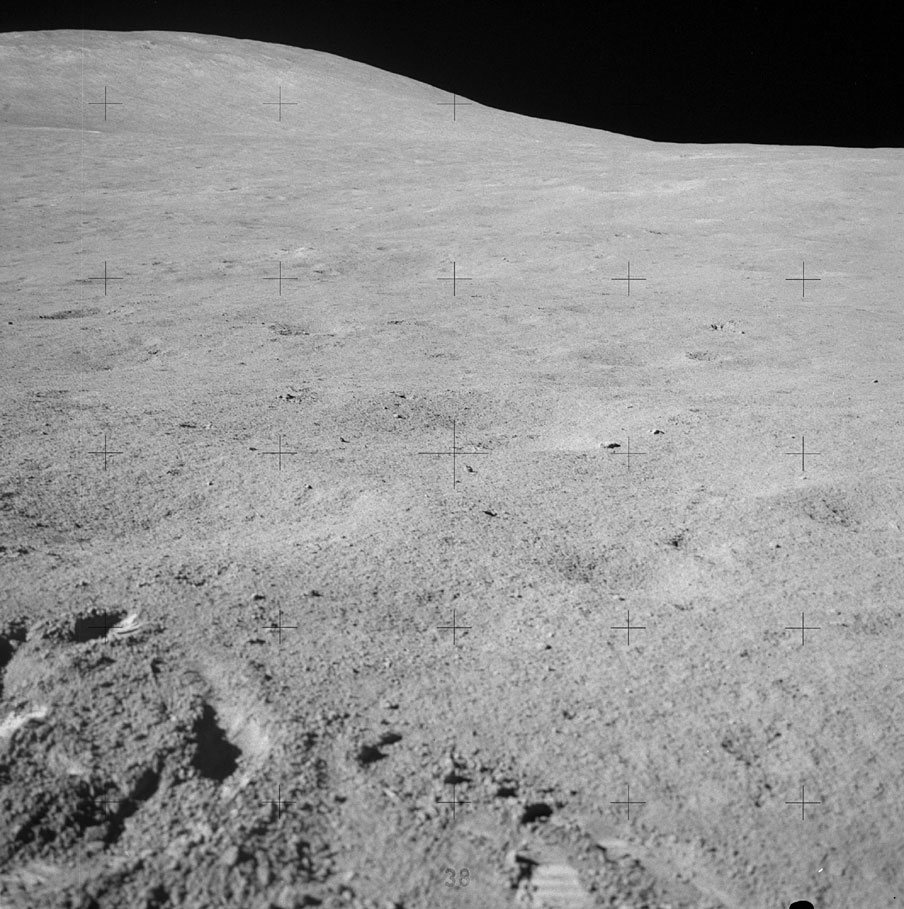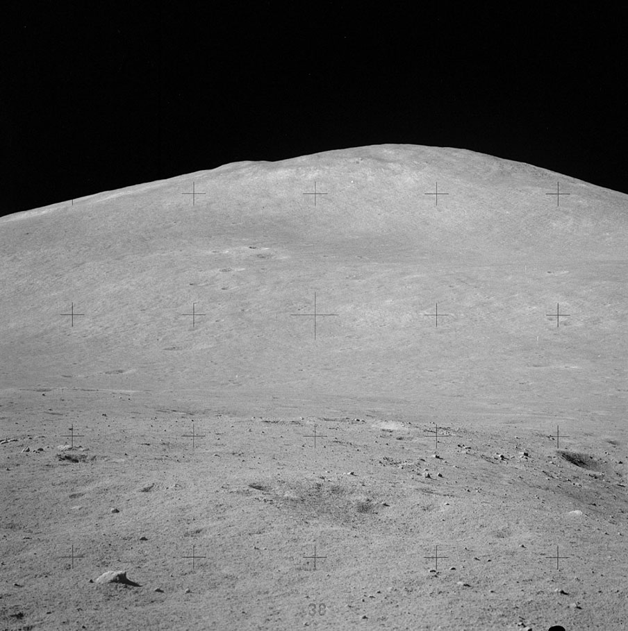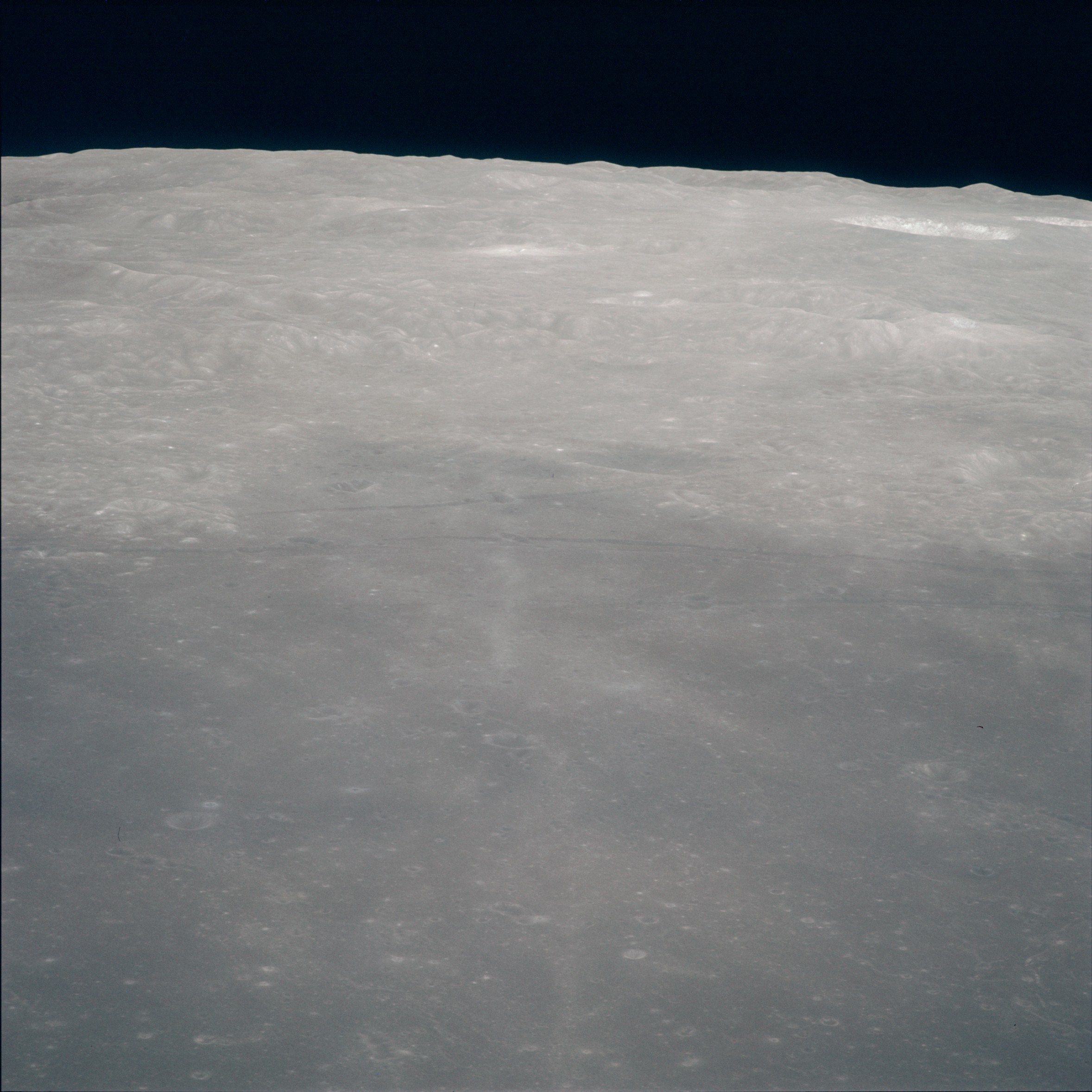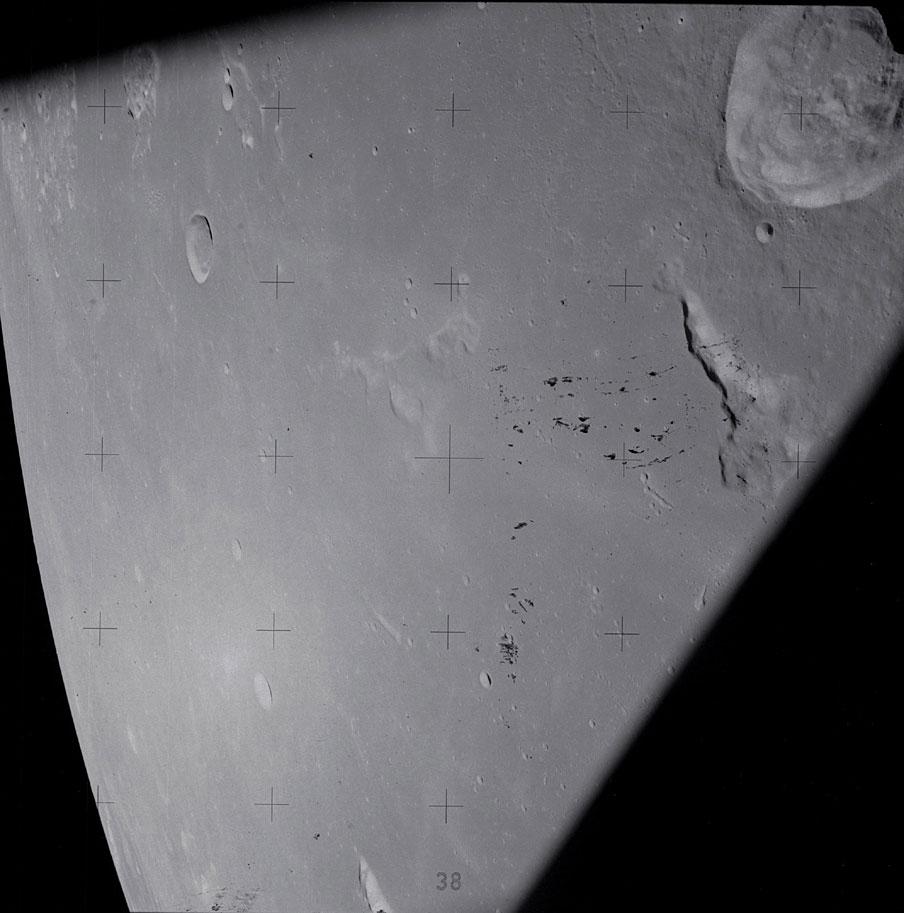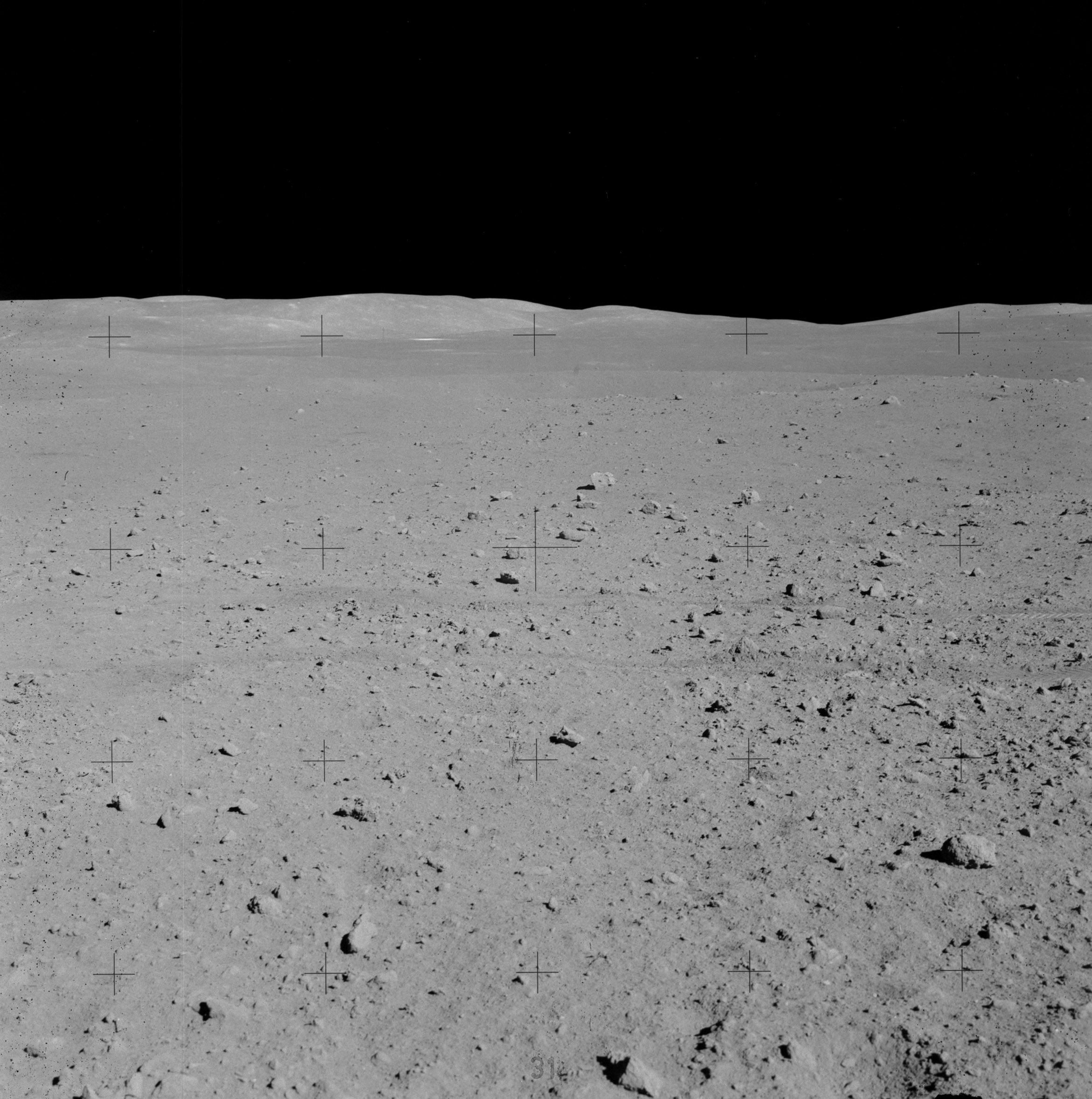 This picture was taken from the LM during CSM Rev 13 on the last pass over the landing site prior to the descent. A labeled version shows some of the prominent landmarks.Rev 16 Mapping (Metric) Camera Frame 0414 ( 13 Mb )