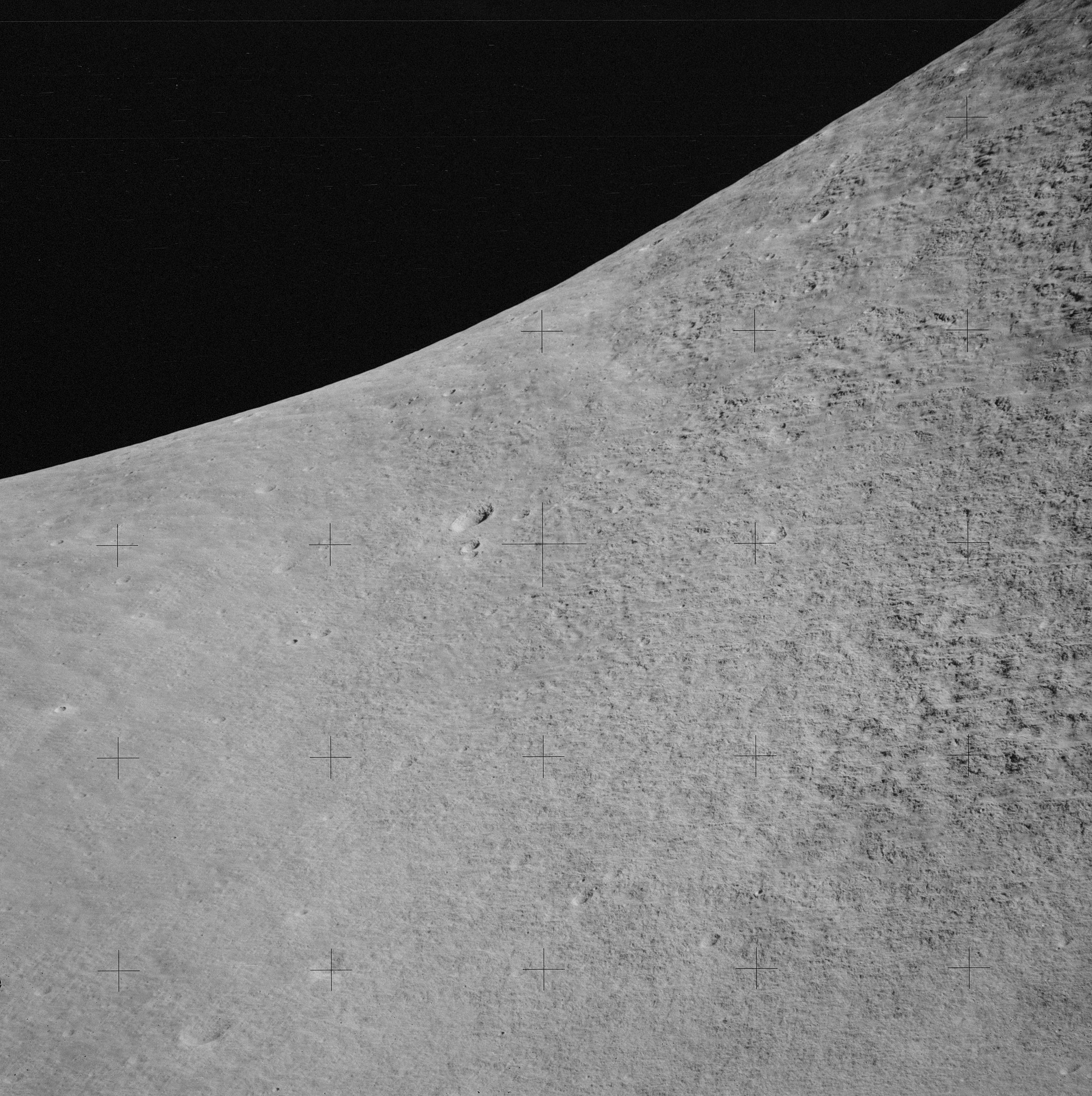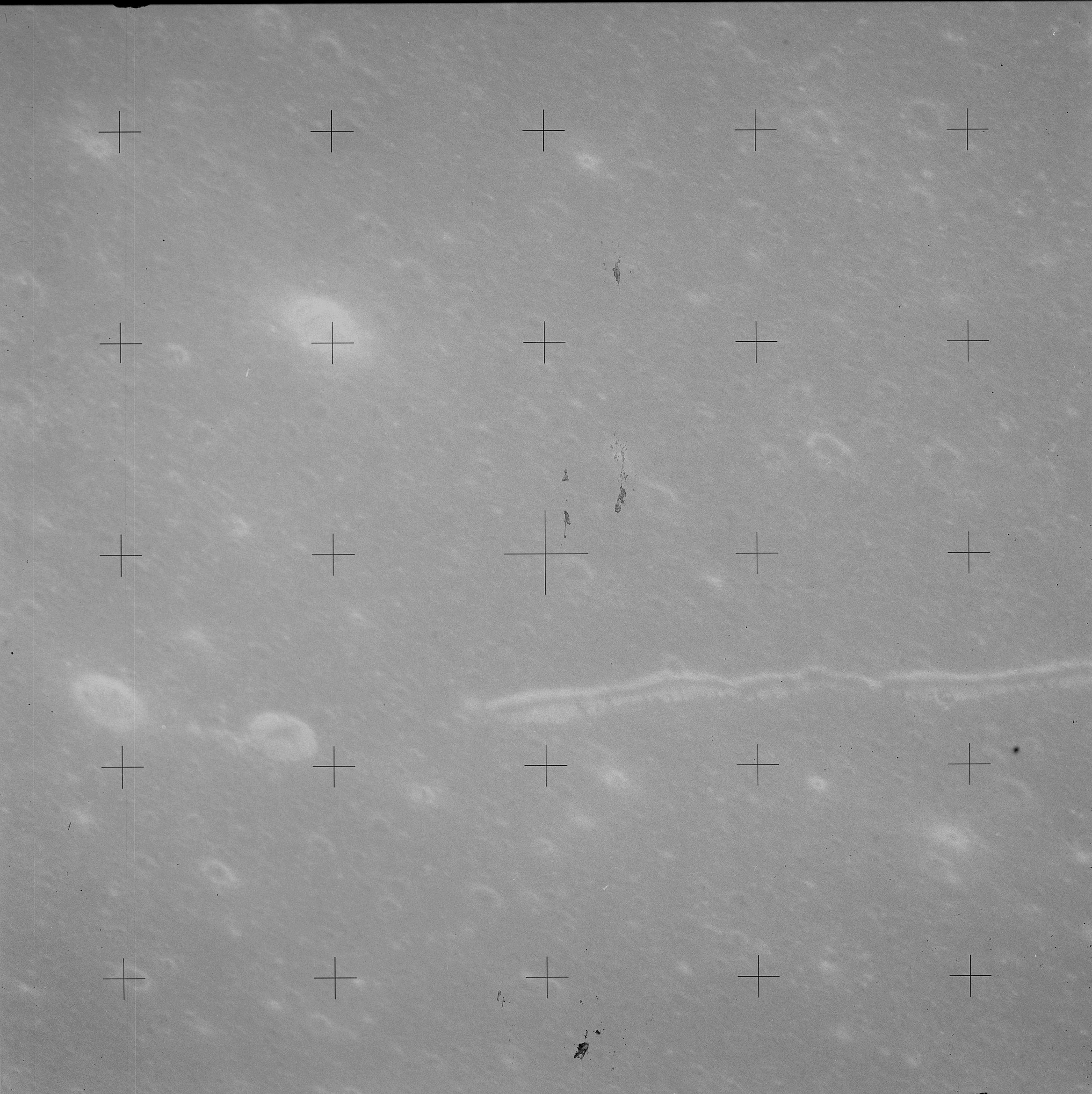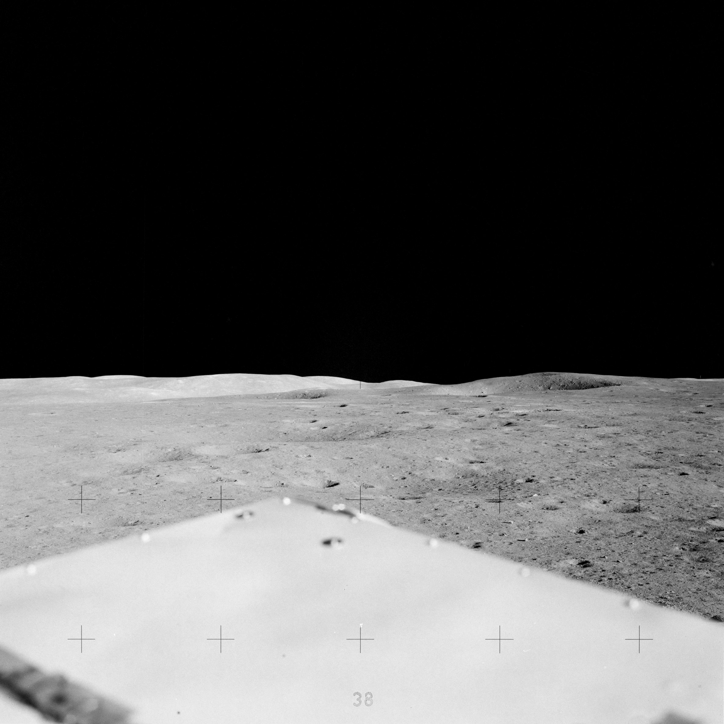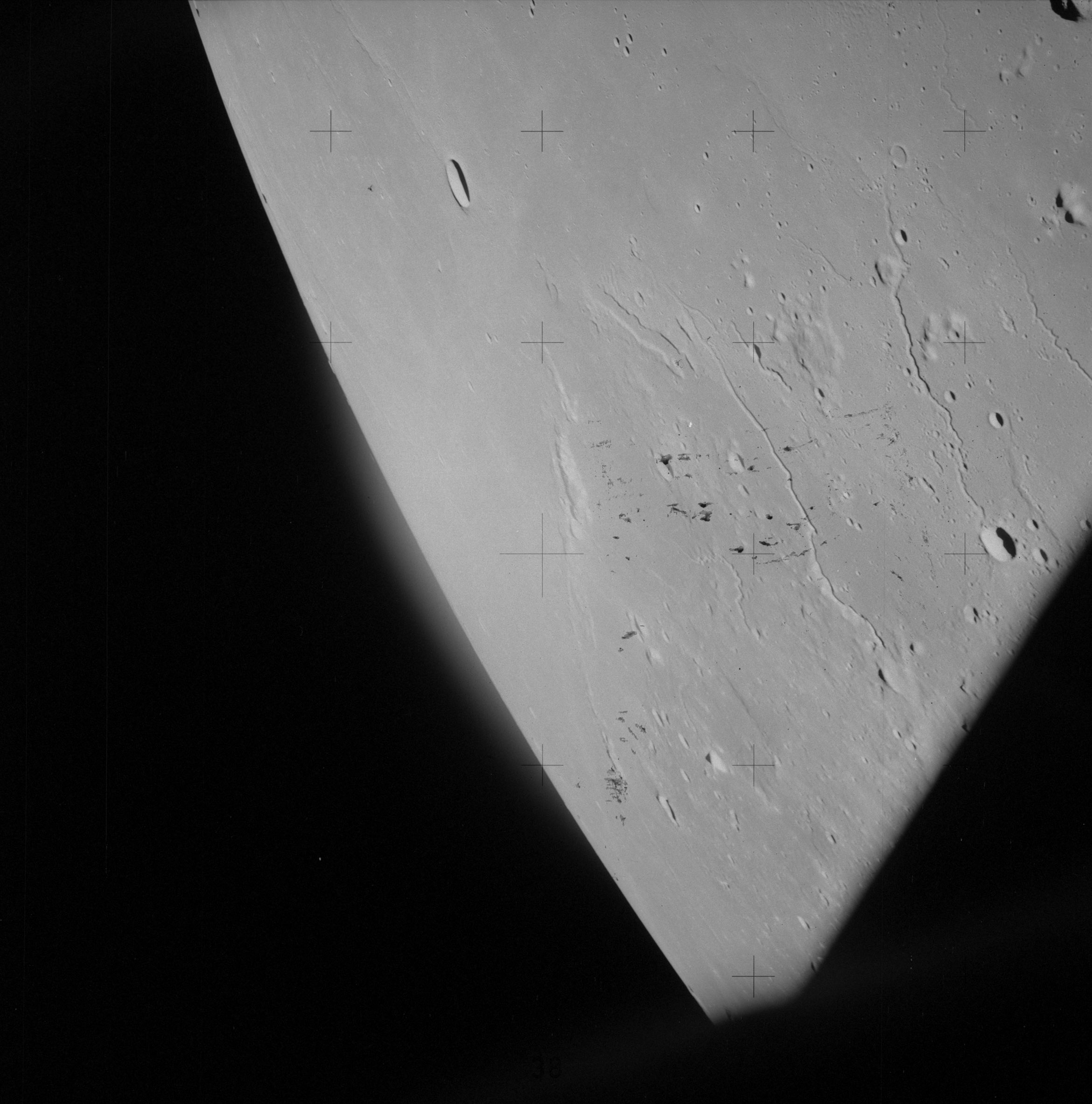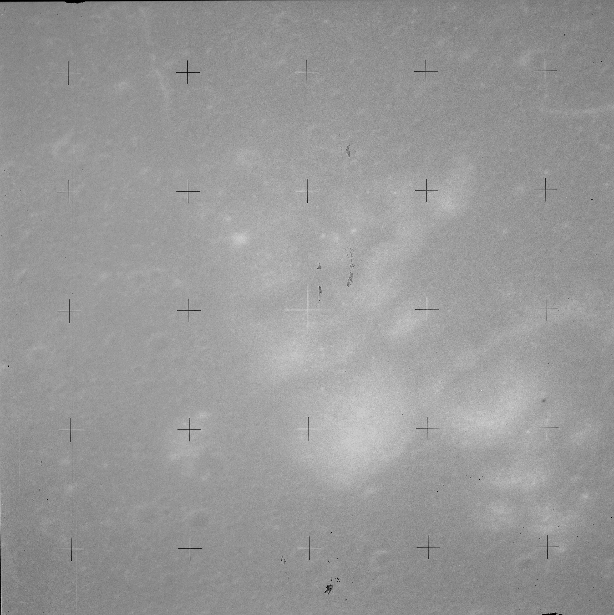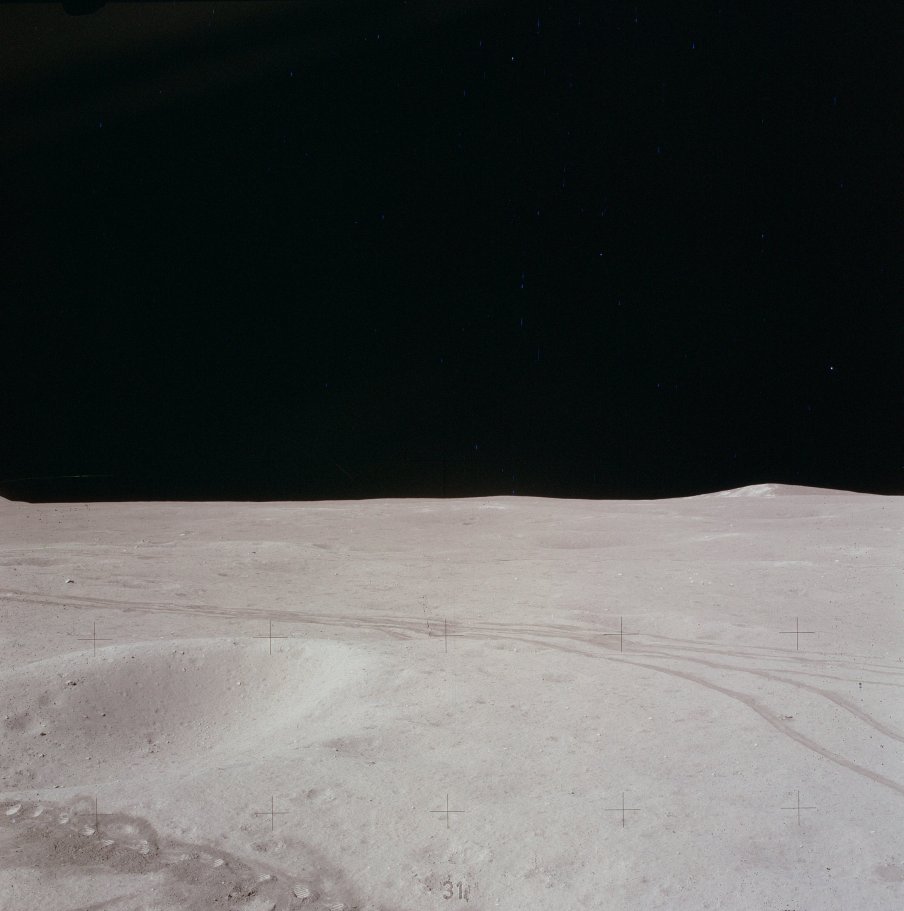 This picture was taken from the LM during CSM Rev 13 on the last pass over the landing site prior to the descent. A labeled version shows some of the prominent landmarks.Rev 16 Mapping (Metric) Camera Frame 0414 ( 13 Mb )