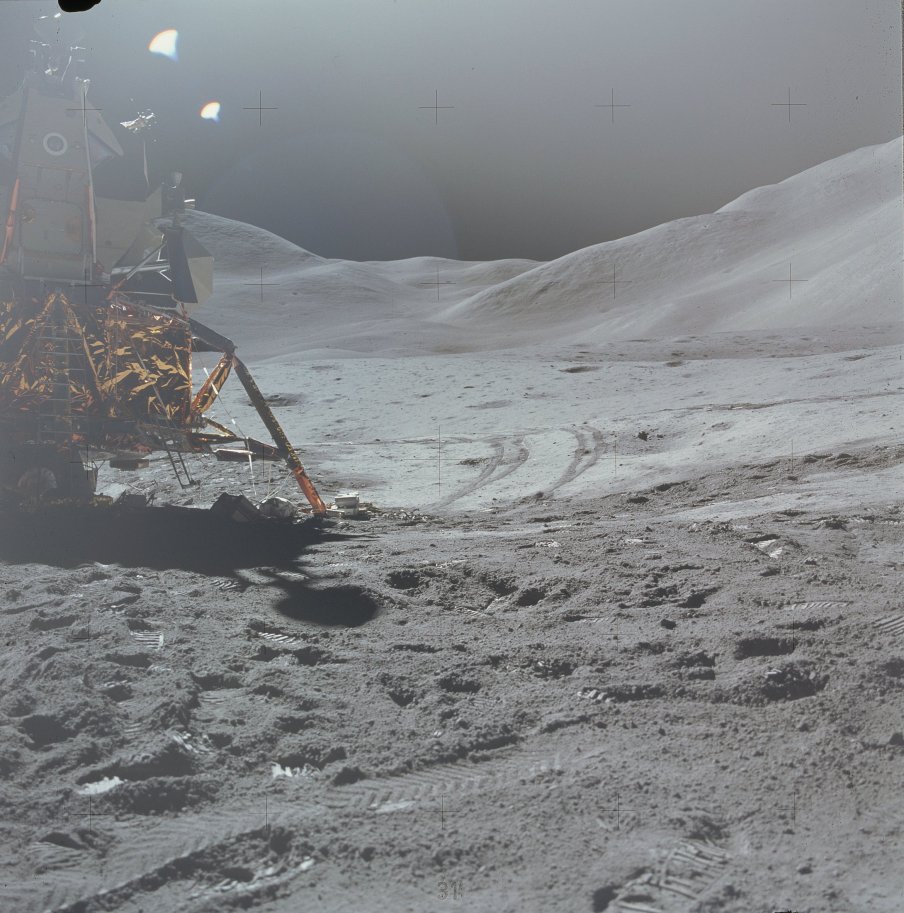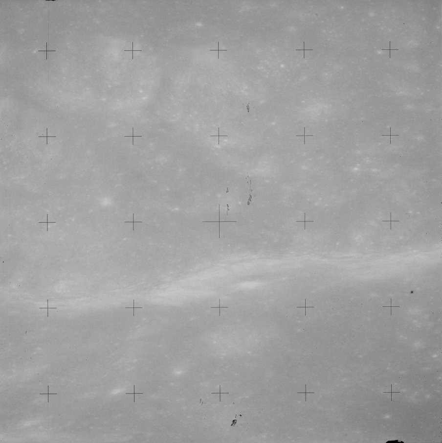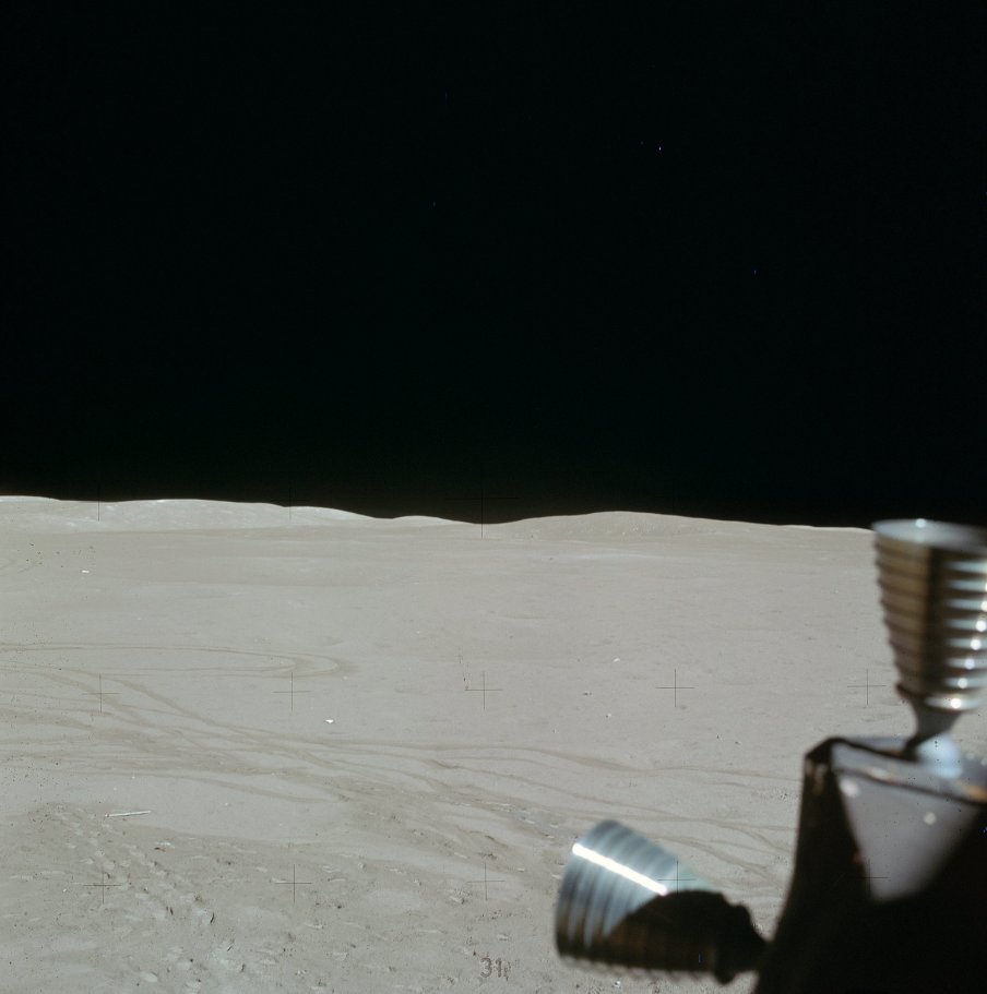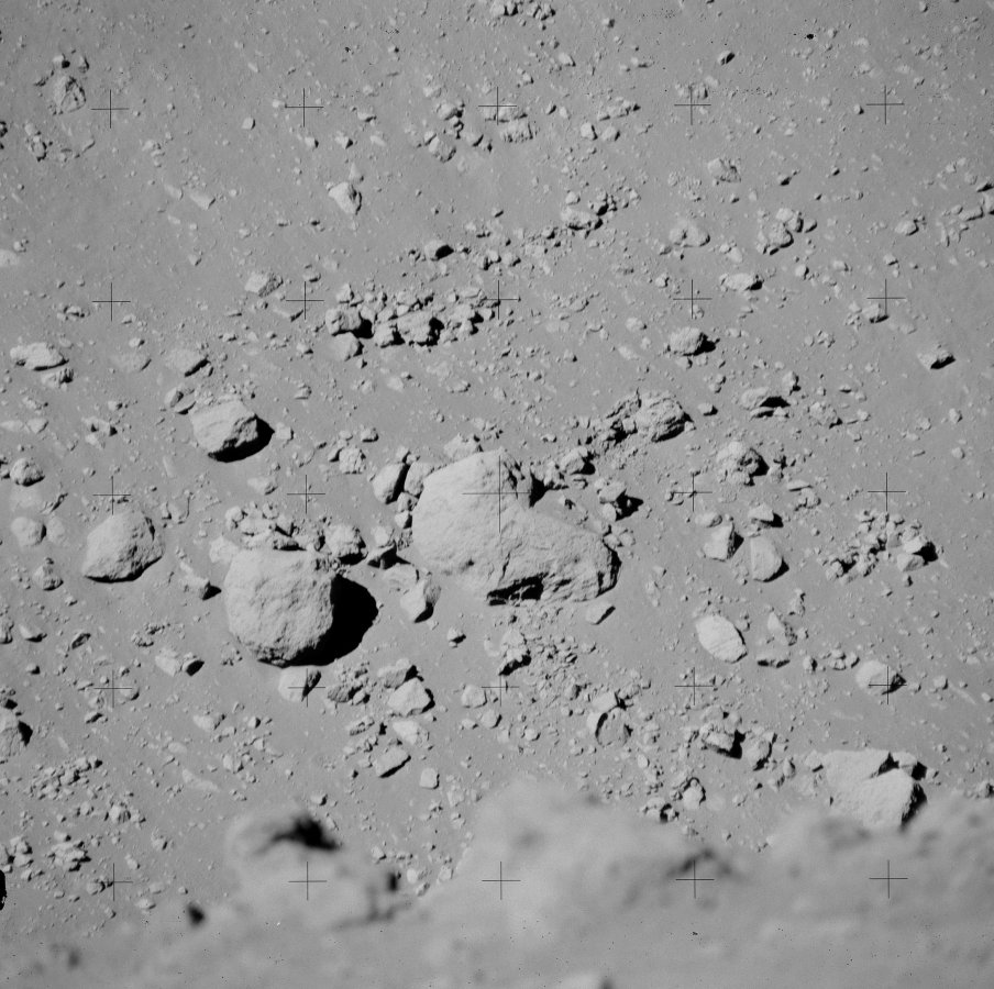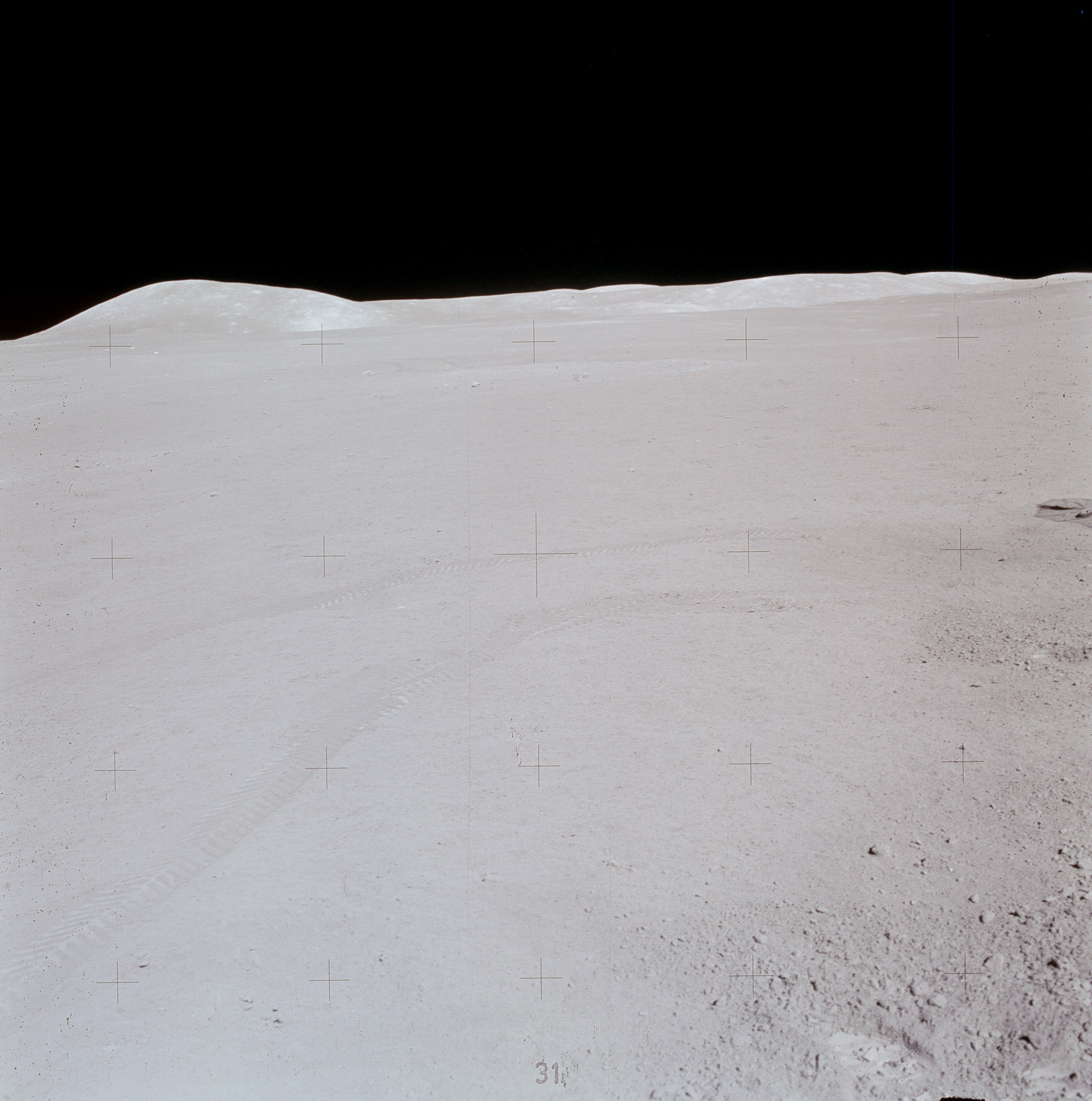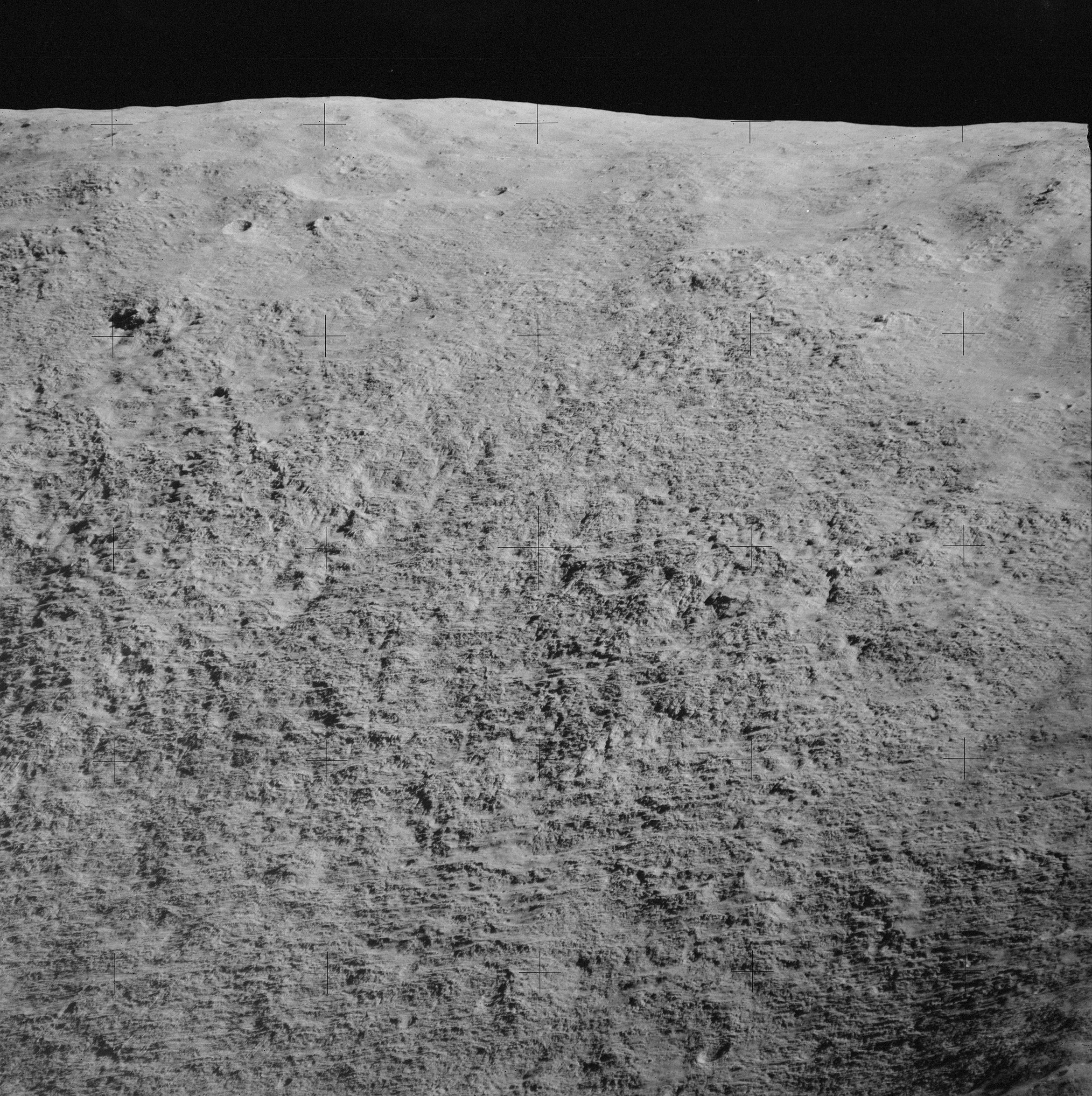 This picture was taken from the LM during CSM Rev 13 on the last pass over the landing site prior to the descent. A labeled version shows some of the prominent landmarks.Rev 16 Mapping (Metric) Camera Frame 0414 ( 13 Mb )