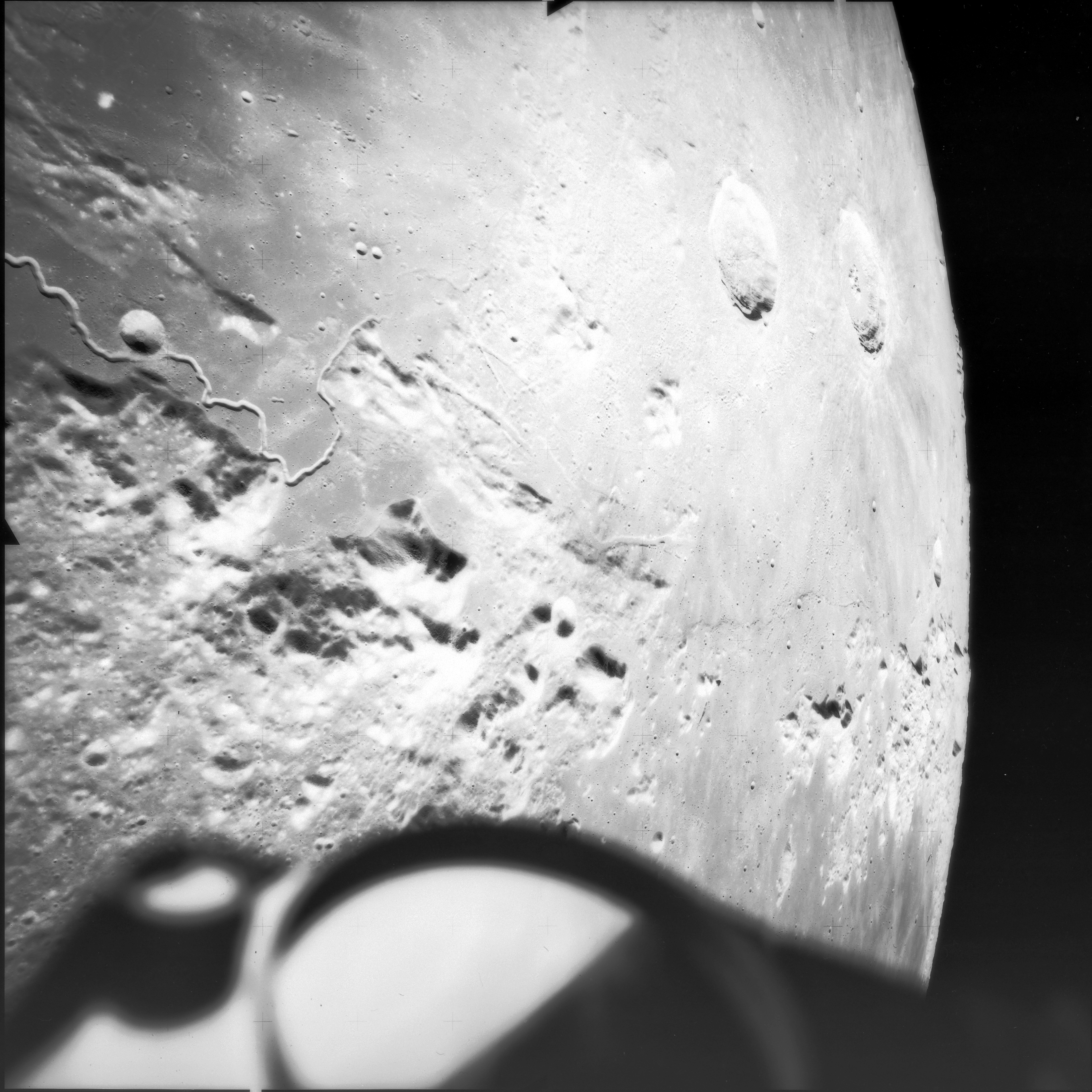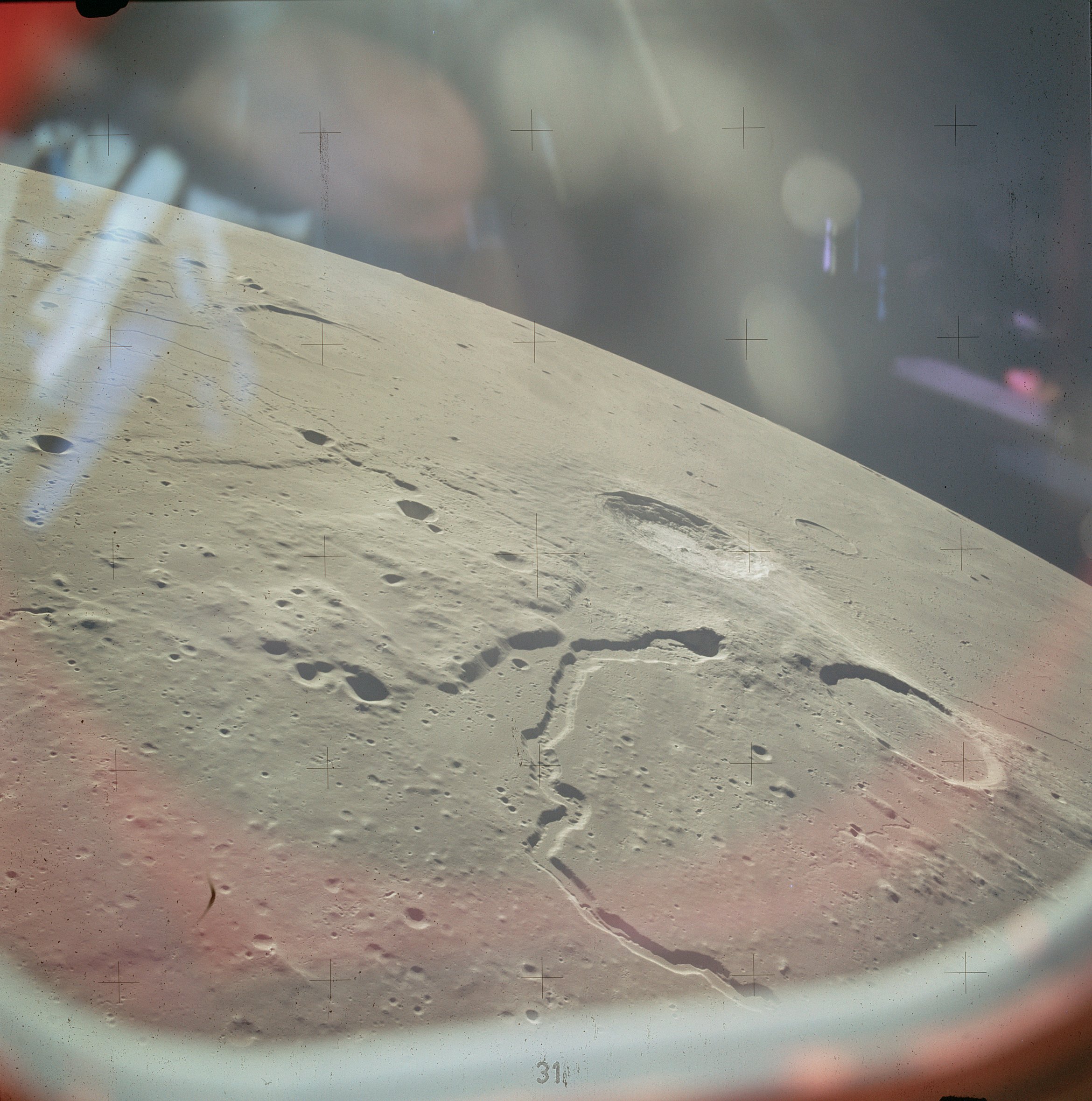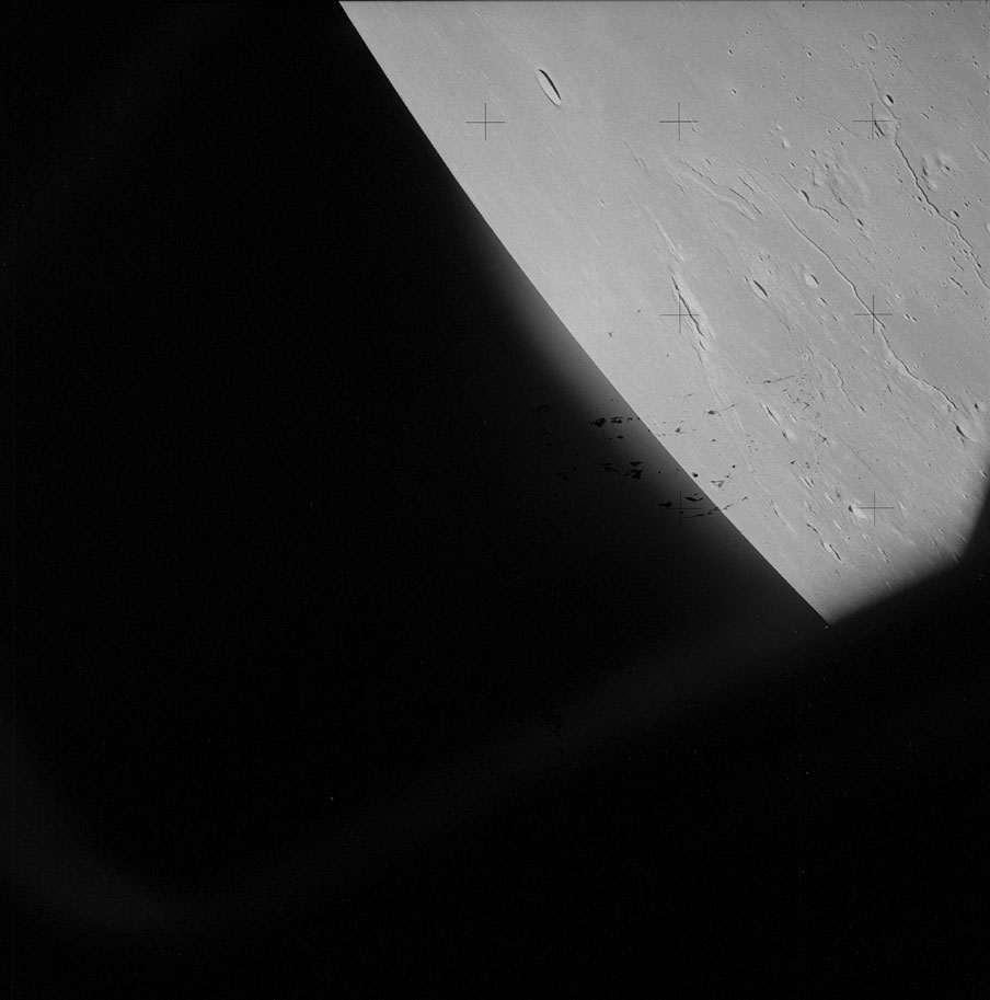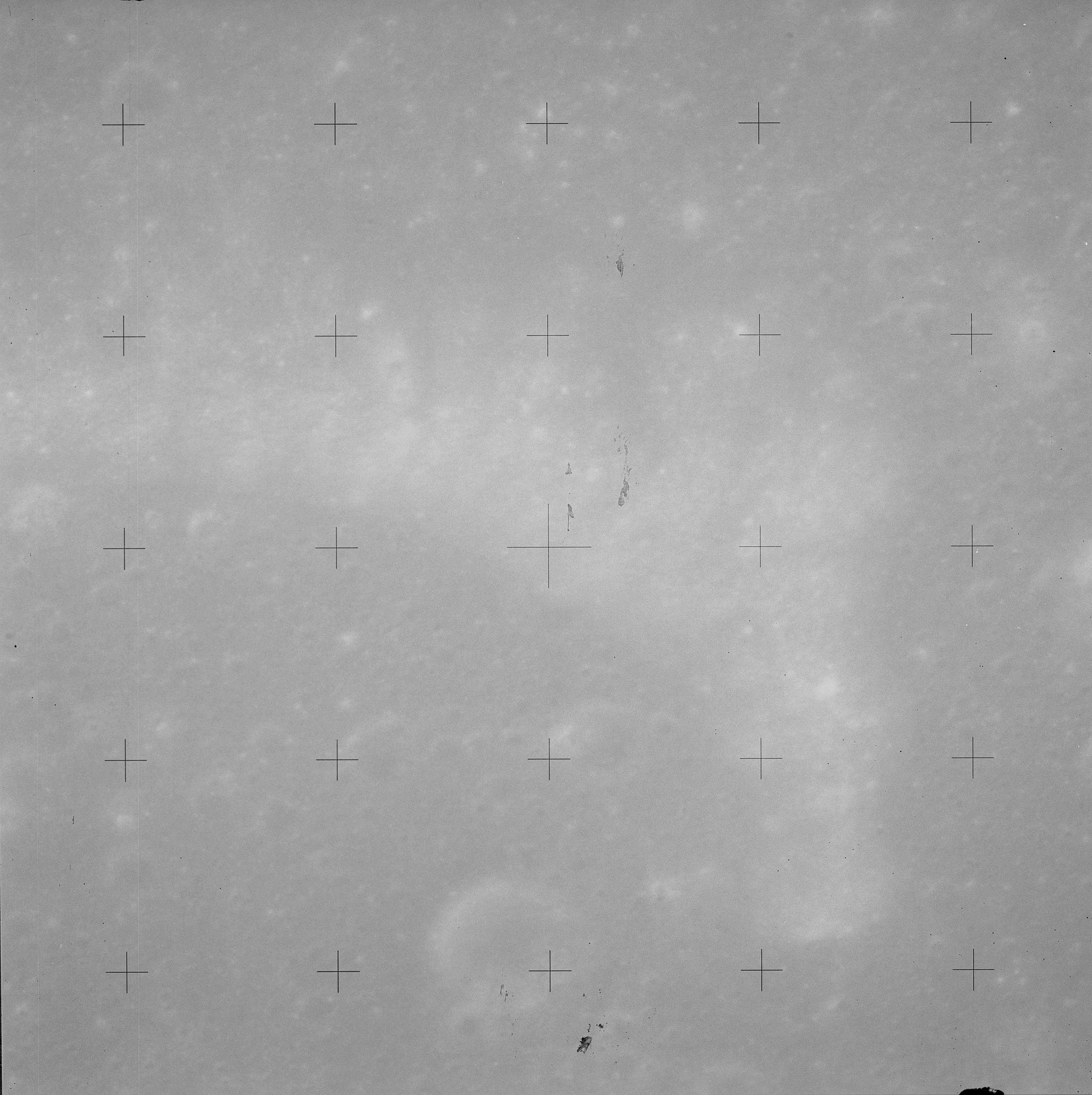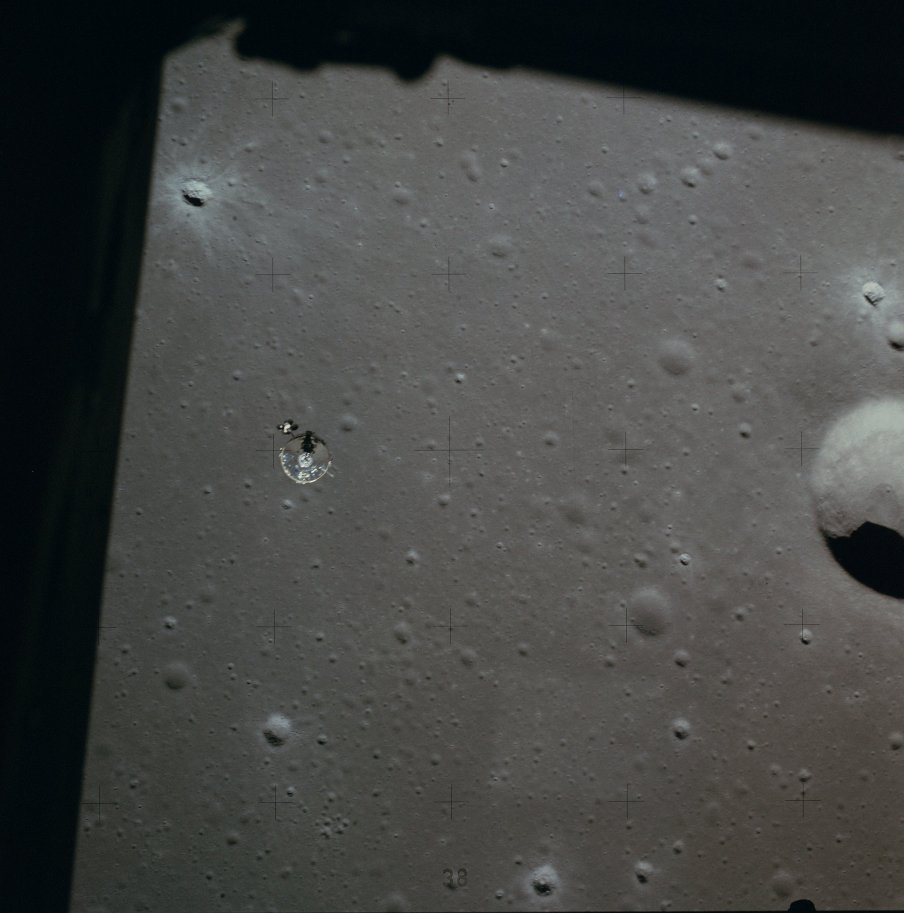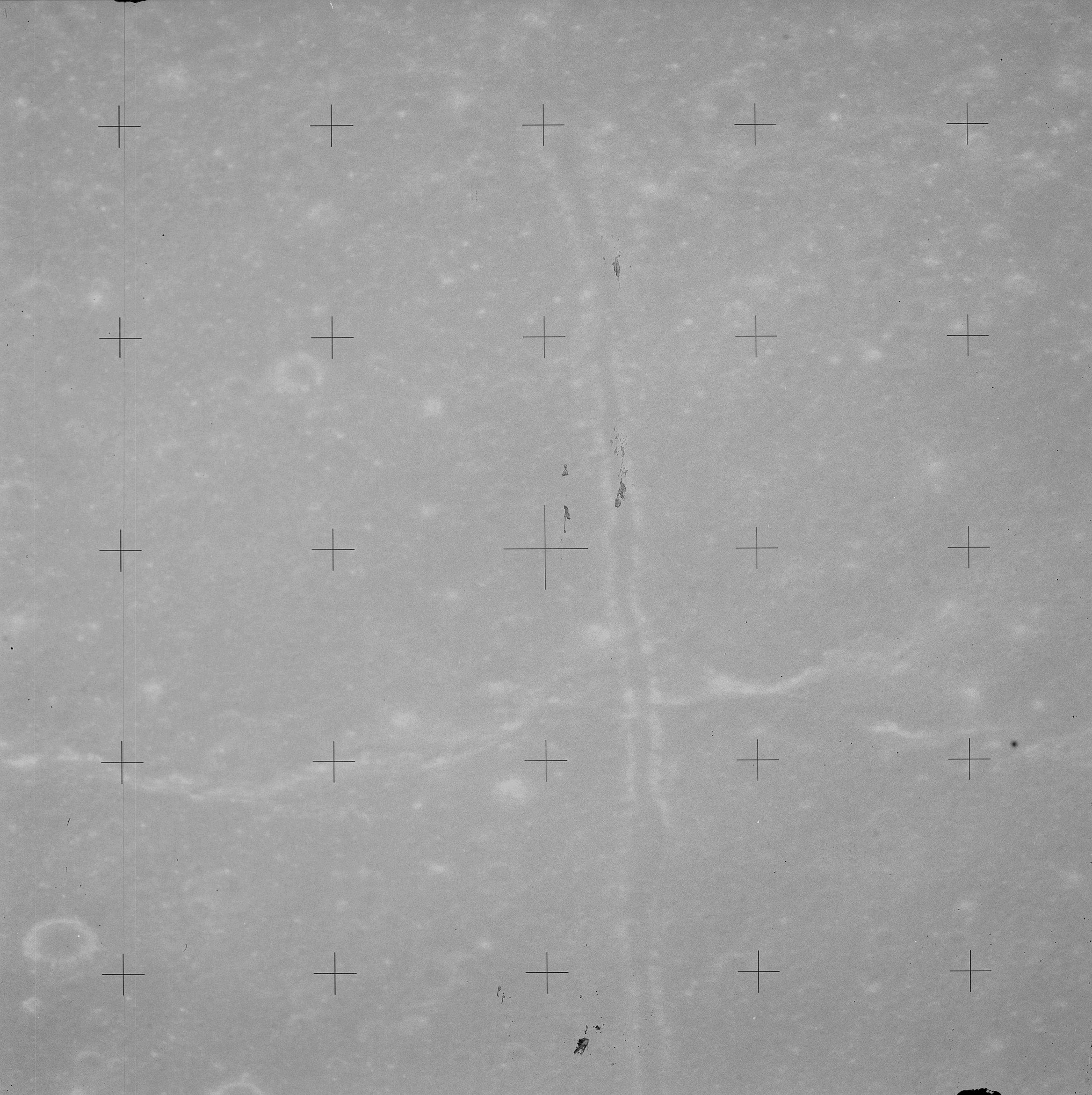 This picture was taken from the LM during CSM Rev 13 on the last pass over the landing site prior to the descent. A labeled version shows some of the prominent landmarks.Rev 16 Mapping (Metric) Camera Frame 0414 ( 13 Mb )