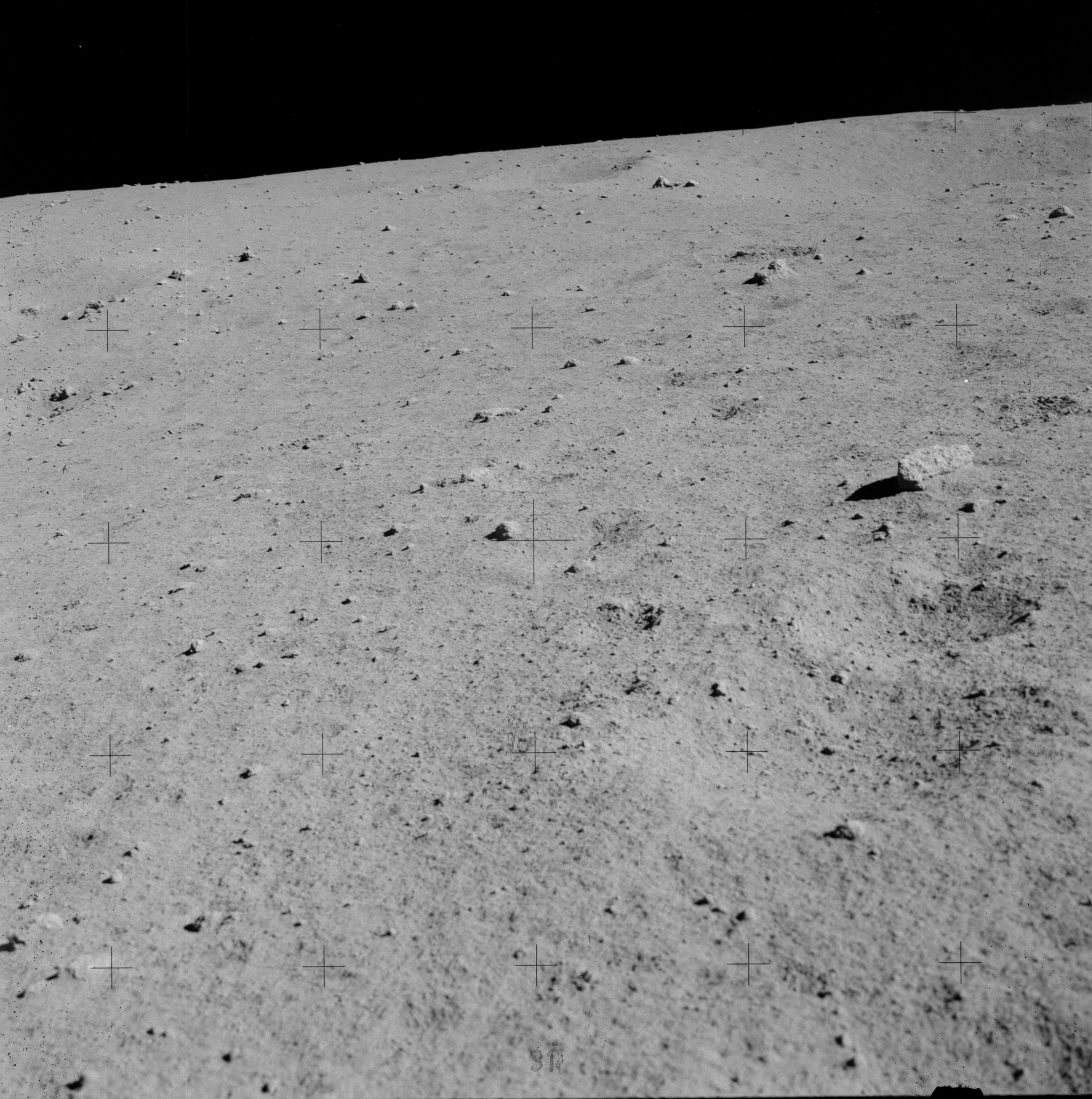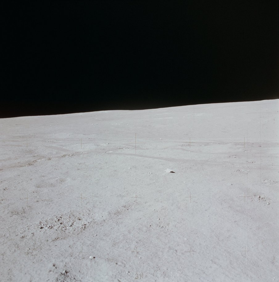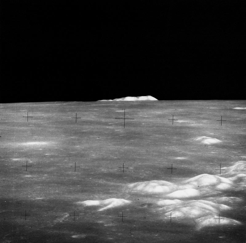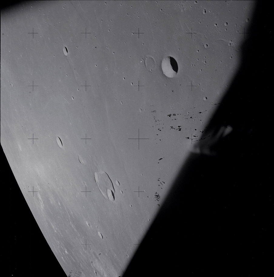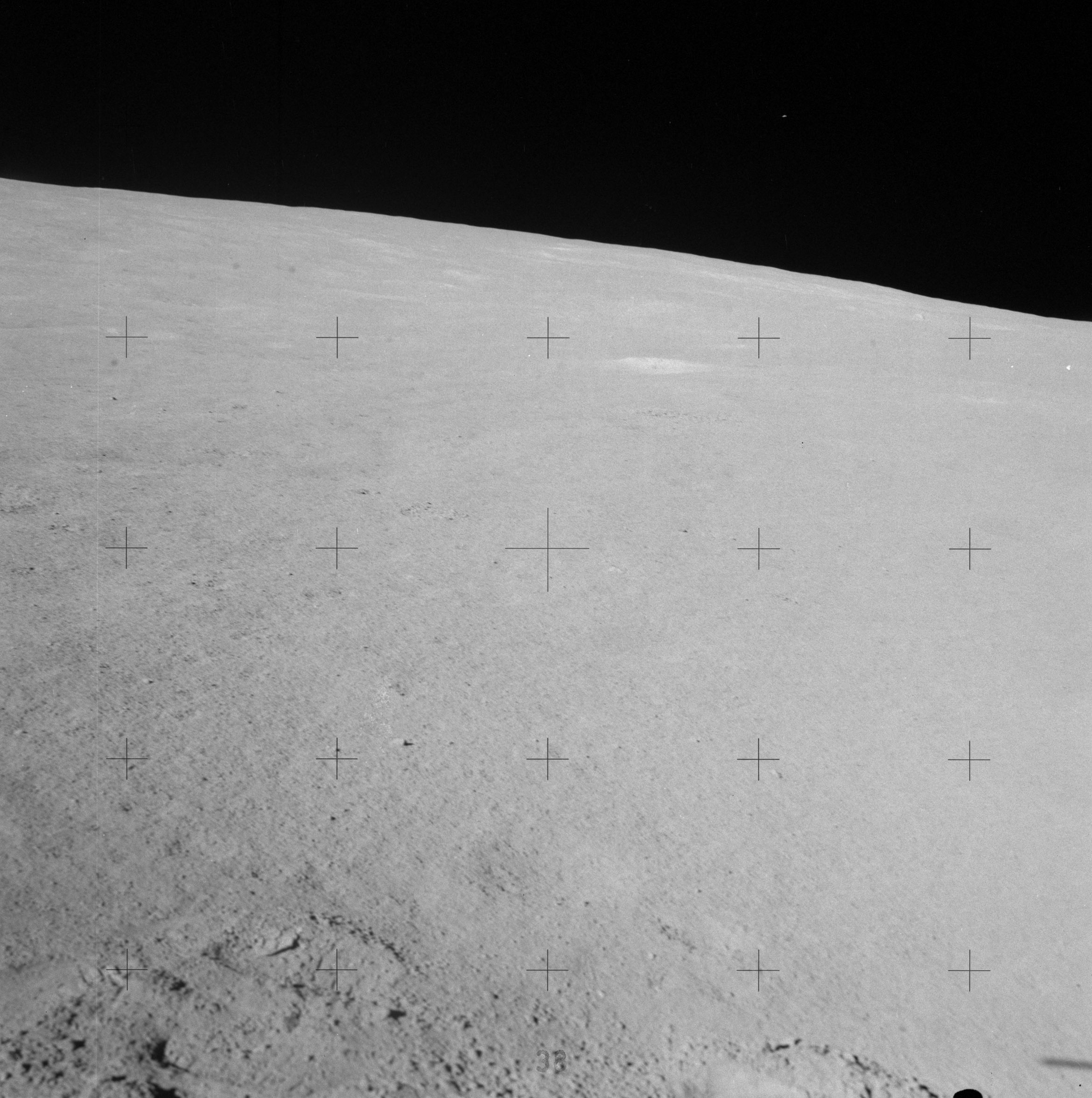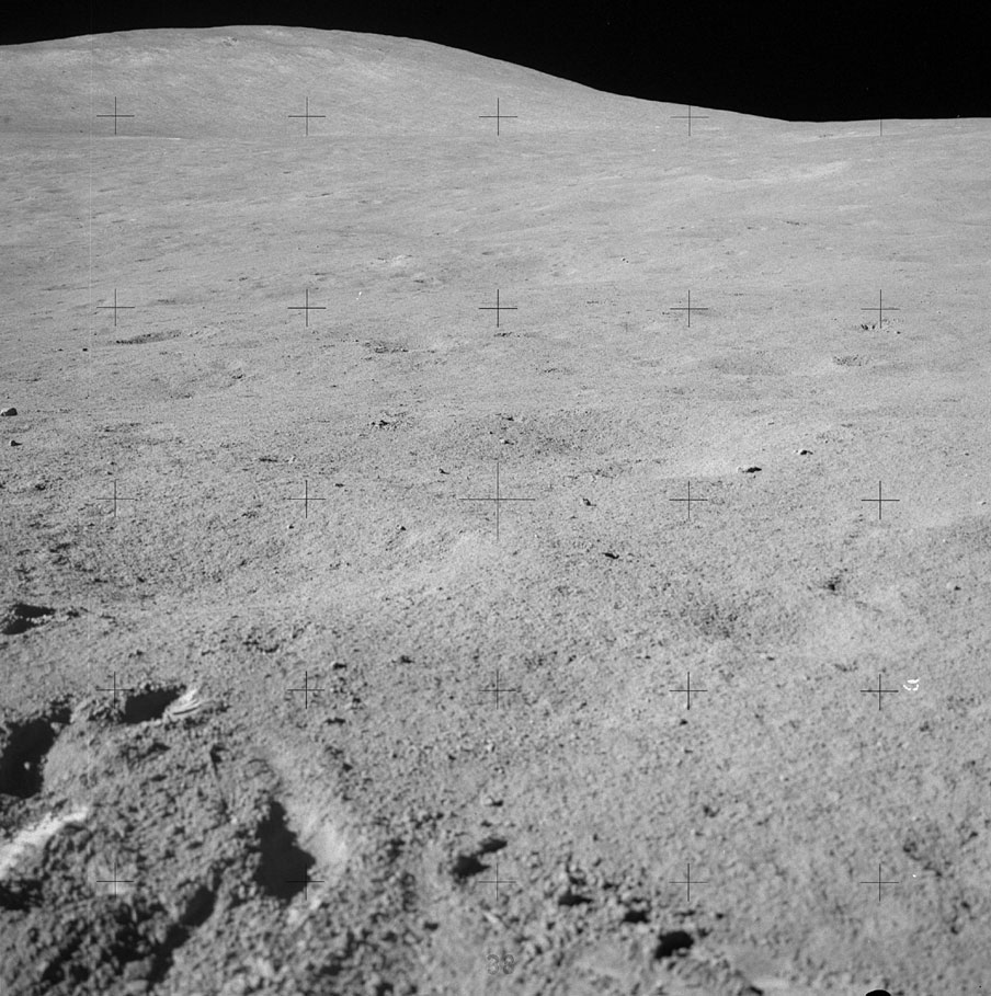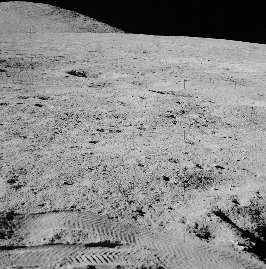 This picture was taken from the LM during CSM Rev 13 on the last pass over the landing site prior to the descent. A labeled version shows some of the prominent landmarks.Rev 16 Mapping (Metric) Camera Frame 0414 ( 13 Mb )