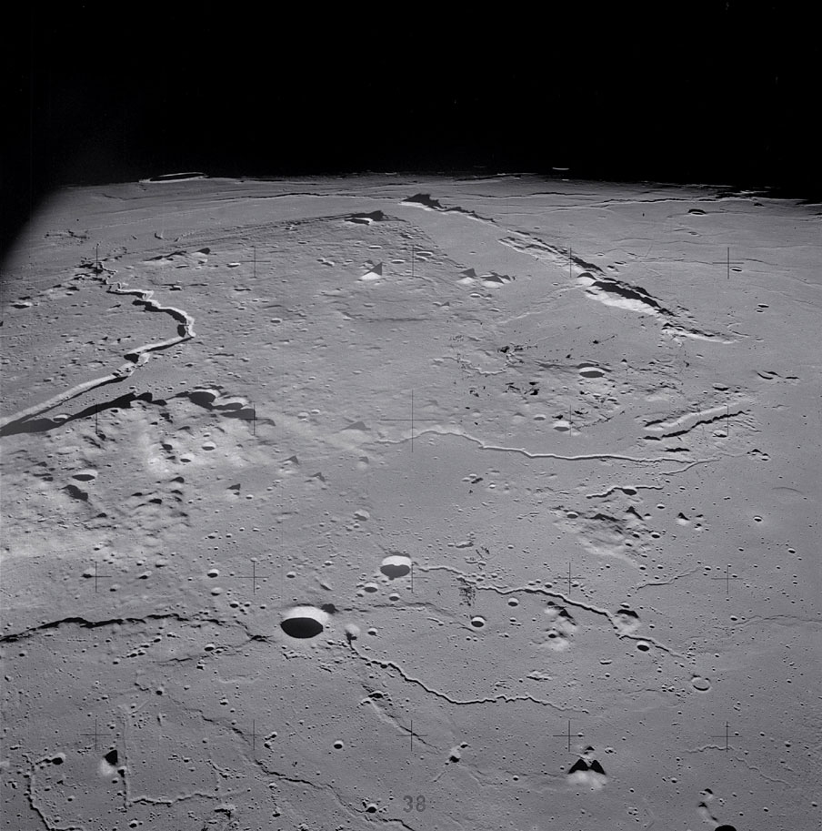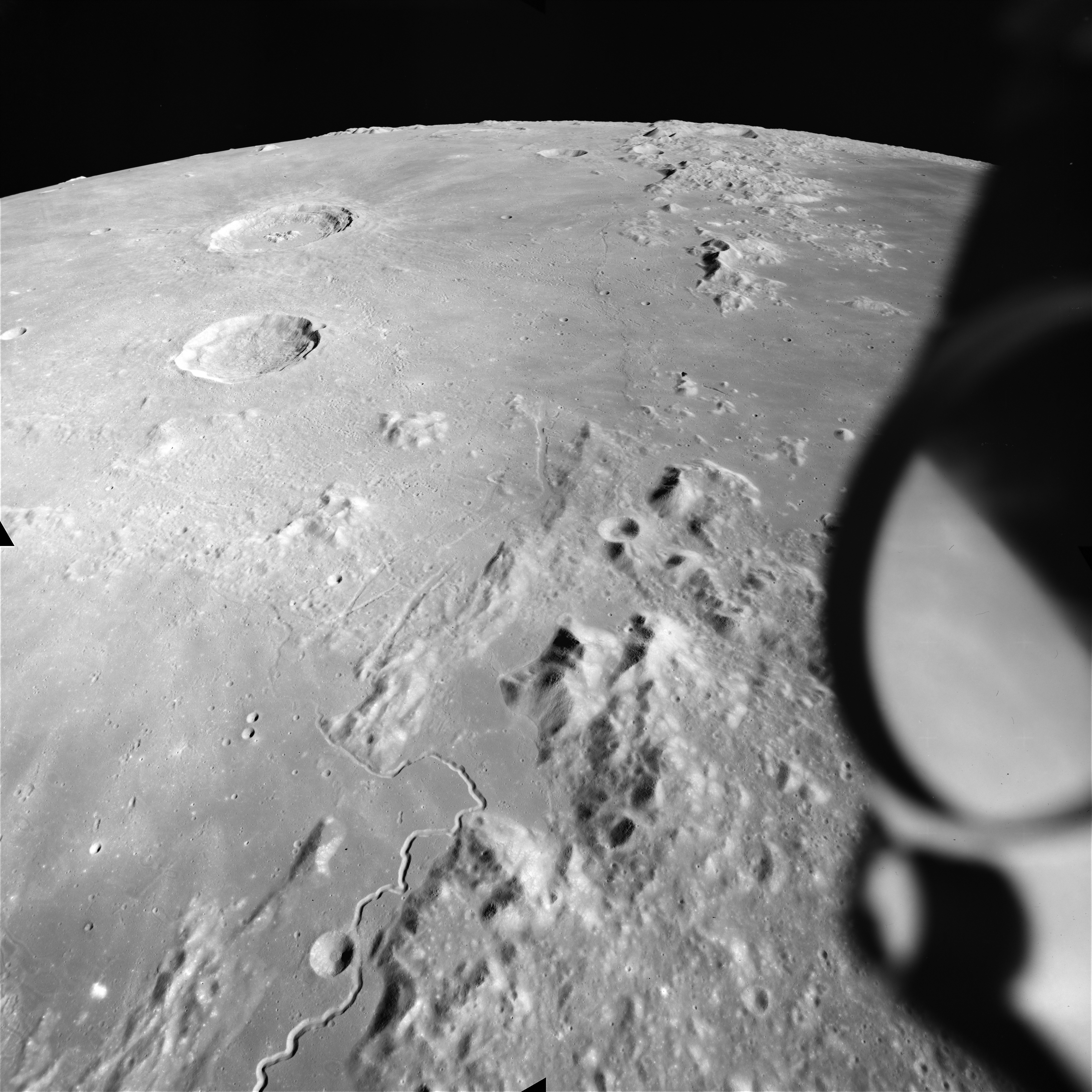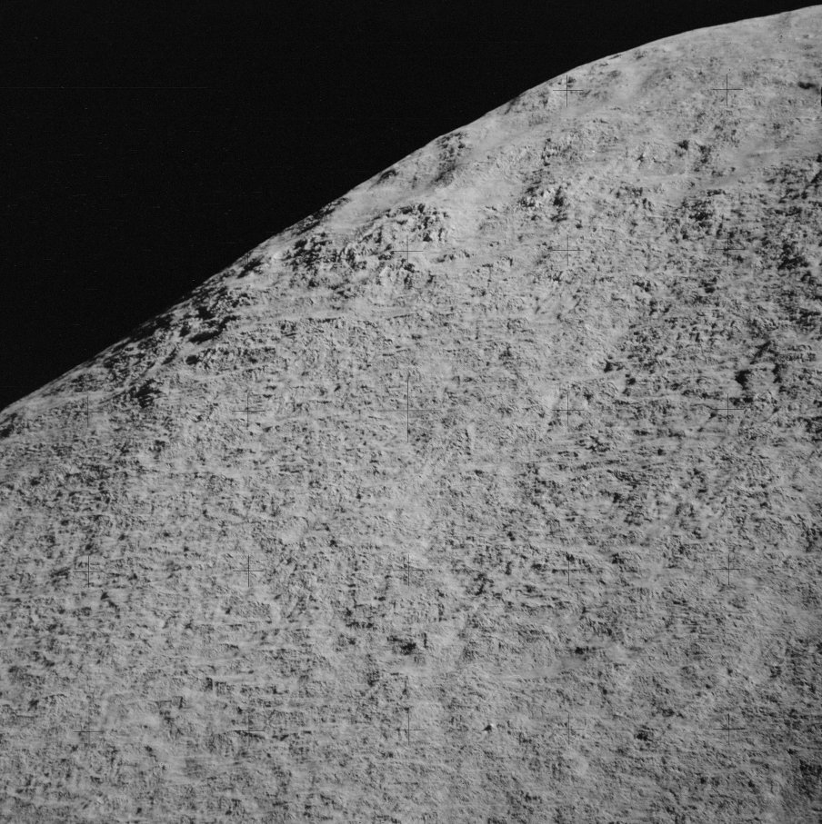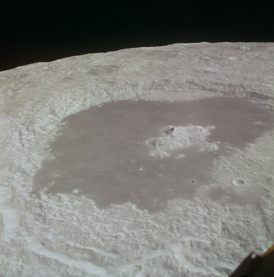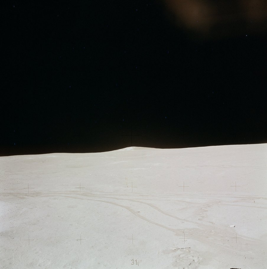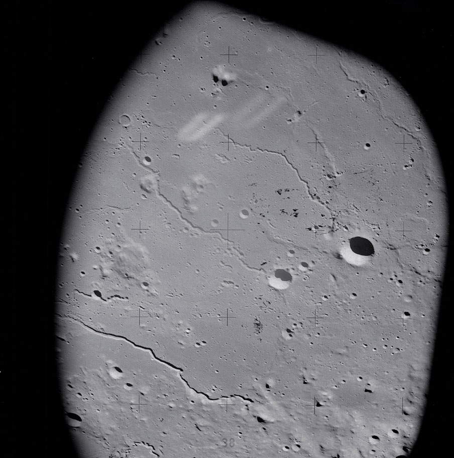 This picture was taken from the LM during CSM Rev 13 on the last pass over the landing site prior to the descent. A labeled version shows some of the prominent landmarks.Rev 16 Mapping (Metric) Camera Frame 0414 ( 13 Mb )