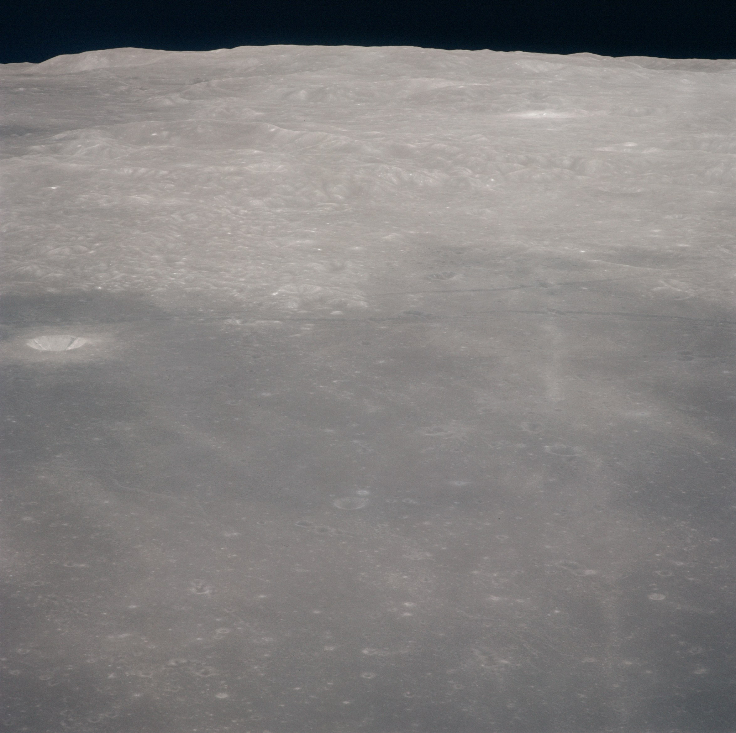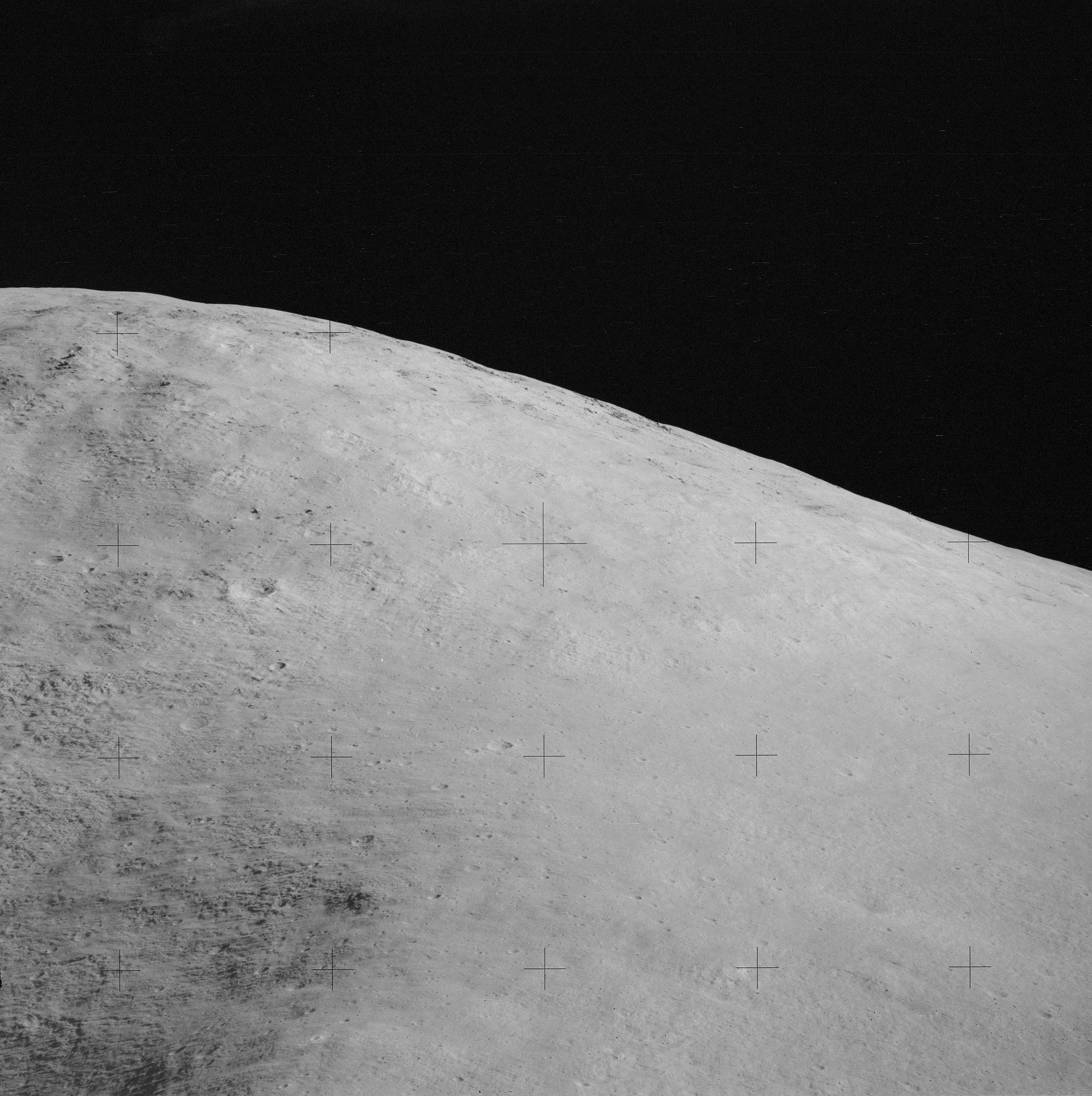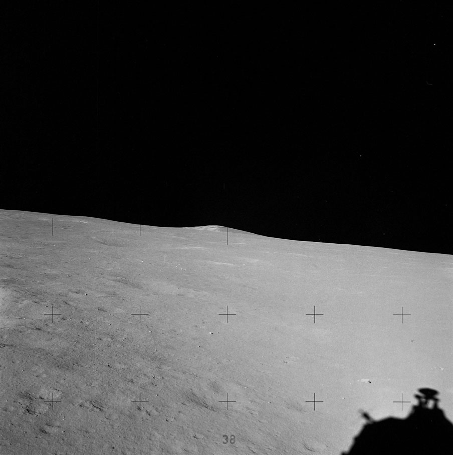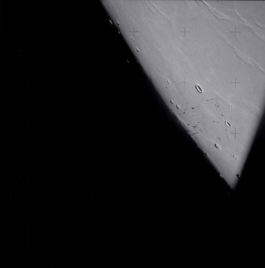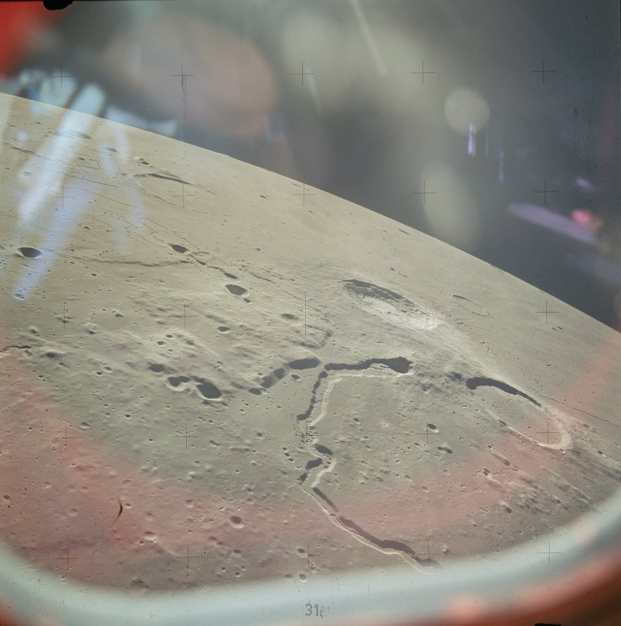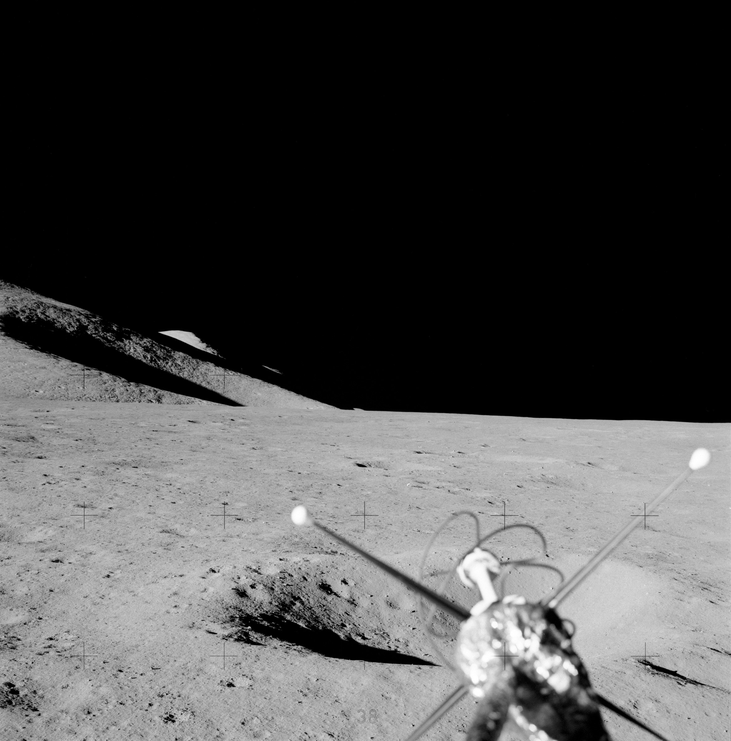 This picture was taken from the LM during CSM Rev 13 on the last pass over the landing site prior to the descent. A labeled version shows some of the prominent landmarks.Rev 16 Mapping (Metric) Camera Frame 0414 ( 13 Mb )