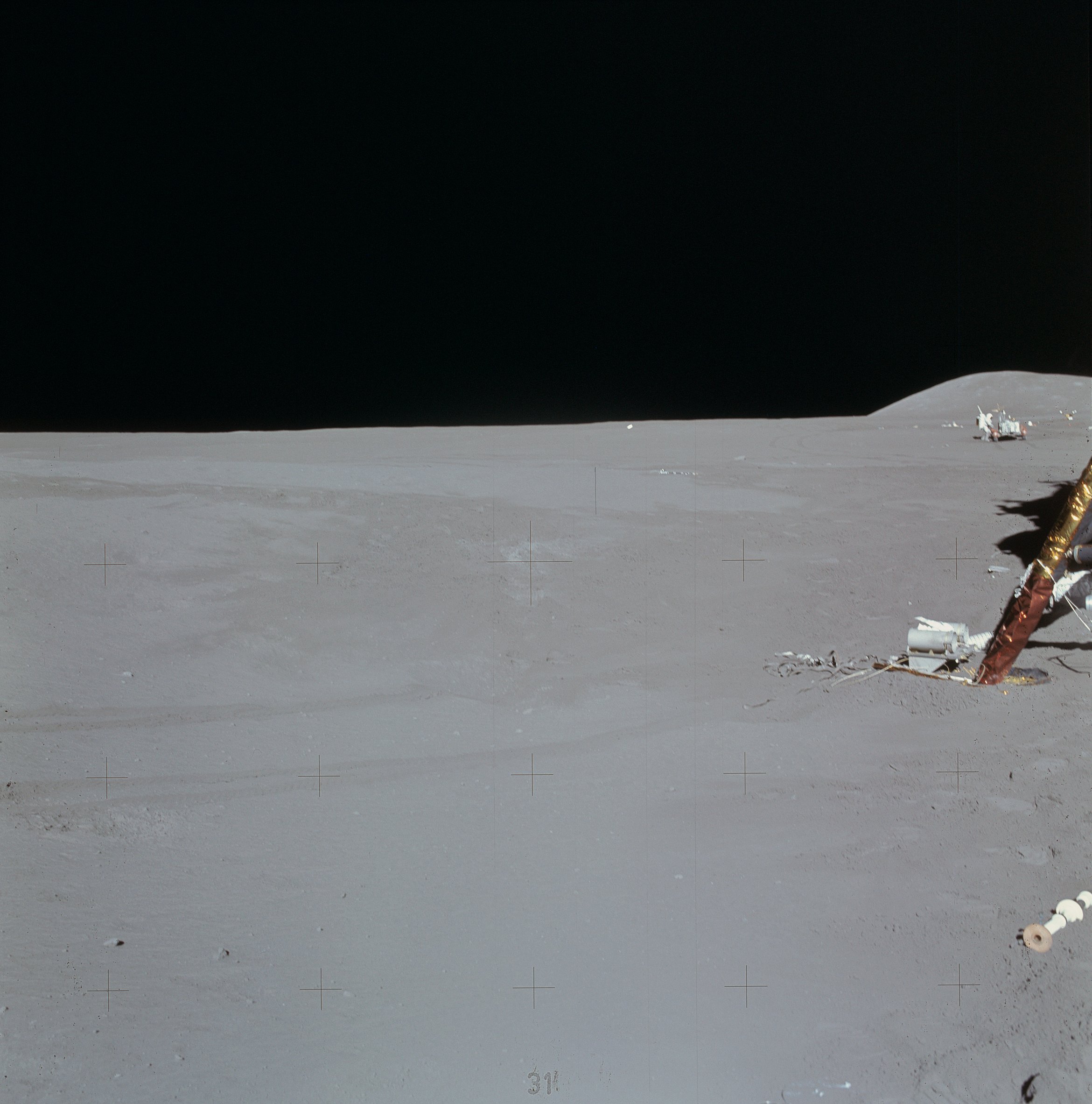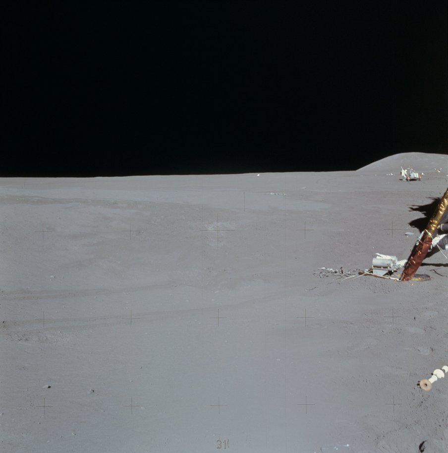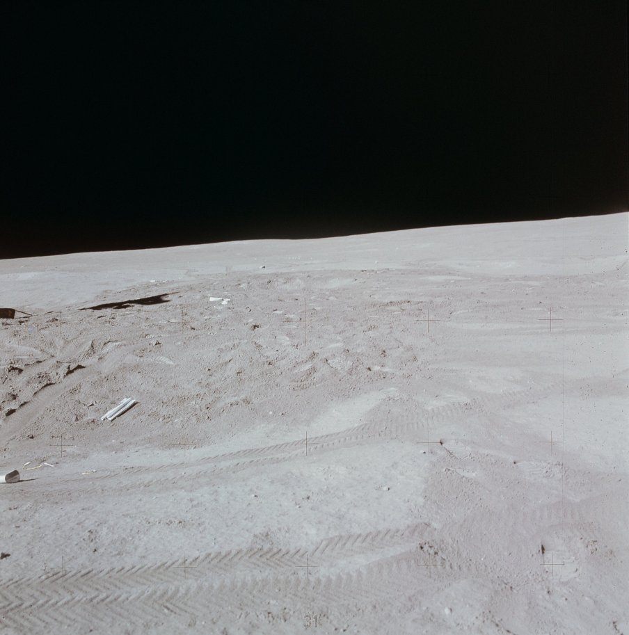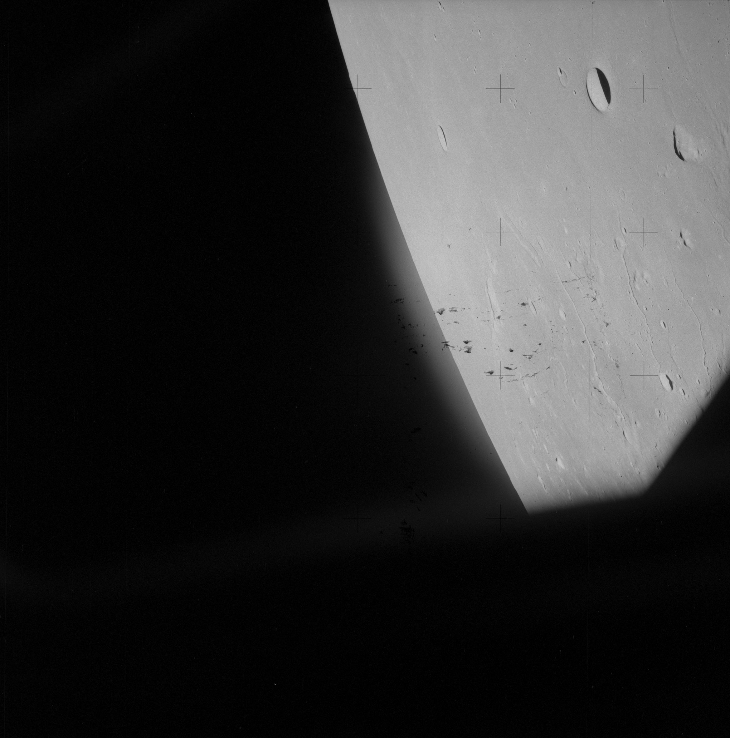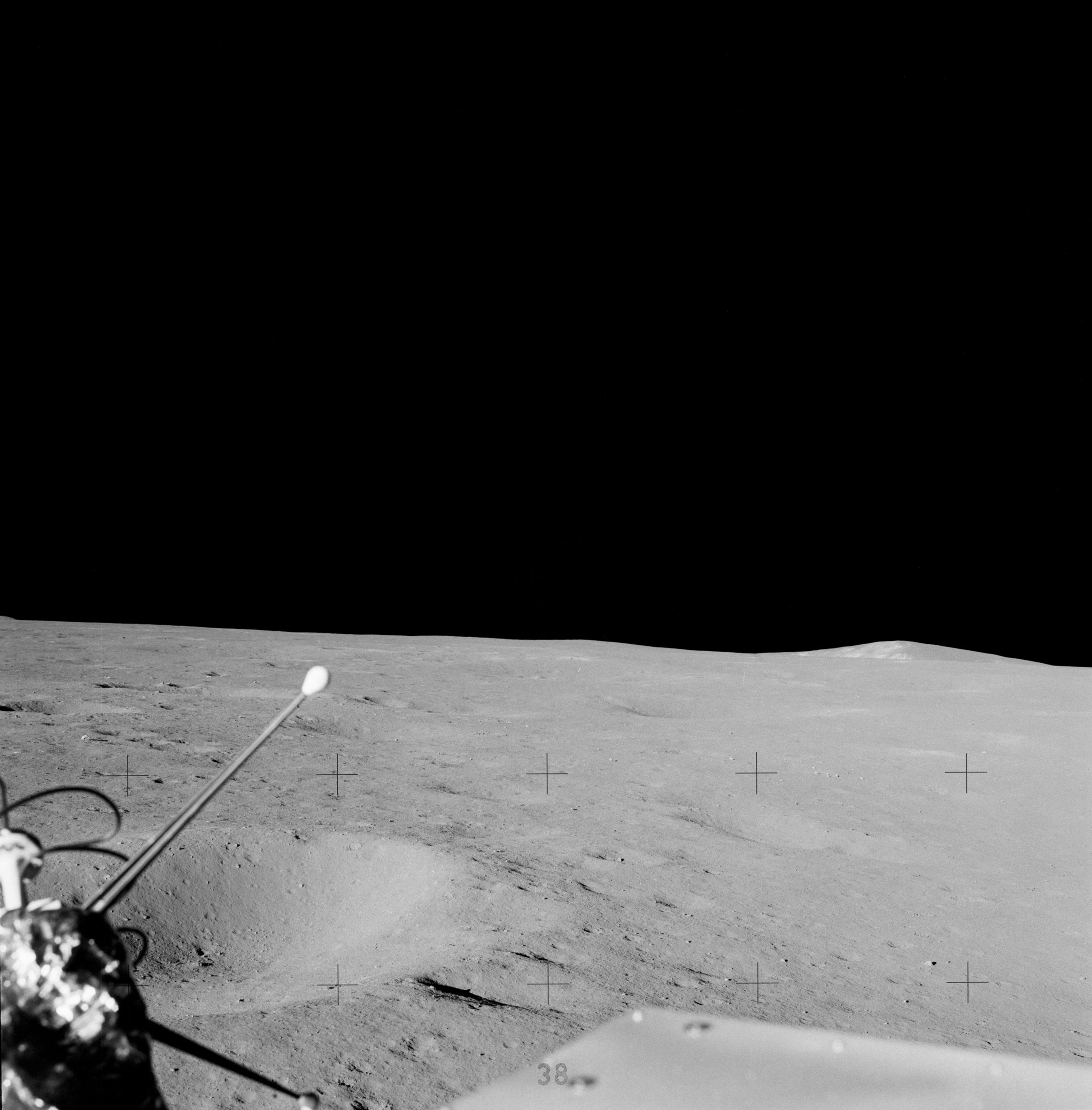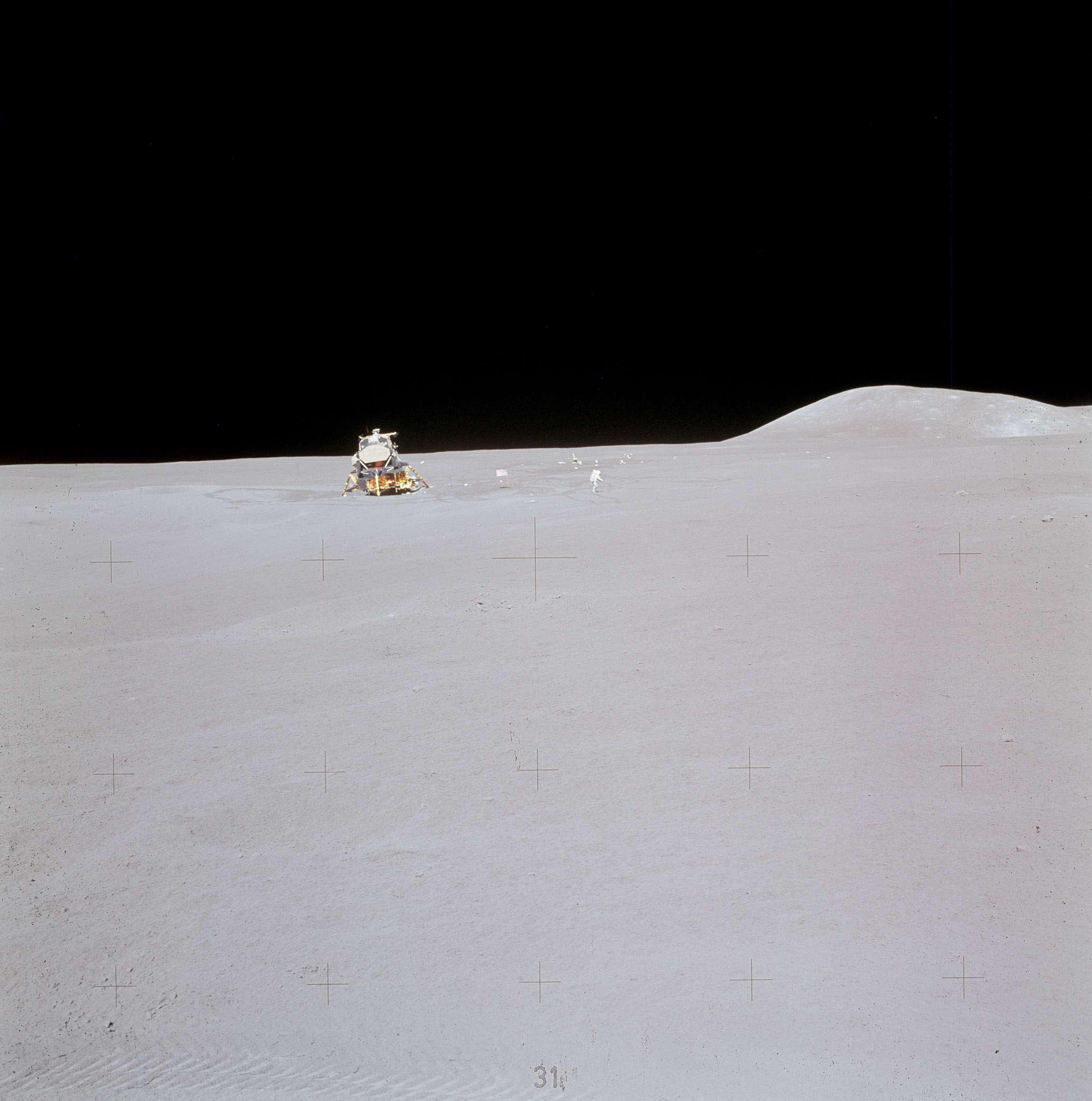 This picture was taken from the LM during CSM Rev 13 on the last pass over the landing site prior to the descent. A labeled version shows some of the prominent landmarks.Rev 16 Mapping (Metric) Camera Frame 0414 ( 13 Mb )