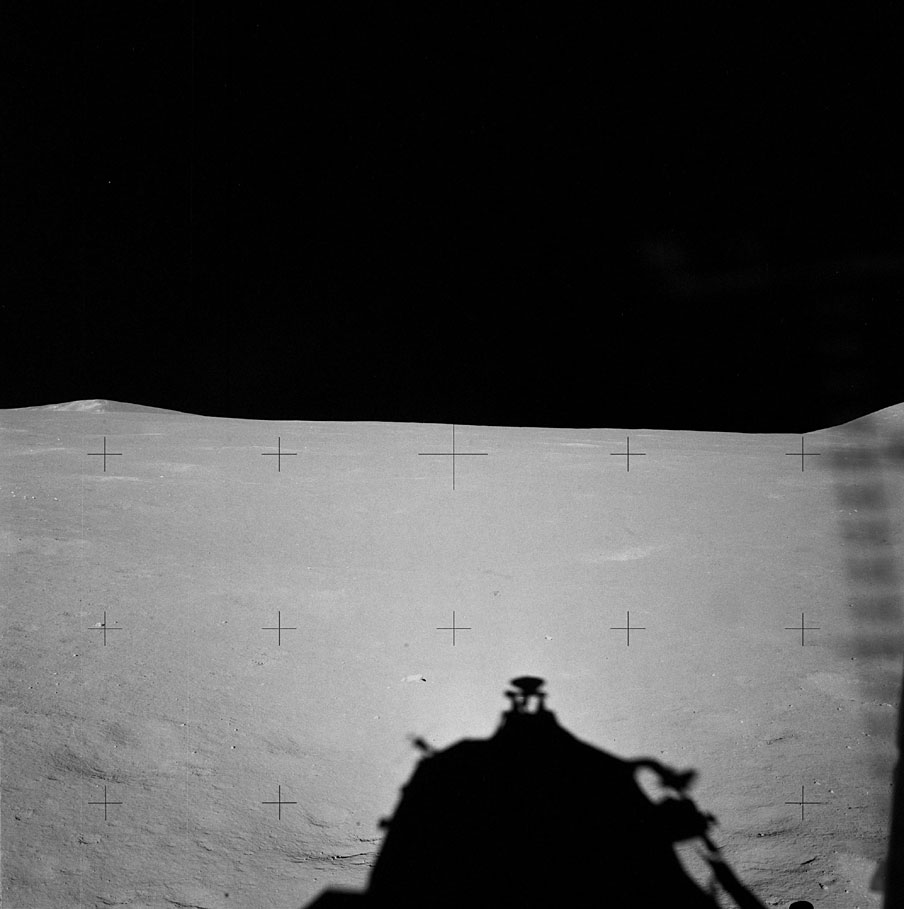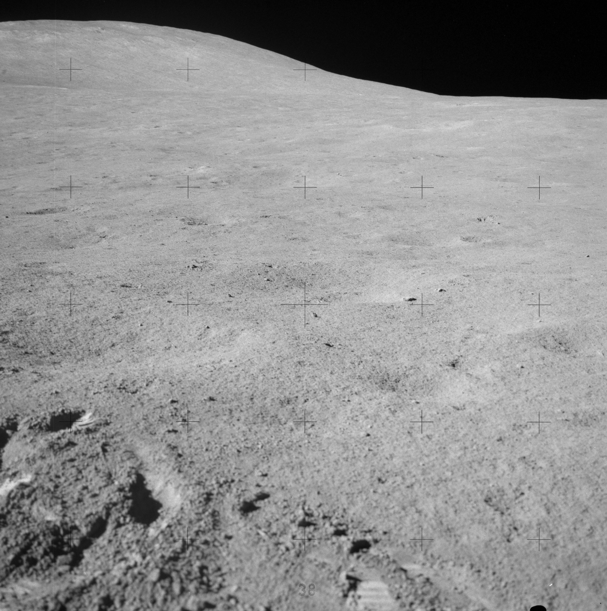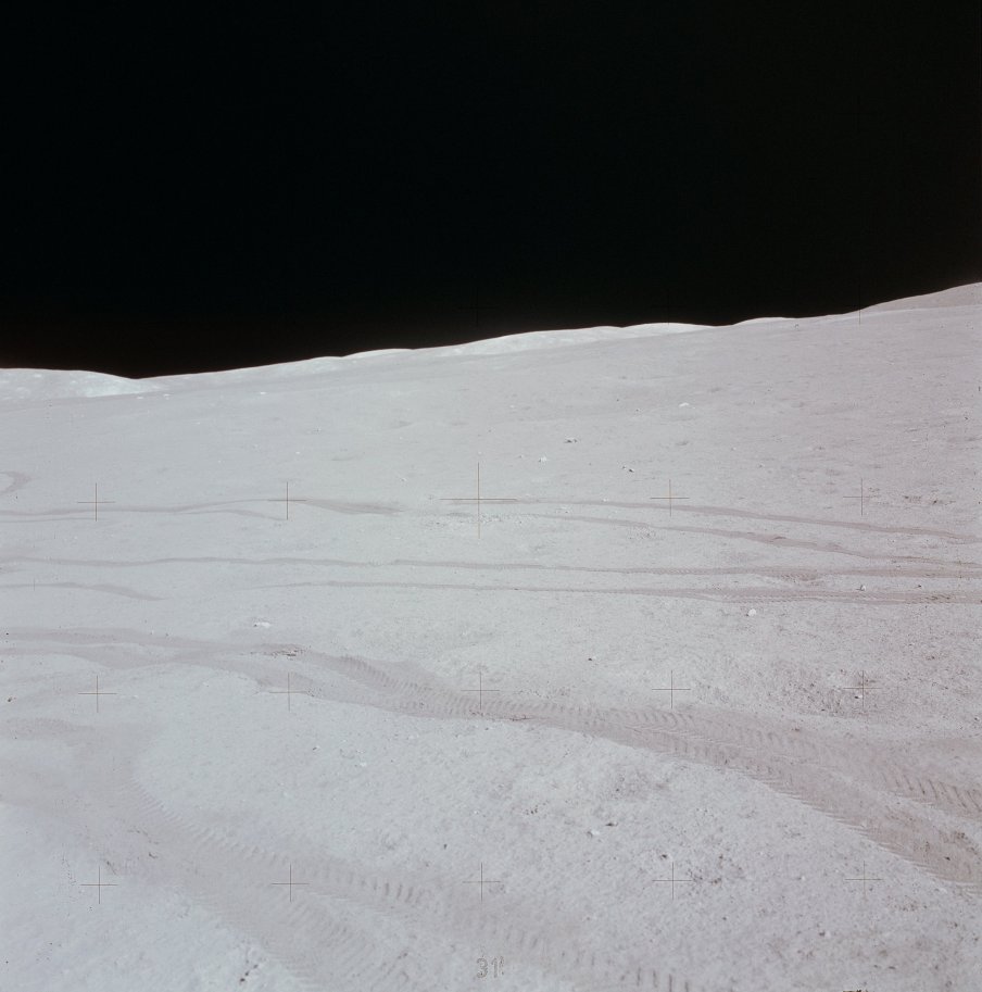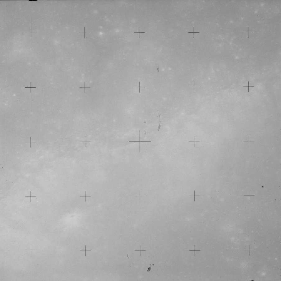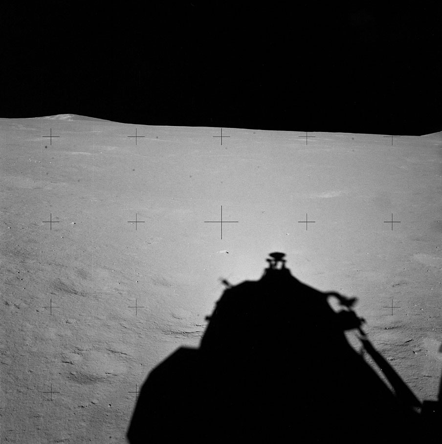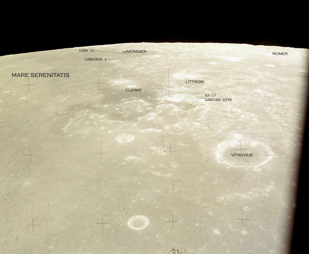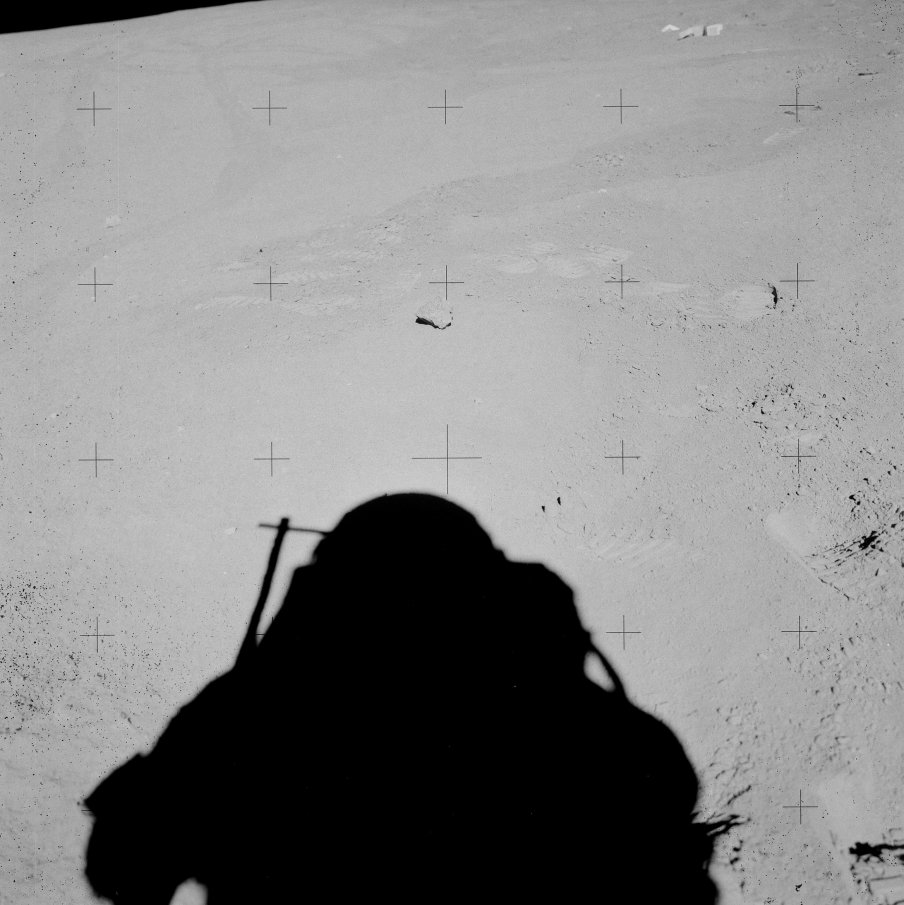 This picture was taken from the LM during CSM Rev 13 on the last pass over the landing site prior to the descent. A labeled version shows some of the prominent landmarks.Rev 16 Mapping (Metric) Camera Frame 0414 ( 13 Mb )