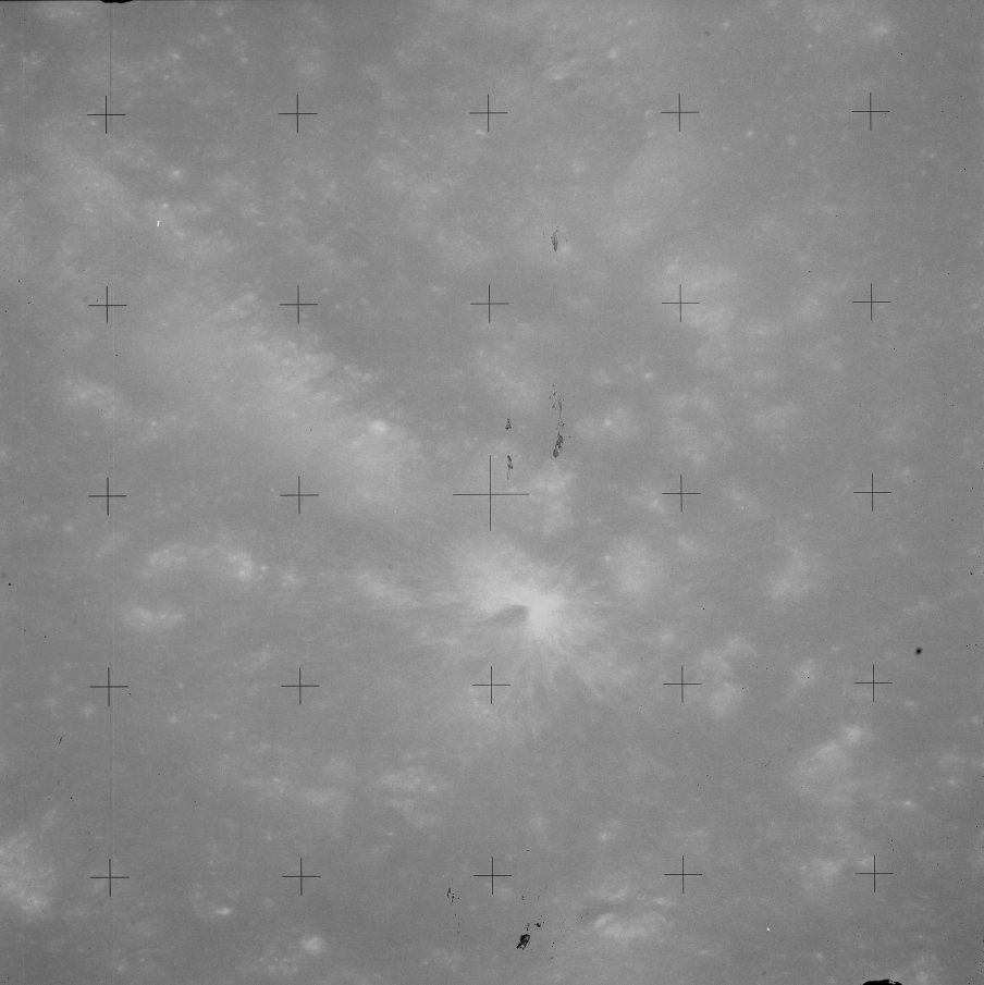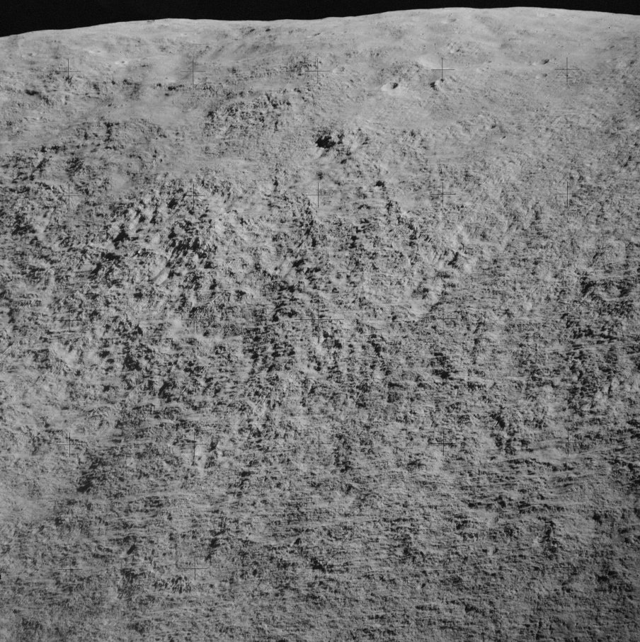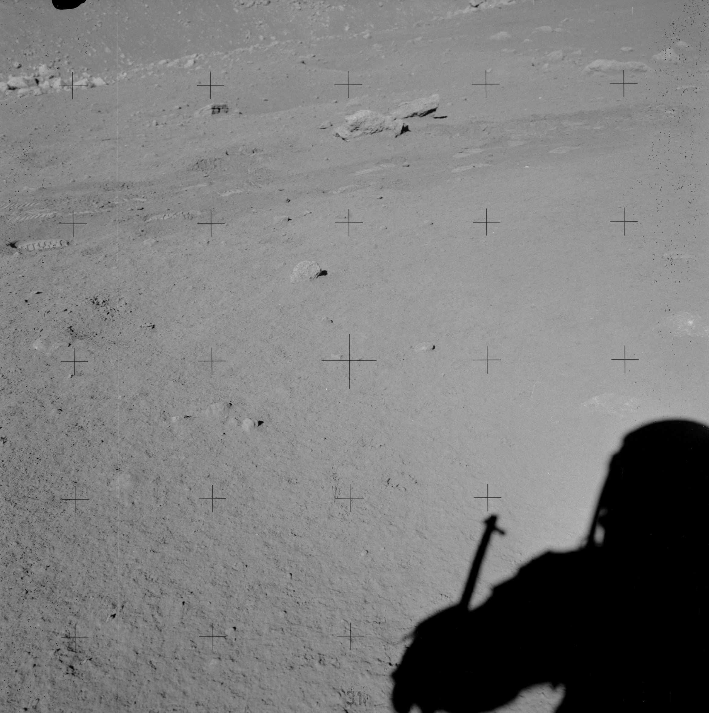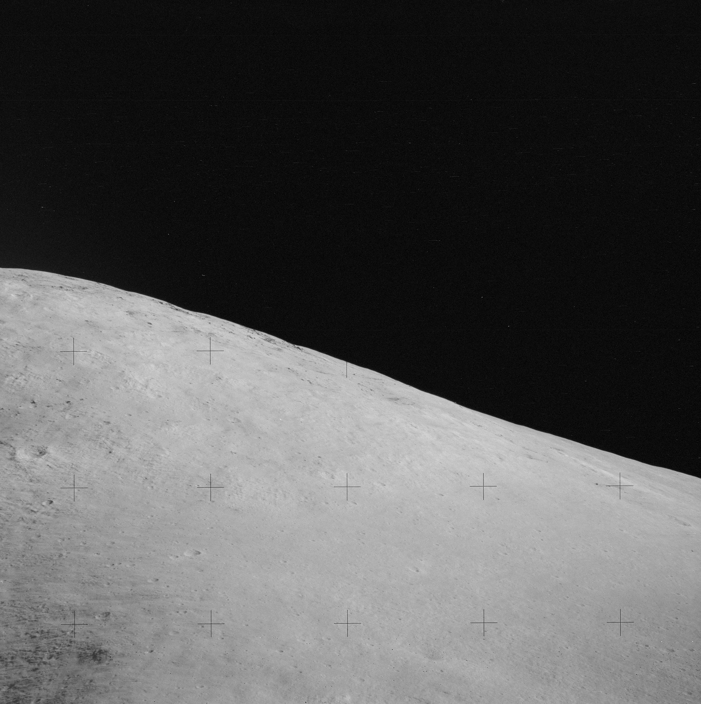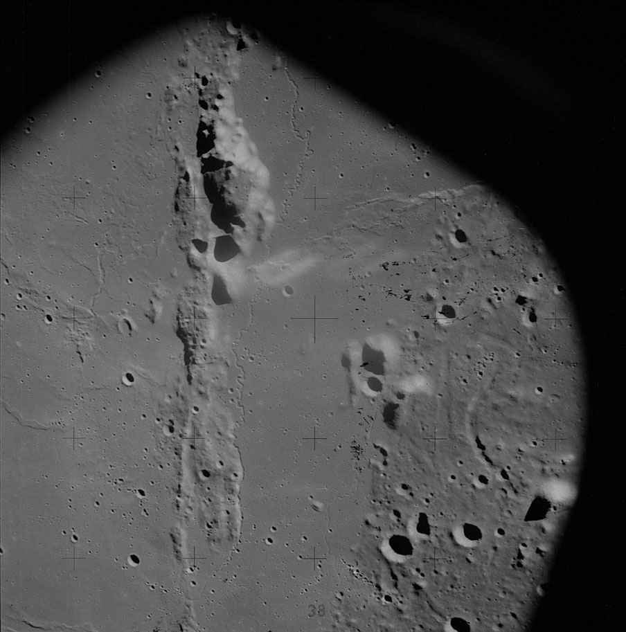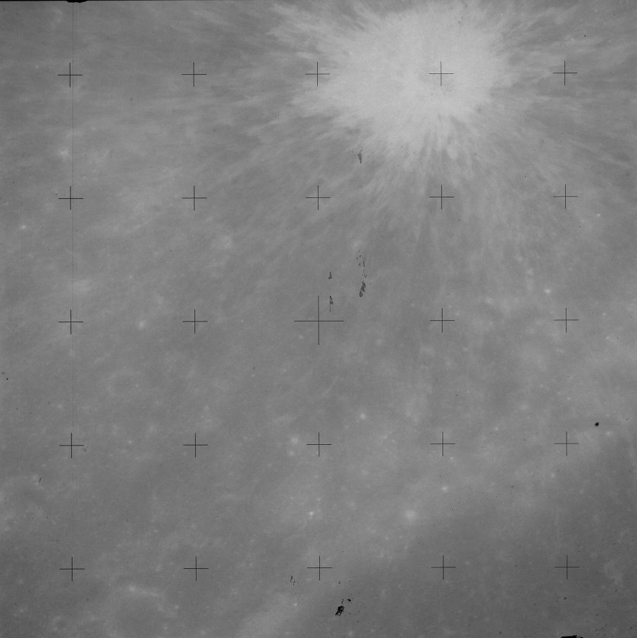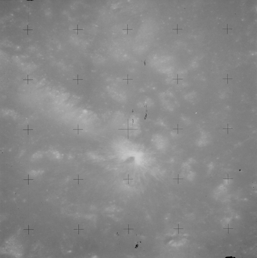 This picture was taken from the LM during CSM Rev 13 on the last pass over the landing site prior to the descent. A labeled version shows some of the prominent landmarks.Rev 16 Mapping (Metric) Camera Frame 0414 ( 13 Mb )