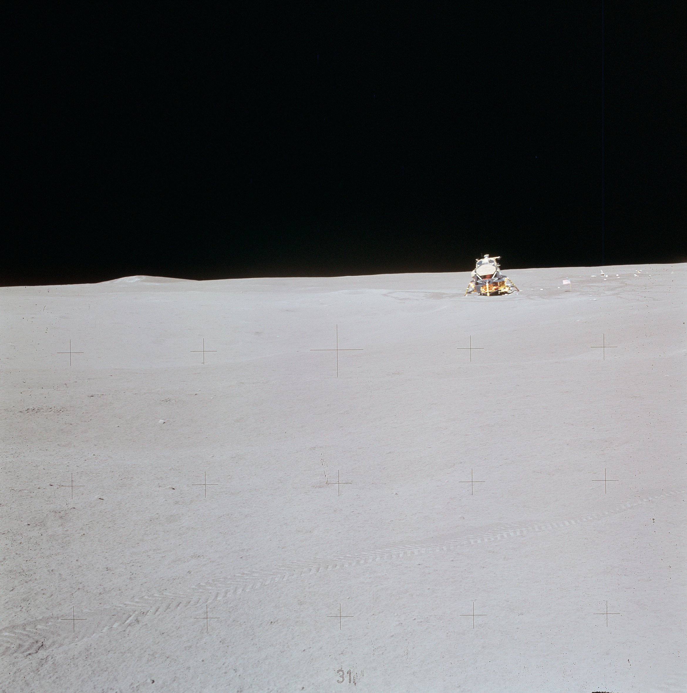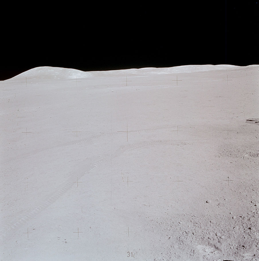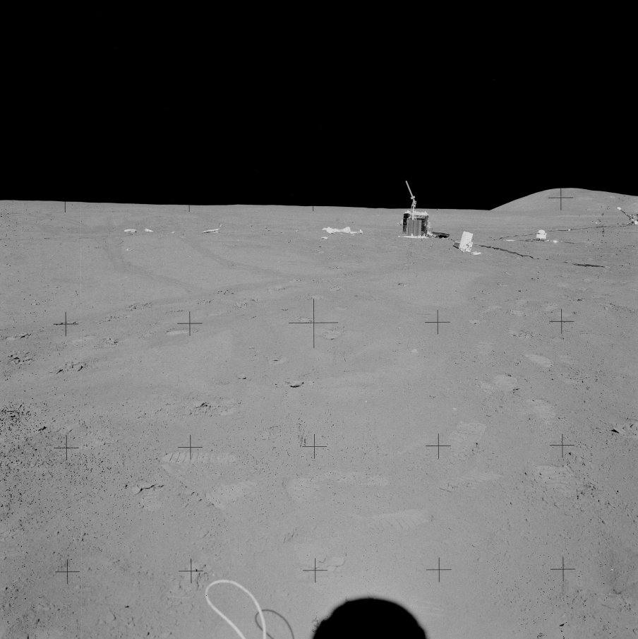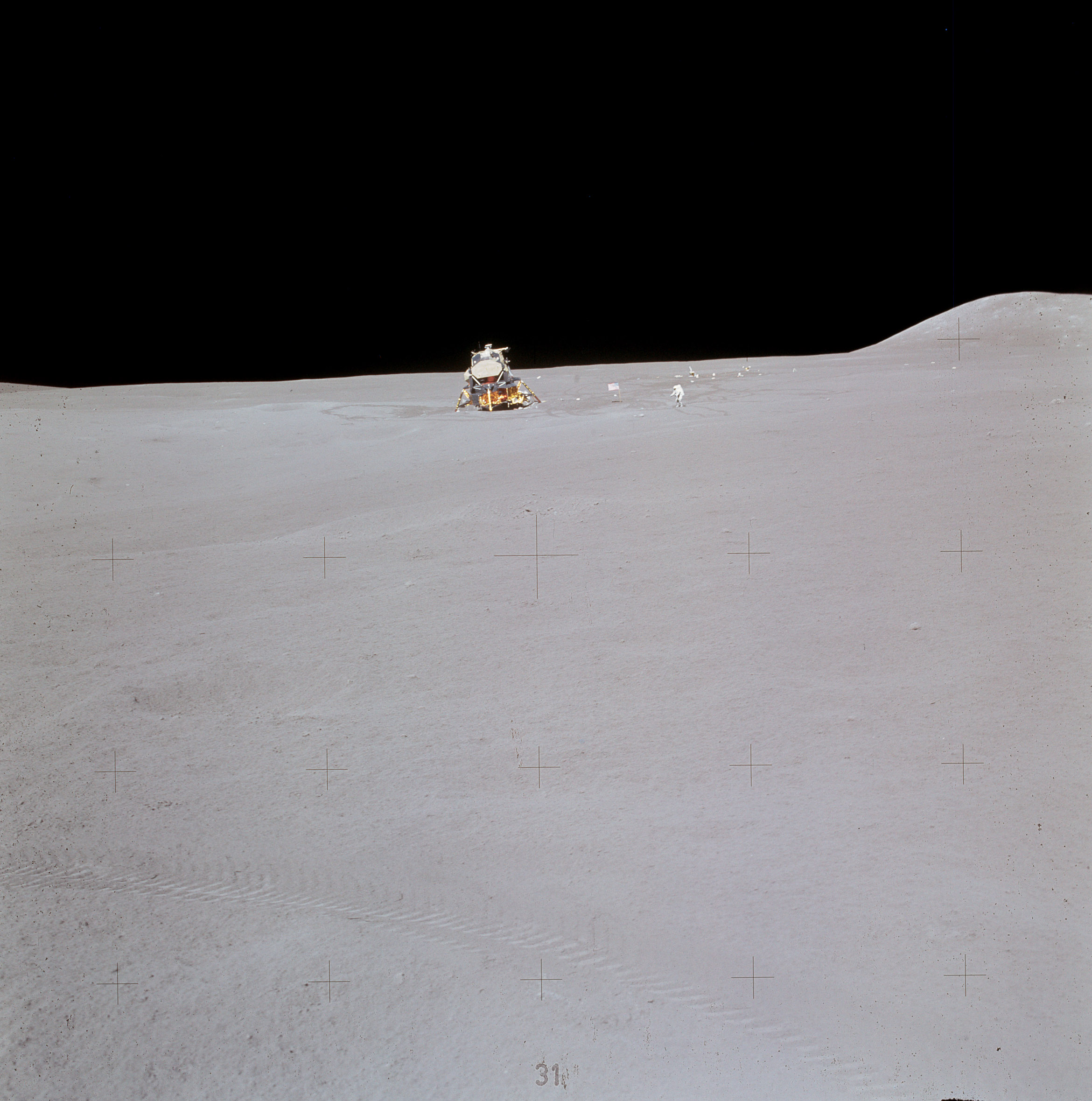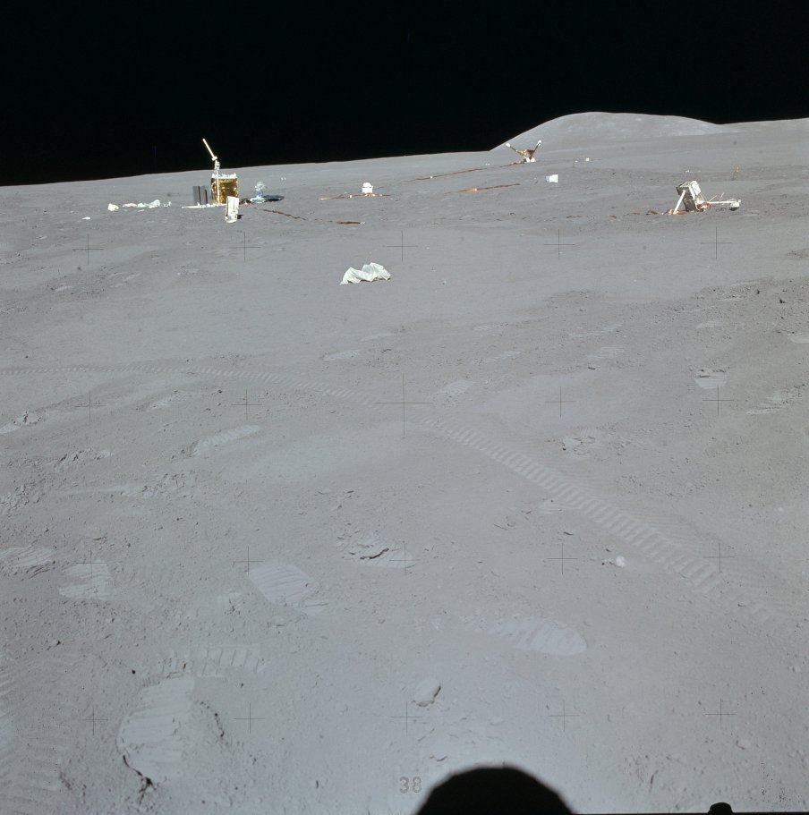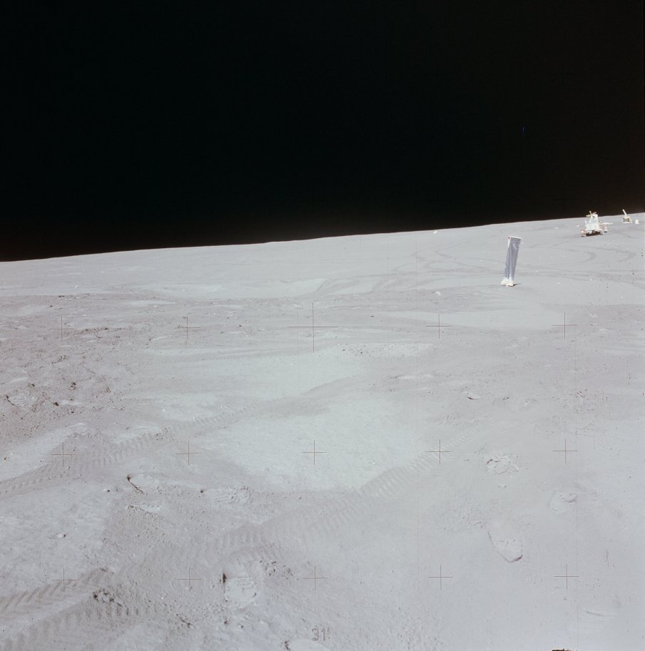 This picture was taken from the LM during CSM Rev 13 on the last pass over the landing site prior to the descent. A labeled version shows some of the prominent landmarks.Rev 16 Mapping (Metric) Camera Frame 0414 ( 13 Mb )