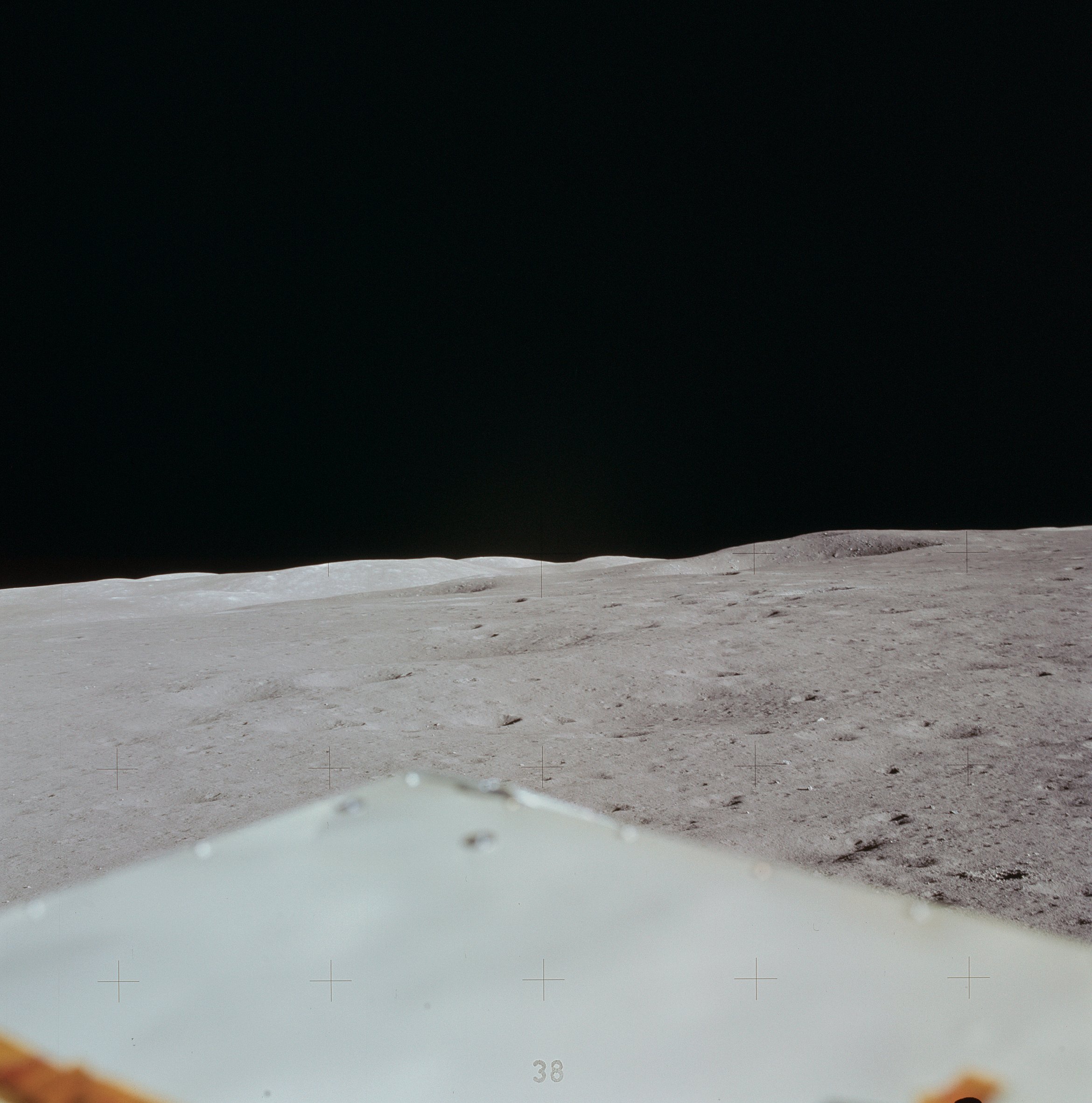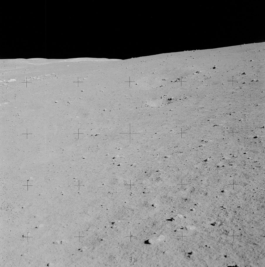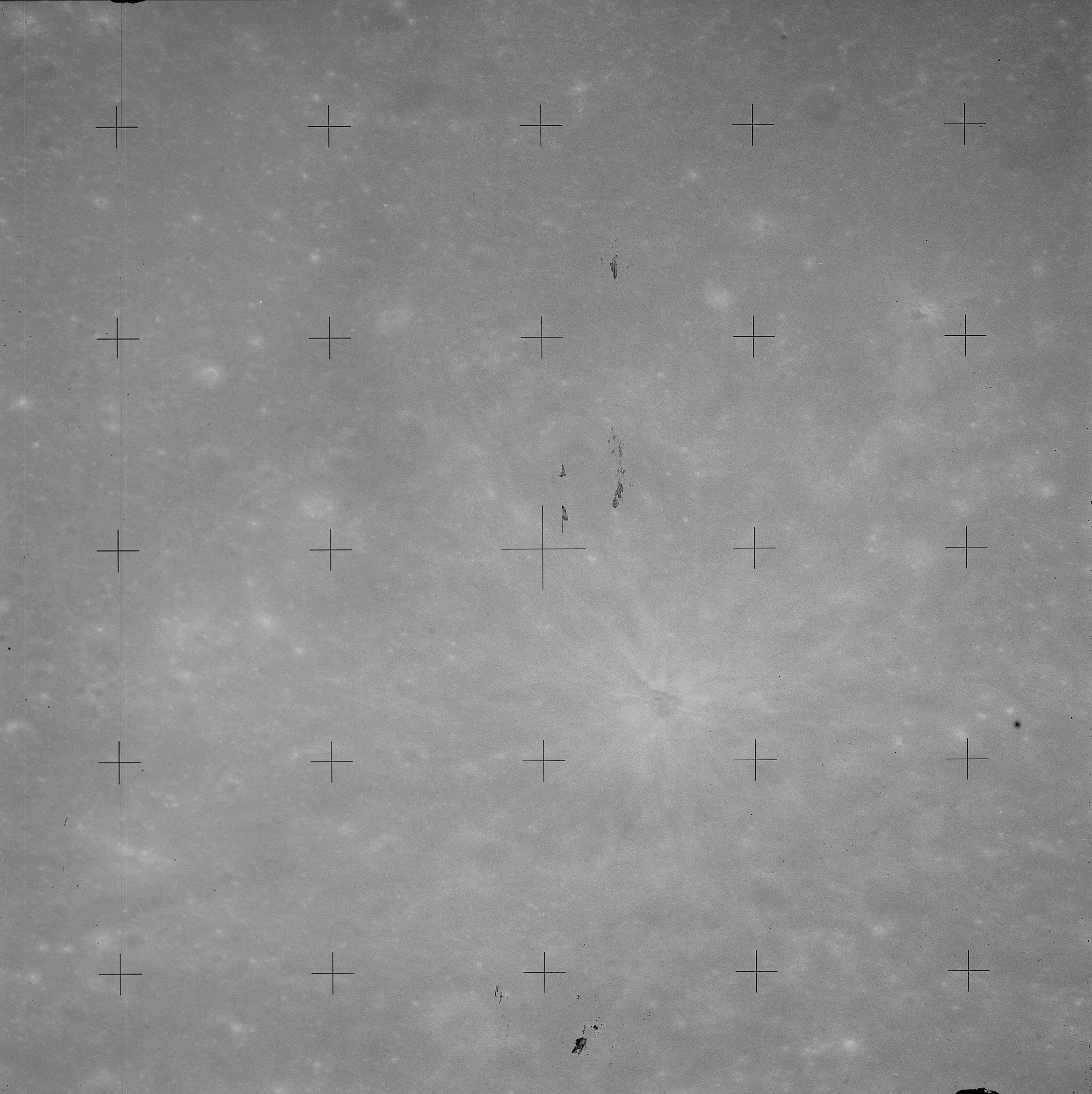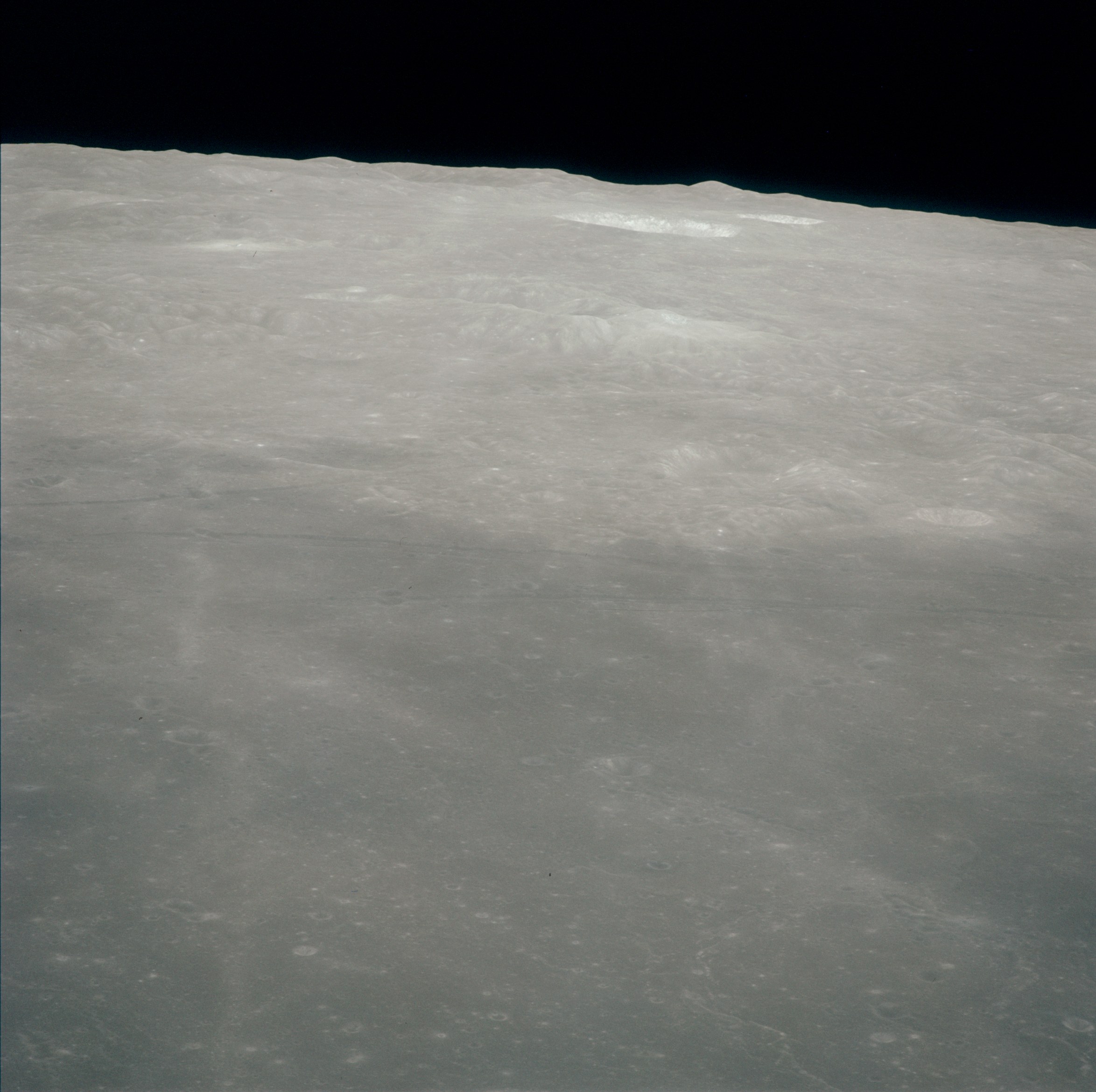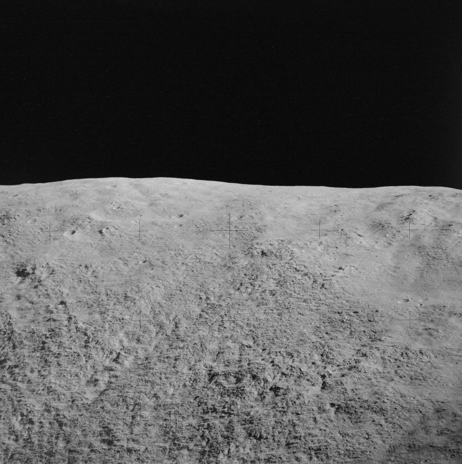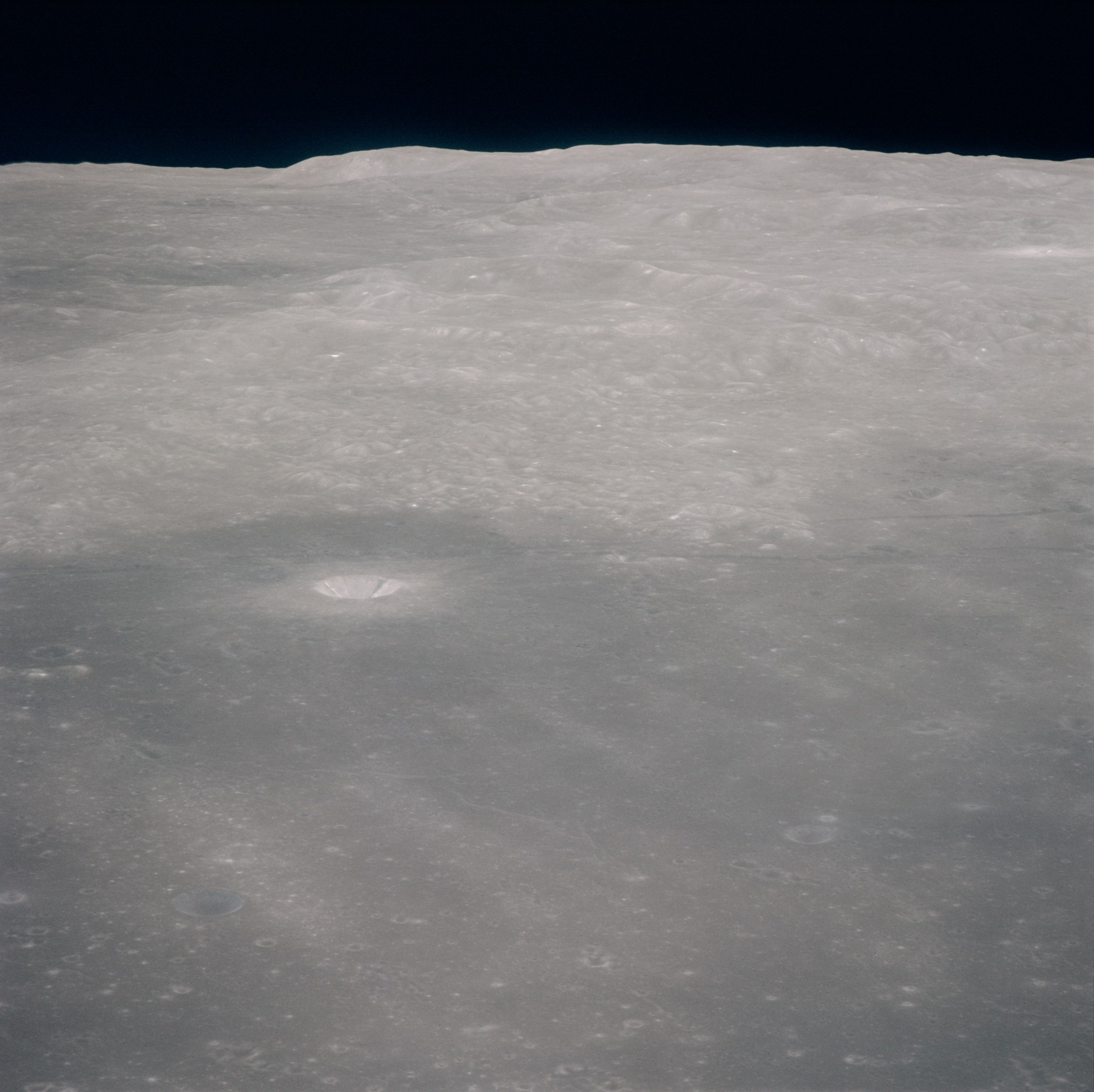 This picture was taken from the LM during CSM Rev 13 on the last pass over the landing site prior to the descent. A labeled version shows some of the prominent landmarks.Rev 16 Mapping (Metric) Camera Frame 0414 ( 13 Mb )