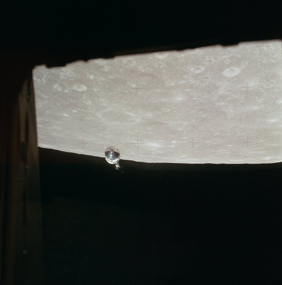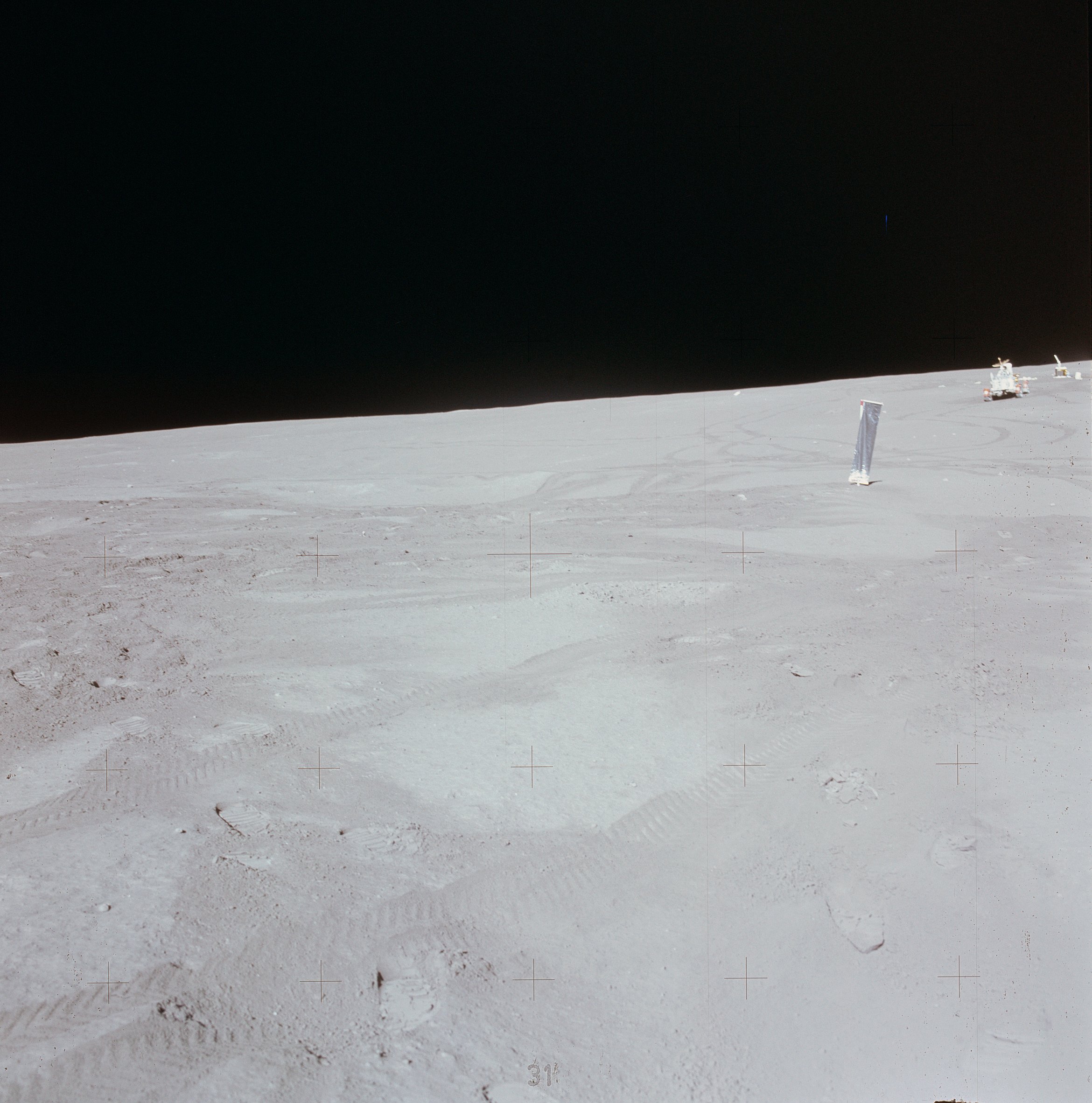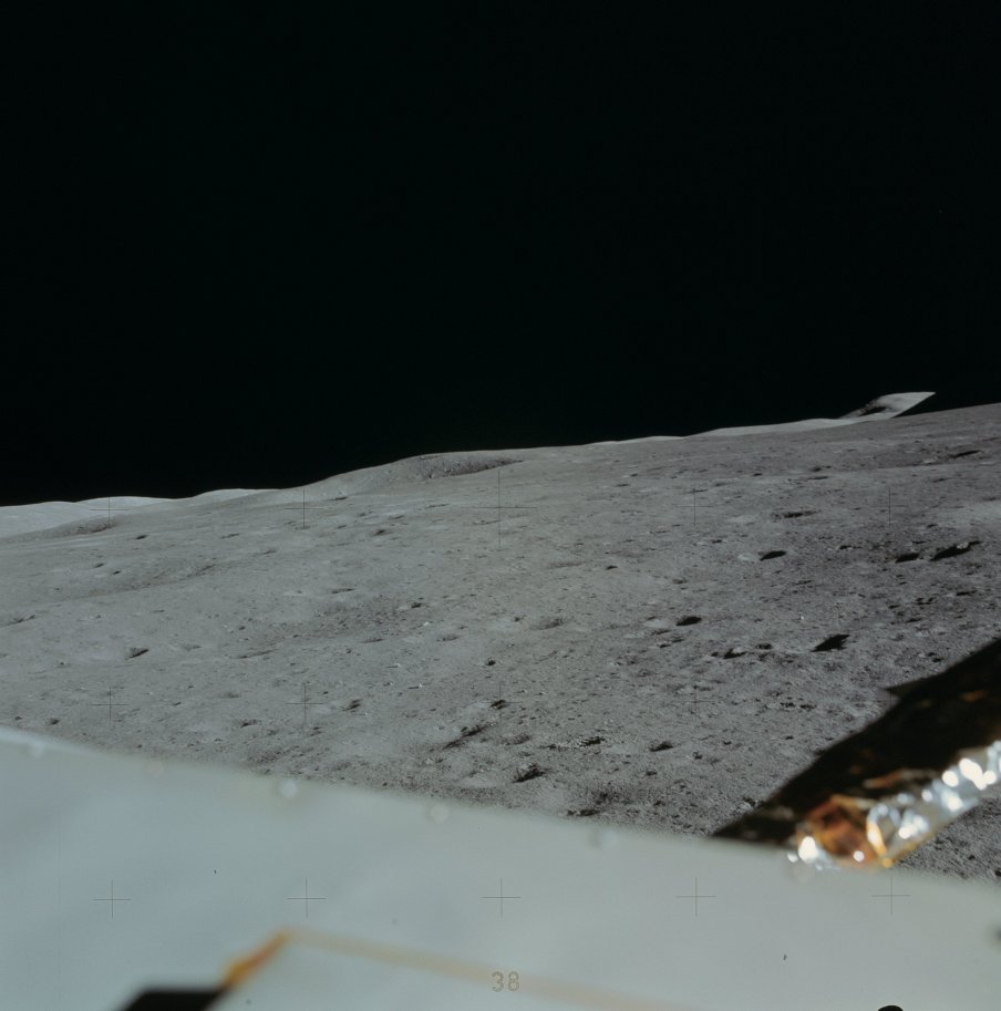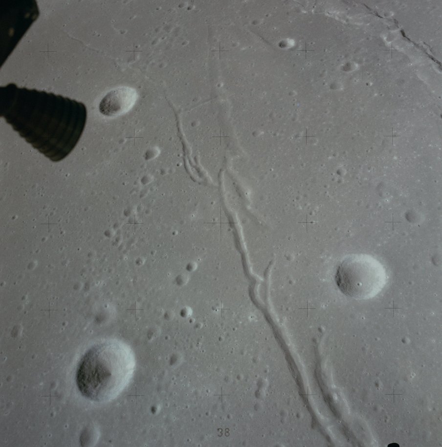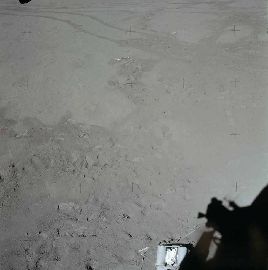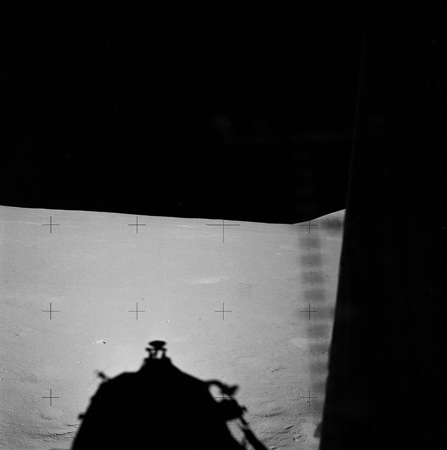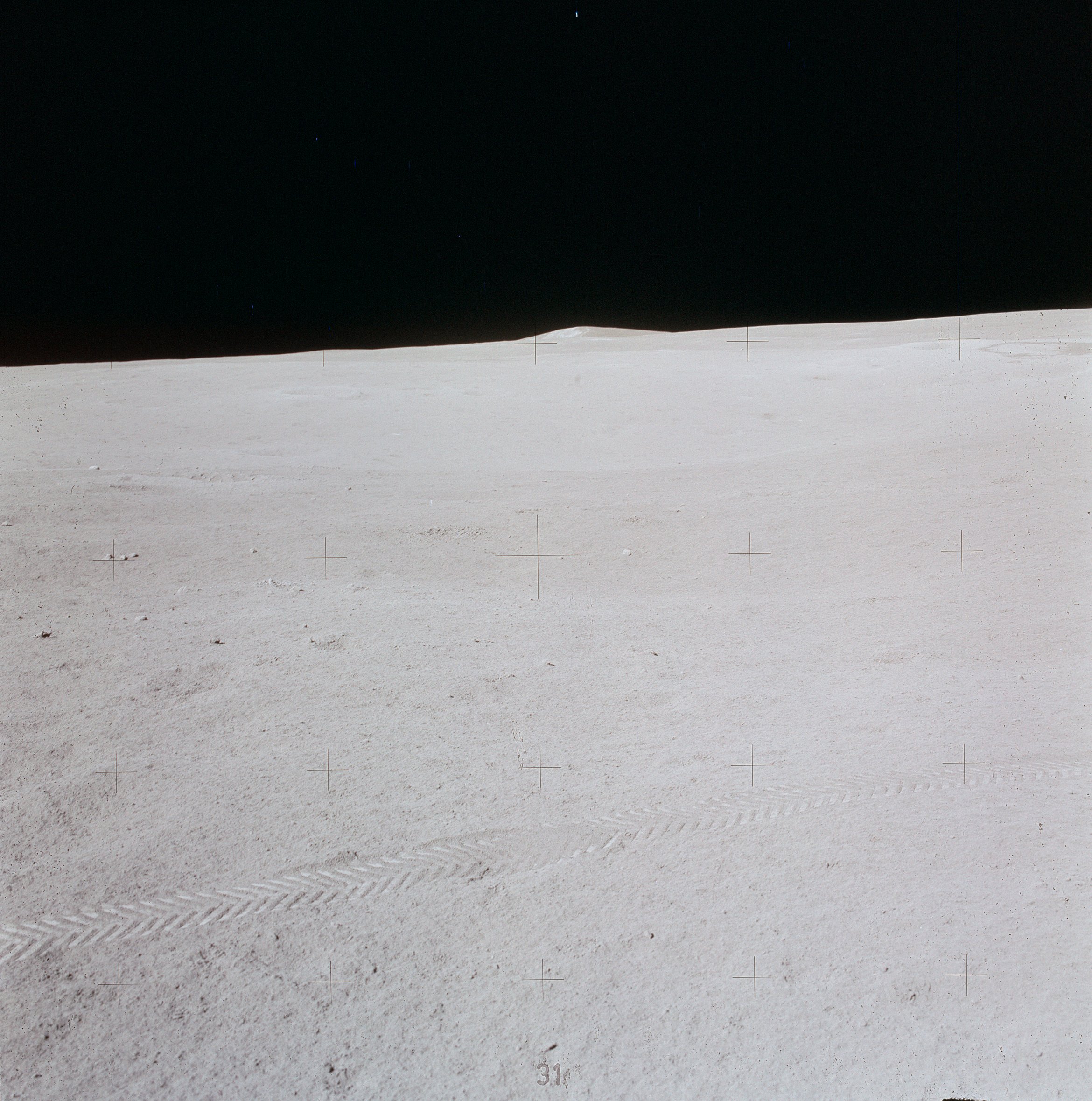 This picture was taken from the LM during CSM Rev 13 on the last pass over the landing site prior to the descent. A labeled version shows some of the prominent landmarks.Rev 16 Mapping (Metric) Camera Frame 0414 ( 13 Mb )