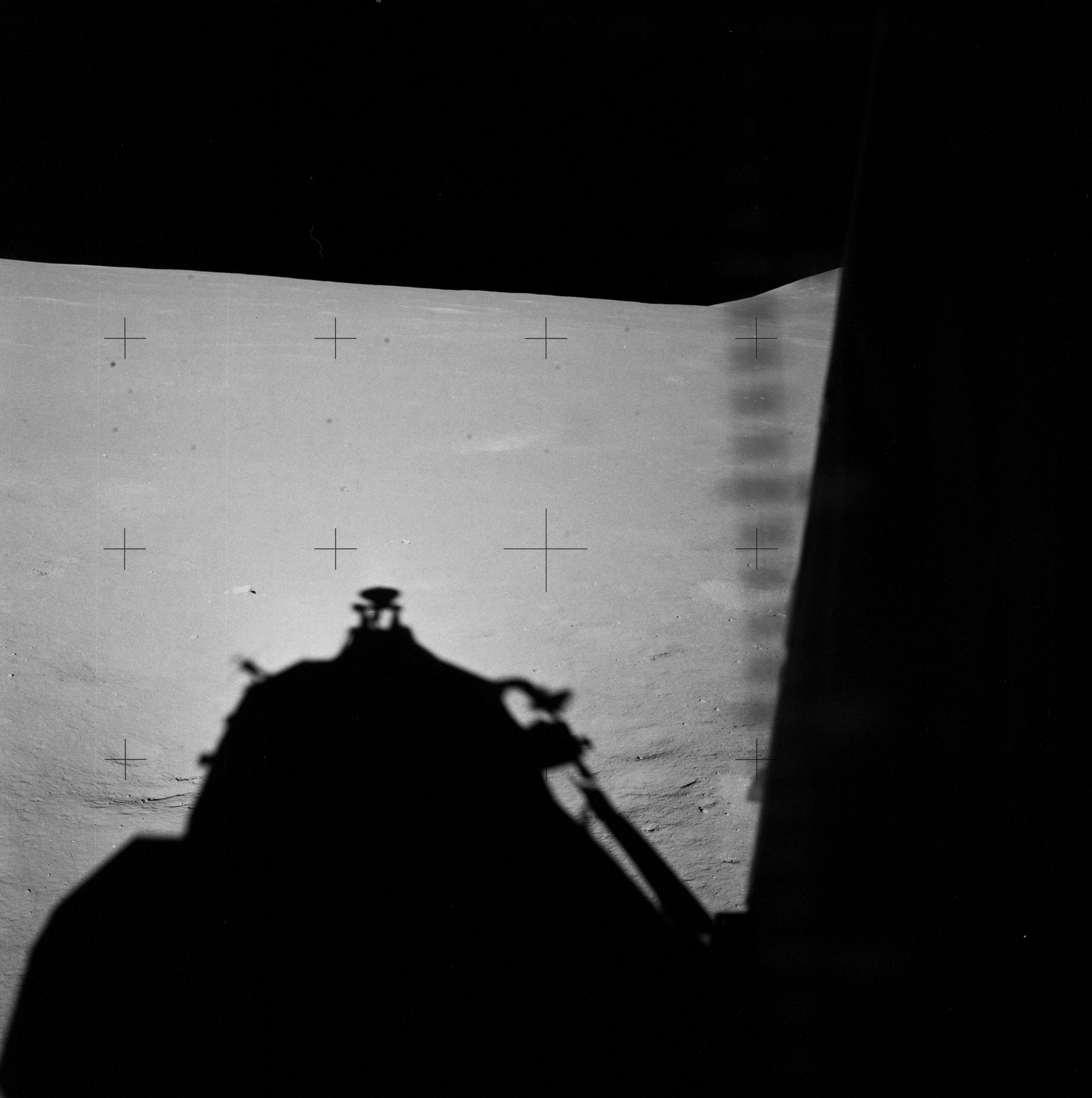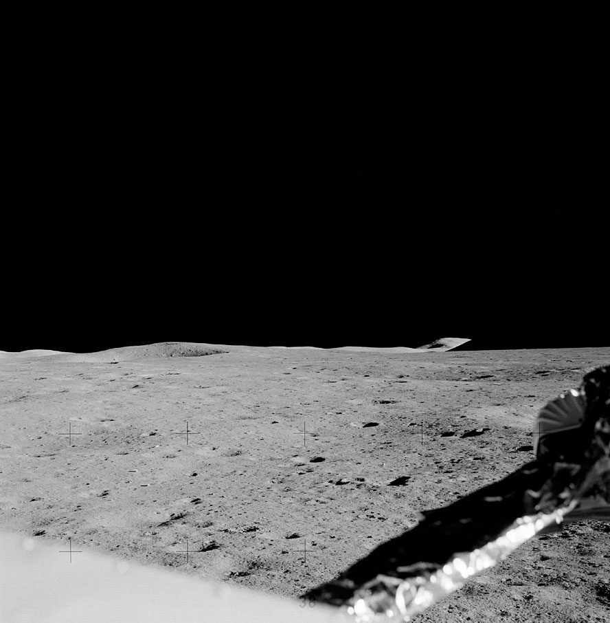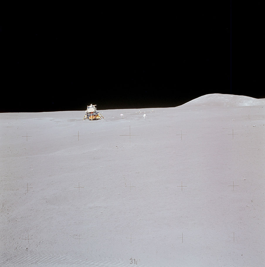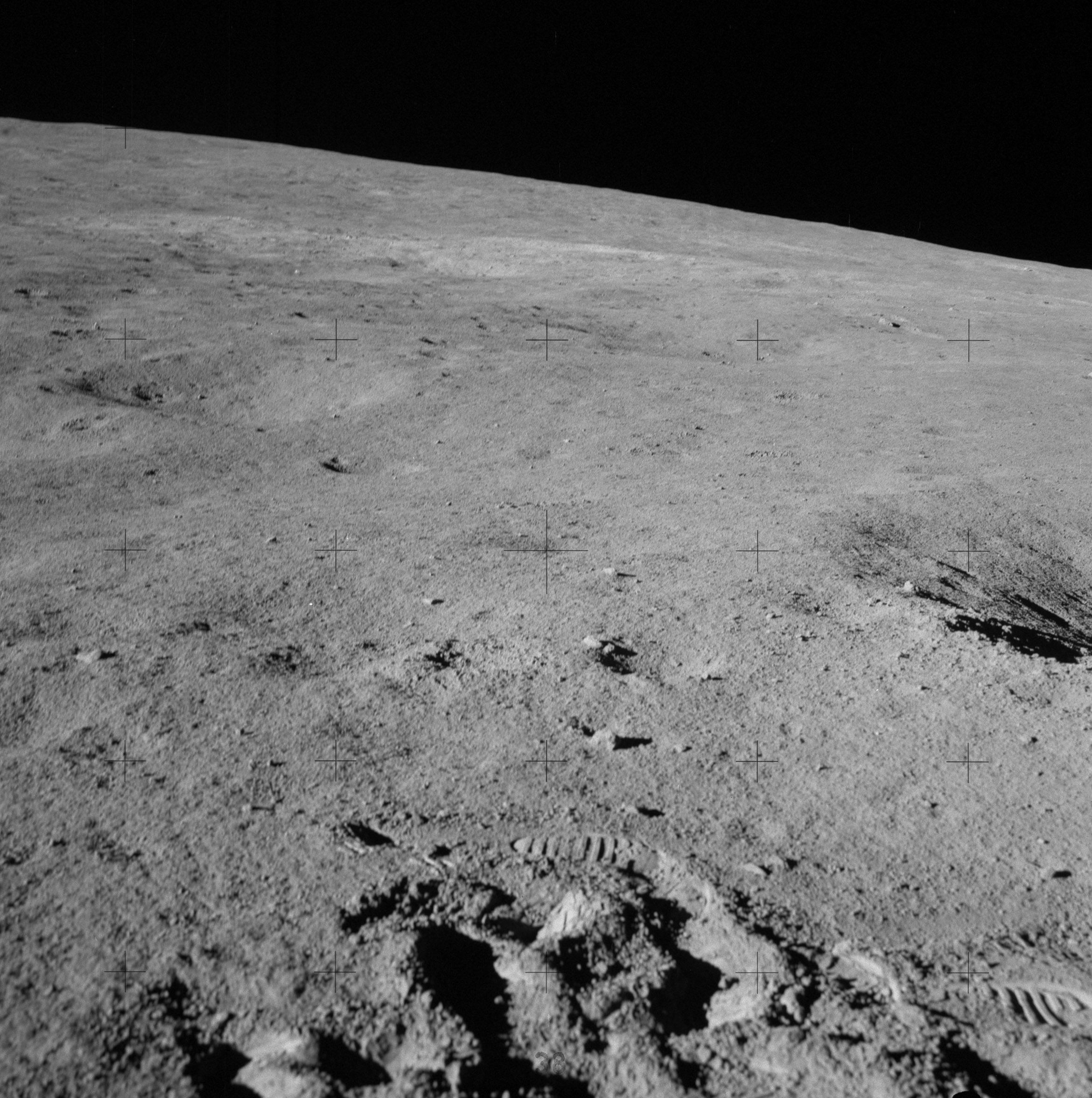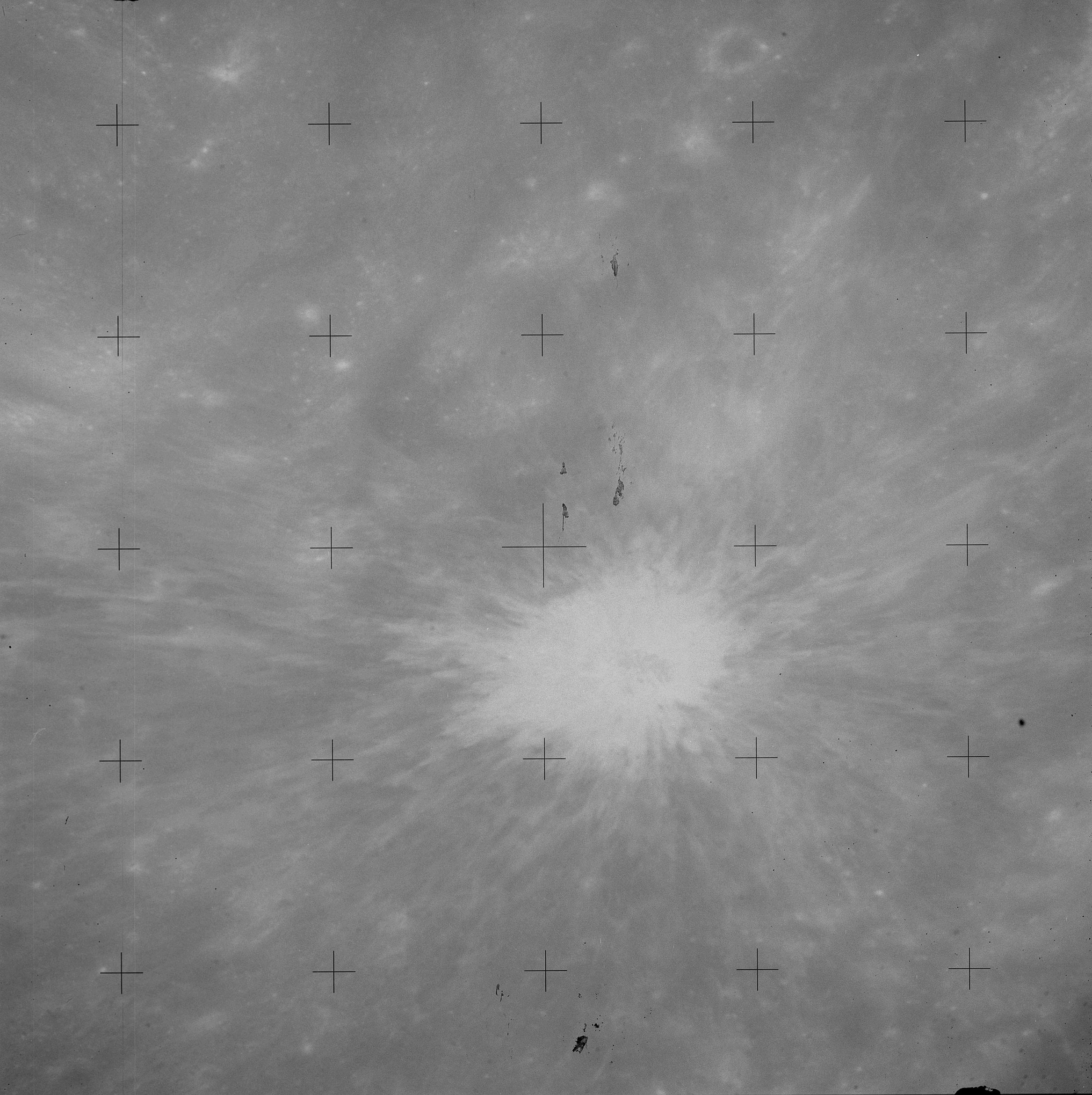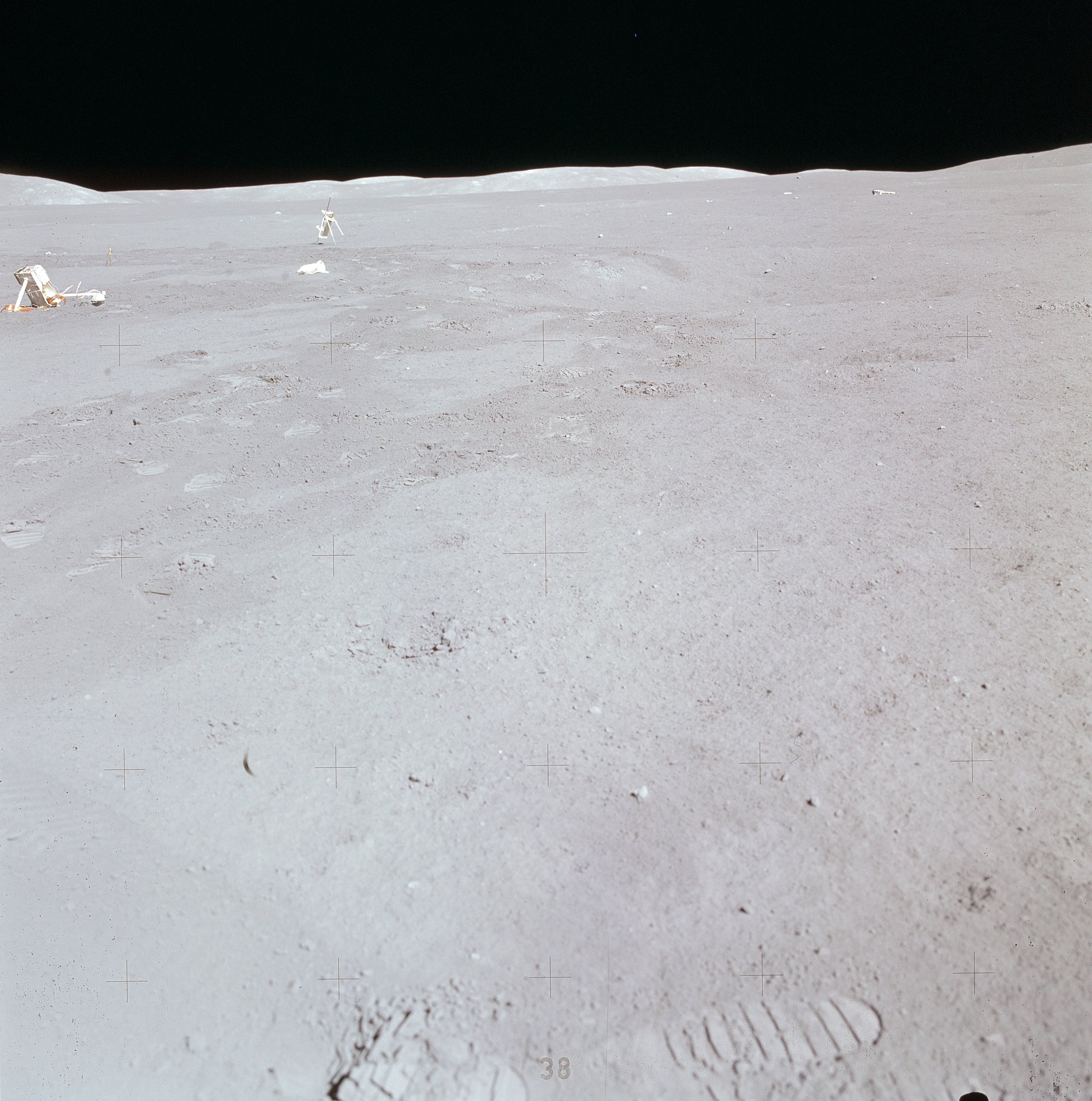 This picture was taken from the LM during CSM Rev 13 on the last pass over the landing site prior to the descent. A labeled version shows some of the prominent landmarks.Rev 16 Mapping (Metric) Camera Frame 0414 ( 13 Mb )