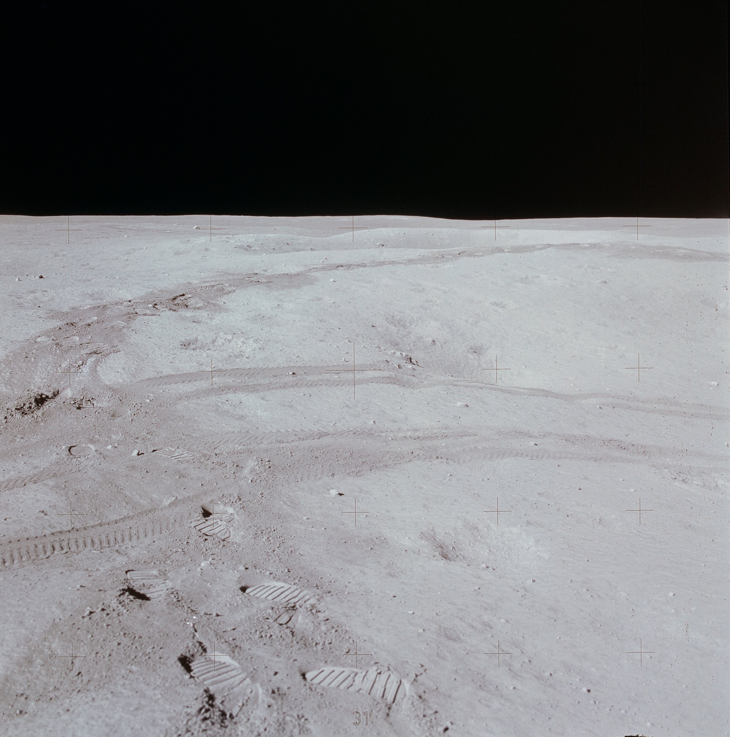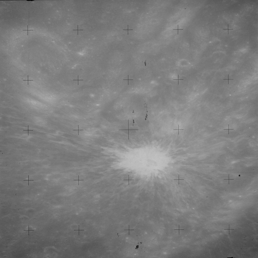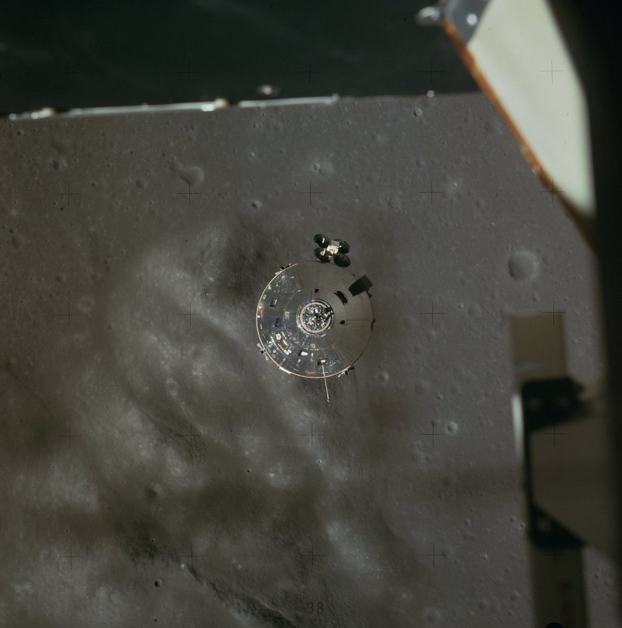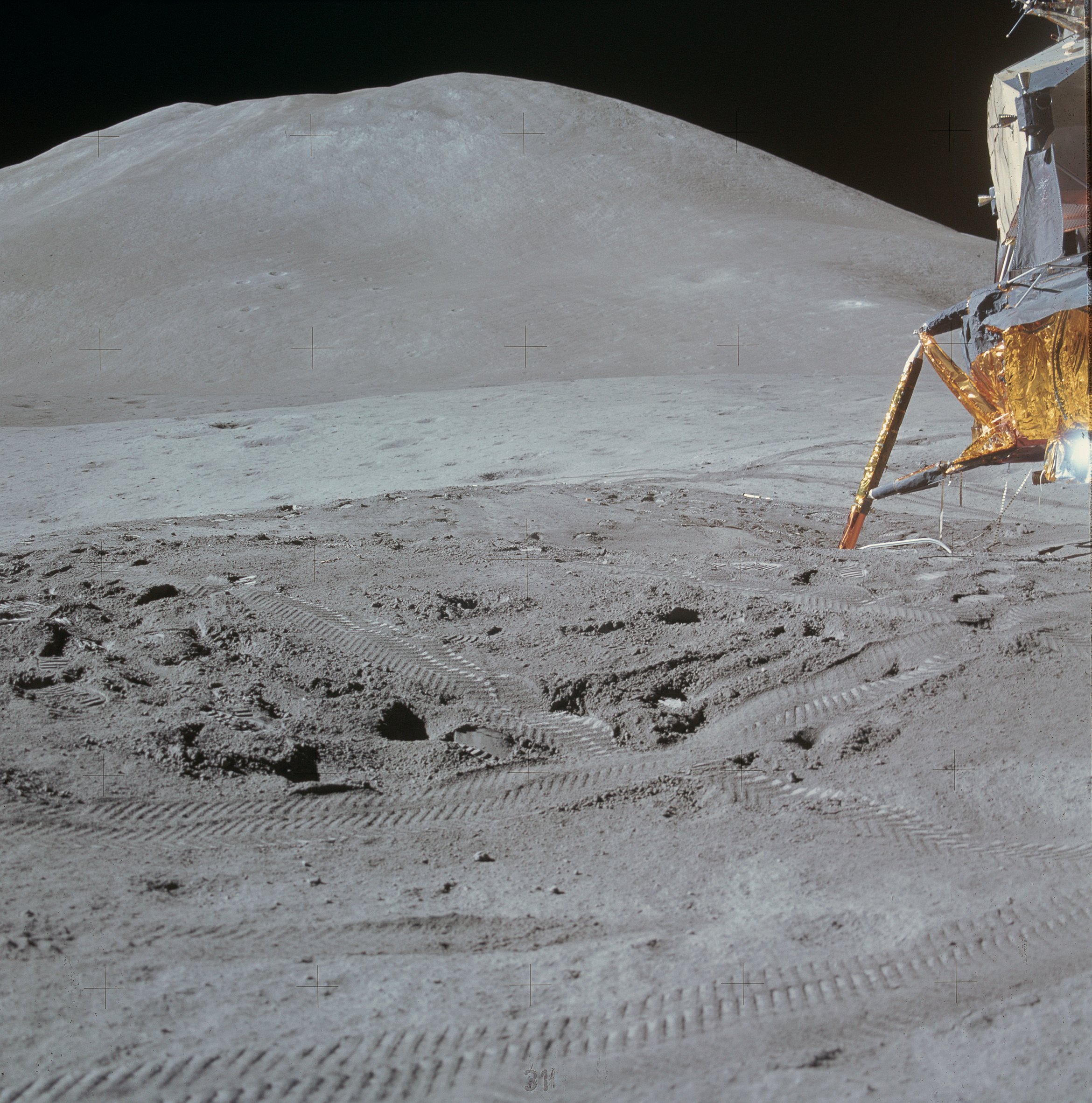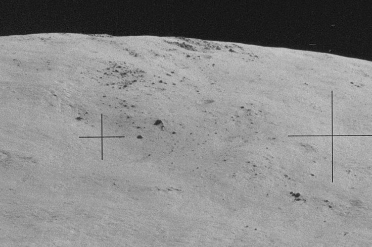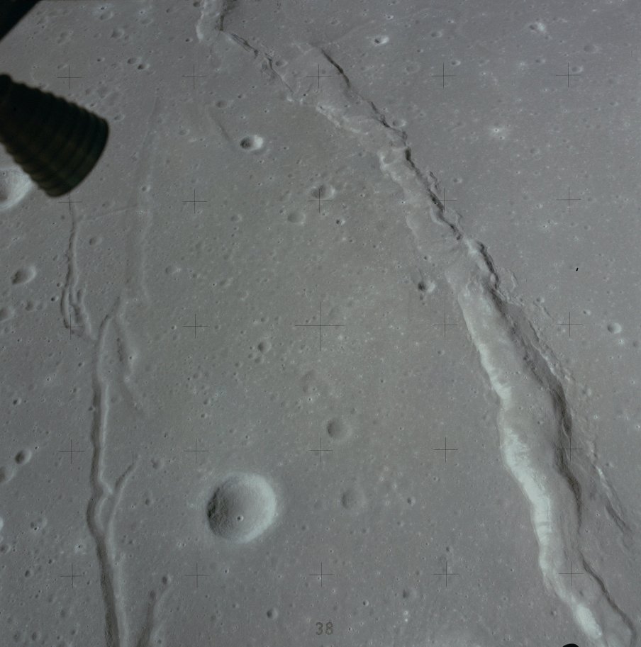 This picture was taken from the LM during CSM Rev 13 on the last pass over the landing site prior to the descent. A labeled version shows some of the prominent landmarks.Rev 16 Mapping (Metric) Camera Frame 0414 ( 13 Mb )
