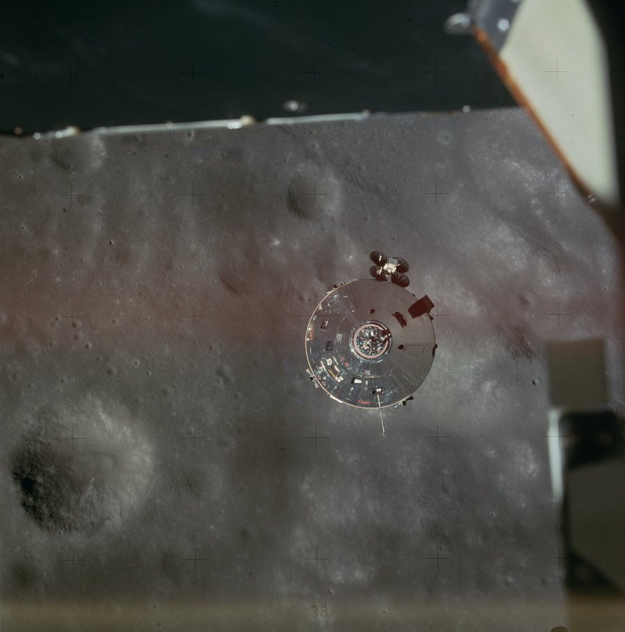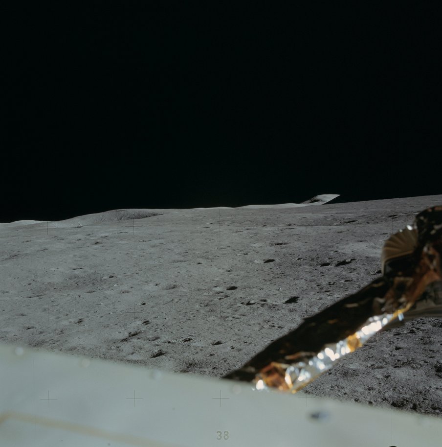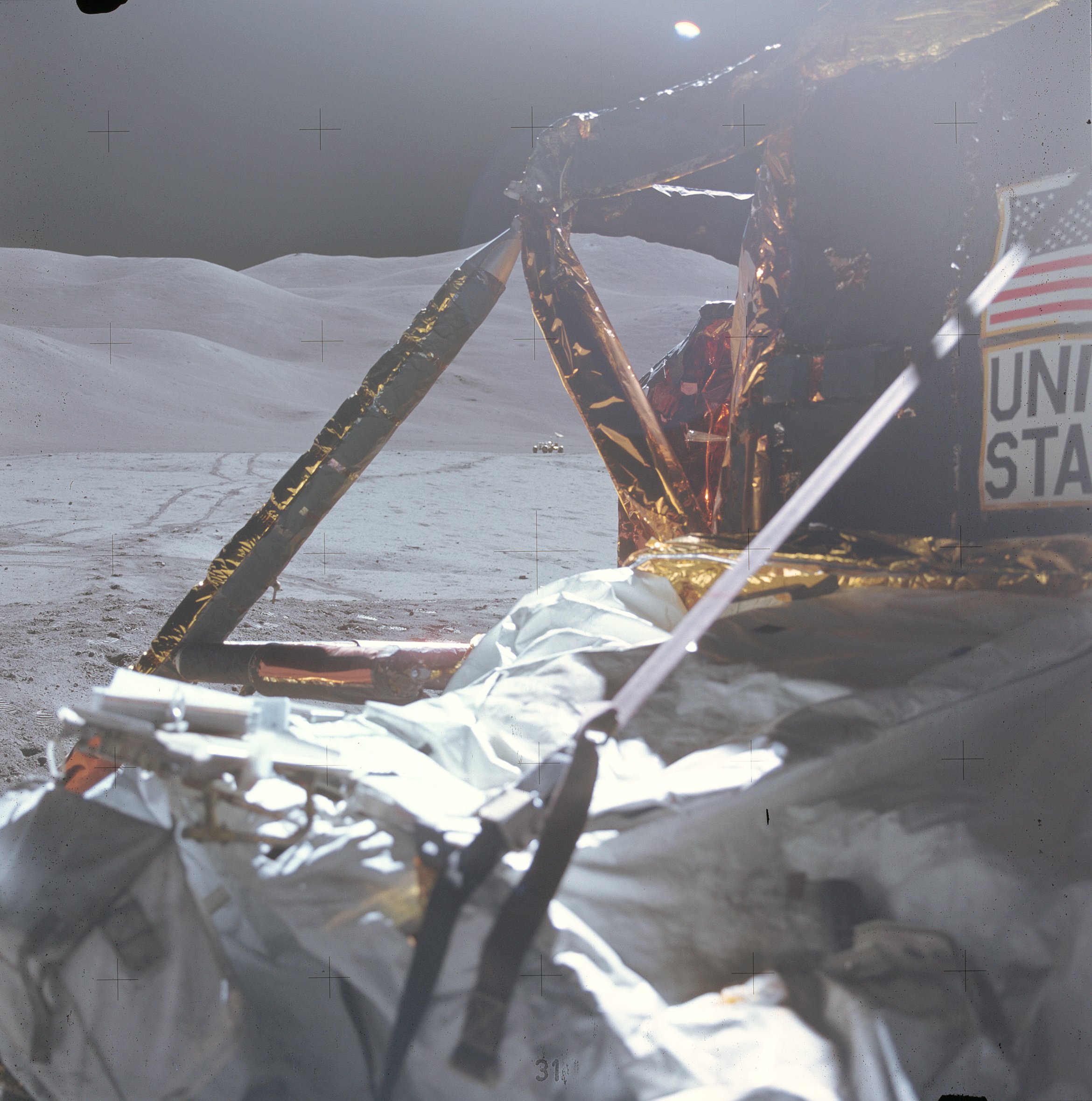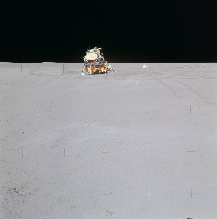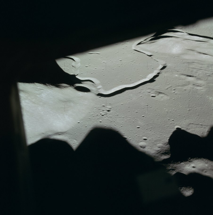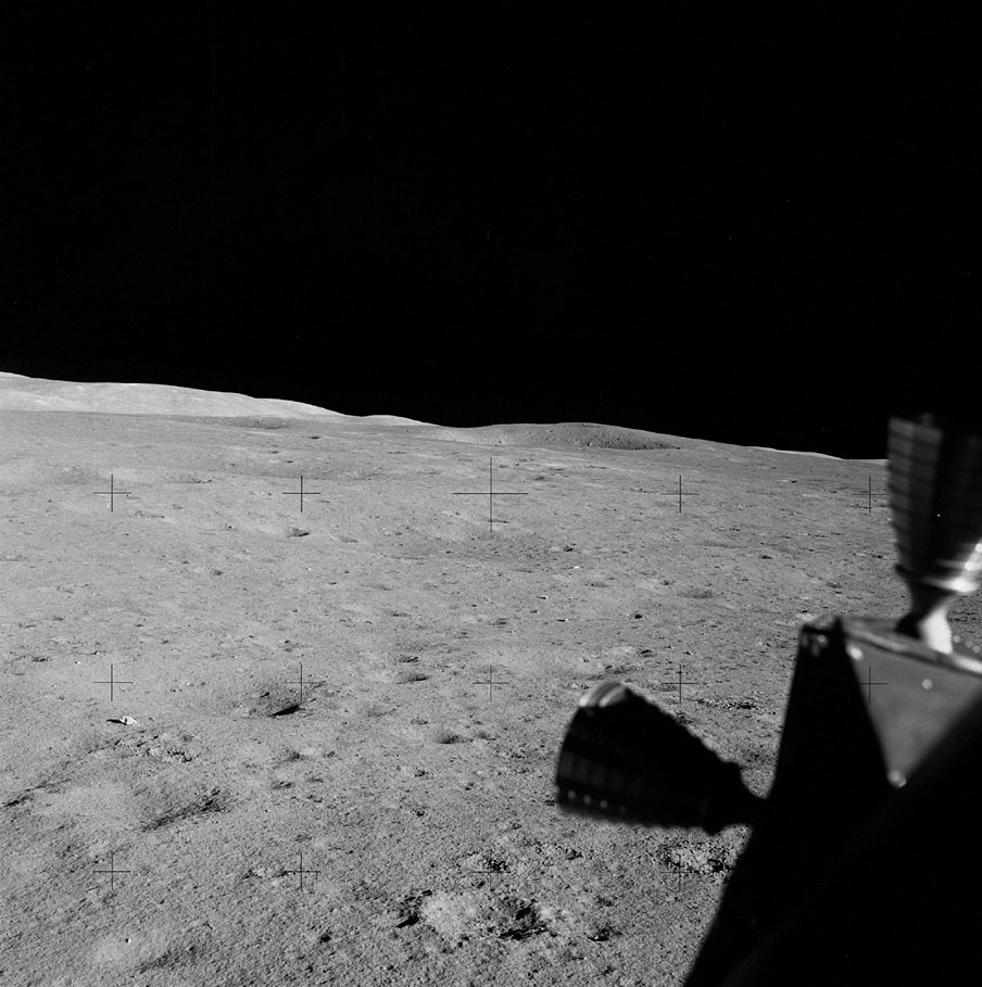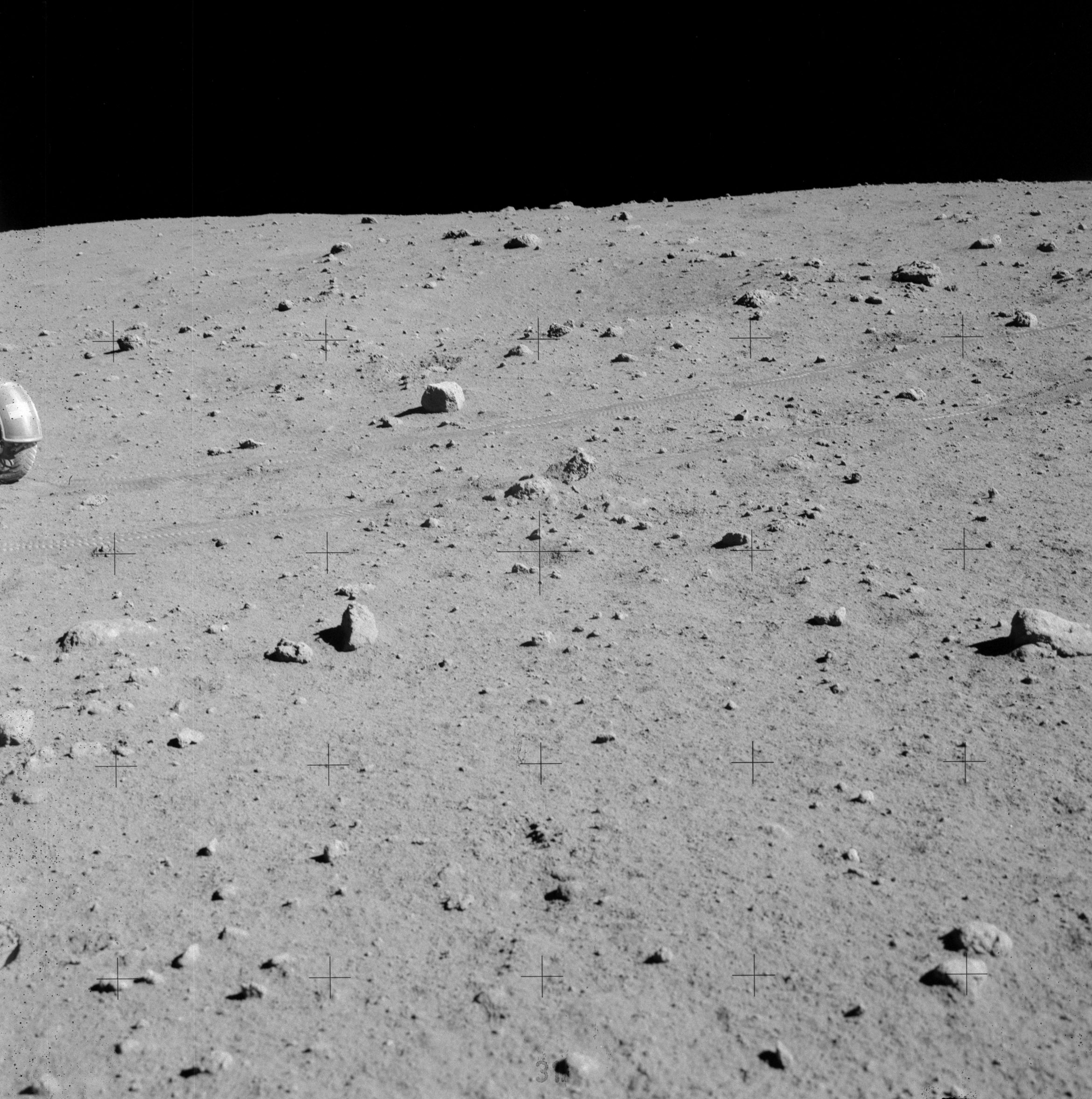 This picture was taken from the LM during CSM Rev 13 on the last pass over the landing site prior to the descent. A labeled version shows some of the prominent landmarks.Rev 16 Mapping (Metric) Camera Frame 0414 ( 13 Mb )