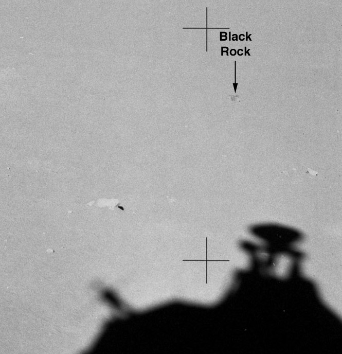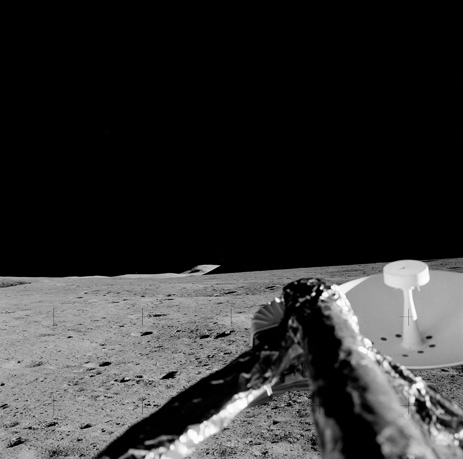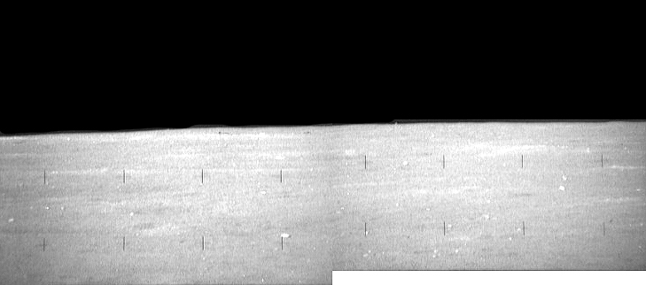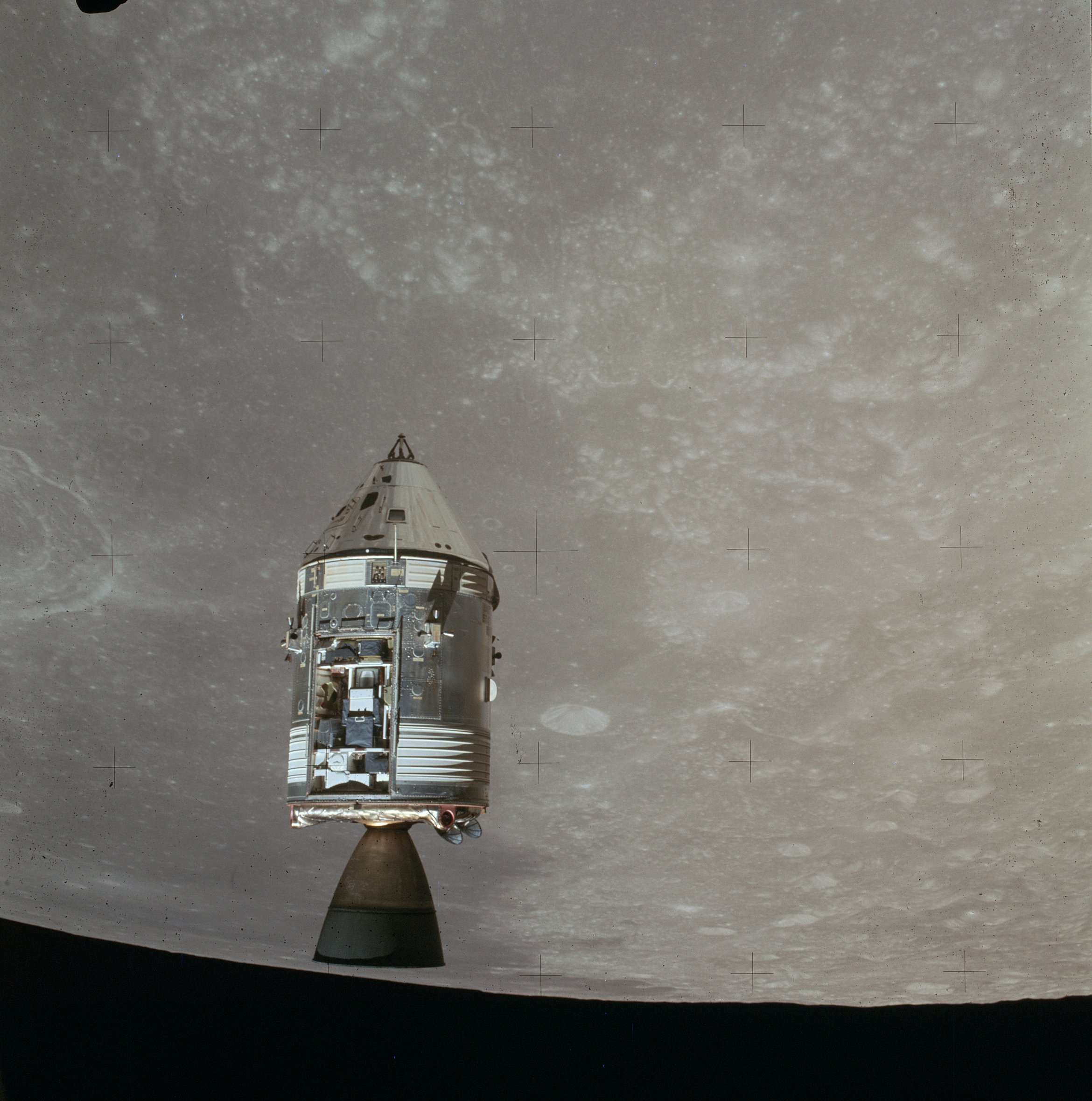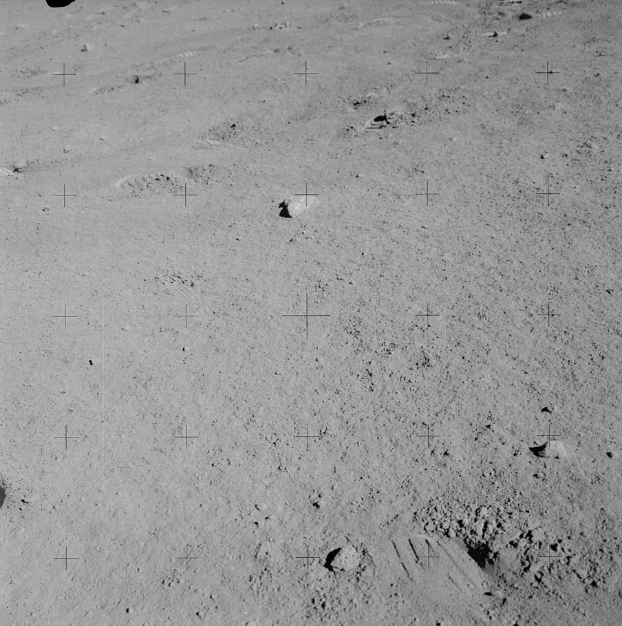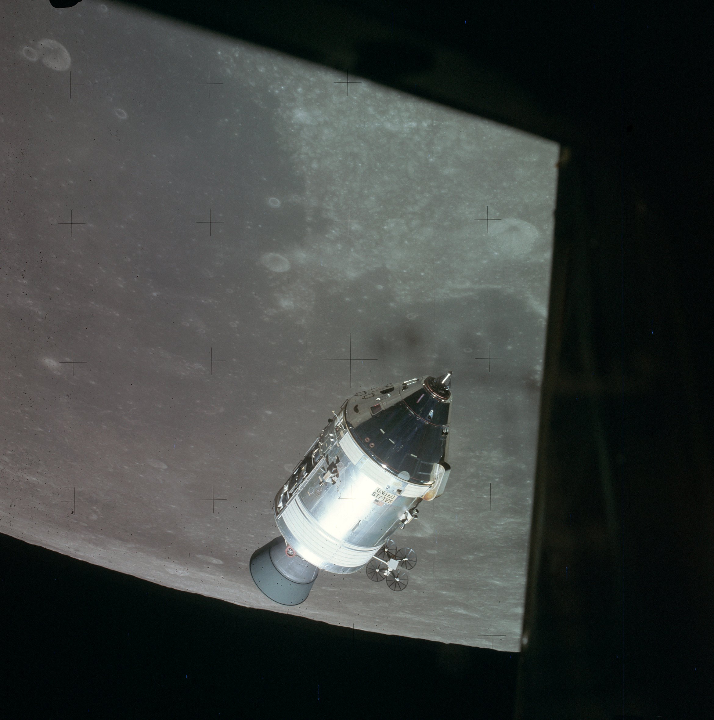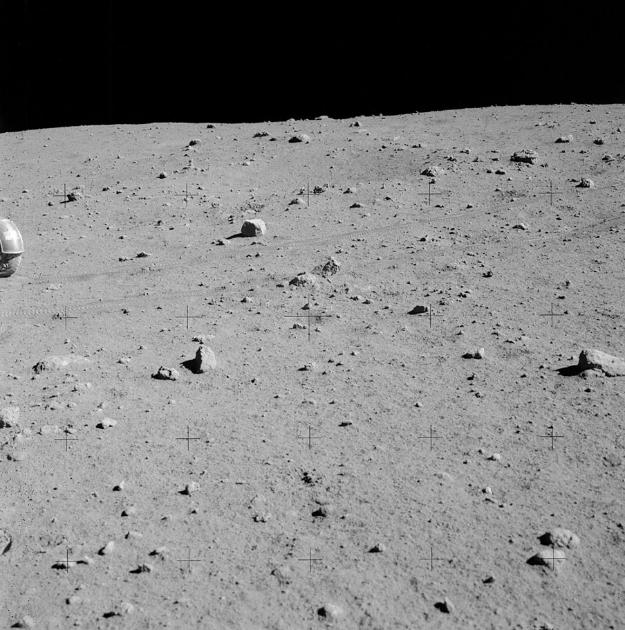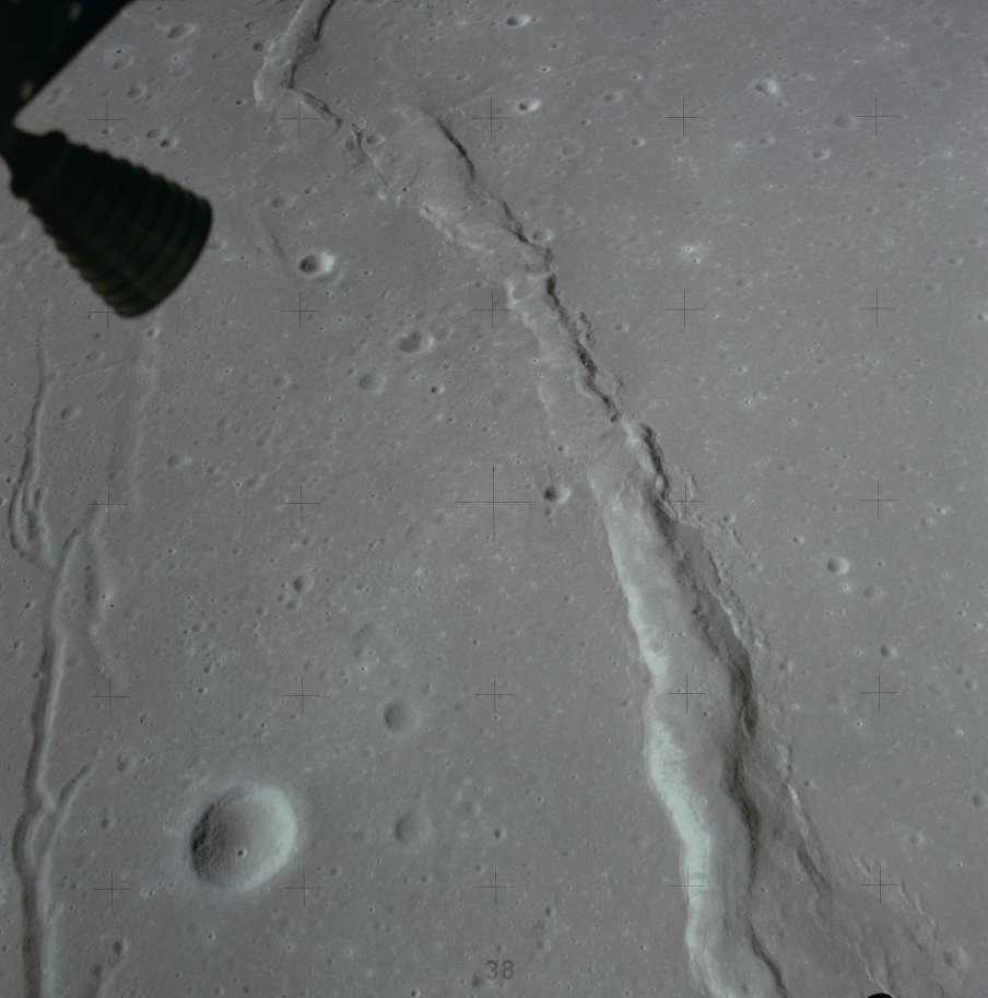 This picture was taken from the LM during CSM Rev 13 on the last pass over the landing site prior to the descent. A labeled version shows some of the prominent landmarks.Rev 16 Mapping (Metric) Camera Frame 0414 ( 13 Mb )