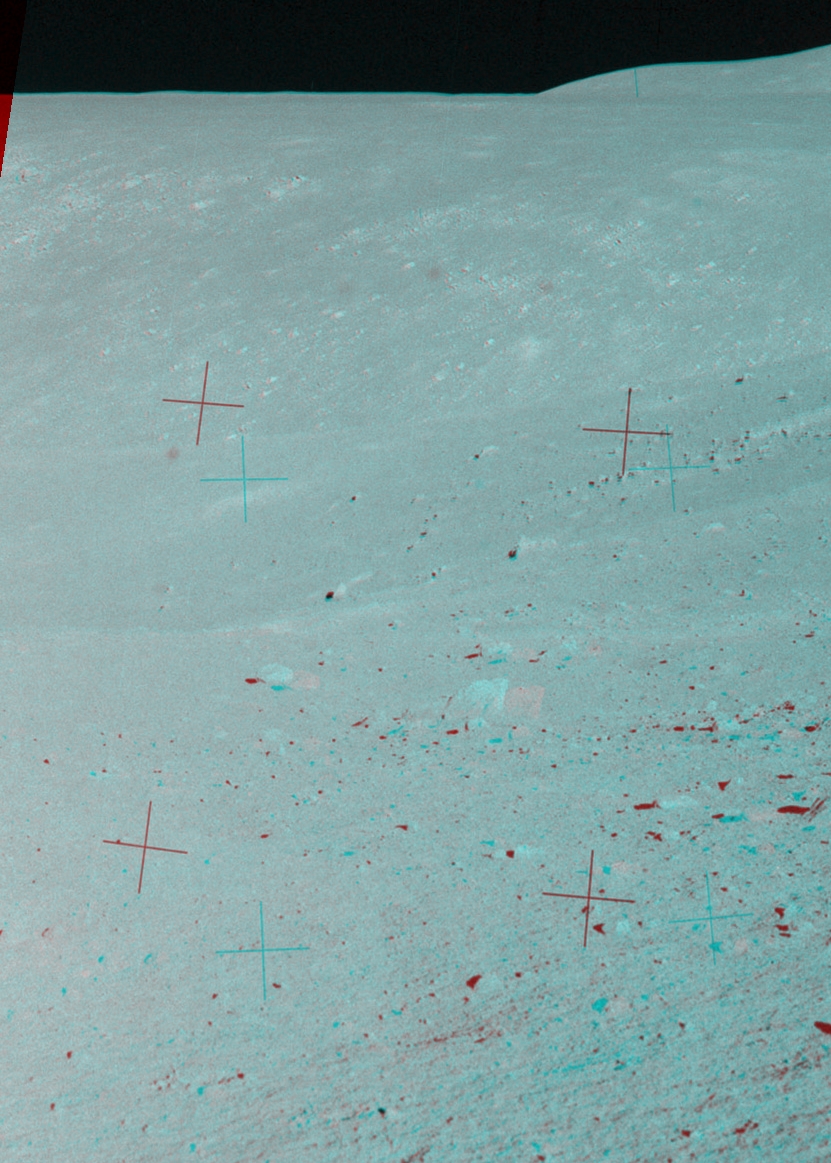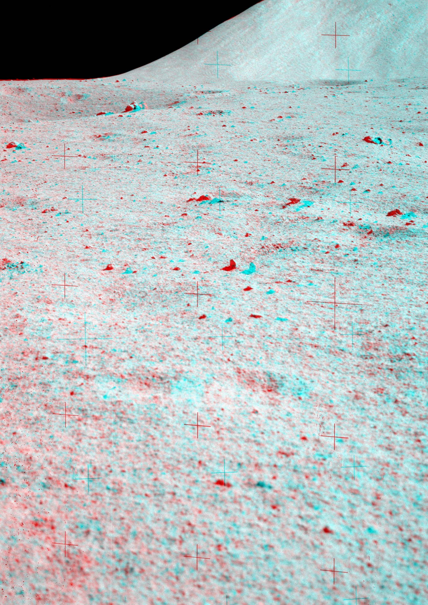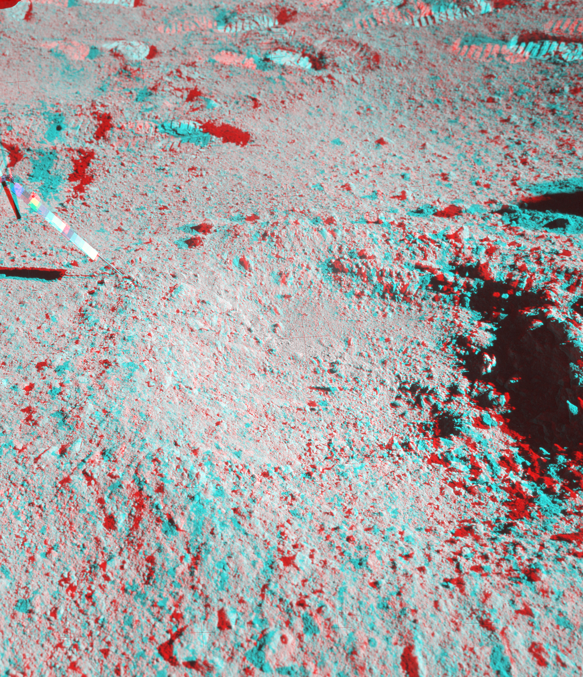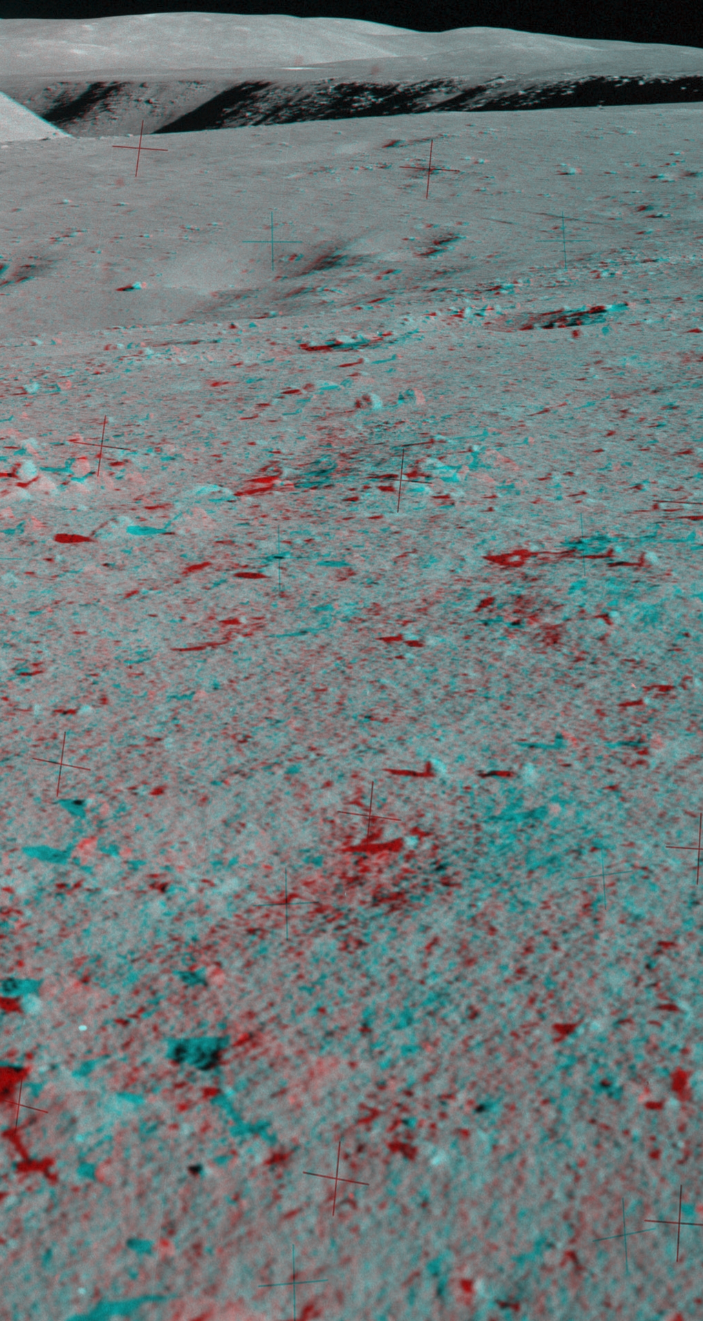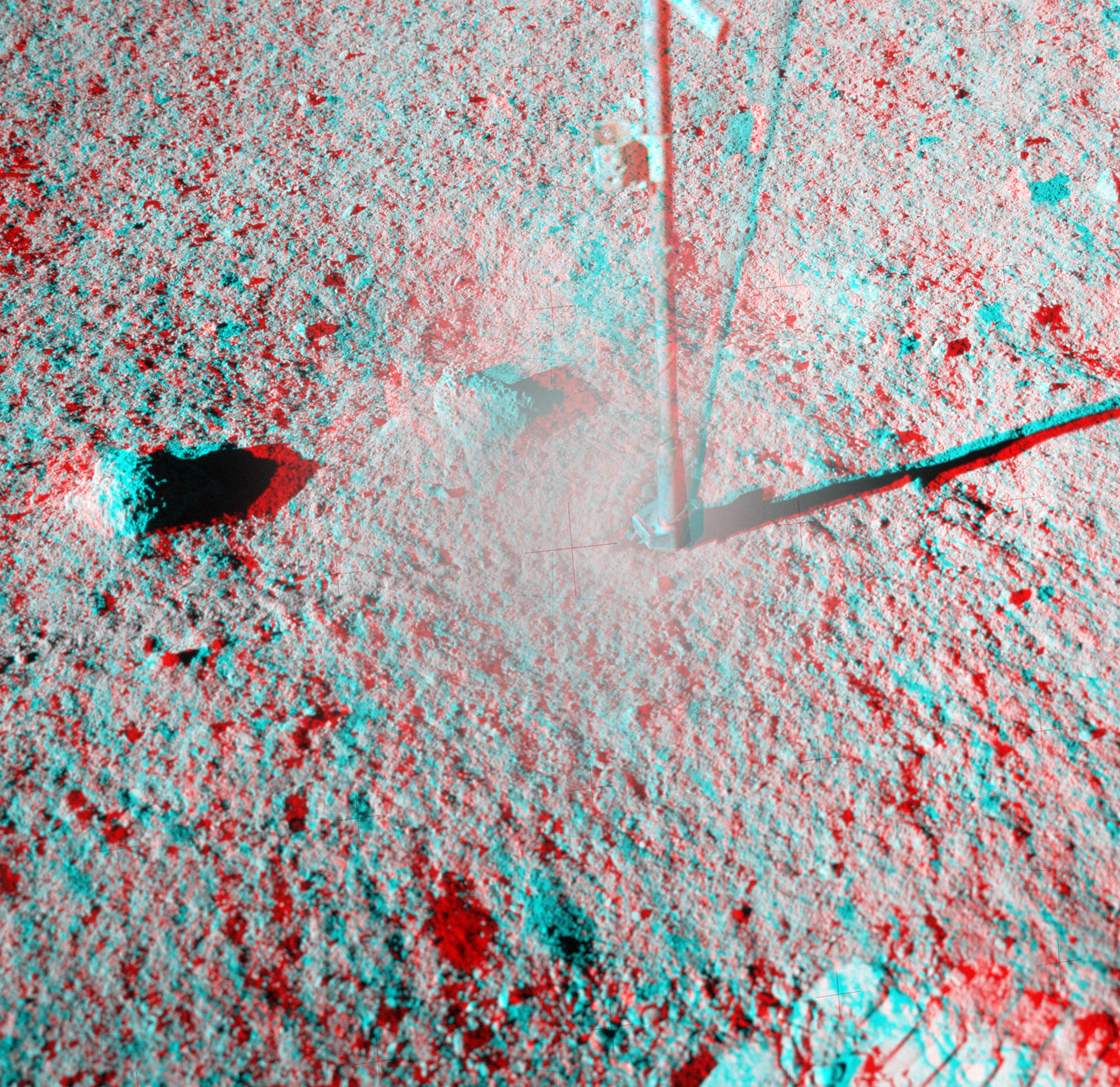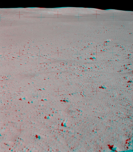 These two images of the landing site were taken during the Rev. 16 pass. The vertical exaggeration is about a factor of five. The images were downloaded from Arizona State University's Apollo Image Archive and cleaned to remove the effects of dust-specks. Anaglyph created by Eric Nelson.Rev 23 Mapping (Metric) Camera Frame 0854 ( 13 Mb )