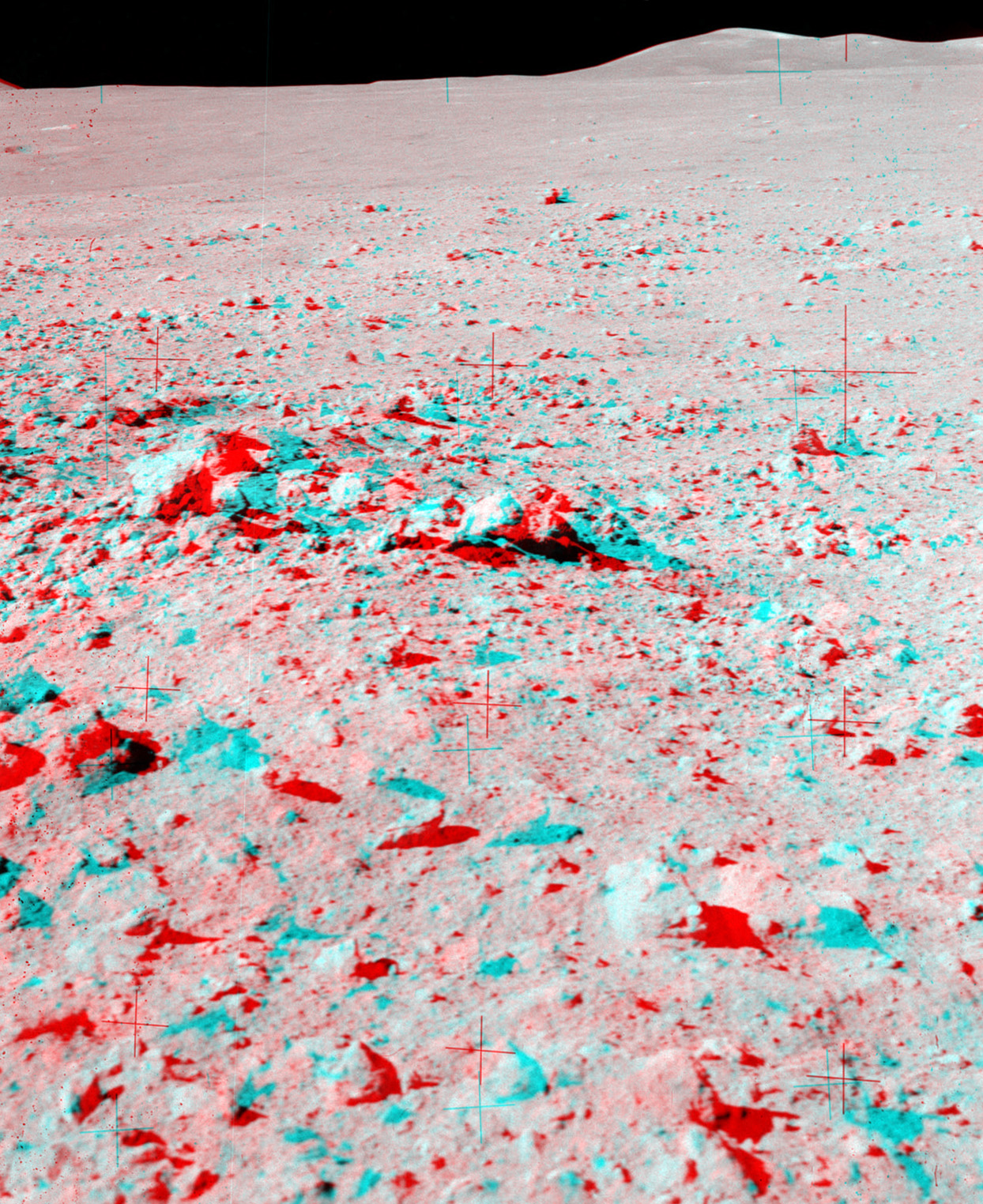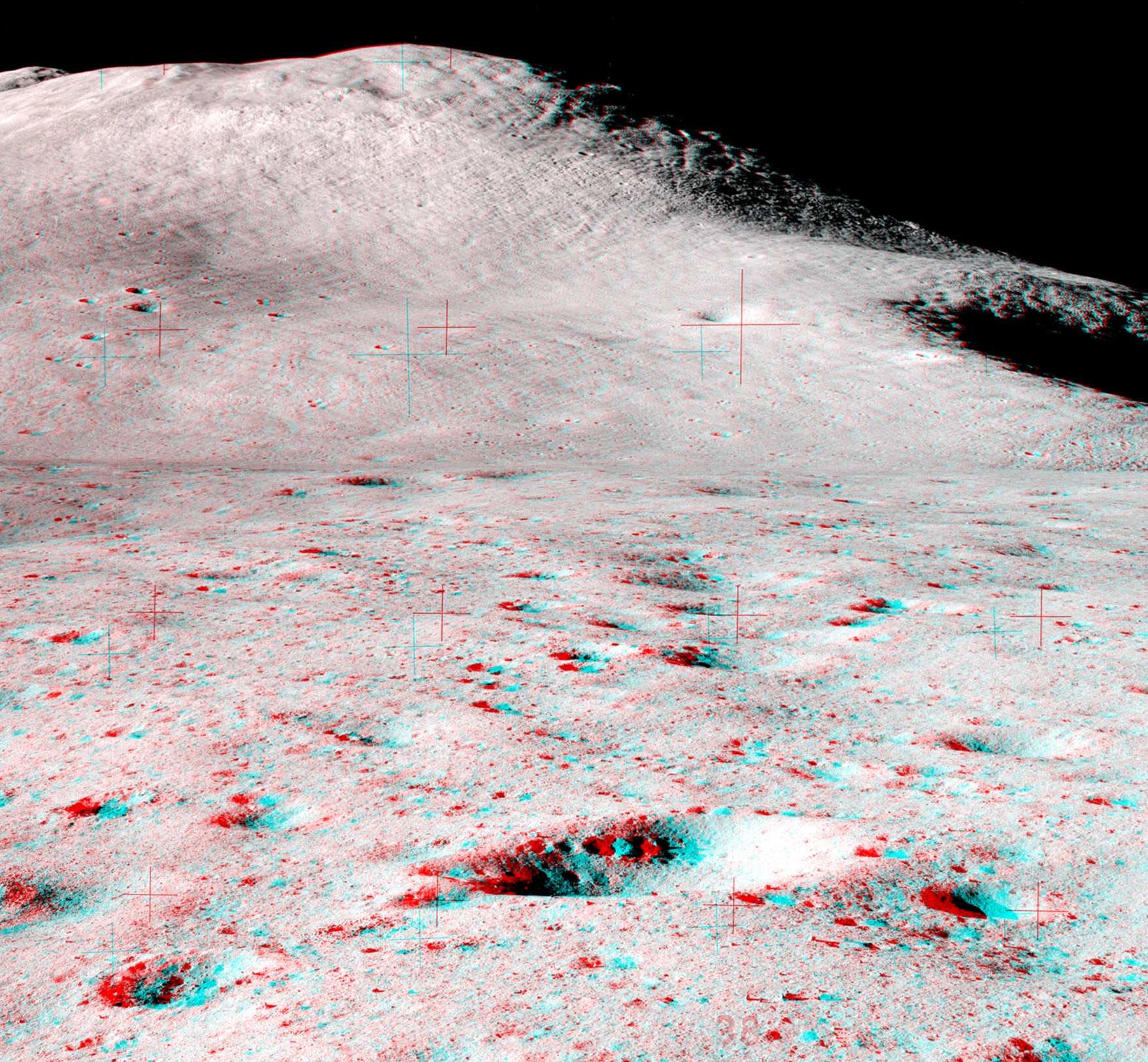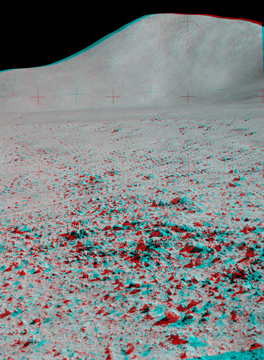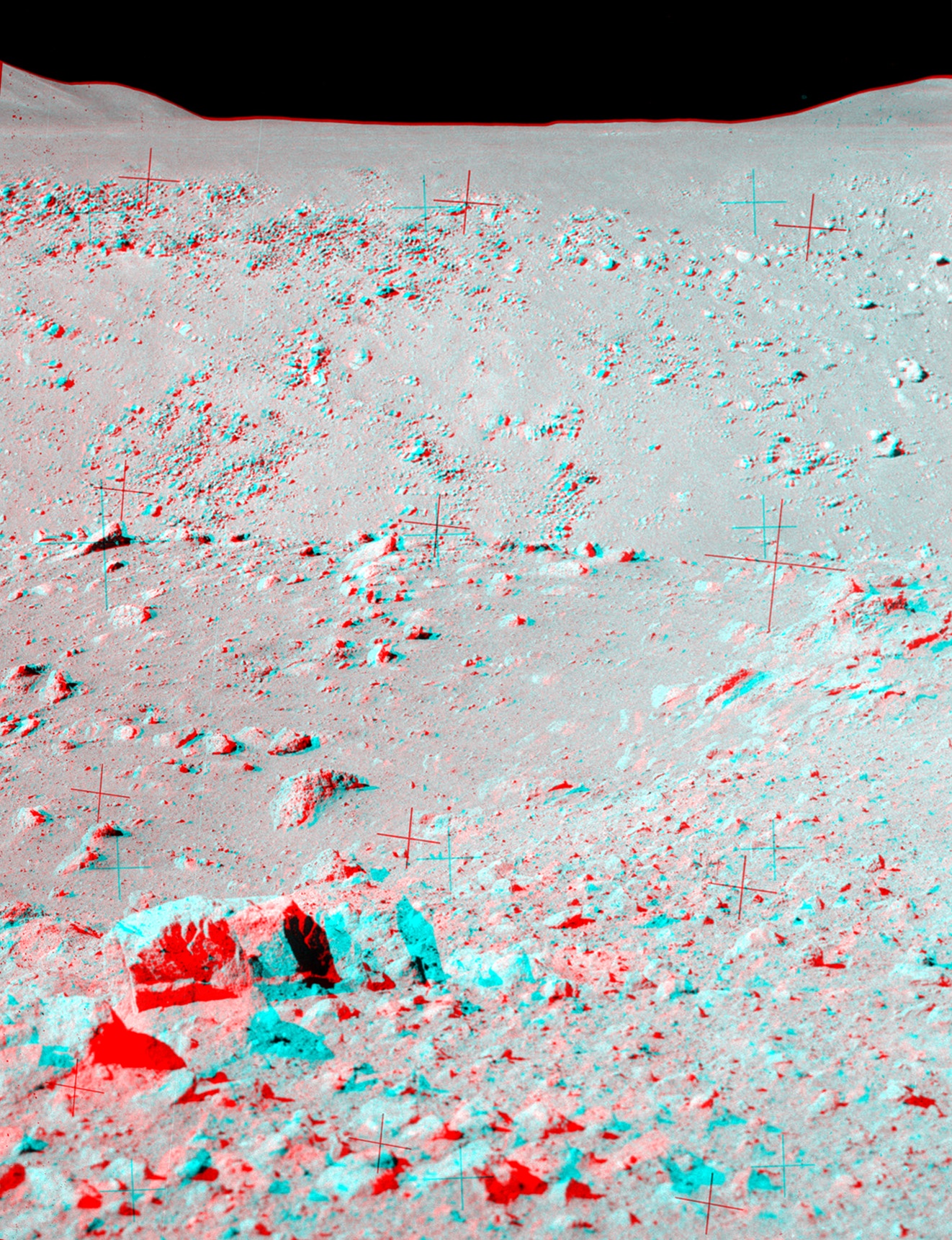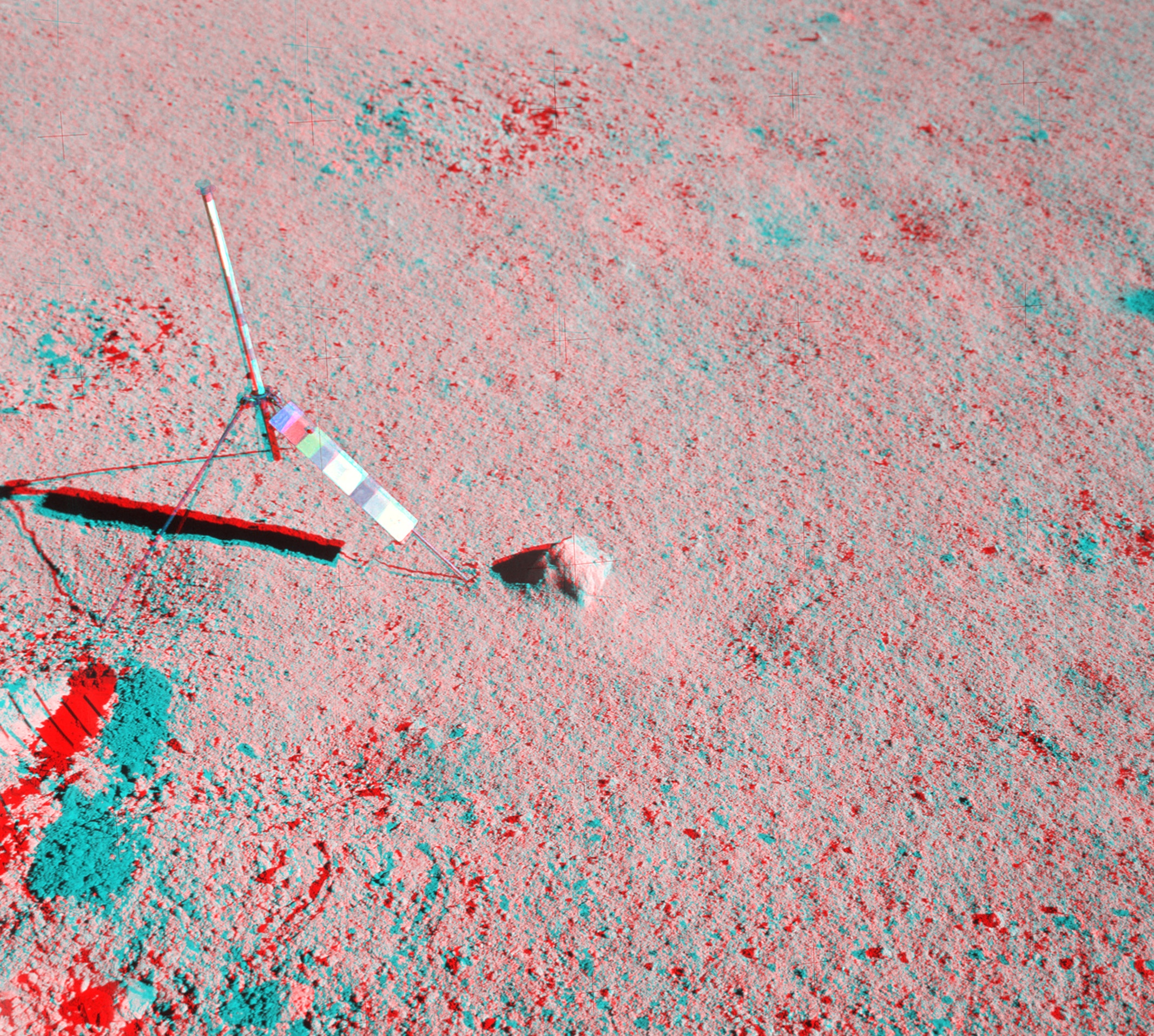 These two images of the landing site were taken during the Rev. 16 pass. The vertical exaggeration is about a factor of five. The images were downloaded from Arizona State University's Apollo Image Archive and cleaned to remove the effects of dust-specks. Anaglyph created by Eric Nelson.Rev 23 Mapping (Metric) Camera Frame 0854 ( 13 Mb )