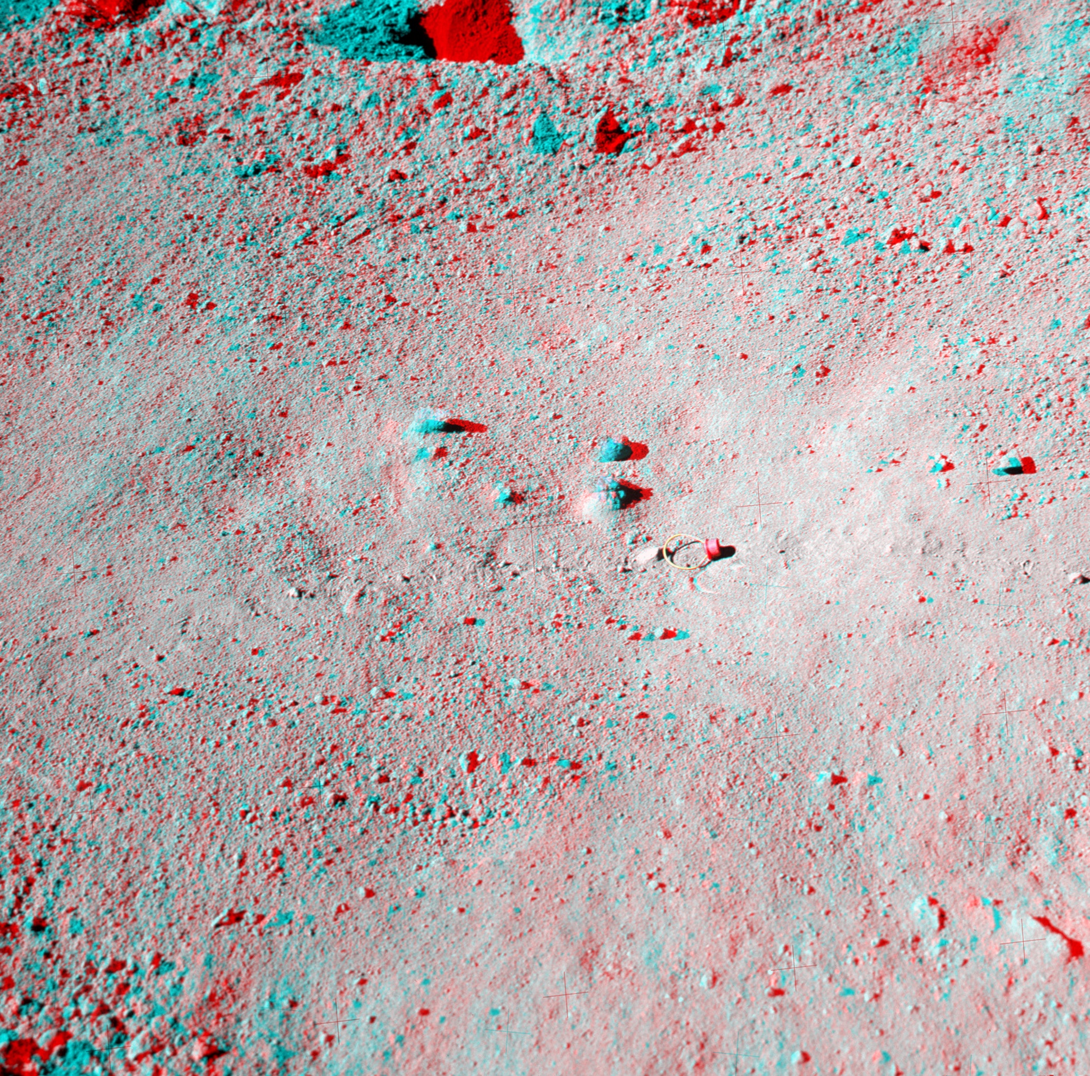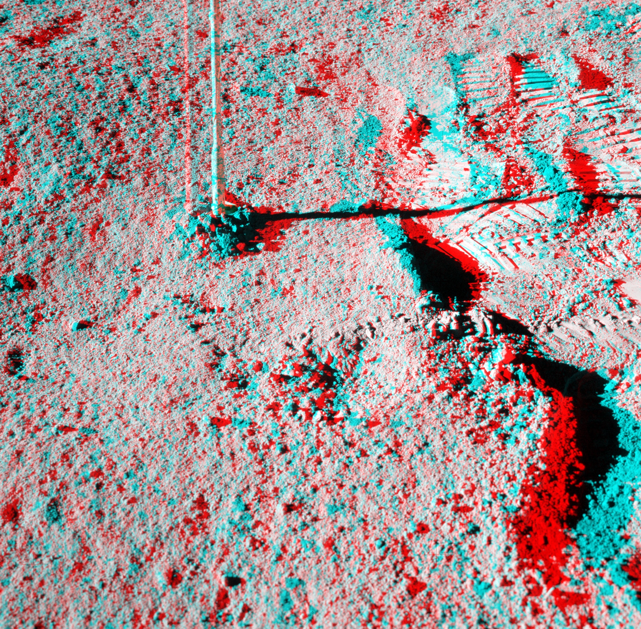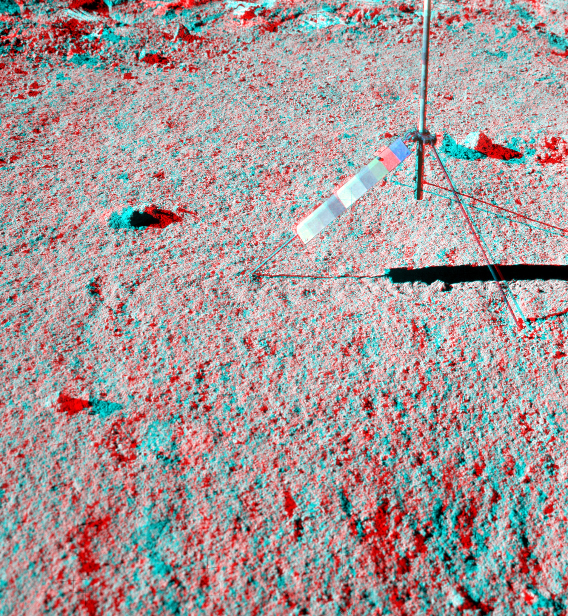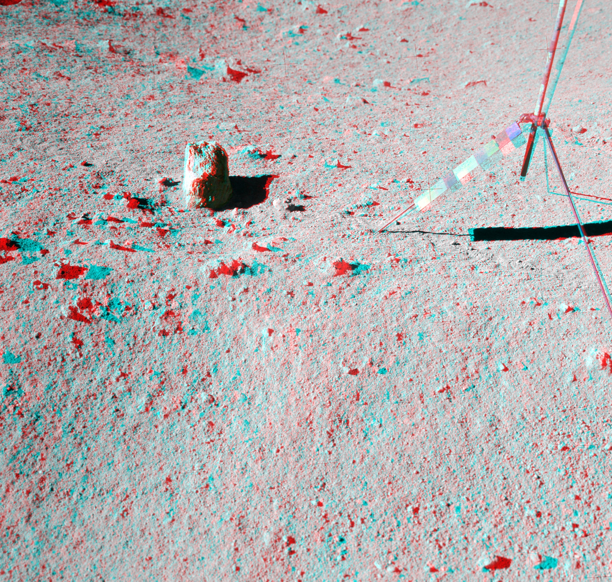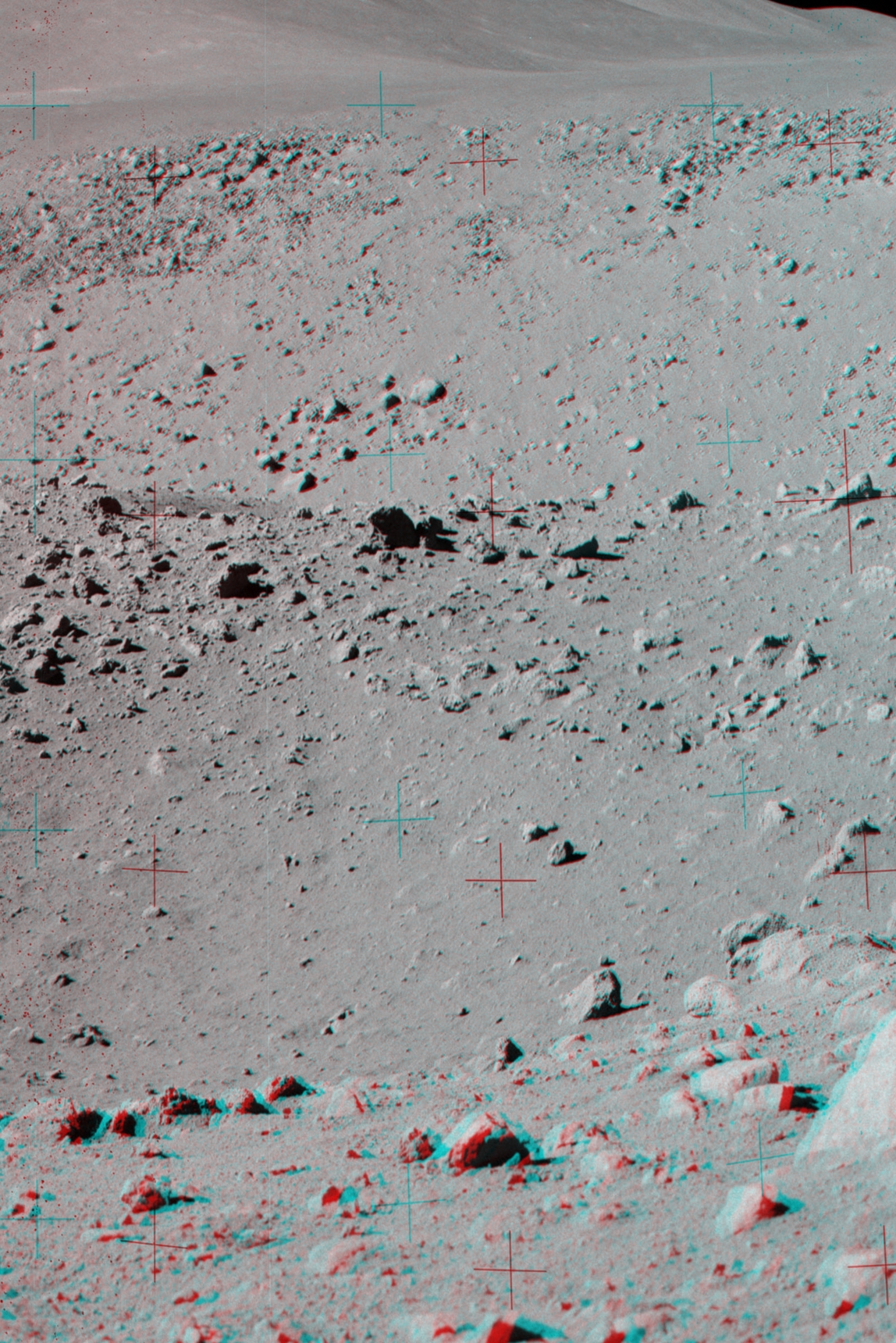 These two images of the landing site were taken during the Rev. 16 pass. The vertical exaggeration is about a factor of five. The images were downloaded from Arizona State University's Apollo Image Archive and cleaned to remove the effects of dust-specks. Anaglyph created by Eric Nelson.Rev 23 Mapping (Metric) Camera Frame 0854 ( 13 Mb )